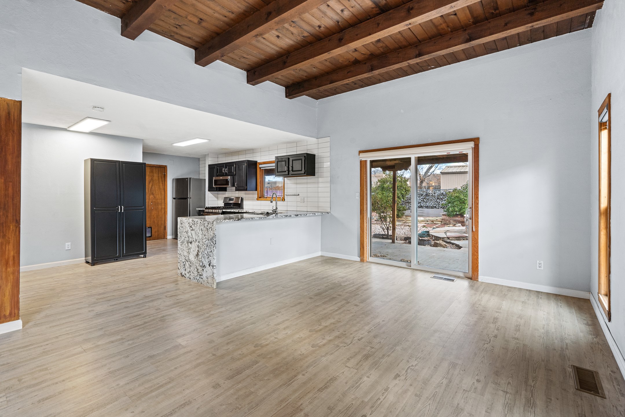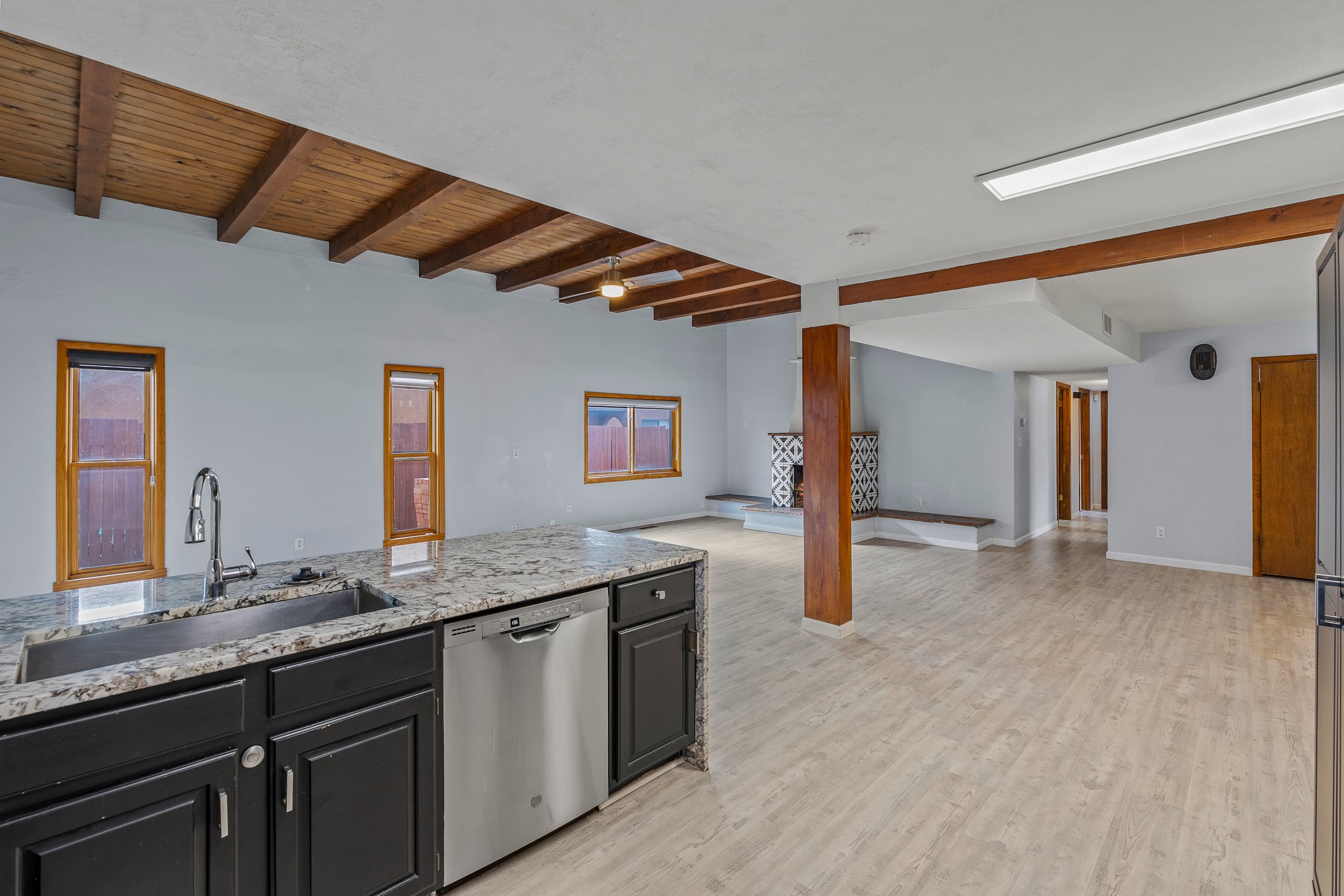 Ideally located just across from the Genoveva Chavez Center, this beautifully updated single-level home offers unbeatableconvenience with quick access to downtown Santa Fe and easy access to shopping, schools, including zoning in Pion Elementary school and everything the city has to offer. Boasting 1,794 sq ft, this thoughtfully designed 3-bedroom, 2-bath home features a modern open-concept layout perfect for comfortable living and effortless entertaining. The updated kitchen is a true showstopper, showcasing elegant waterfall granite countertops, a coordinating backsplash, and ample space for both counter seating and a dining table. The spacious living room is the heart of the home, offering soaring ceilings adorned with rich wood beams and tongue-and-groove detail, a cozy wood-burning fireplace, and a seamless flow. A sliding glass door opens to your private backyard retreat--perfect for indoor-outdoor living. Step outside to discover an enclosed, landscaped yard with mature gardens, a large covered portal ideal for year-round enjoyment, and exquisite hand-carved stonework throughout both the front and back yards. Additional highlights include a versatile mudroom/storage space/office or studio with direct outdoor access. This Santa Fe treasure blends timeless charm with modern updates in a location that truly can't be beat. Comeexperience it for yourself!