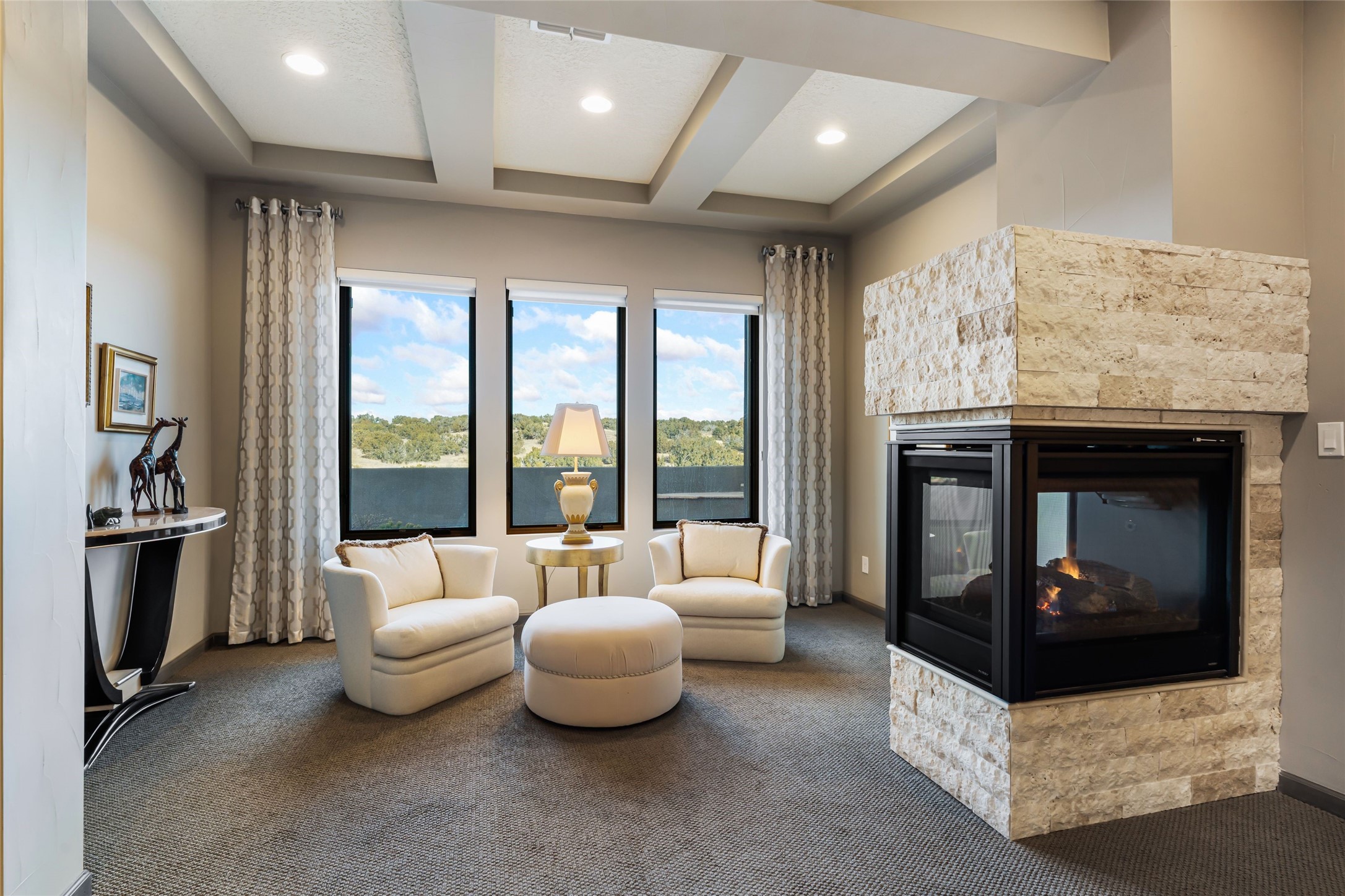 Set within the coveted Las Terrazas enclave of Las Campanas, this exceptional residence captures the essence of refined Santa Fe living. Thoughtfully designed and impeccably maintained, the home offers approximately 3,900 square feet of sophisticated living space along with a 274 square foot detached casita. The primary residence offers three bedrooms with timeless Southwestern character and modern elegance. An expansive open floor plan unfolds around a gourmet kitchen appointed with generous granite countertops, custom cabinetry, and seamless connection to the surrounding living and dining areas, ideal for both intimate gatherings and grand entertaining. Walls of windows and carefully curated indoor-outdoor living spaces frame uninterrupted vistas of the Sangre de Cristo and Jemez mountain ranges, creating a constant connection to the natural beauty that defines Northern New Mexico. Built in 2019 with energy-efficient construction, the home features Pella windows and a four-zone heating and cooling system, ensuring year-round comfort and efficiency. Located minutes from the Las Campanas Hacienda and nearby walking paths, the property offers the convenience and security of Las Campanas Living. This residence offers a rare opportunity to experience elevated desert luxury in one of Santa Fe's most prestigious private communities.