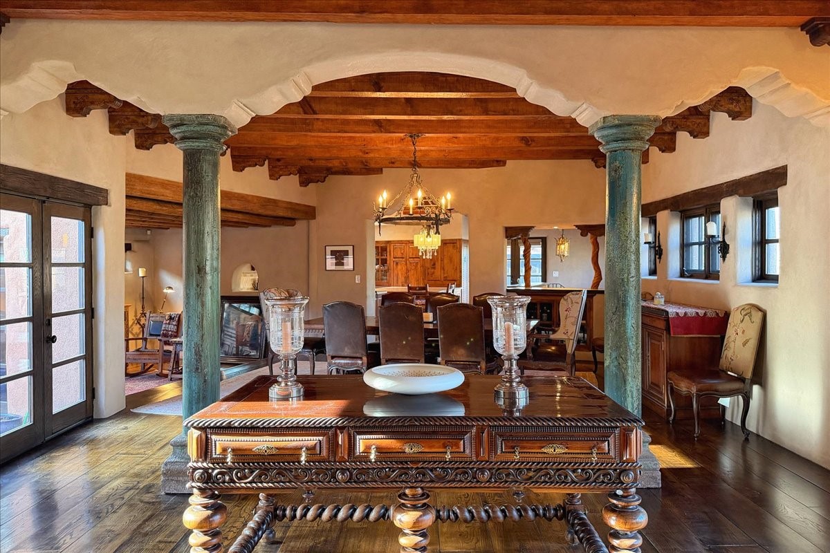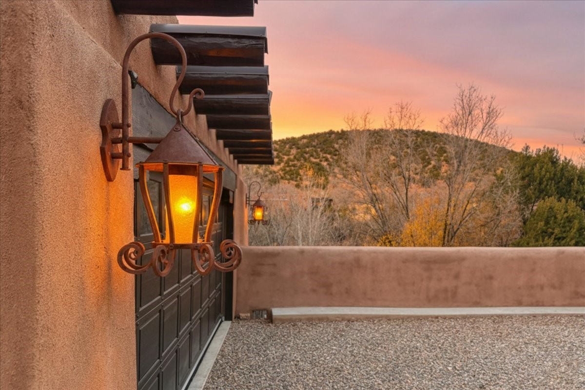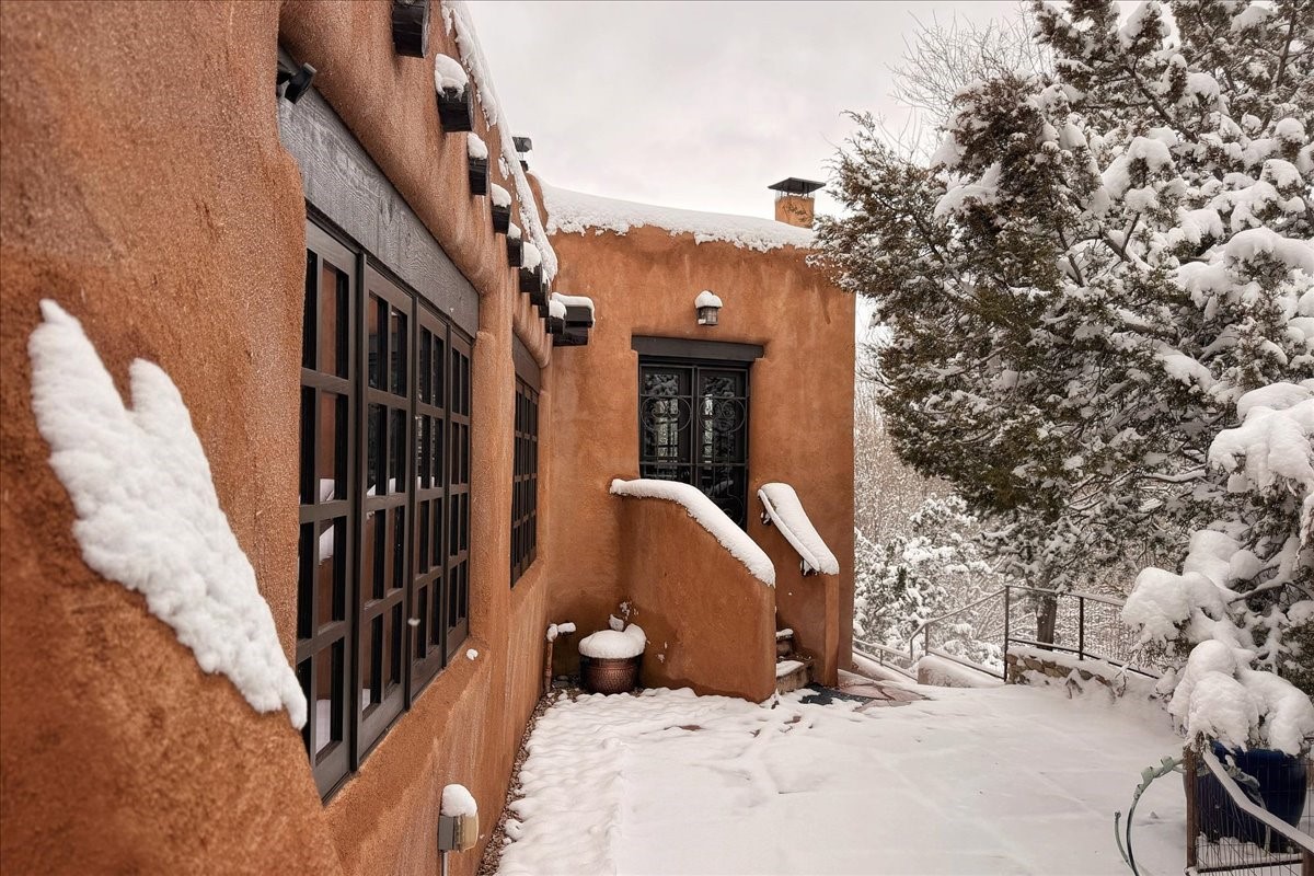 Discover Las Crucitas, a fully restored 1950s Santa Fe adobe blending timeless Southwestern charm with modern luxury, ideally located on coveted Upper Canyon Road in the Historic East Side. This remarkable property offers four bedrooms and four bathrooms (two full, one three-quarter, and one half) within 4,258 square feet of refined living space. A 492-square-foot attached casita, detached two-car garage, and over 200 linear feet of Santa Fe River frontage creates a rare and private setting. The upper level features a beautifully appointed chef's kitchen with top-of-the-line appliances, custom hood, two dishwashers, quartz countertops, custom Ernest Thompson cabinetry, and travertine floors. A spacious great room showcases classic Santa Fe details including columns, vigas with corbels, latillas, and wide-plank oak floors, American clay and plaster walls. Three sets of French doors open to a serene interior courtyard, while an additional set leads to a balcony ideal for sunset views. Also on the upper level are a guest suite with a three-quarter bath and an elegant owner's suite featuring two corner kiva wood-burning fireplaces, a luxurious en-suite full bath with mosaic tile shower and travertine floors, a walk-in closet with custom built-ins, and French doors opening to the outdoor area. The lower level offers a media area with custom Ernest Thompson cabinetry, a study nook, an additional guest bedroom with exposed rock walls, a powder room, and a three-quarter bath. The attached casita includes a wood-burning kiva fireplace, kitchenette, and full bath ideal for guests. Outdoor spaces include a back deck, a floating terrace with sunset views, and a flagstone path with direct river access. Additional features include in-floor radiant heat, a new boiler, a rock garden, and a dog run with room to expand. Las Crucitas is a rare opportunity to own a property that seldom changes hands--just minutes from Canyon Road's galleries and restaurants and the Santa Fe Plaza.