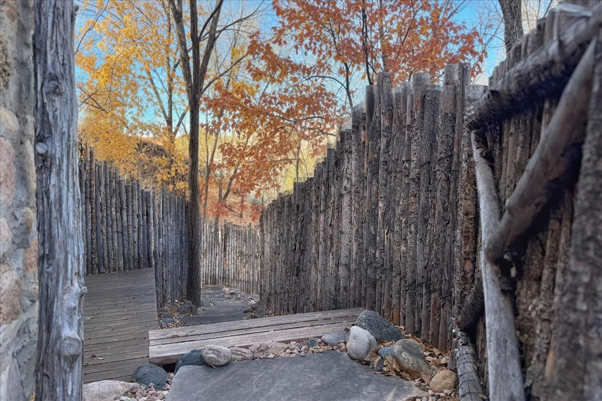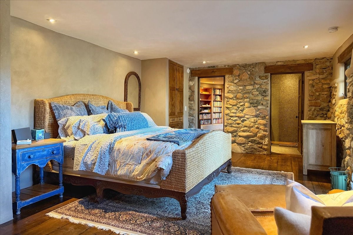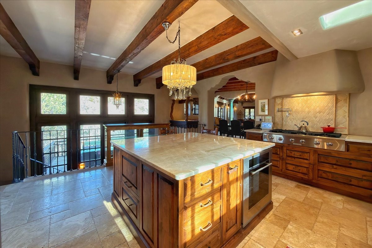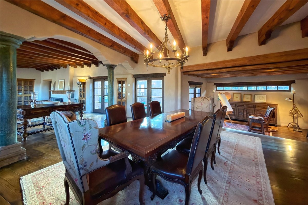 Discover Las Crucitas, a fully restored 1950s Santa Fe adobe blending timeless Southwestern charm with modern luxury, ideally located on coveted Upper Canyon Road in the Historic East Side. This remarkable property offers four bedrooms and four bathrooms (two full, one three-quarter, and one half) within 4,258 square feet of refined living space. A 492-square-foot attached casita, detached two-car garage, and over 200 linear feet of Santa Fe River frontage creates a rare and private setting. The upper level features a beautifully appointed chef's kitchen with top-of-the-line appliances, custom hood, two dishwashers, quartz countertops, custom Ernest Thompson cabinetry, and travertine floors. A spacious great room showcases classic Santa Fe details including columns, vigas with corbels, latillas, and wide-plank oak floors, American clay and plaster walls. Three sets of French doors open to a serene interior courtyard, while an additional set leads to a balcony ideal for sunset views. Also on the upper level are a guest suite with a three-quarter bath and an elegant owner's suite featuring two corner kiva wood-burning fireplaces, a luxurious en-suite full bath with mosaic tile shower and travertine floors, a walk-in closet with custom built-ins, and French doors opening to the outdoor area. The lower level offers a media area with custom Ernest Thompson cabinetry, a study nook, an additional guest bedroom with exposed rock walls, a powder room, and a three-quarter bath. The attached casita includes a wood-burning kiva fireplace, kitchenette, and full bath ideal for guests. Outdoor spaces include a back deck, a floating terrace with sunset views, and a flagstone path with direct river access. Additional features include in-floor radiant heat, a new boiler, a rock garden, and a dog run with room to expand. Las Crucitas is a rare opportunity to own a property that seldom changes hands--just minutes from Canyon Road's galleries and restaurants and the Santa Fe Plaza.