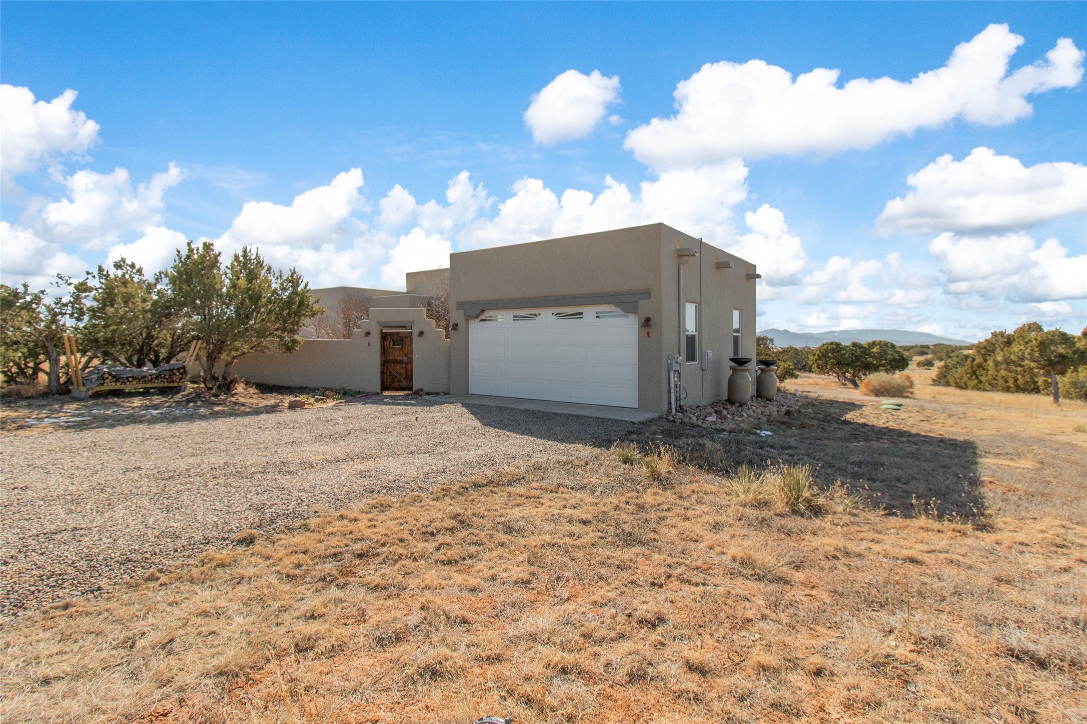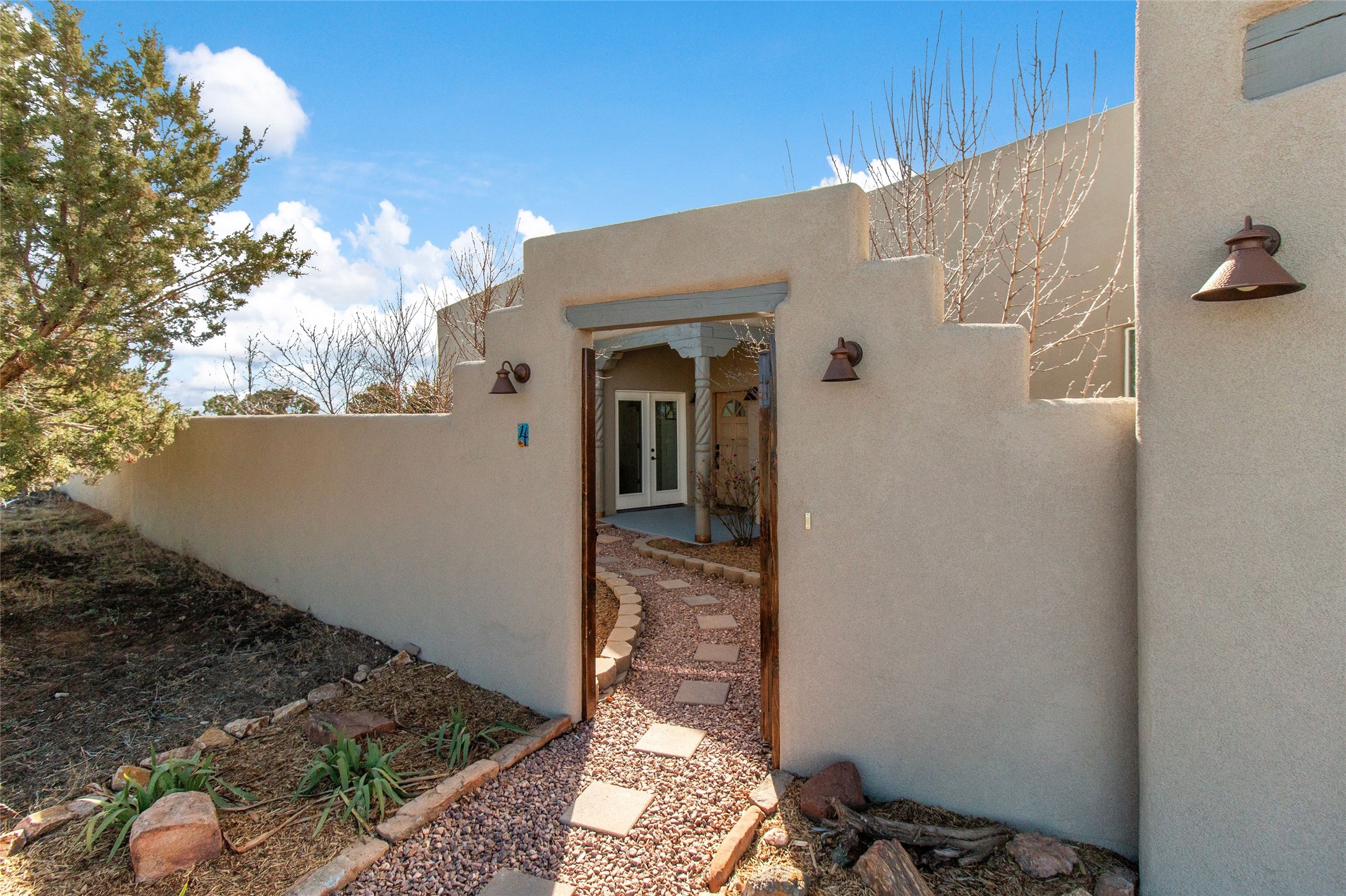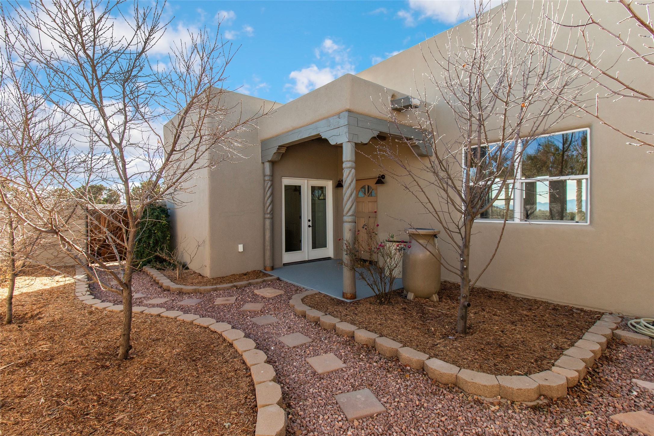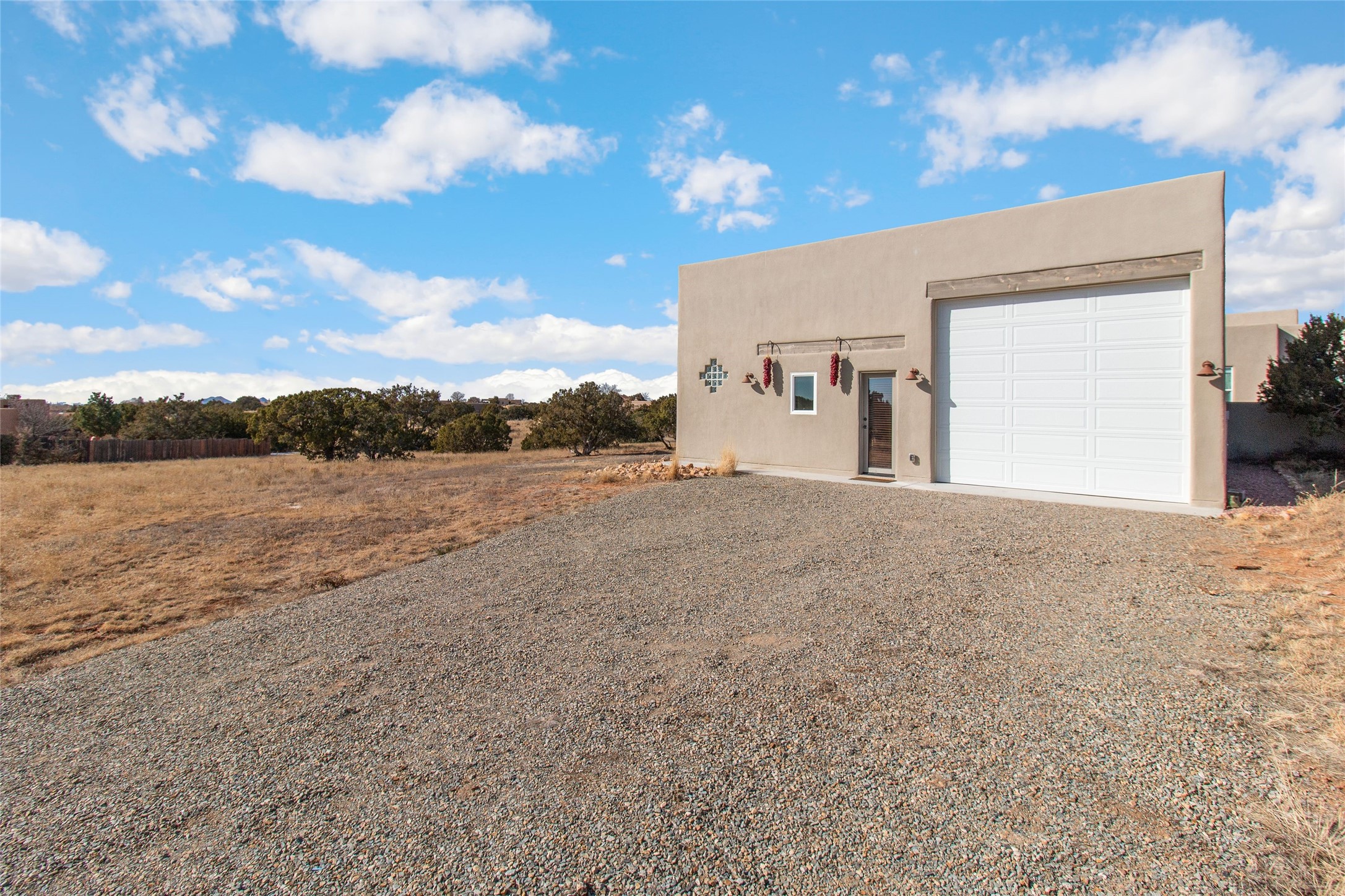 Pride of ownership is apparent the minute you walk into this exceptional 2019 contemporary build in Eldorado. Sellers have invested approximately $151,000 in improvements, included the construction of a new casita, during their ownership. Upon entry into the front court yard, you are greeted by apple, peach and cherry trees. The main house offers 3 bedrooms, 2 baths and open living concept with a split bedroom configuration for owner and guest privacy. Stunning views from the living room and back portal await you on this 1.4 acres. This home was built for energy efficiency as a priority with a HERS rating of 70. A solar panel system attached to the grid was added to the home in 2024 for ultra low electric bills. A Hearthstone Green Mountain convection wood stove takes the chill off those really cold winter evenings. An annually serviced tankless water heater ensures you never run out of hot water. Central cooling and heating. A detached one bedroom casita with a 3/4 quarters bathroom is perfect for guests or an in-law suite, plus an adjacent RV garage. For all the amenities available to homeowners in Eldorado, check out www.eldoradosf.org