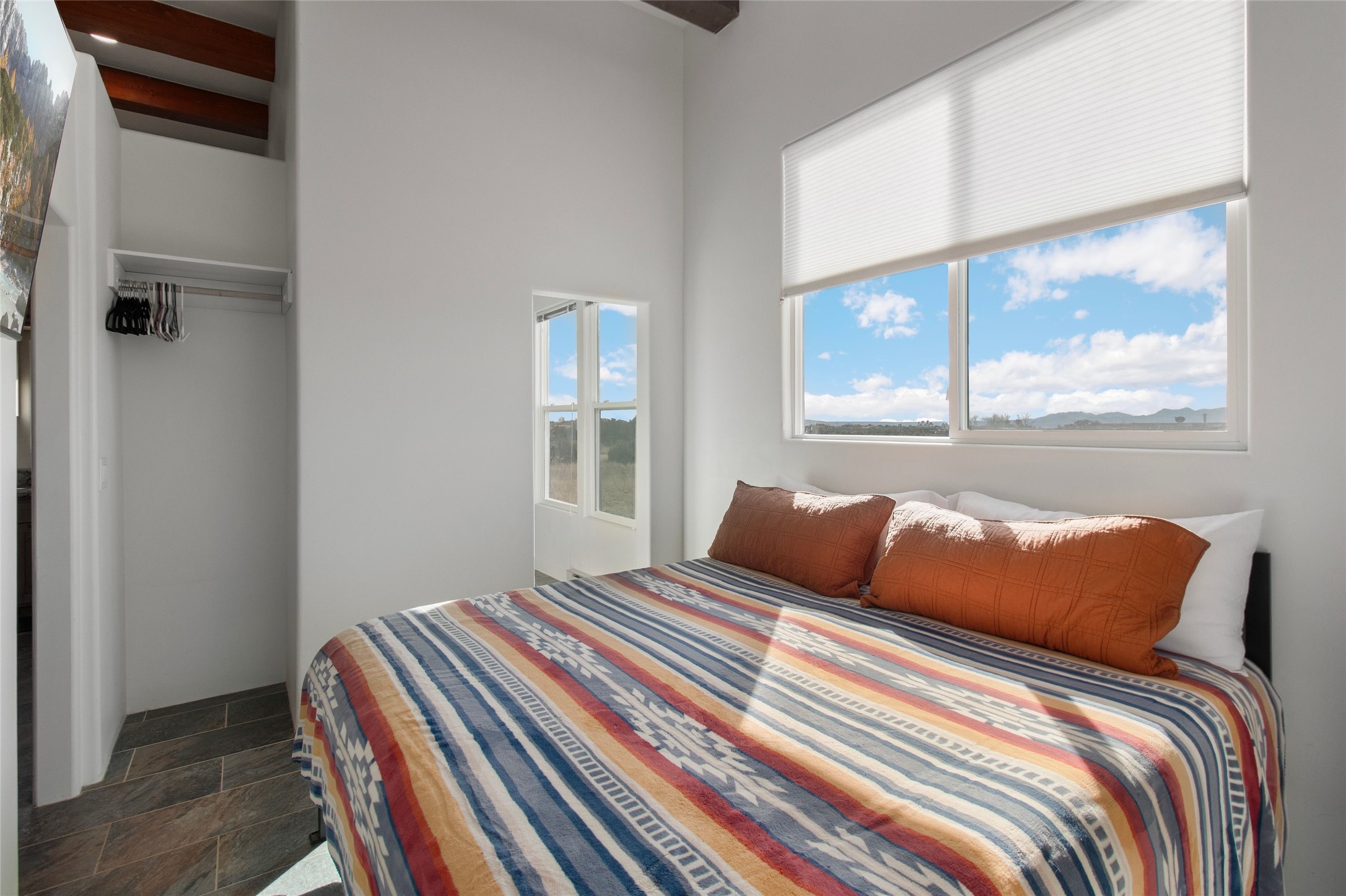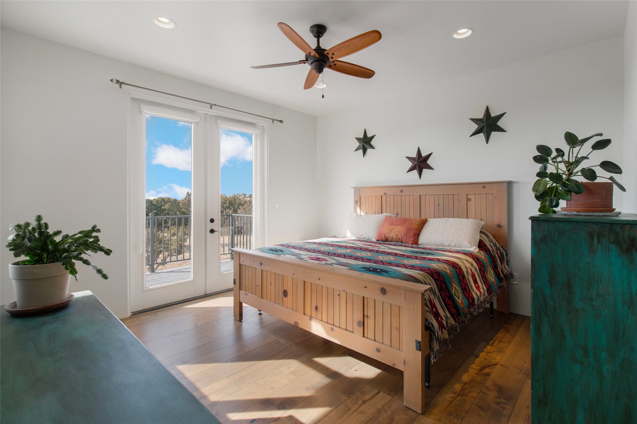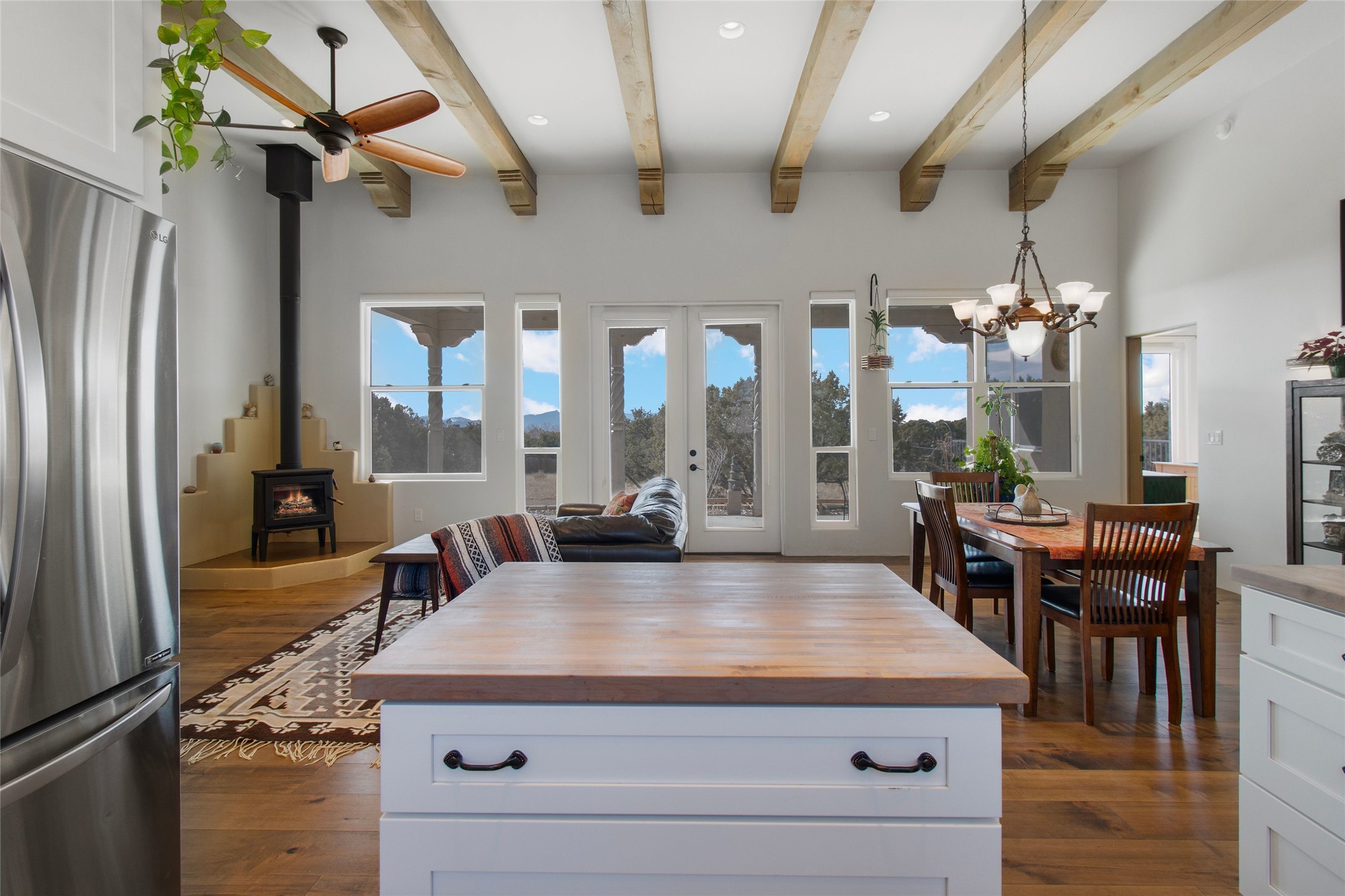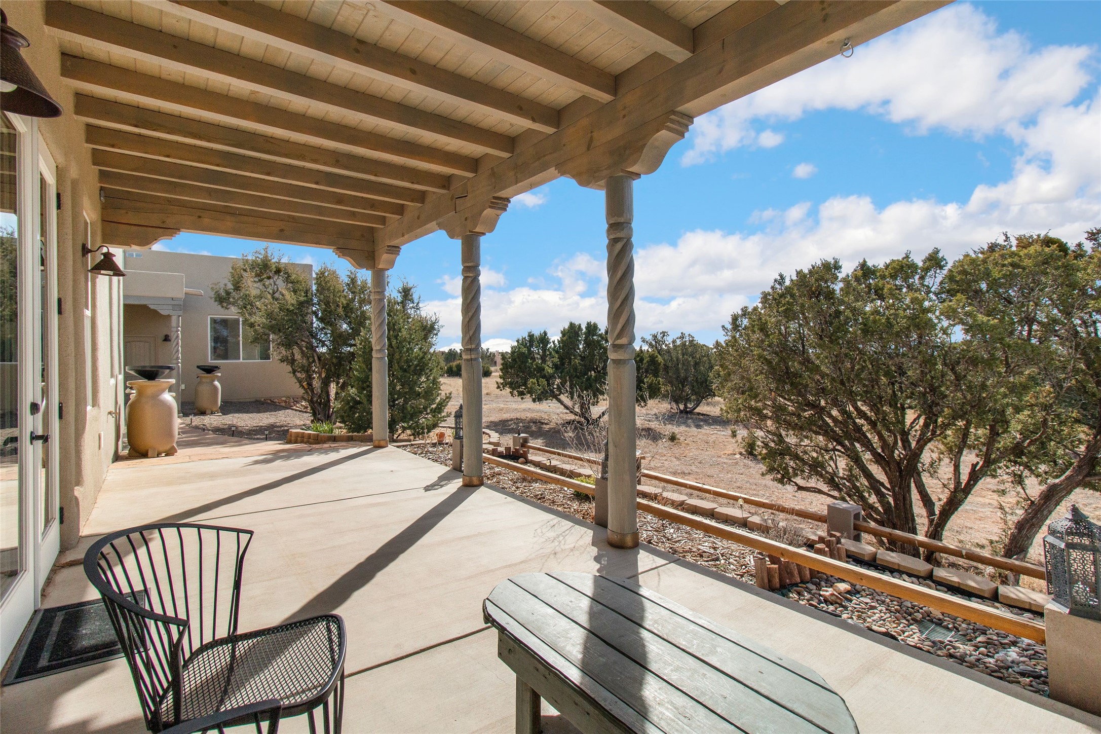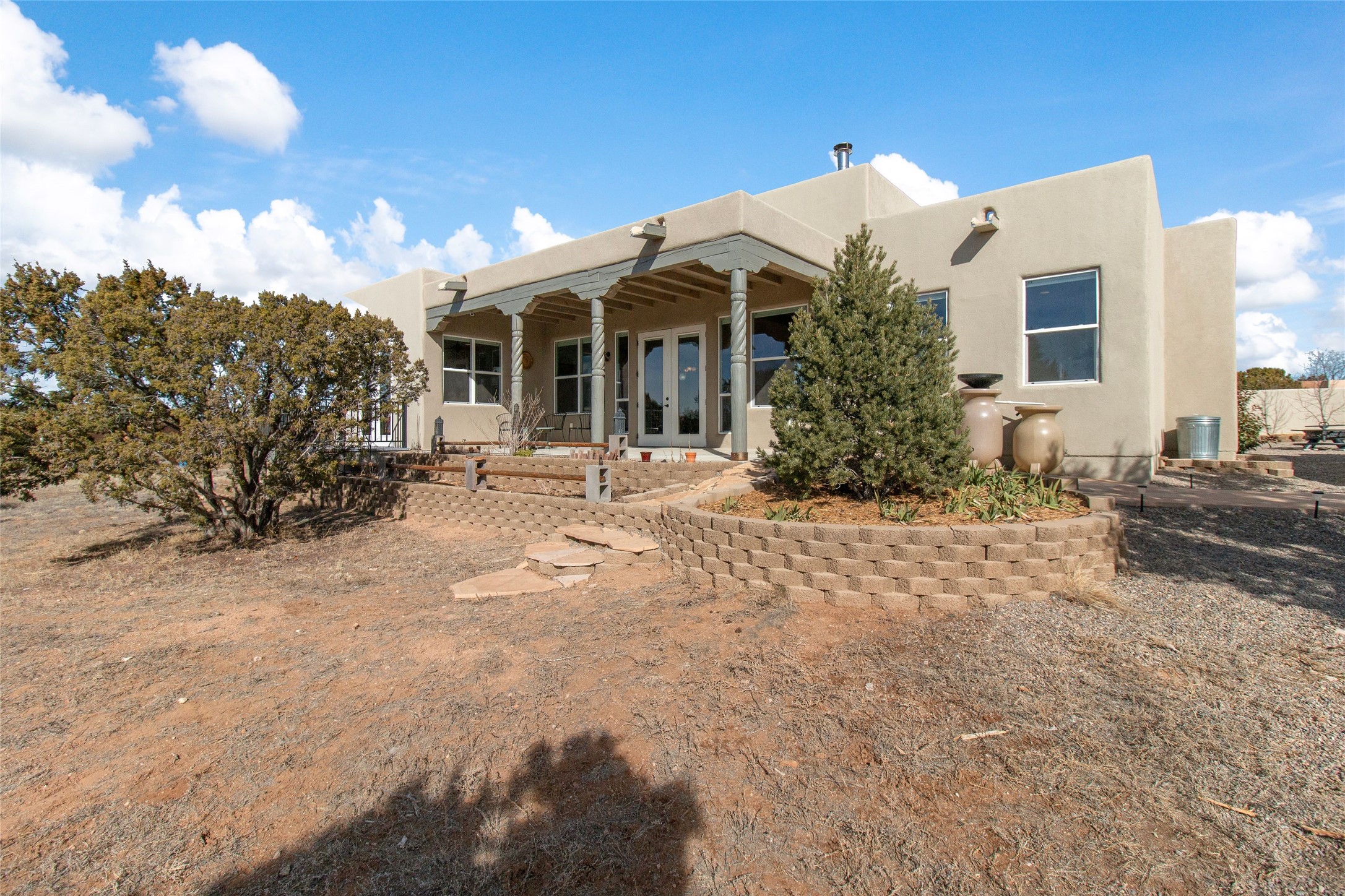 Pride of ownership is apparent the minute you walk into this exceptional 2019 contemporary build in Eldorado. Sellers have invested approximately $151,000 in improvements, included the construction of a new casita, during their ownership. Upon entry into the front court yard, you are greeted by apple, peach and cherry trees. The main house offers 3 bedrooms, 2 baths and open living concept with a split bedroom configuration for owner and guest privacy. Stunning views from the living room and back portal await you on this 1.4 acres. This home was built for energy efficiency as a priority with a HERS rating of 70. A solar panel system attached to the grid was added to the home in 2024 for ultra low electric bills. A Hearthstone Green Mountain convection wood stove takes the chill off those really cold winter evenings. An annually serviced tankless water heater ensures you never run out of hot water. Central cooling and heating. A detached one bedroom casita with a 3/4 quarters bathroom is perfect for guests or an in-law suite, plus an adjacent RV garage. For all the amenities available to homeowners in Eldorado, check out www.eldoradosf.org