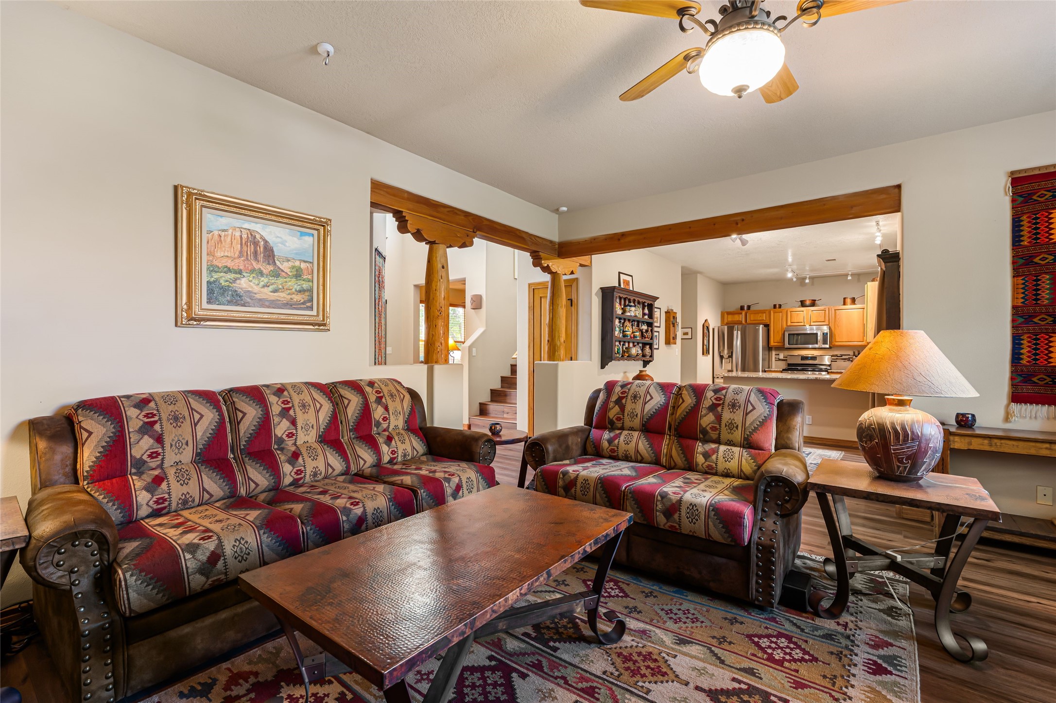 Well maintained and updated 2 story home on a corner lot with Sangre and sunset views. 3 bedrooms upstairs with 2 full bath rooms. Primary bedroom has access to roof deck. Downstairs includes a office/den, separate formal dining room, comfortable living room with a gas fireplace, and a well appointed kitchen with newer appliances and upgraded granite counter tops. Outside is a relaxing gem of an outdoor 'living' room complete with ceiling fans and room to bar-b-que. All the outdoor furniture conveys - including a water feature and fire pit. Numerous healthy fruit trees and rose bushes, front yard has 2 gorgeous heritage maple trees. Attached garage, newer washer and dryer, recently re-siliconed roof - this house is ready to move in and make your own!