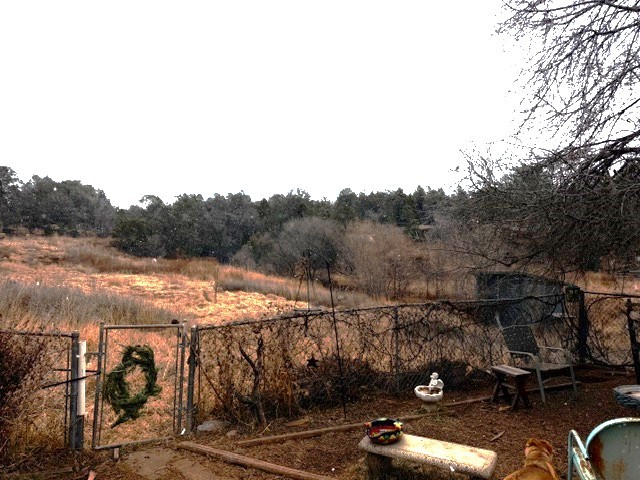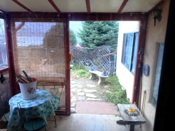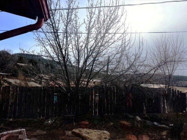 If you are looking for peace and quiet, lovely views that include sunsets, come and look at this house! Enjoy the joys of small-town life in this charmer! Situated east of the center of Pecos and the Pecos River in East Pecos, there are mountain views from the property, and the surrounding properties have beautiful rock formations. Two bedrooms, one bath, large living room which is a later addition to the main house. New laminate flooring in the whole house, new toilet, and new hot water in 2022-23. The main house has a second living area with dining area. The country chicken sink is the focal point of the kitchen. The older/smaller living area could potentially be turned into a third bedroom. Partially enclosed front porch. A large building in the back is divided into two spaces, a studio on one side and storage on the other. It has electricity, and heating on the right (larger) side. The property is completely fenced, with an apple tree, dwarf crabapple, and grape vines.