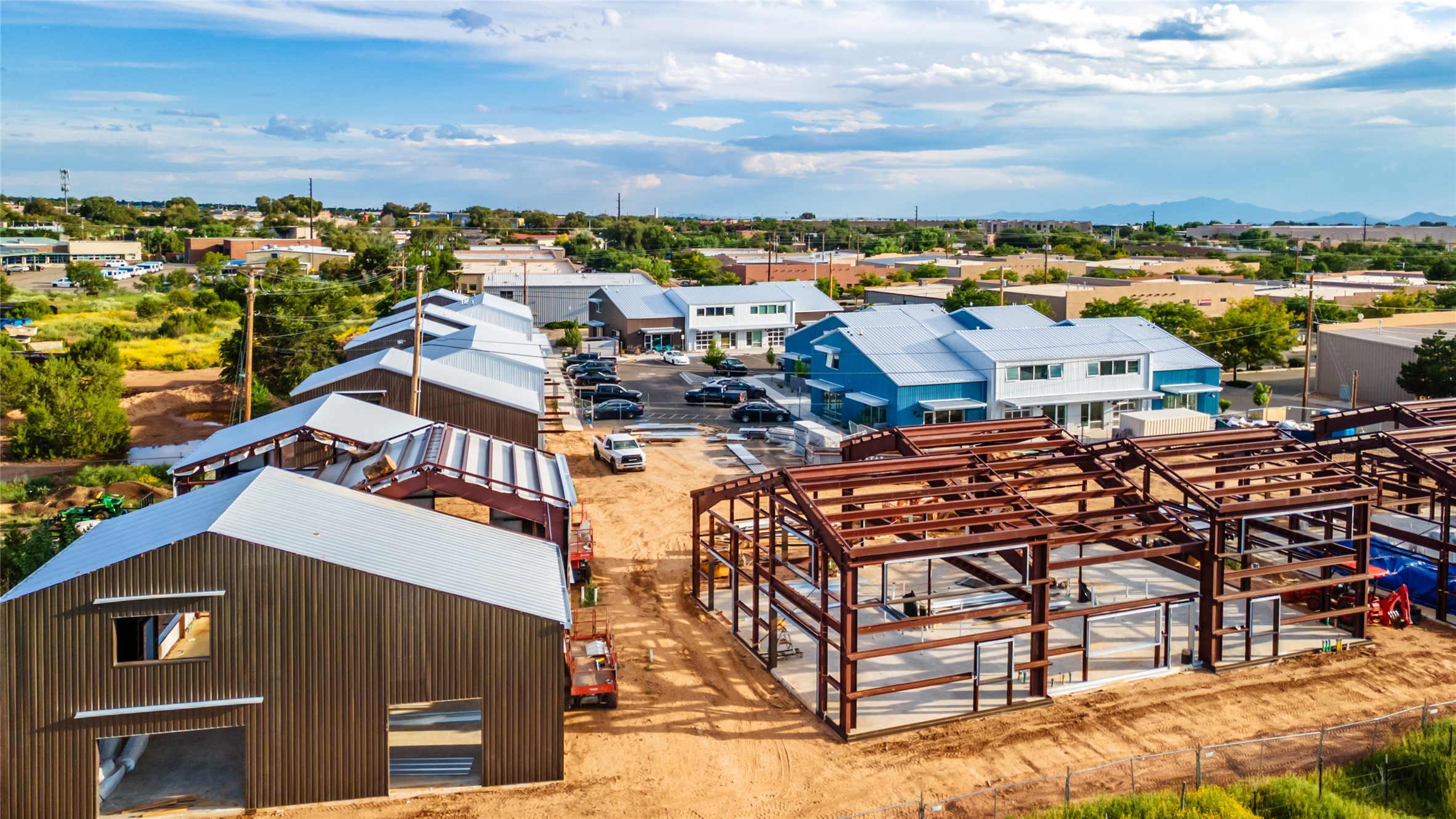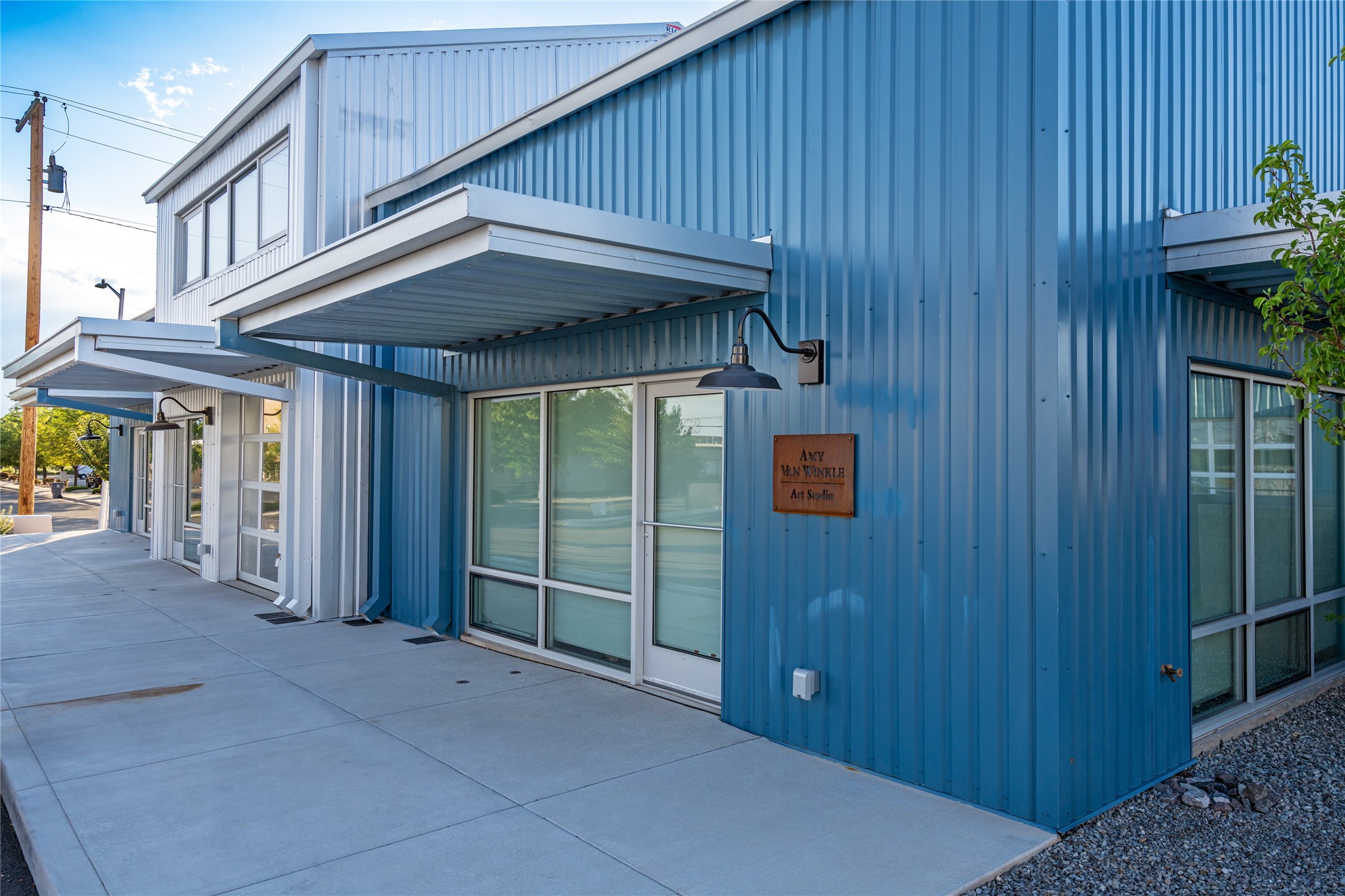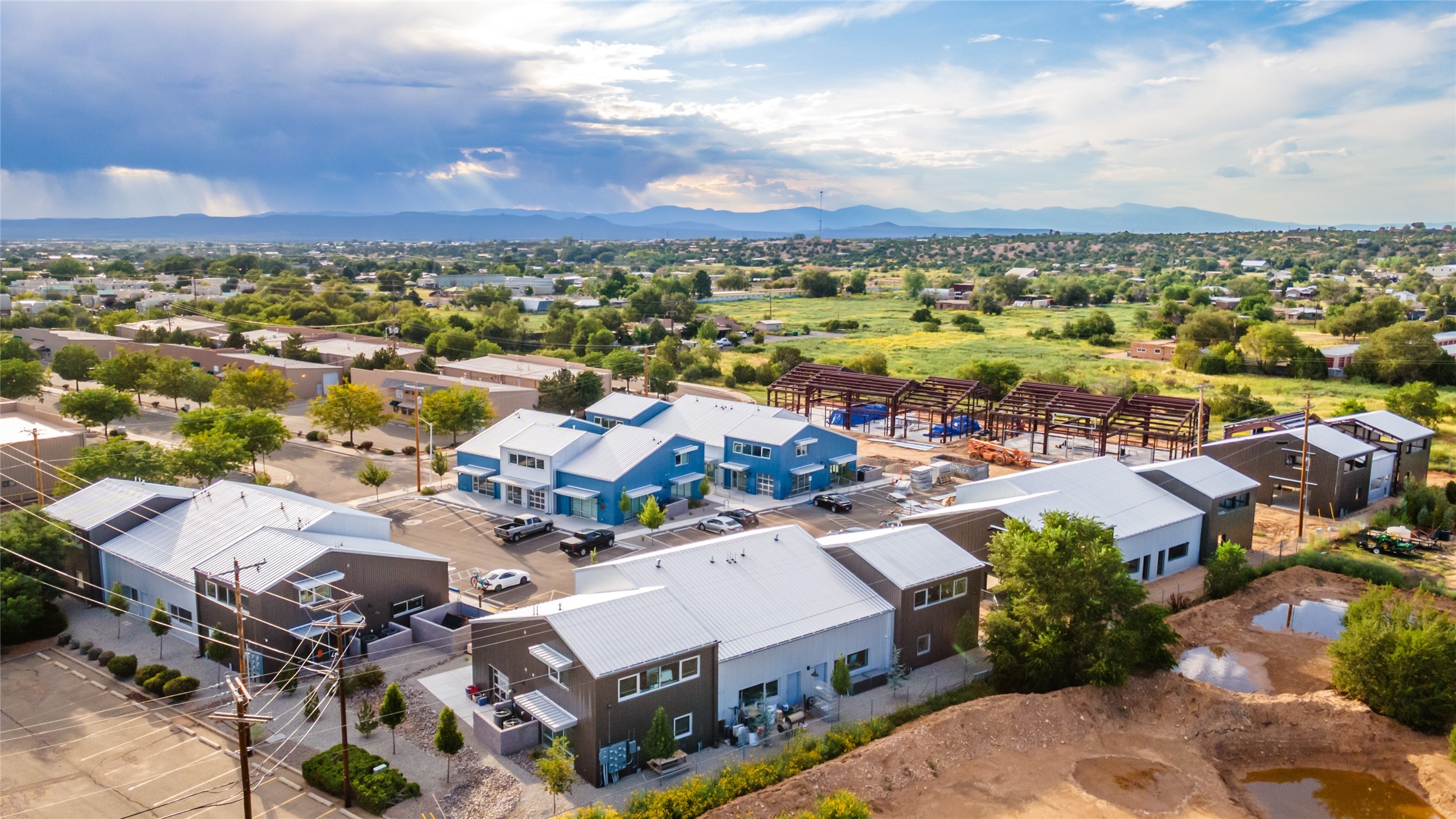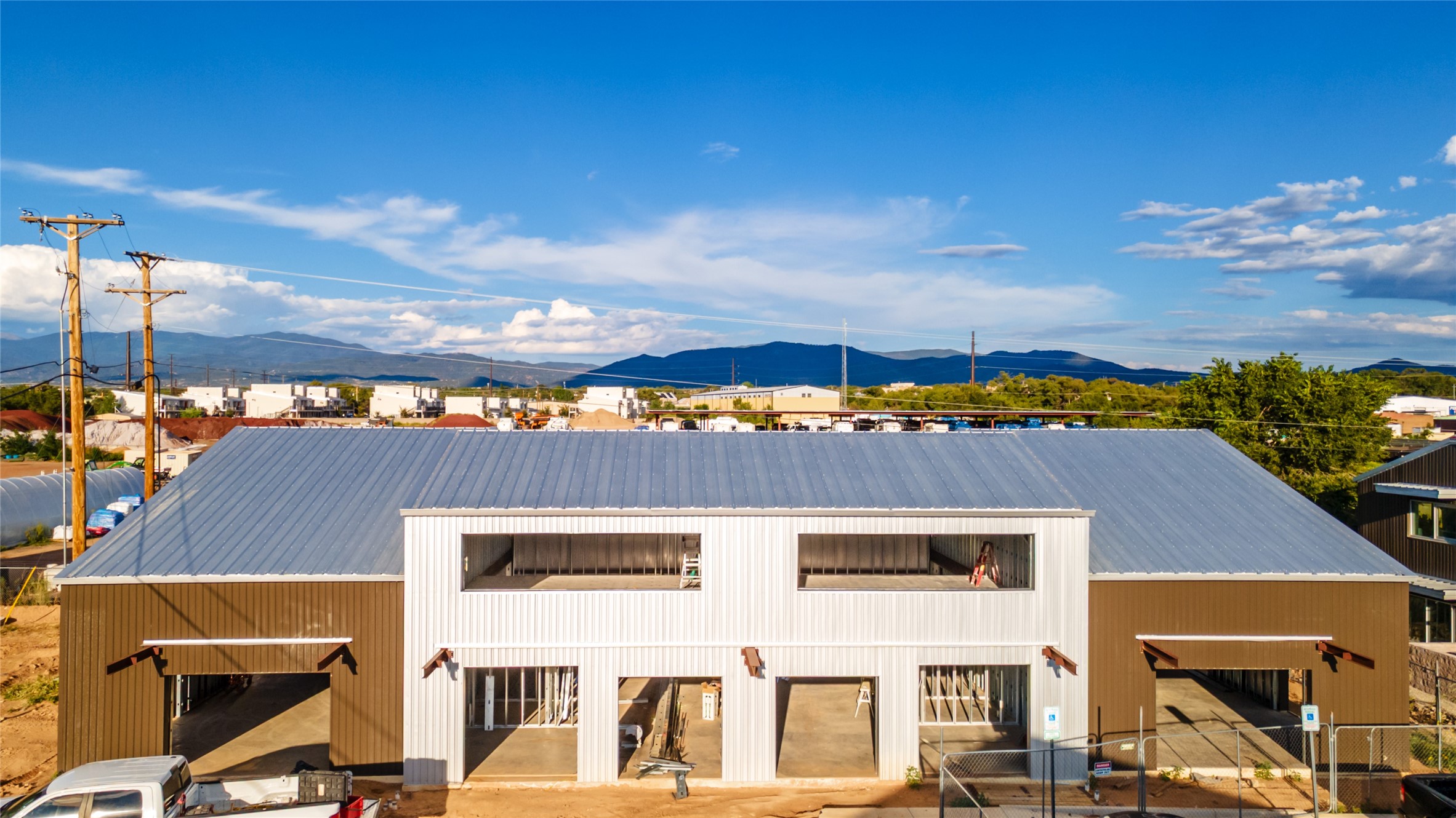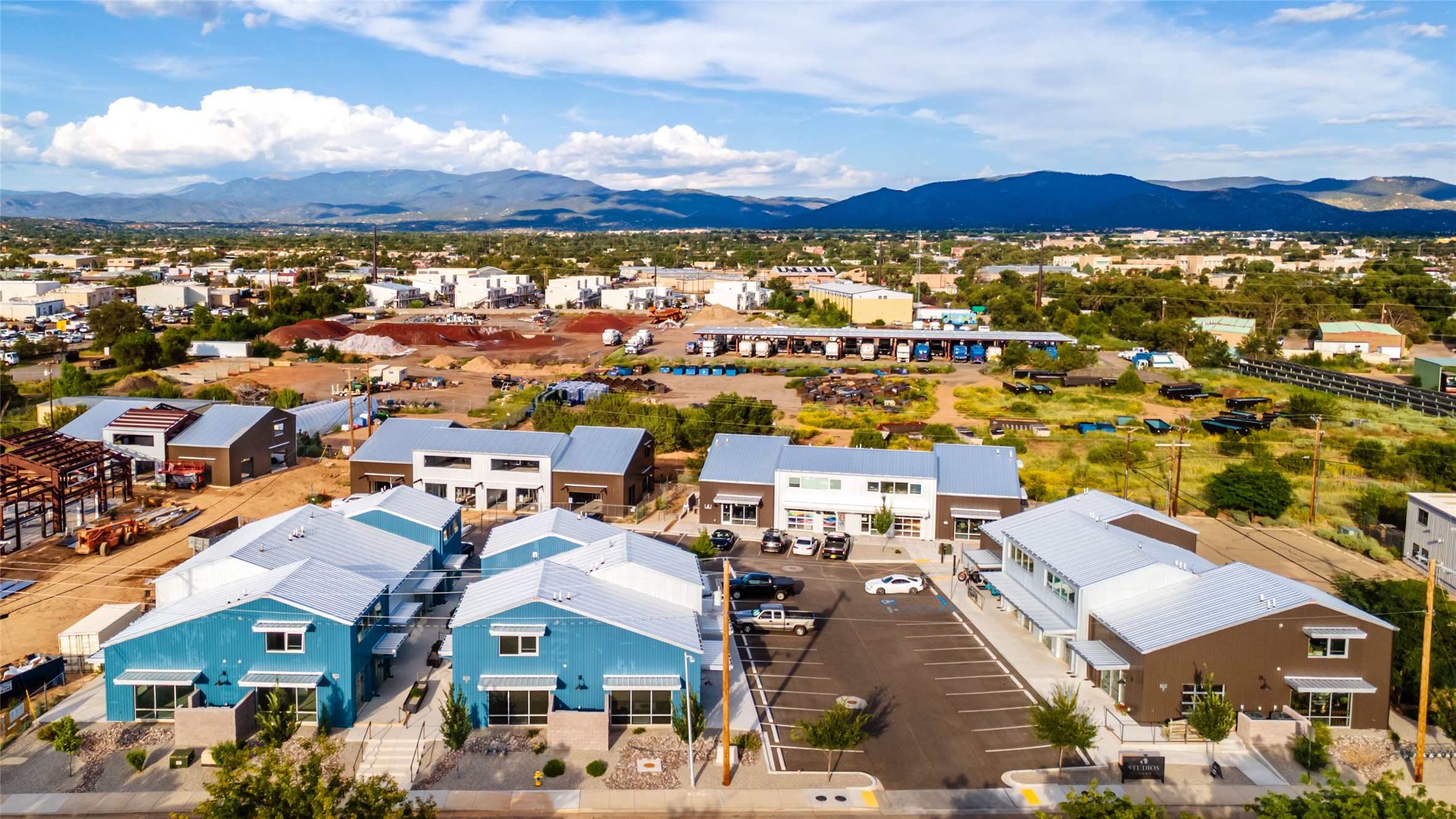 The Studios at Parkway Phase 2, currently under construction, is Santa Fe's newest commercial, industrial, and flex-use condominium development in the thriving Siler/Rufina Warehouse, Art & Innovation District. Designed with an industrial aesthetic, The Studios offer open, light-filled spaces with contemporary touches that create an inspiring environment for business. Each unit spans nearly 1,677 square feet, including 1,587 square feet of interior space ("walls in"), and features tall ceilings, large aluminum glass roll-up garage doors, expansive storefront windows, and finished concrete floors. Inside, you'll find LED lighting, handcrafted steel staircases with wood treads, and smooth drywall finishes. The ground floor encompasses 1,092 square feet, while the second story adds 584 square feet. These units are designed with flexibility in mind, with an option for Live-Work as an accessory to commercial use. Each unit has separately metered utilities, kitchen-ready hookups, a designated area for a shower, and thoughtfully landscaped grounds tailored for shipping and receiving. Zoned I-1, these state-of-the-art condominiums are suitable for a range of uses, from offices, galleries, and artist studios to warehouses, wellness businesses, and light industry. Additionally, the roof is prepared for solar PV installation, and the property is located in a Federal Opportunity Zone.