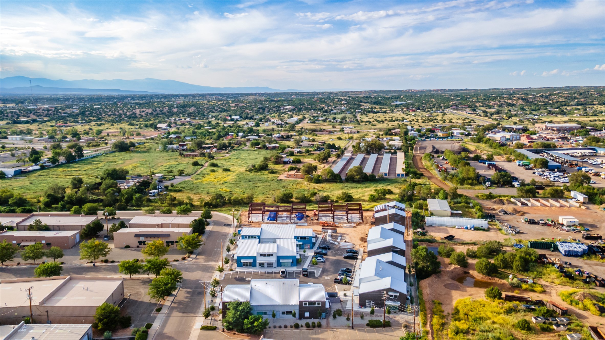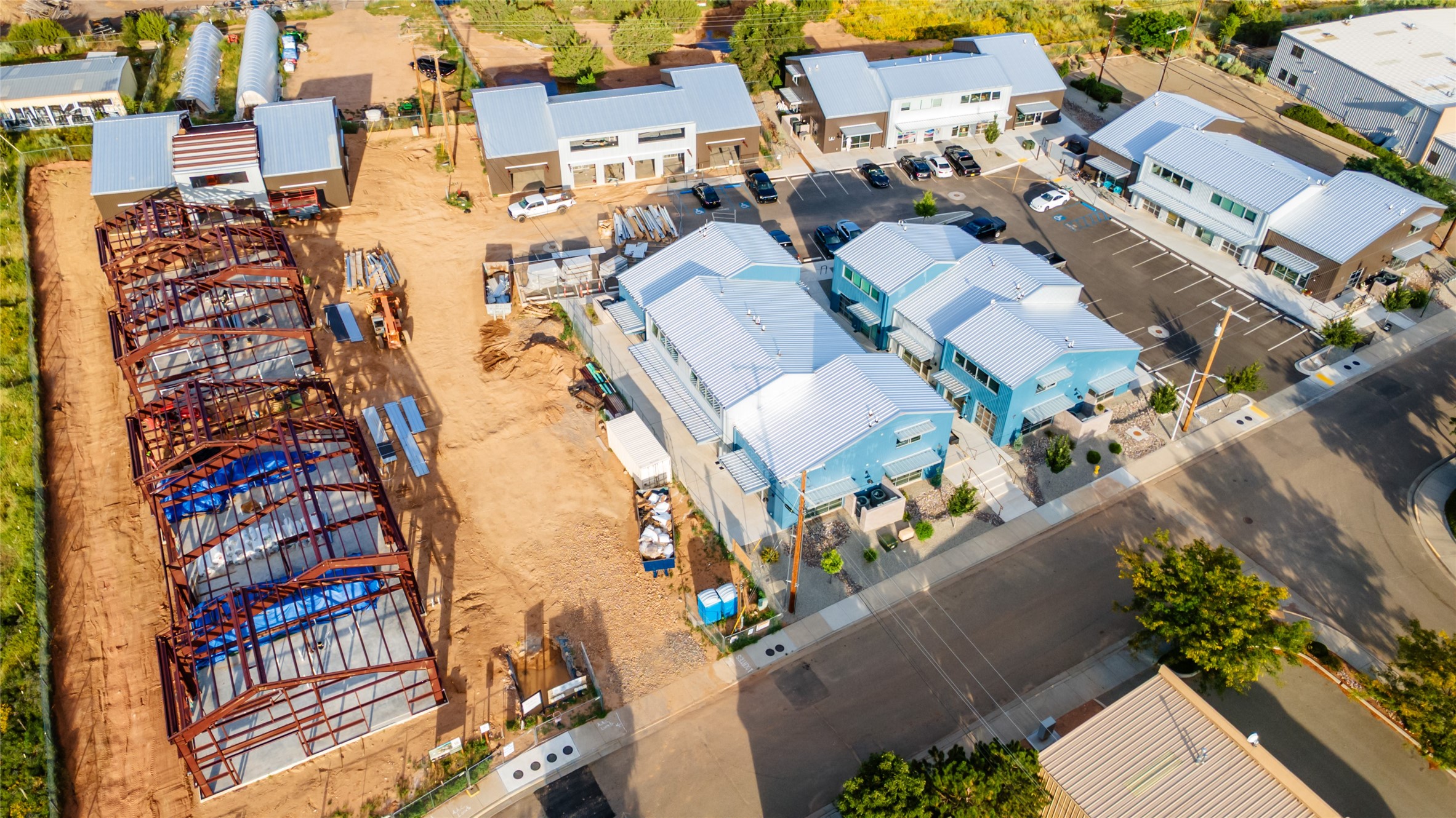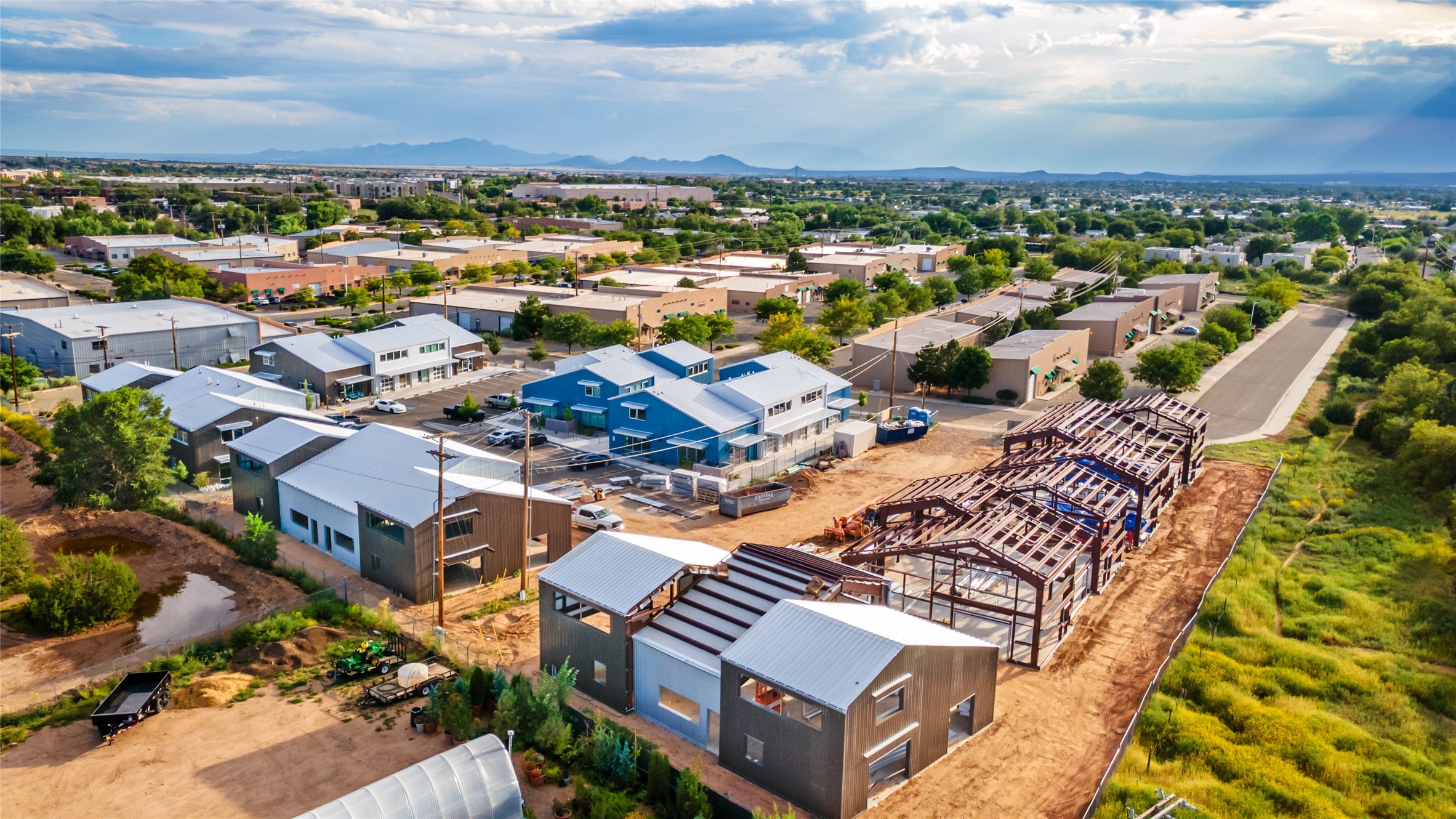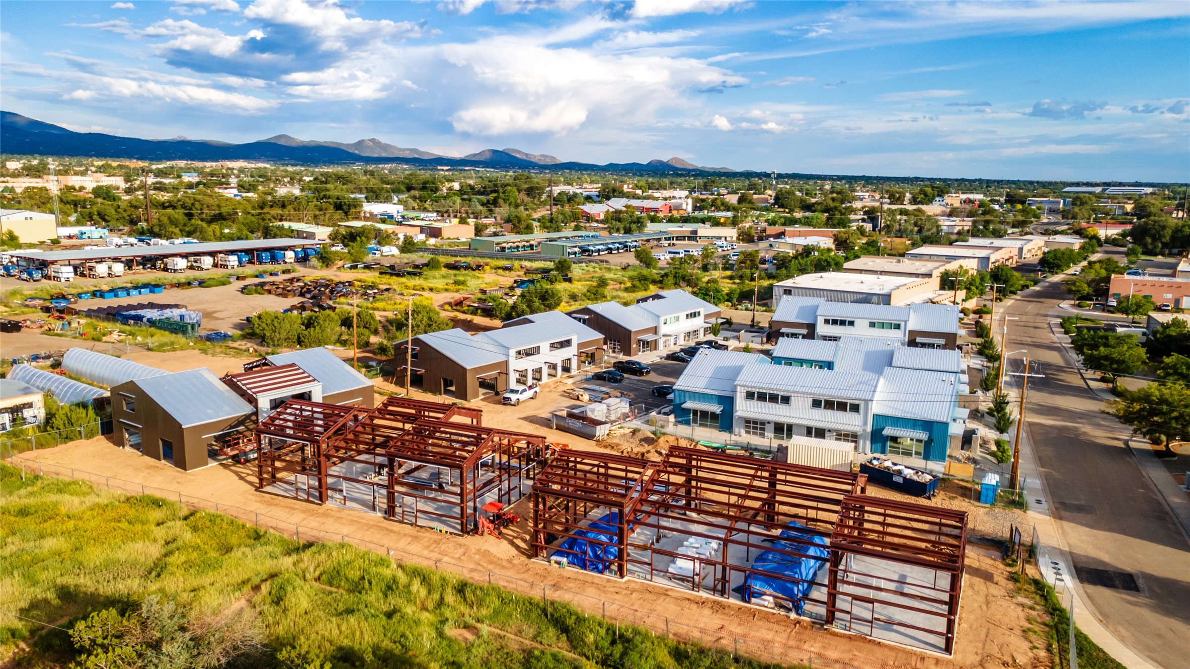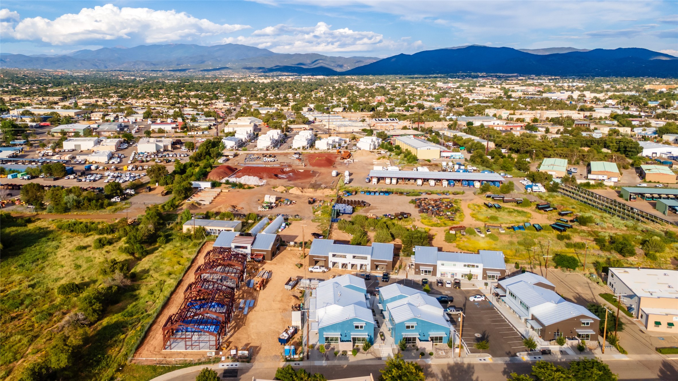 The Studios at Parkway Phase 2, currently under construction, is Santa Fe's newest commercial, industrial, and flex-use condominium development in the thriving Siler/Rufina Warehouse, Art & Innovation District. Designed with an industrial aesthetic, The Studios offer open, light-filled spaces with contemporary touches that create an inspiring environment for business. Each unit spans nearly 1,677 square feet, including 1,587 square feet of interior space ("walls in"), and features tall ceilings, large aluminum glass roll-up garage doors, expansive storefront windows, and finished concrete floors. Inside, you'll find LED lighting, handcrafted steel staircases with wood treads, and smooth drywall finishes. The ground floor encompasses 1,092 square feet, while the second story adds 584 square feet. These units are designed with flexibility in mind, with an option for Live-Work as an accessory to commercial use. Each unit has separately metered utilities, kitchen-ready hookups, a designated area for a shower, and thoughtfully landscaped grounds tailored for shipping and receiving. Zoned I-1, these state-of-the-art condominiums are suitable for a range of uses, from offices, galleries, and artist studios to warehouses, wellness businesses, and light industry. Additionally, the roof is prepared for solar PV installation, and the property is located in a Federal Opportunity Zone.