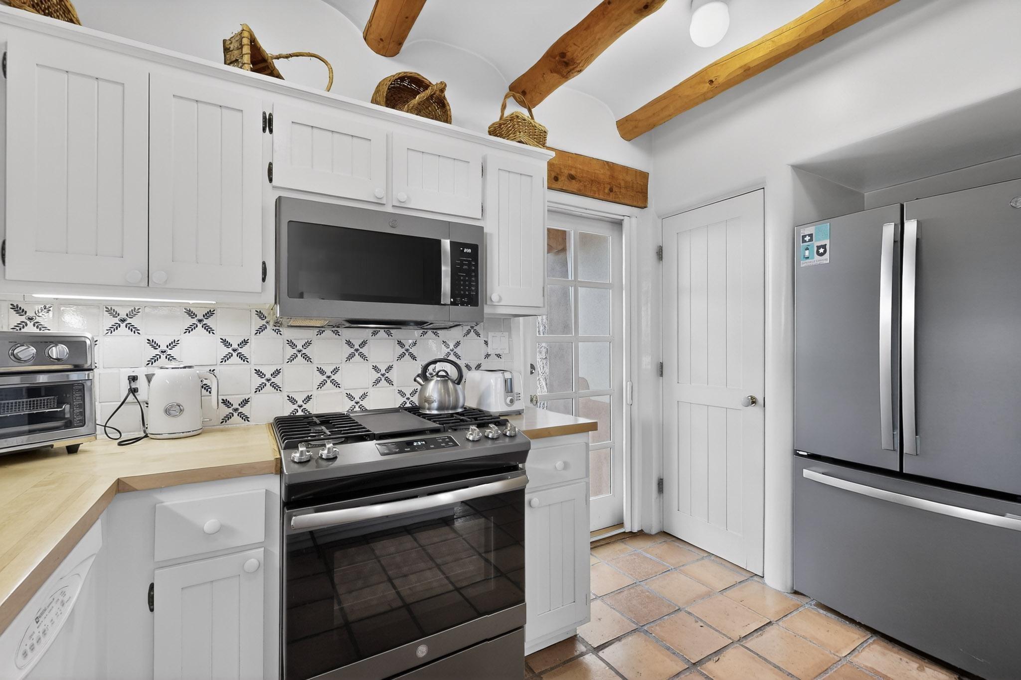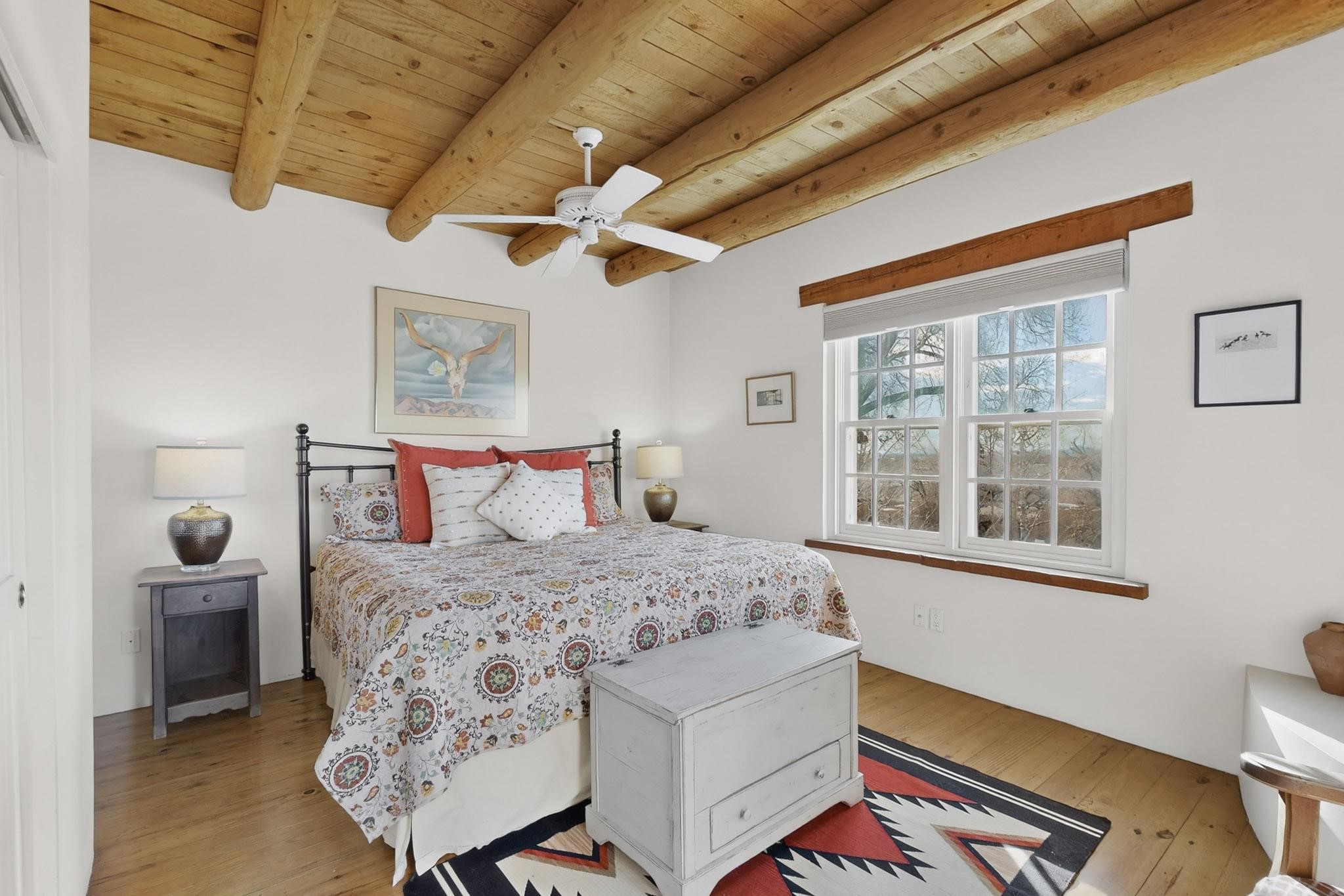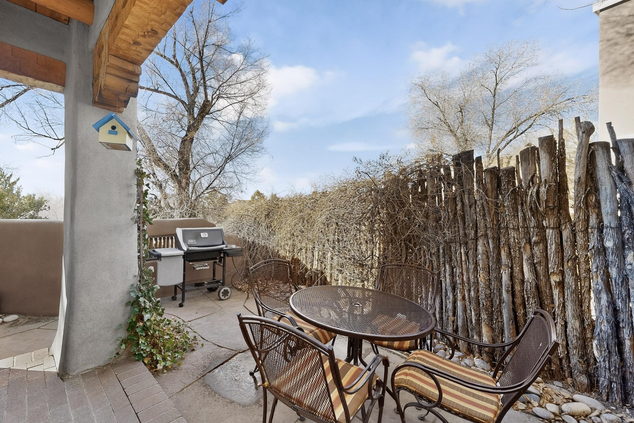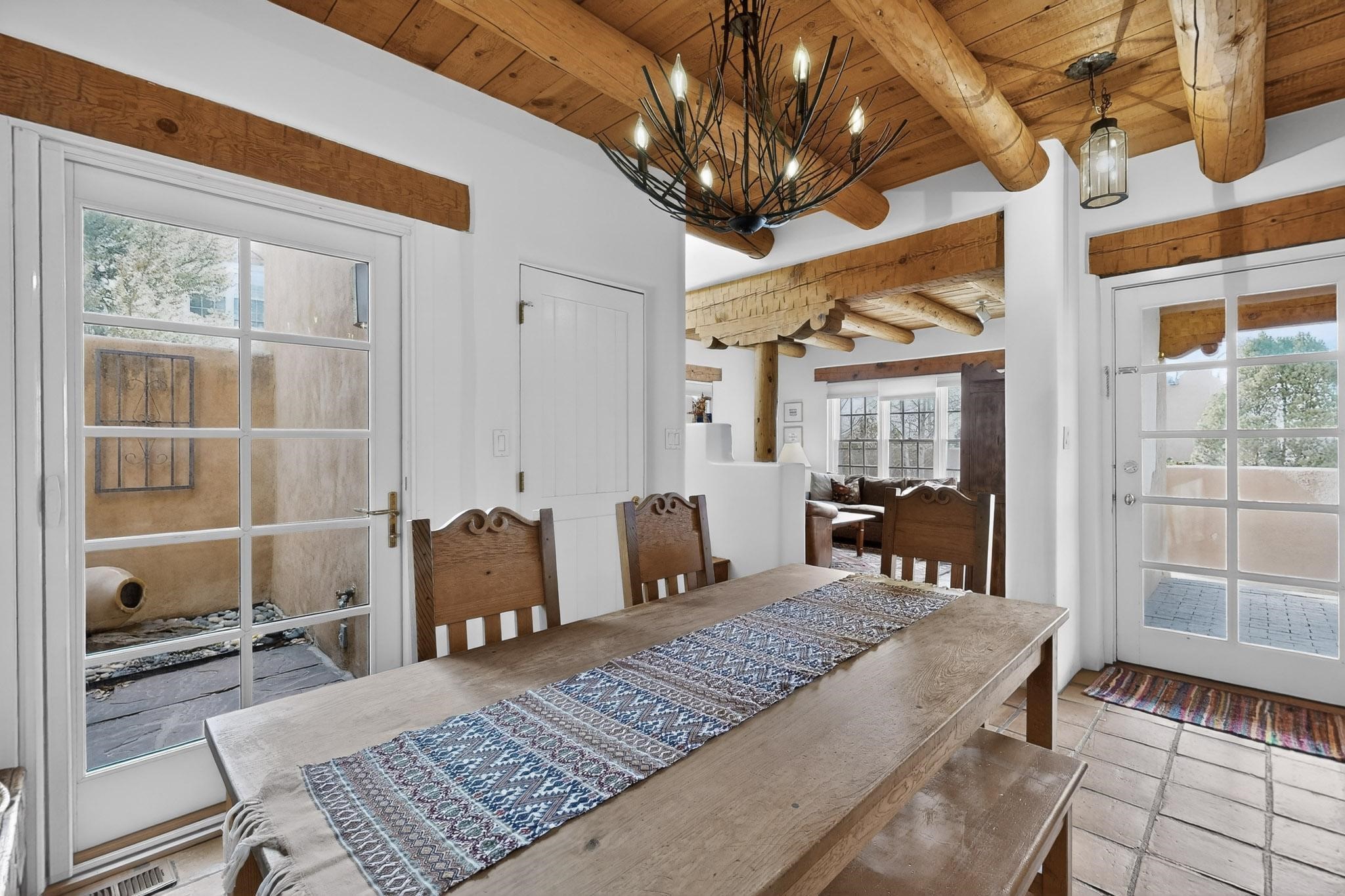 Charming condominium quarter ownership just a few blocks from the Plaza. Beautiful architectural details found in gracious old adobe home with vigas, kiva fireplaces, sculptural smooth plaster walls, hand adzed lintels above windows and doors. Tile kitchen and baths. All furnishings and maintenance, inside and out by Owners Association. Owners Association management operates established rental program.