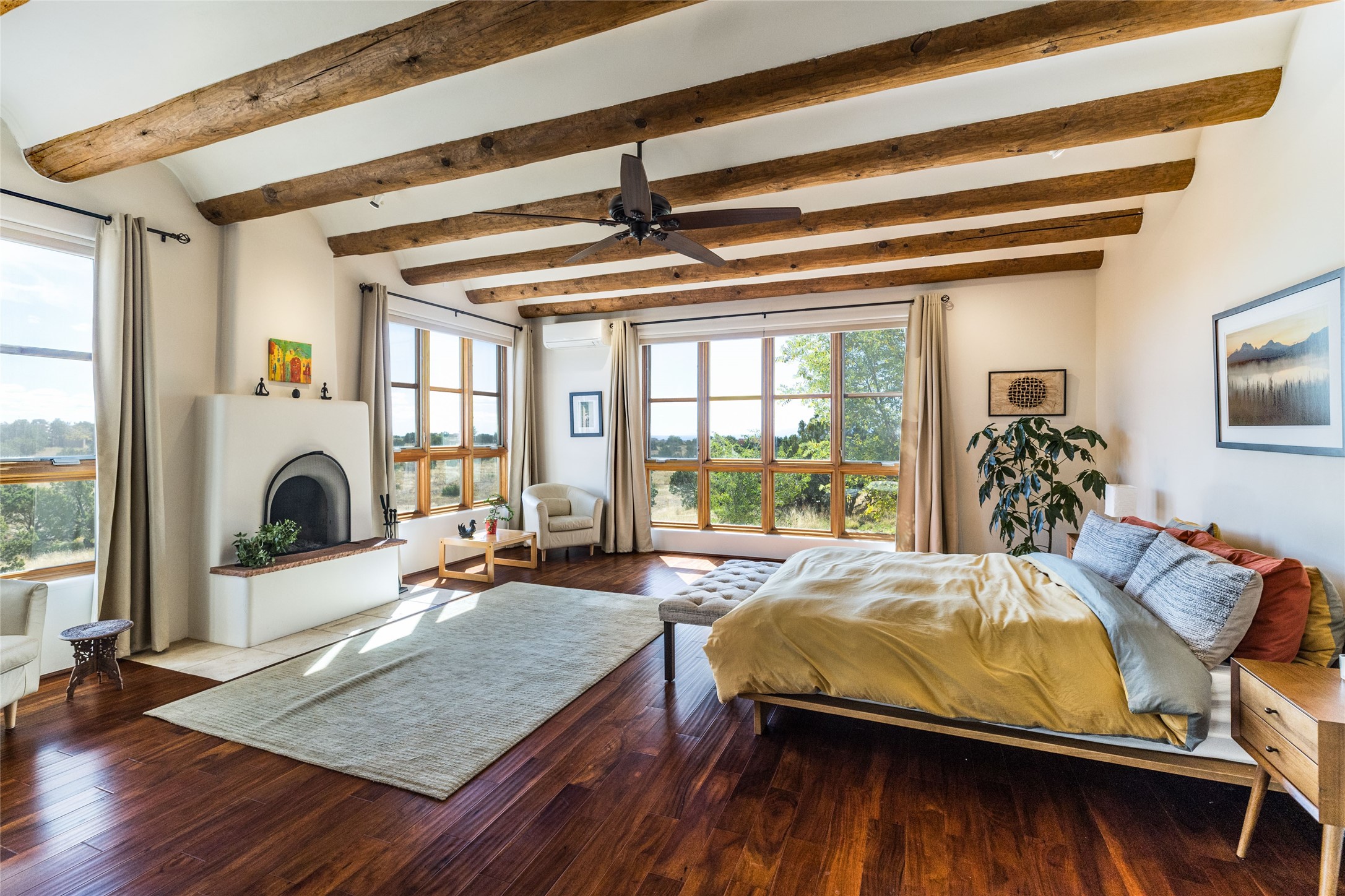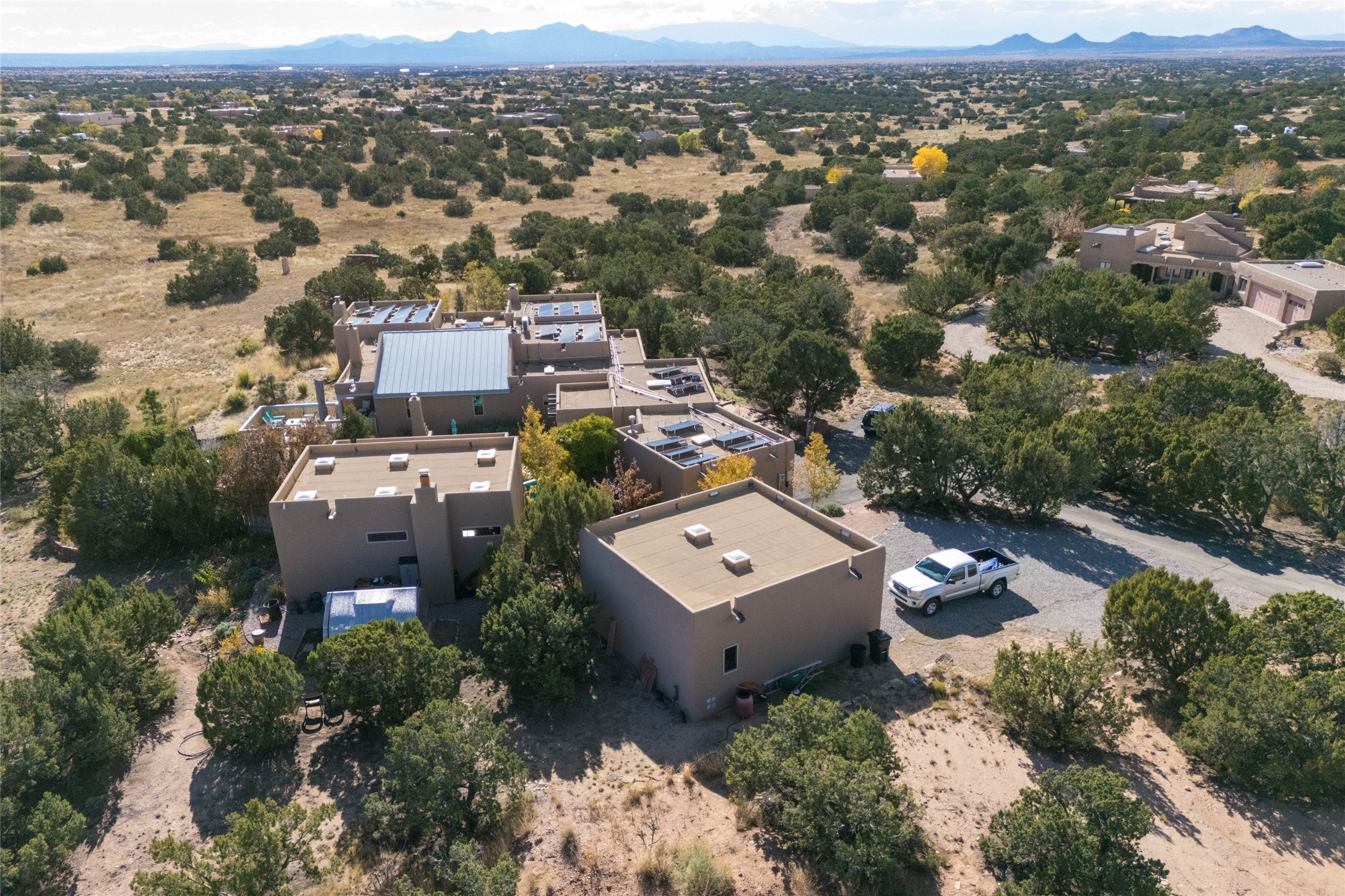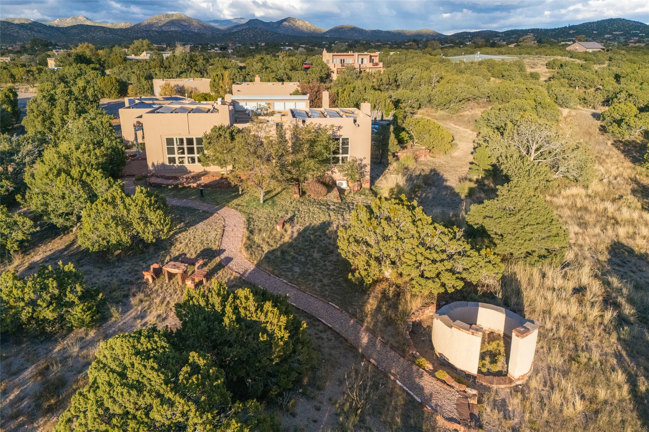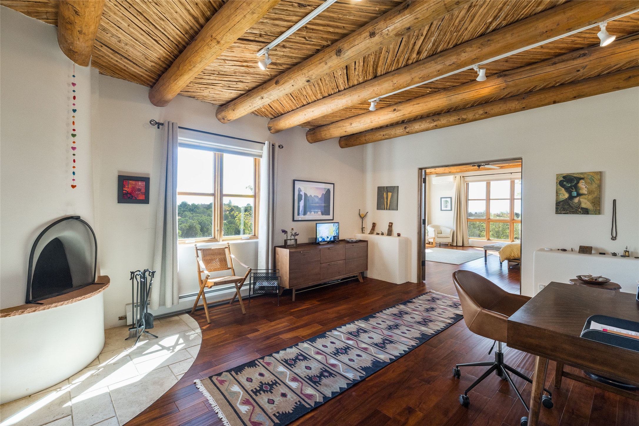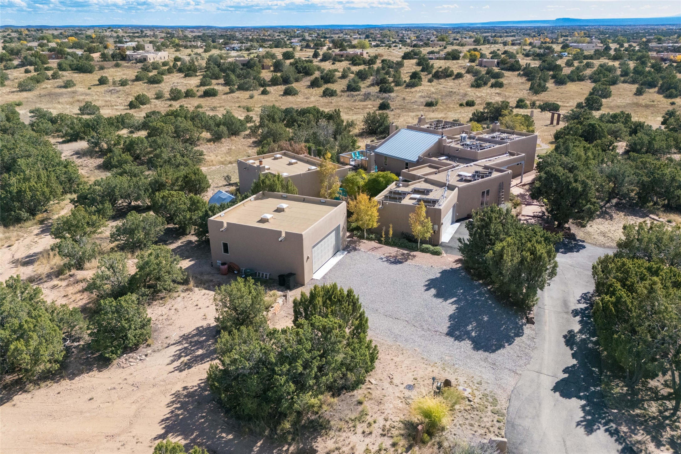 This beautiful estate, situated on over 4 acres, has 3 bedrooms, 2 baths, a dedicated office space, views from nearly every room, two oversized two-car garages (one detached, perfect for a workshop), plus a standalone 600 sf studio/casita with an extra 1 bedroom, 1 bath (previously used as an art studio). True chef's kitchen with Wolf appliances and sub-zero refrigerator, double ovens, granite counters, large island with bar seating.Just off the kitchen is a spacious formal dining room with custom built-ins and french doors. The private suite is entered through a sitting room/office with viga ceilings, kiva fireplace and access to a private viewing deck. Spa-like primary bath with generous walk-in shower, separate jetted tub, double sinks, and walk in closet.There are a total of 6 fireplaces.Light-filled living room featuring exposed vigas and corbels, kiva fireplace, custom wood built-in shelving and cabinetry, and expansive windows capturing beautiful views. Owned solar system helps reduce utility costs, allowing you to enjoy the space of this home without the typical energy expense. Other amenities include radiant floor heating, new mini splits, hot tub and a greenhouse.