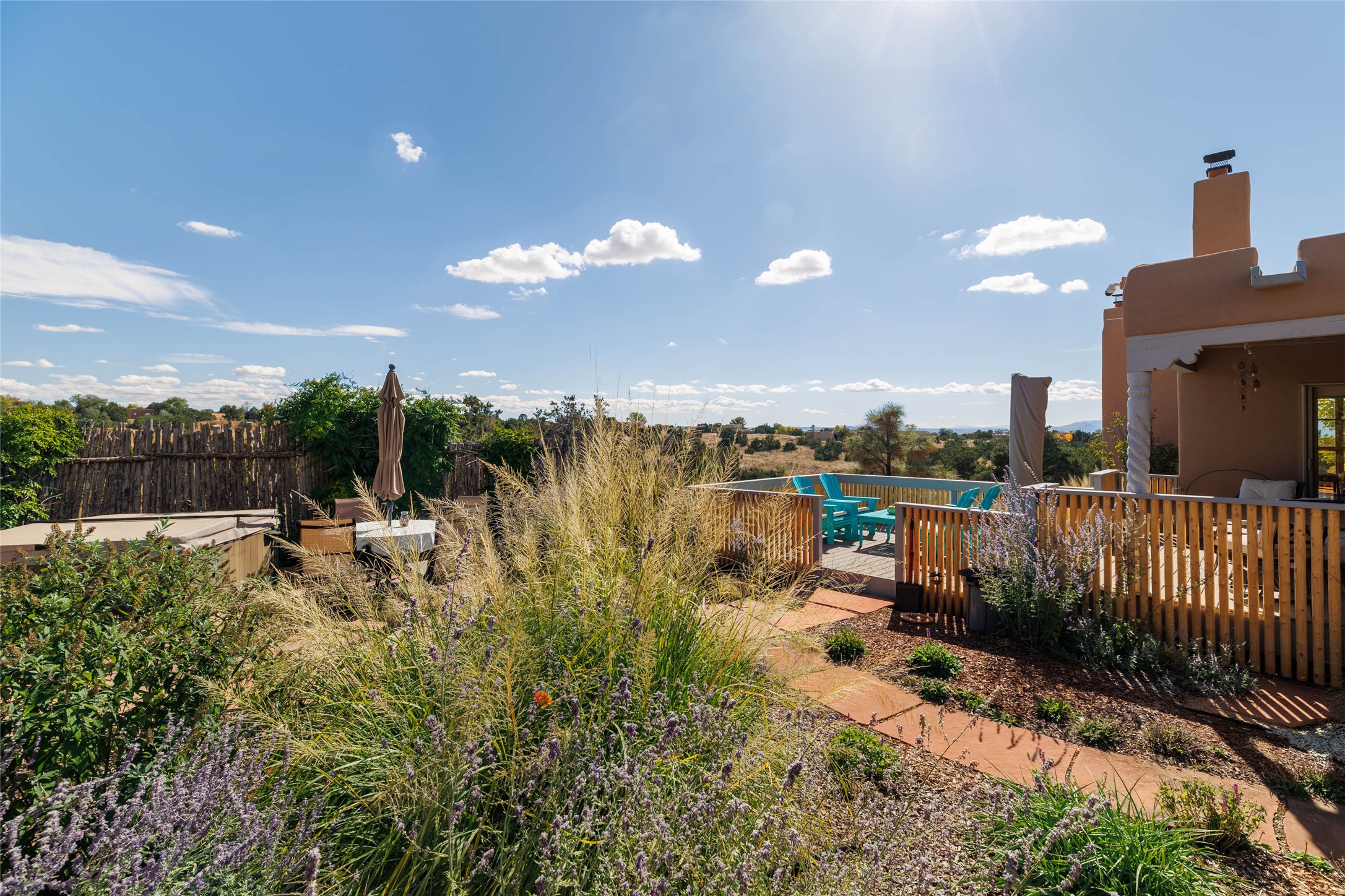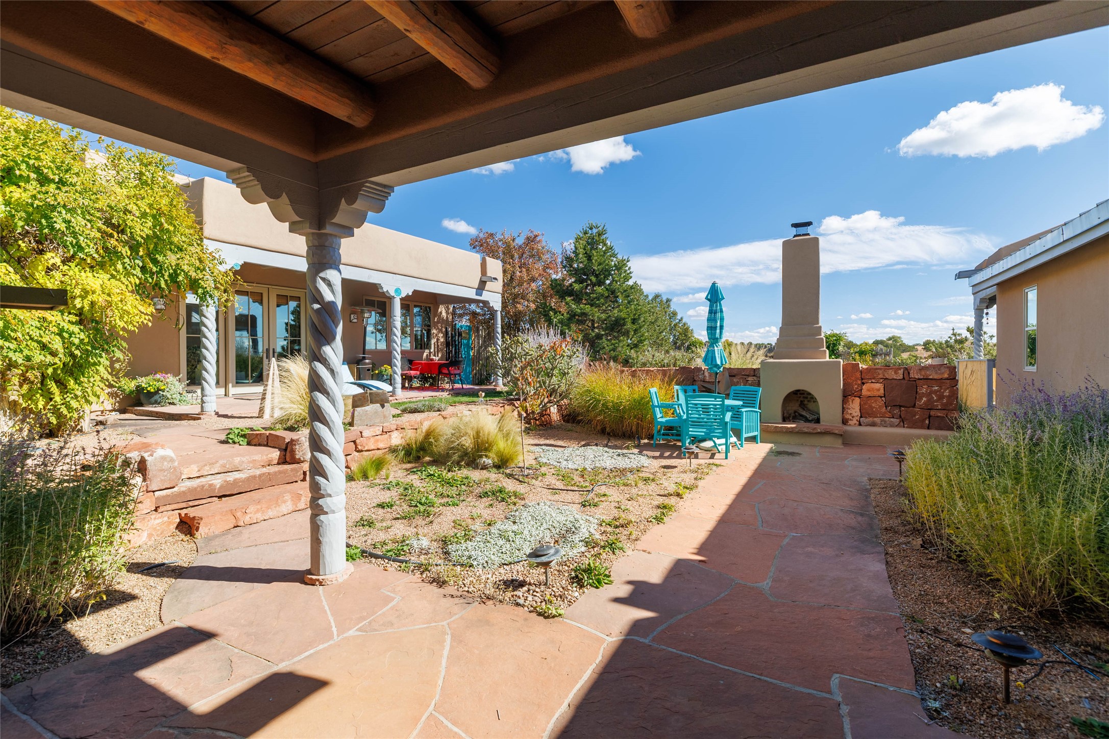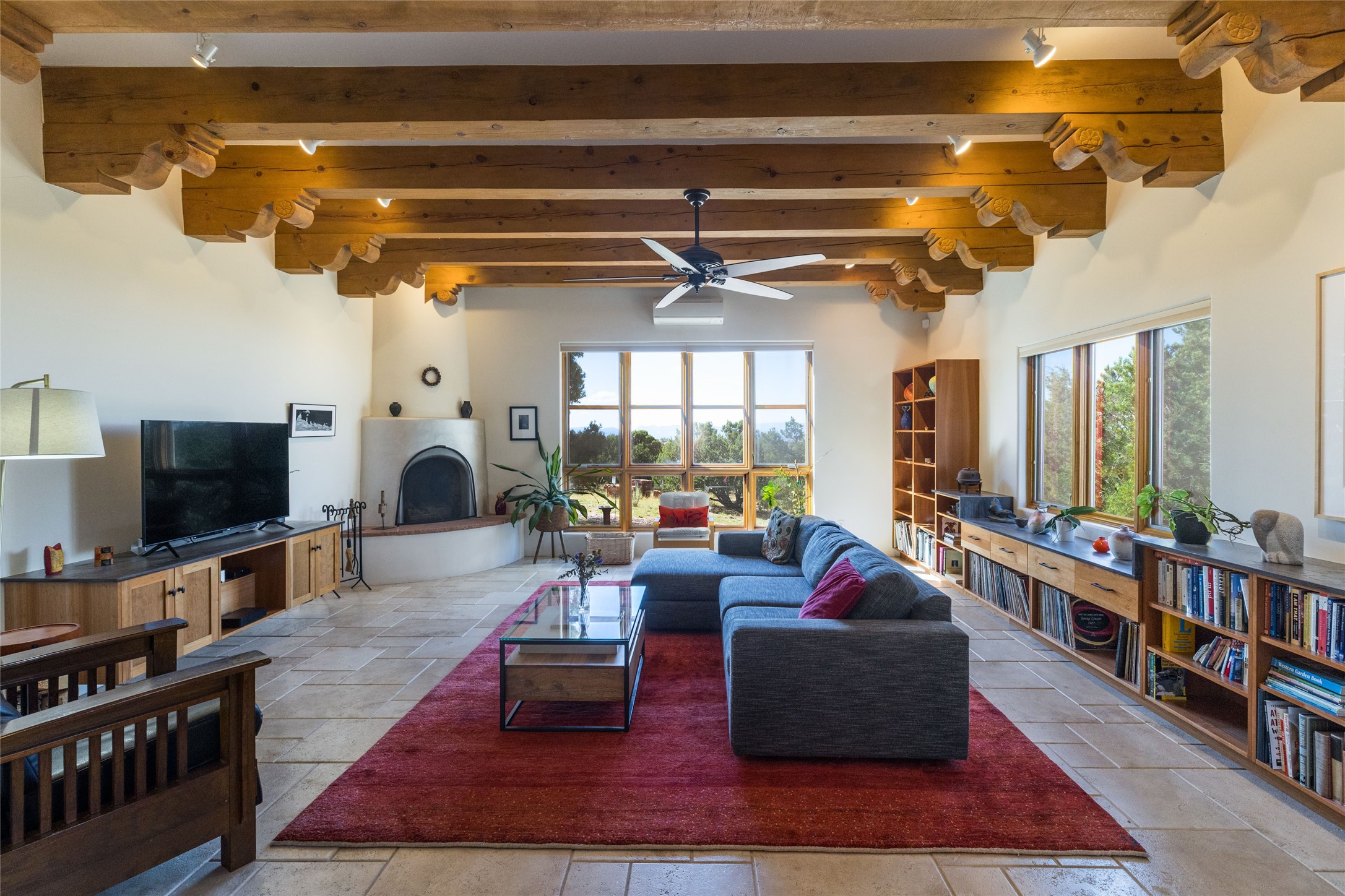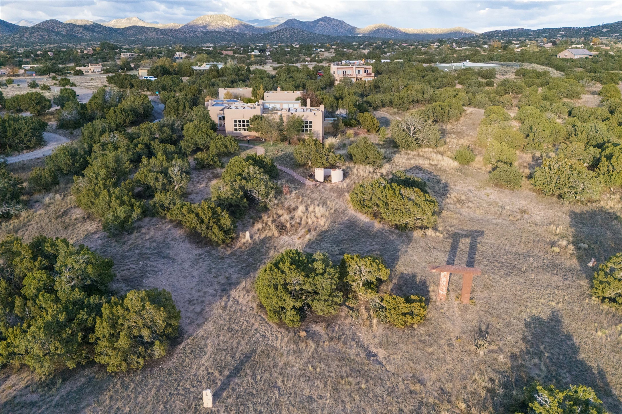 This beautiful estate, situated on over 4 acres, has 3 bedrooms, 2 baths, a dedicated office space, views from nearly every room, two oversized two-car garages (one detached, perfect for a workshop), plus a standalone 600 sf studio/casita with an extra 1 bedroom, 1 bath (previously used as an art studio). True chef's kitchen with Wolf appliances and sub-zero refrigerator, double ovens, granite counters, large island with bar seating.Just off the kitchen is a spacious formal dining room with custom built-ins and french doors. The private suite is entered through a sitting room/office with viga ceilings, kiva fireplace and access to a private viewing deck. Spa-like primary bath with generous walk-in shower, separate jetted tub, double sinks, and walk in closet.There are a total of 6 fireplaces.Light-filled living room featuring exposed vigas and corbels, kiva fireplace, custom wood built-in shelving and cabinetry, and expansive windows capturing beautiful views. Owned solar system helps reduce utility costs, allowing you to enjoy the space of this home without the typical energy expense. Other amenities include radiant floor heating, new mini splits, hot tub and a greenhouse.