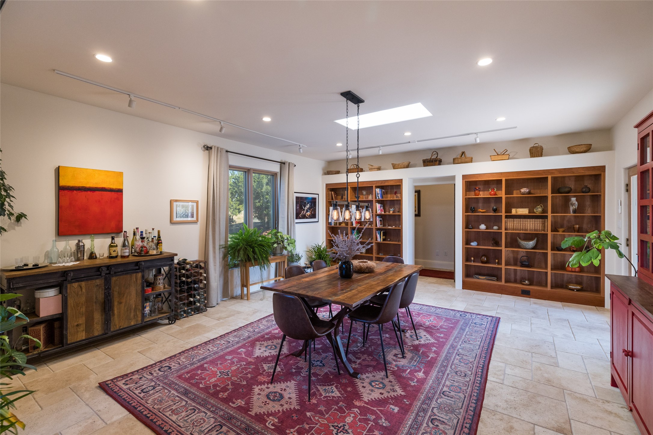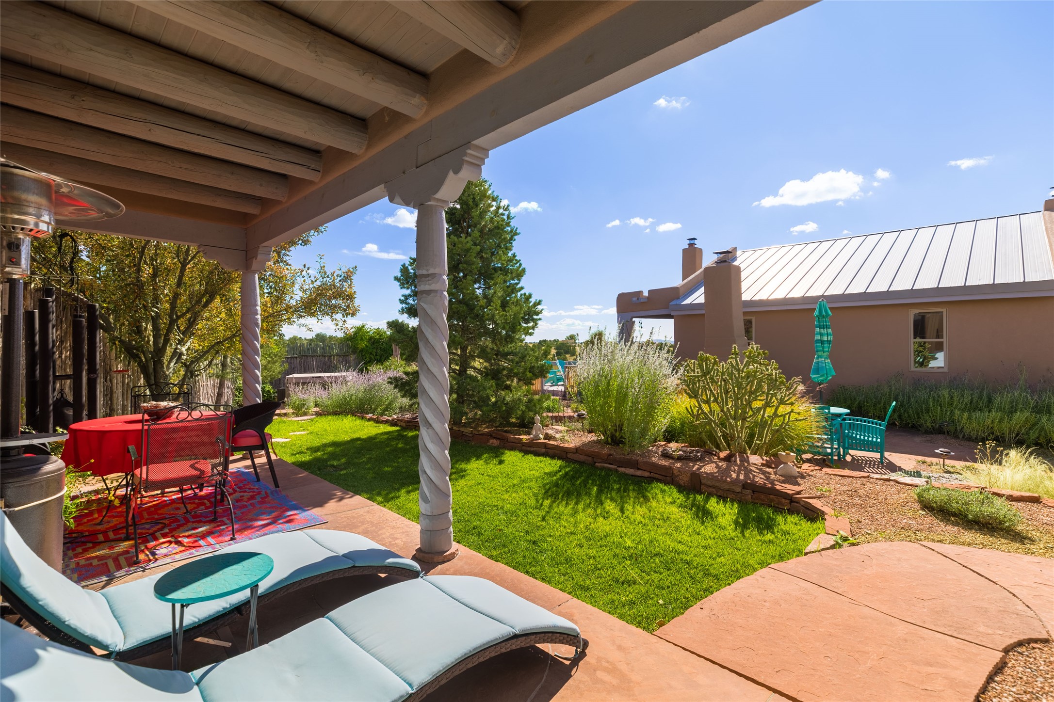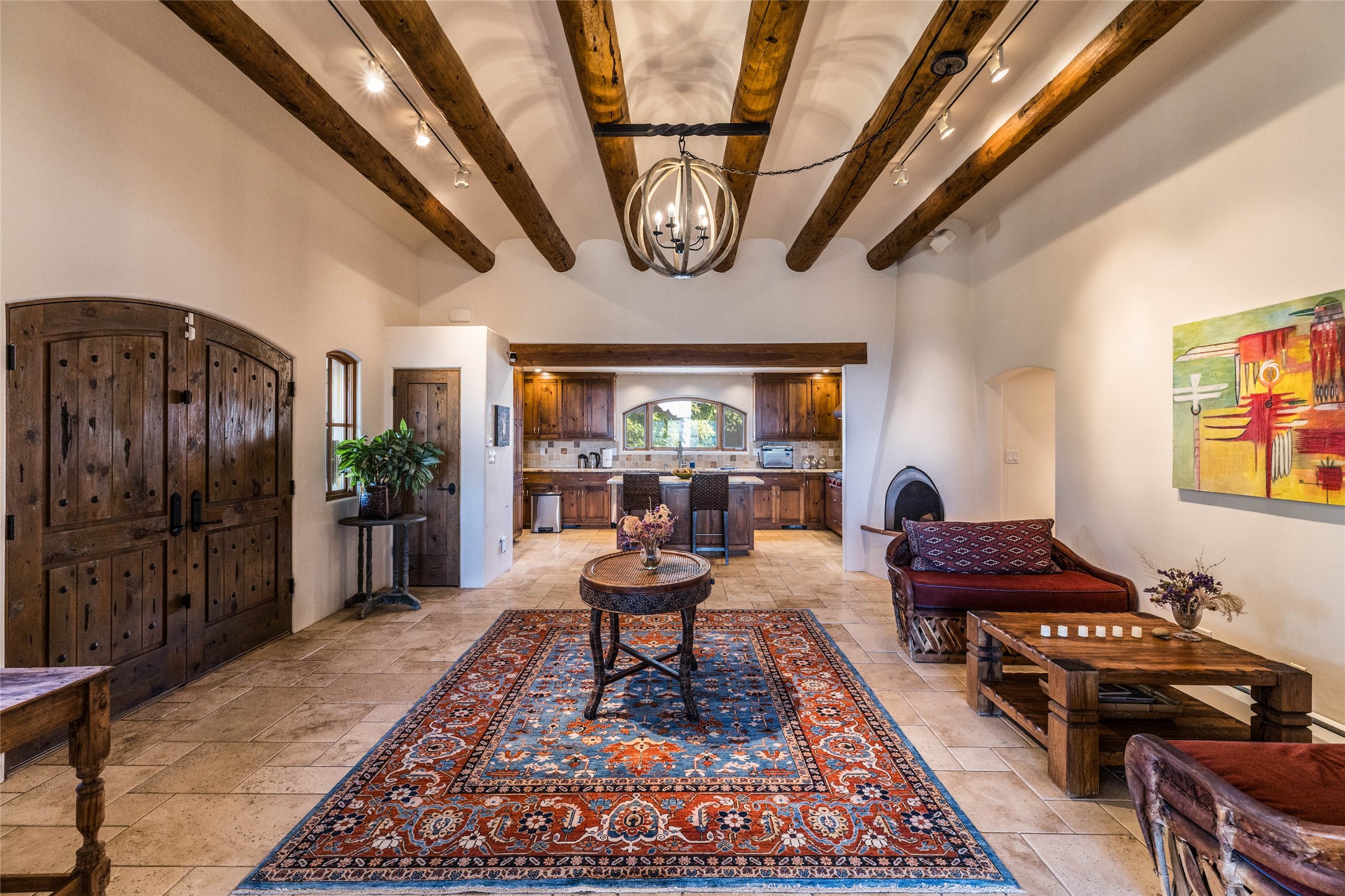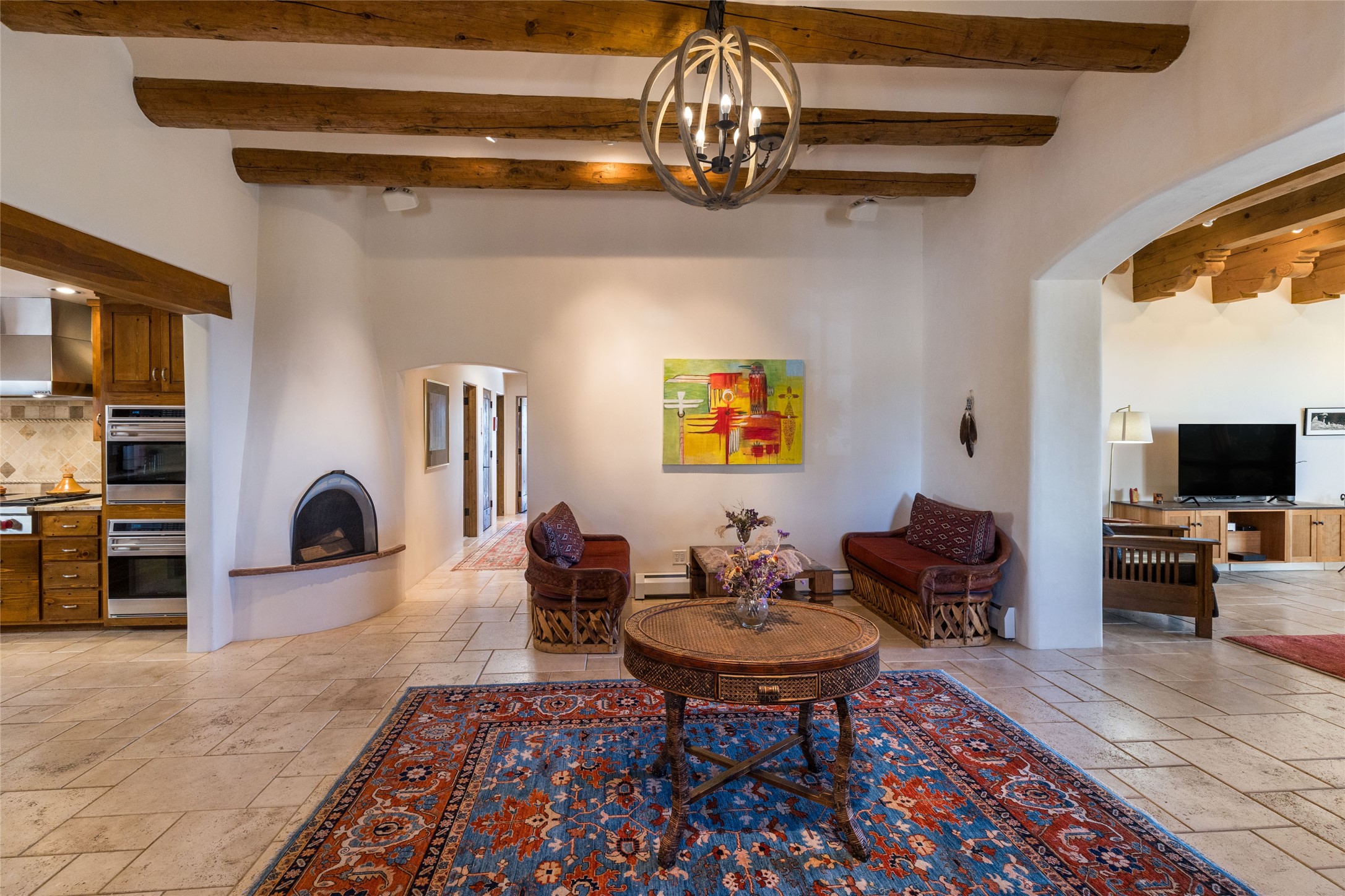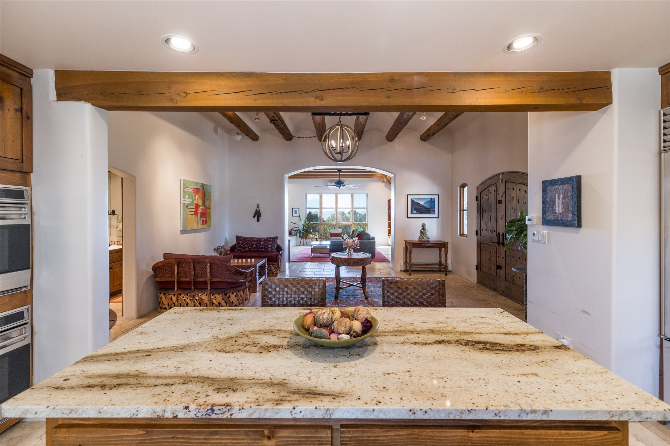This beautiful estate, situated on over 4 acres, has 3 bedrooms, 2 baths, a dedicated office space, views from nearly every room, two oversized two-car garages (one detached, perfect for a workshop), plus a standalone 600 sf studio/casita with an extra 1 bedroom, 1 bath (previously used as an art studio). True chef's kitchen with Wolf appliances and sub-zero refrigerator, double ovens, granite counters, large island with bar seating.Just off the kitchen is a spacious formal dining room with custom built-ins and french doors. The private suite is entered through a sitting room/office with viga ceilings, kiva fireplace and access to a private viewing deck. Spa-like primary bath with generous walk-in shower, separate jetted tub, double sinks, and walk in closet.There are a total of 6 fireplaces.Light-filled living room featuring exposed vigas and corbels, kiva fireplace, custom wood built-in shelving and cabinetry, and expansive windows capturing beautiful views. Owned solar system helps reduce utility costs, allowing you to enjoy the space of this home without the typical energy expense. Other amenities include radiant floor heating, new mini splits, hot tub and a greenhouse.