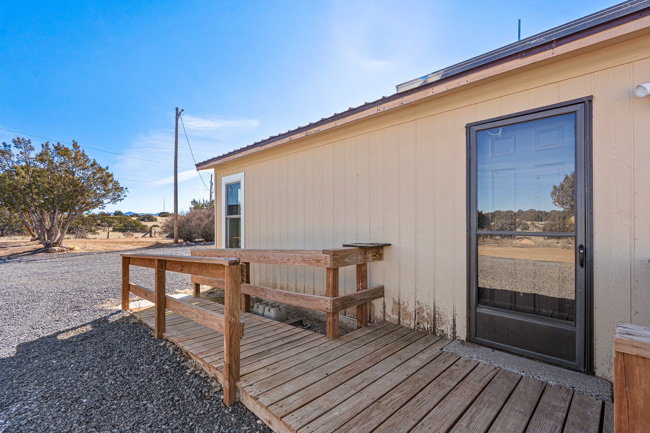 Peaceful private home in a rural setting with easy access to amenities and downtown Santa Fe. Enclosed front yard, metal roofing, newer windows, furnace and refrigerated ac. Theis in need of updating and there is deferred maintenance. Seller has priced it accordingly and does not intend to make repairs or concessions due to the property condition. Large lot is fully fenced for your privacy and enjoyment.
