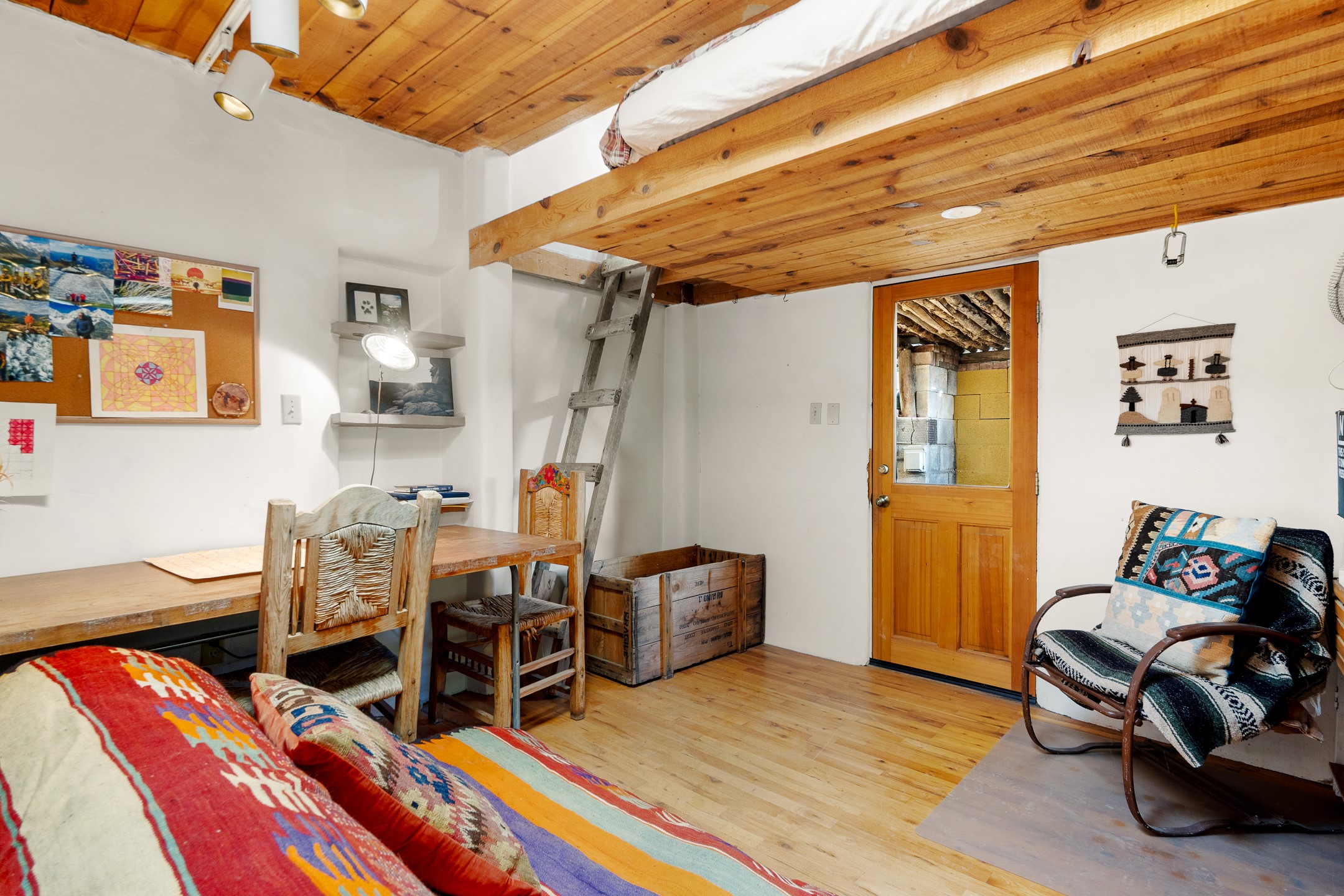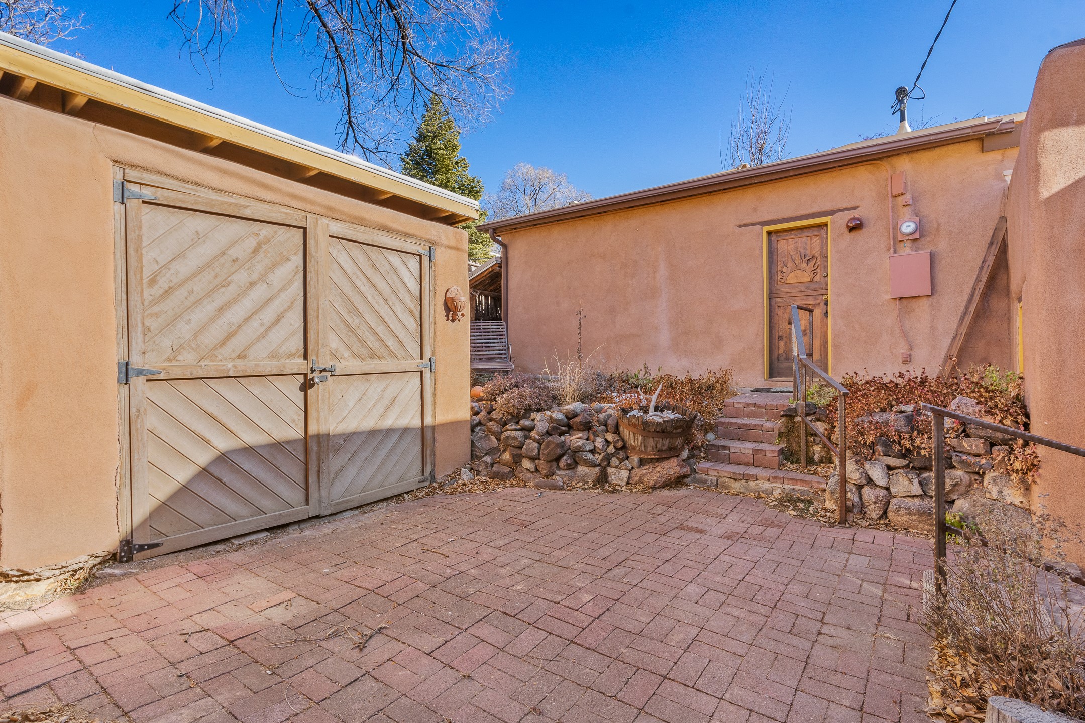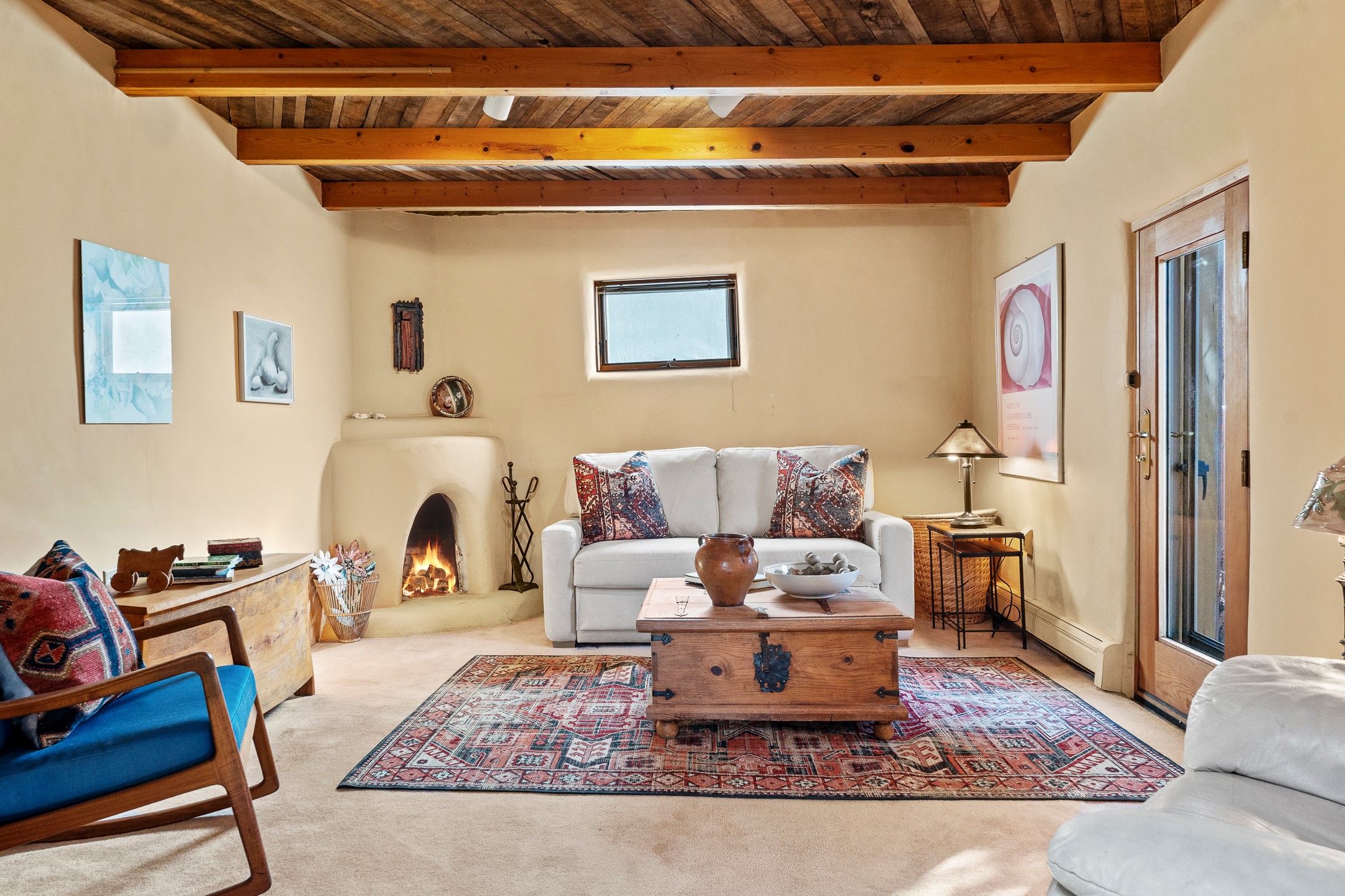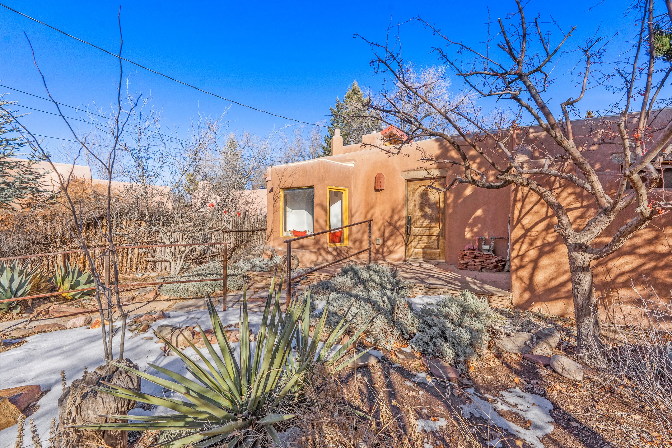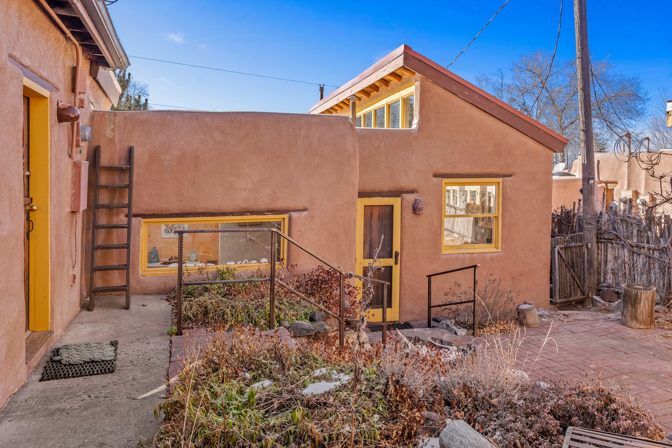 Set in Santa Fe's coveted Historic Eastside, just moments from famed Canyon Road -- world class art, culture, and celebrated dining -- this classic adobe artist's residence captures the timeless spirit of Santa Fe living. Located a half block from the storied Acequia Madre along Camino Don Miguel, the property offers a rare combination of authenticity, privacy, and proximity to one of the most revered cultural corridors in the Southwest.The 2-bedroom, 1-bath main residence is rich with architectural character and artisan detail. Coved viga ceilings, hand-hewn doors, custom plastered kiva fireplaces, clerestory windows, skylights, and a sunlit sitting nook create layered warmth throughout the home. Brick and tile floors -- with additional wood beneath the bedroom carpet -- pair beautifully with custom cabinetry, willow reed sconces, and hand-forged iron railings. Currently arranged with two living areas, one space offers flexibility as an additional bedroom, or private office with its own entrance.A separate casita and an additional outbuilding with barn doors and a window provide versatile spaces ideal for a studio, and guest quarters -- an appealing feature for artists, or those seeking a compound-style Eastside retreat.Enclosed garden patios and mature landscaping create a series of intimate outdoor settings, offering both privacy and a sense of tranquility. A brand new TPO roof with transferable warranty and two off-street parking spaces add comfort and practicality -- a rarity in this historic neighborhood.This is a distinctive opportunity to own a soulful Santa Fe adobe residence in one of the city's most sought-after locations, where historic character, creative legacy, and the Canyon Road lifestyle converge.