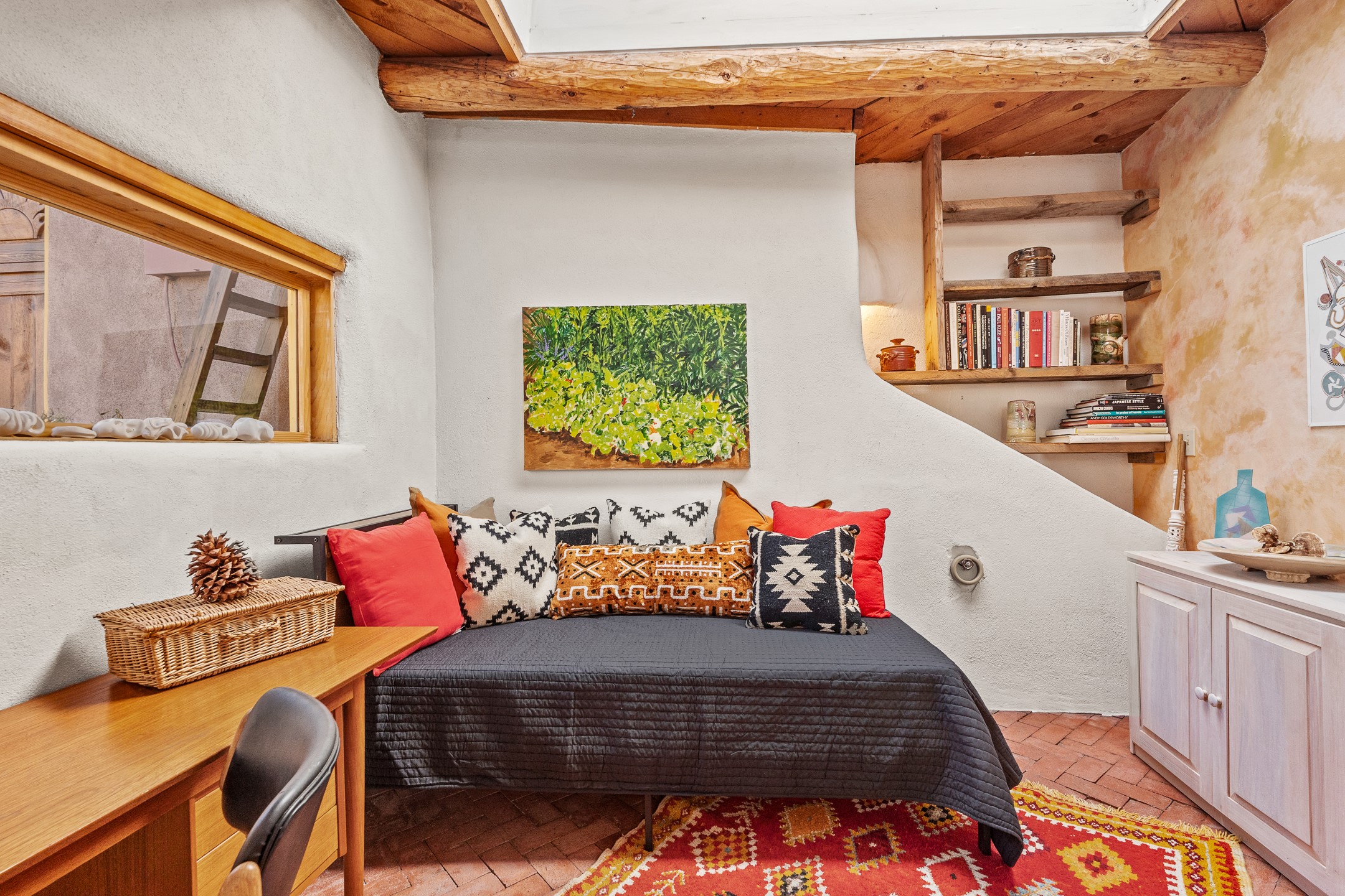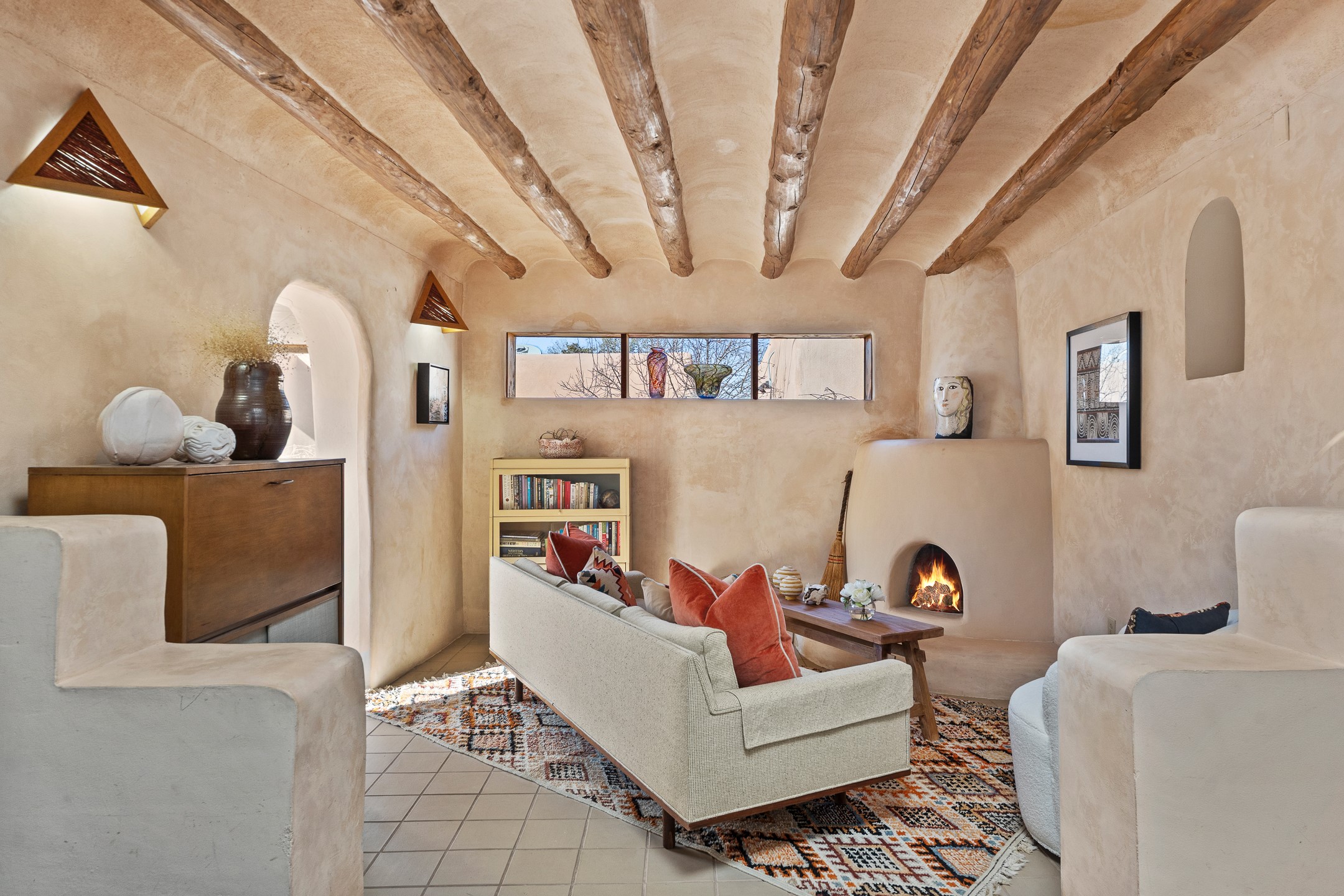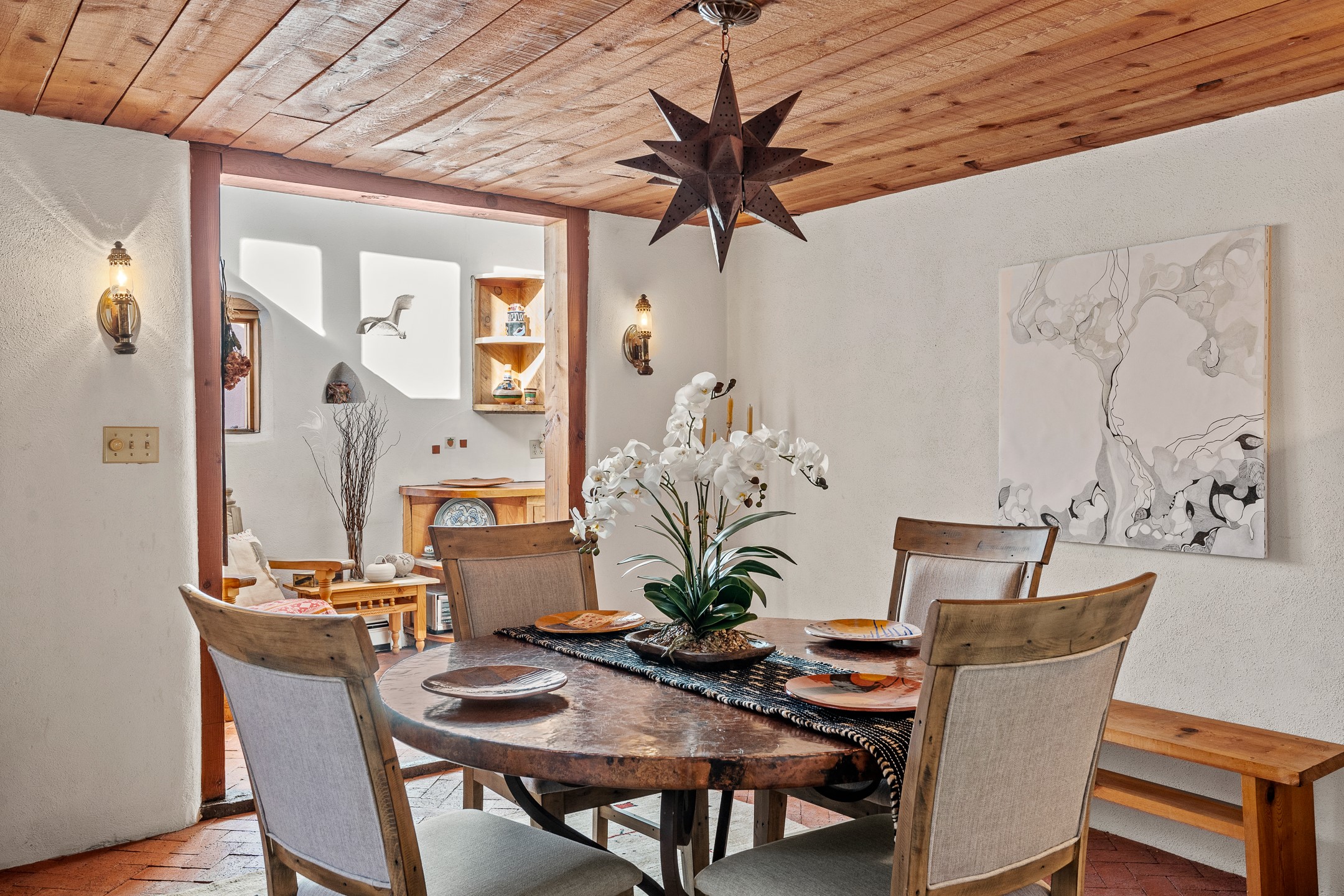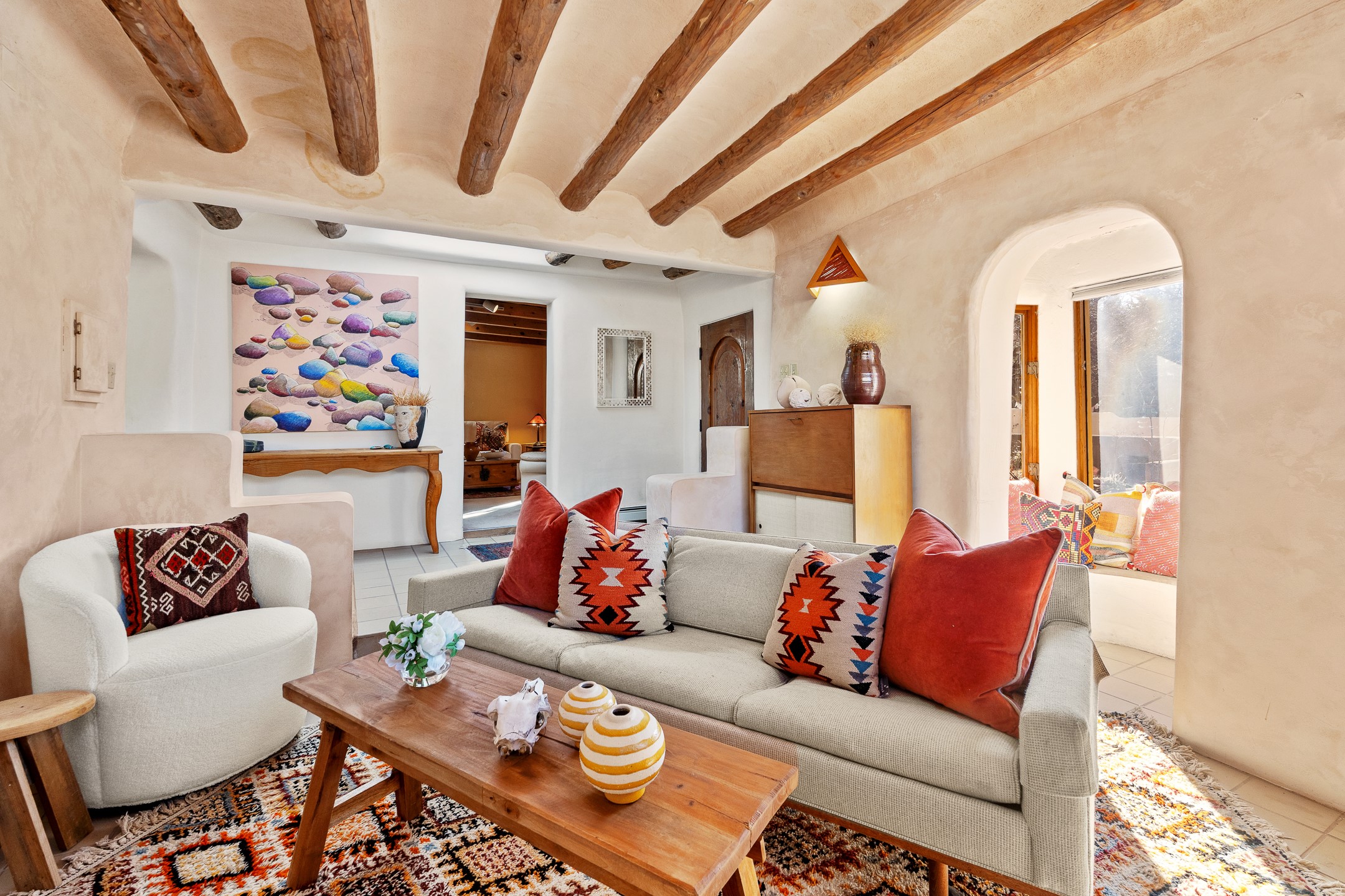 Set in Santa Fe's coveted Historic Eastside, just moments from famed Canyon Road -- world class art, culture, and celebrated dining -- this classic adobe artist's residence captures the timeless spirit of Santa Fe living. Located a half block from the storied Acequia Madre along Camino Don Miguel, the property offers a rare combination of authenticity, privacy, and proximity to one of the most revered cultural corridors in the Southwest.The 2-bedroom, 1-bath main residence is rich with architectural character and artisan detail. Coved viga ceilings, hand-hewn doors, custom plastered kiva fireplaces, clerestory windows, skylights, and a sunlit sitting nook create layered warmth throughout the home. Brick and tile floors -- with additional wood beneath the bedroom carpet -- pair beautifully with custom cabinetry, willow reed sconces, and hand-forged iron railings. Currently arranged with two living areas, one space offers flexibility as an additional bedroom, or private office with its own entrance.A separate casita and an additional outbuilding with barn doors and a window provide versatile spaces ideal for a studio, and guest quarters -- an appealing feature for artists, or those seeking a compound-style Eastside retreat.Enclosed garden patios and mature landscaping create a series of intimate outdoor settings, offering both privacy and a sense of tranquility. A brand new TPO roof with transferable warranty and two off-street parking spaces add comfort and practicality -- a rarity in this historic neighborhood.This is a distinctive opportunity to own a soulful Santa Fe adobe residence in one of the city's most sought-after locations, where historic character, creative legacy, and the Canyon Road lifestyle converge.