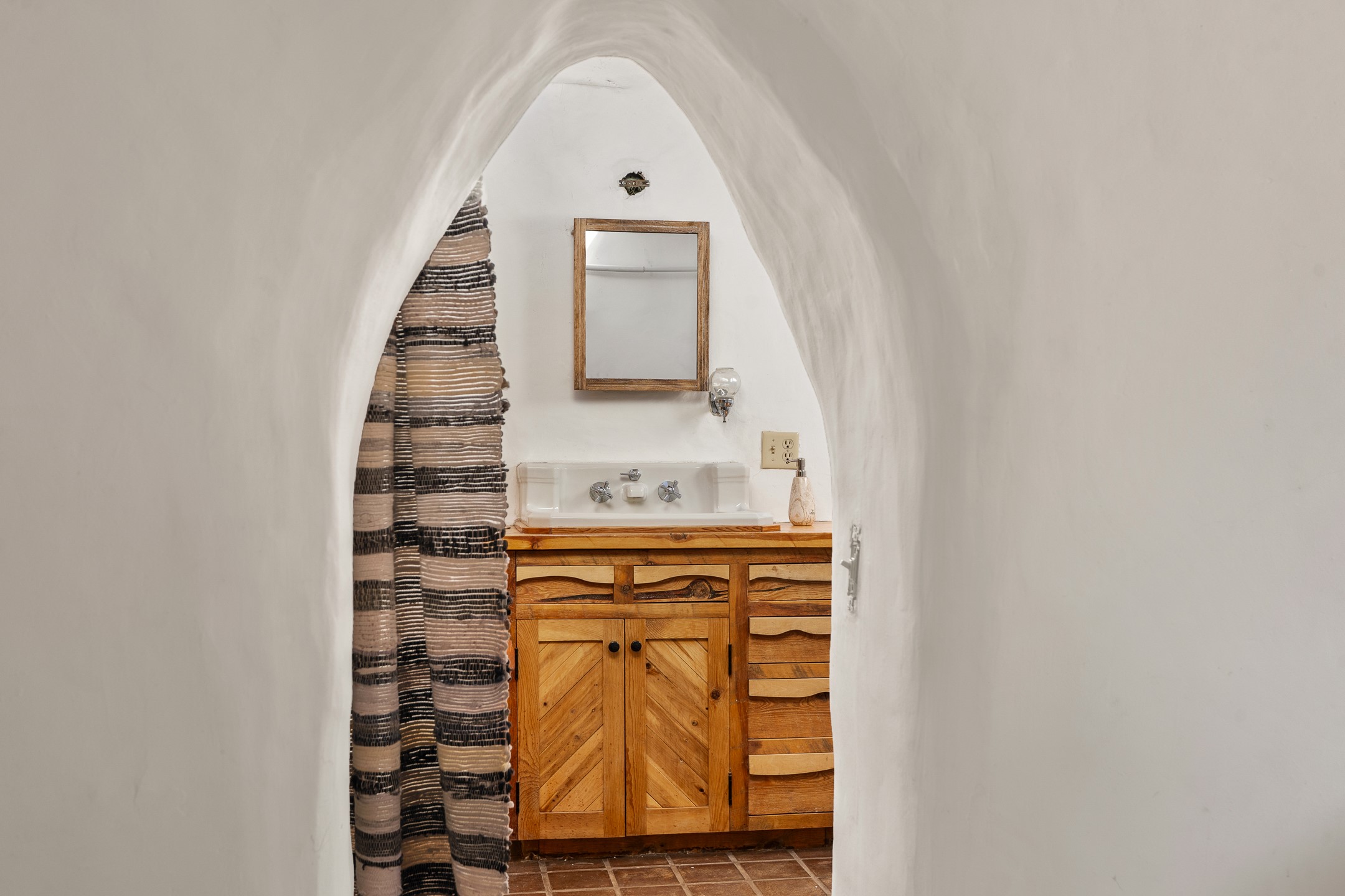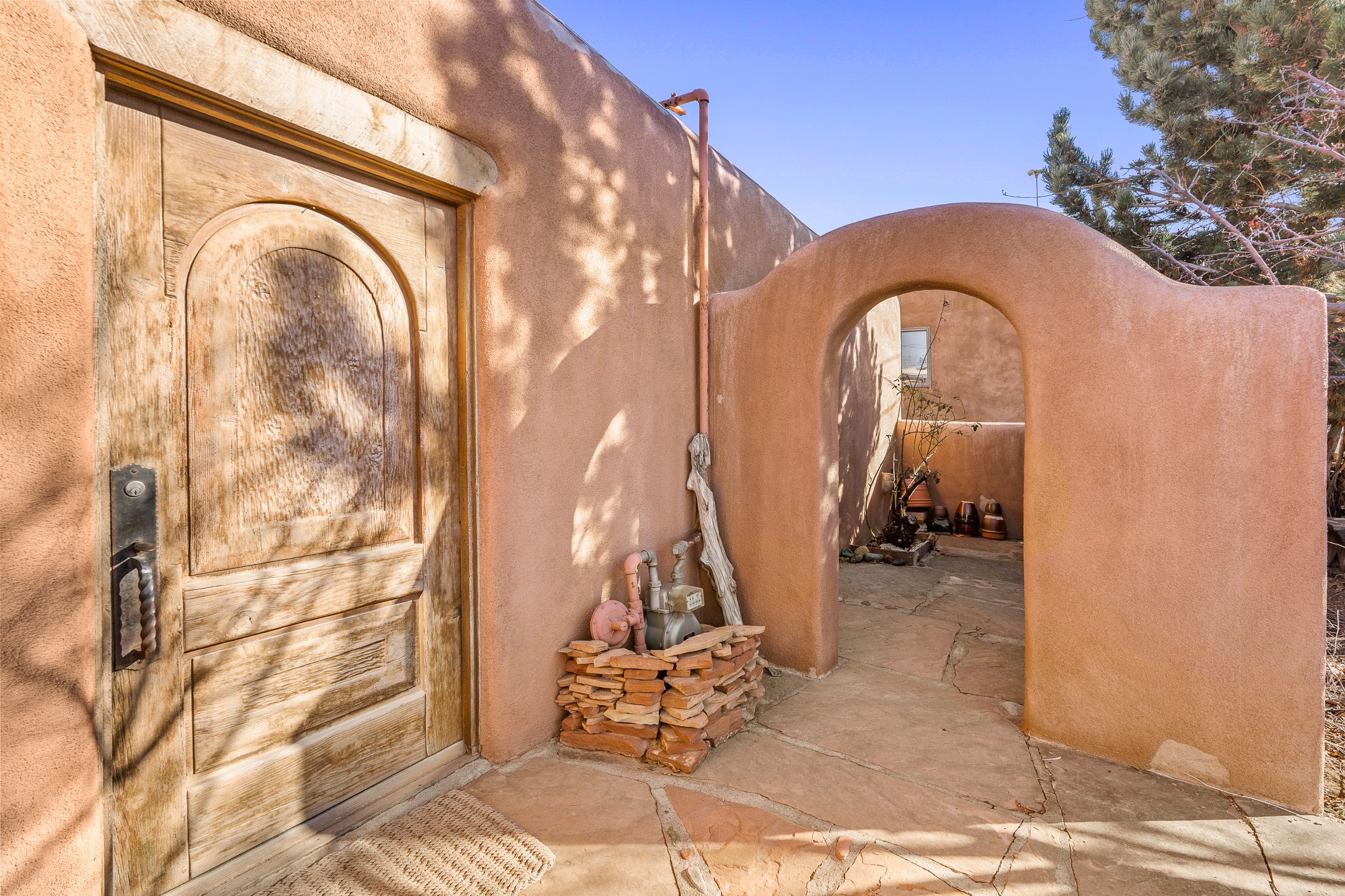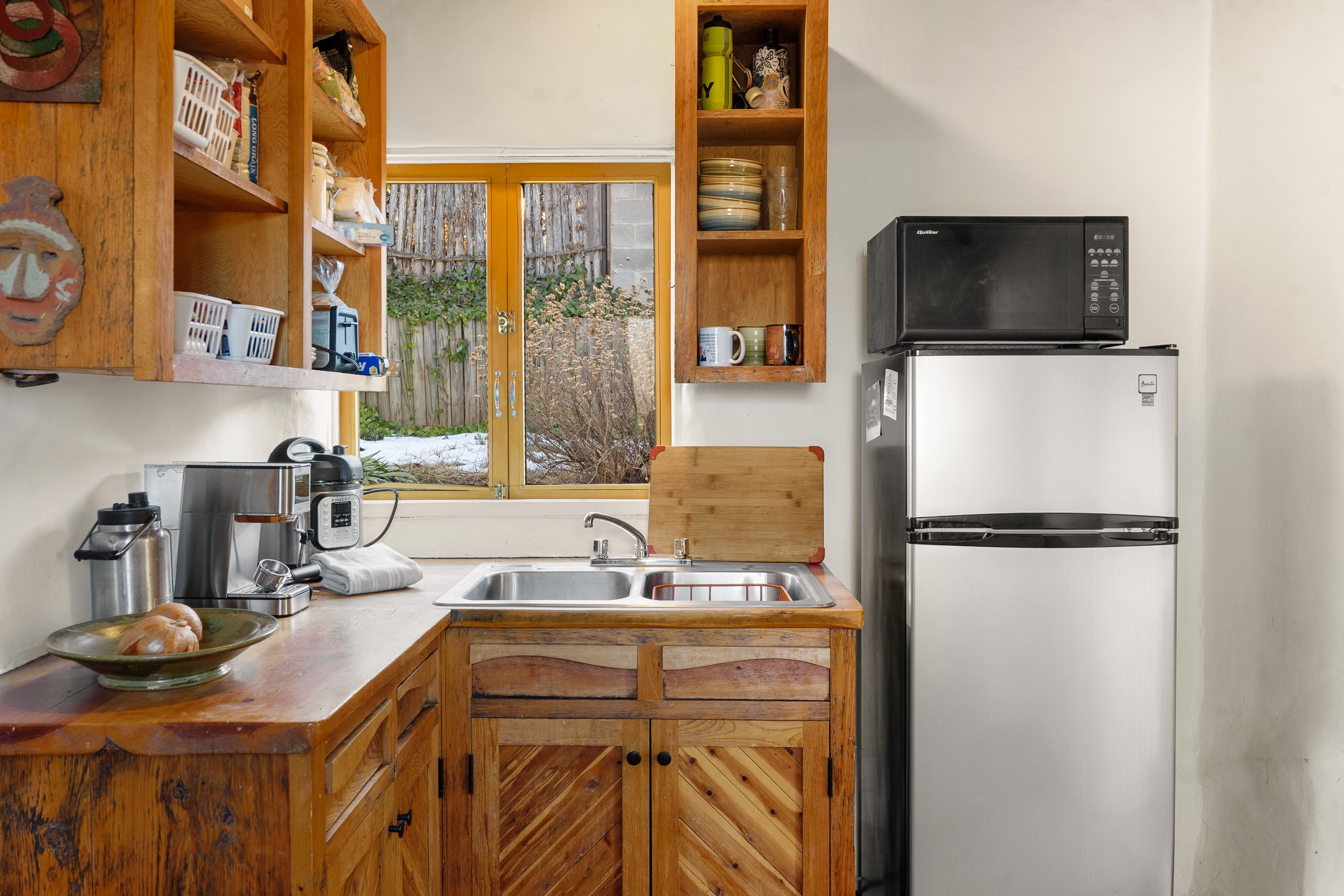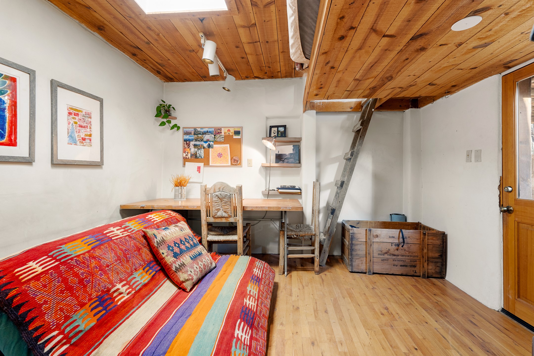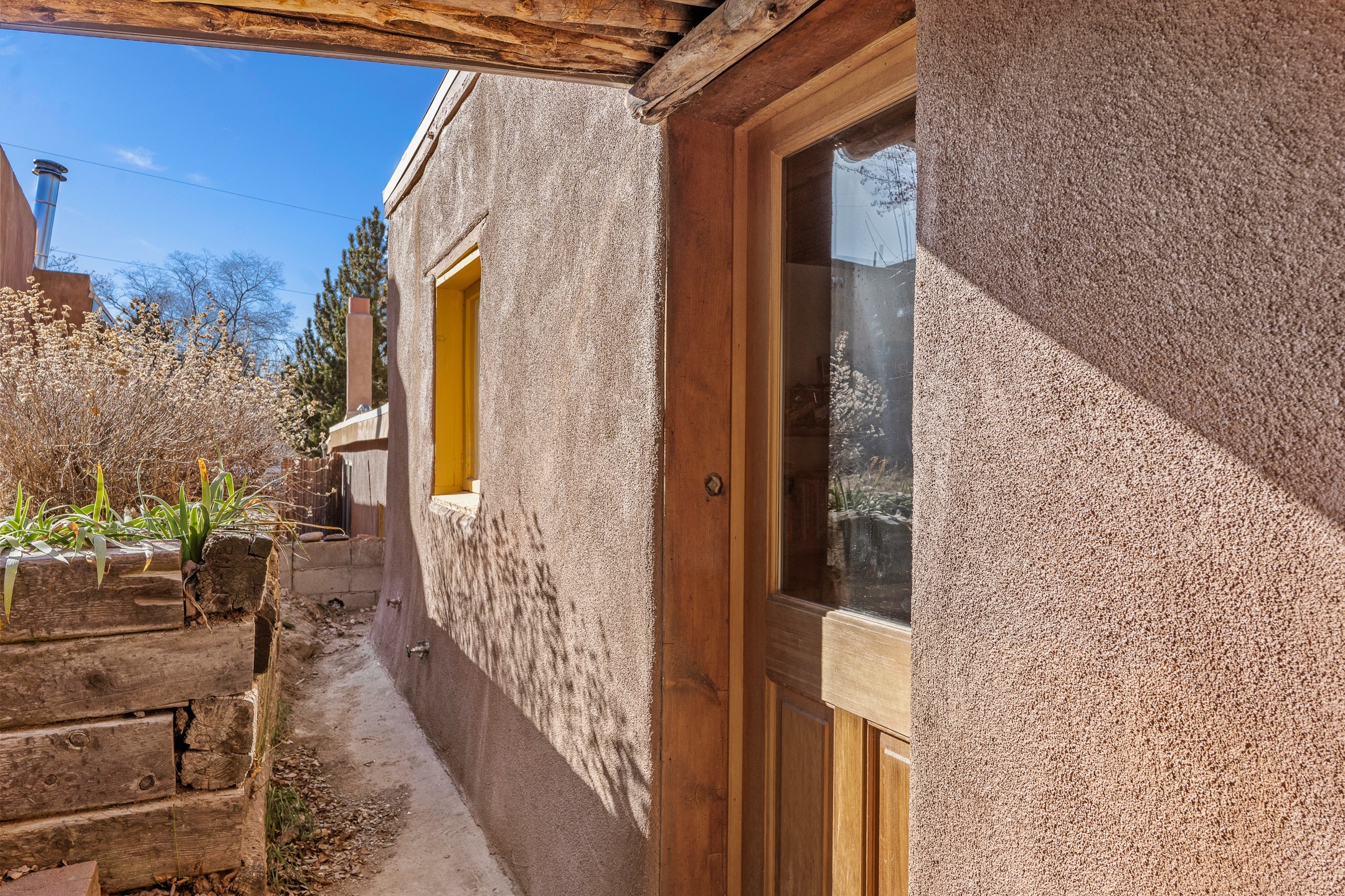 Set in Santa Fe's coveted Historic Eastside, just moments from famed Canyon Road -- world class art, culture, and celebrated dining -- this classic adobe artist's residence captures the timeless spirit of Santa Fe living. Located a half block from the storied Acequia Madre along Camino Don Miguel, the property offers a rare combination of authenticity, privacy, and proximity to one of the most revered cultural corridors in the Southwest.The 2-bedroom, 1-bath main residence is rich with architectural character and artisan detail. Coved viga ceilings, hand-hewn doors, custom plastered kiva fireplaces, clerestory windows, skylights, and a sunlit sitting nook create layered warmth throughout the home. Brick and tile floors -- with additional wood beneath the bedroom carpet -- pair beautifully with custom cabinetry, willow reed sconces, and hand-forged iron railings. Currently arranged with two living areas, one space offers flexibility as an additional bedroom, or private office with its own entrance.A separate casita and an additional outbuilding with barn doors and a window provide versatile spaces ideal for a studio, and guest quarters -- an appealing feature for artists, or those seeking a compound-style Eastside retreat.Enclosed garden patios and mature landscaping create a series of intimate outdoor settings, offering both privacy and a sense of tranquility. A brand new TPO roof with transferable warranty and two off-street parking spaces add comfort and practicality -- a rarity in this historic neighborhood.This is a distinctive opportunity to own a soulful Santa Fe adobe residence in one of the city's most sought-after locations, where historic character, creative legacy, and the Canyon Road lifestyle converge.