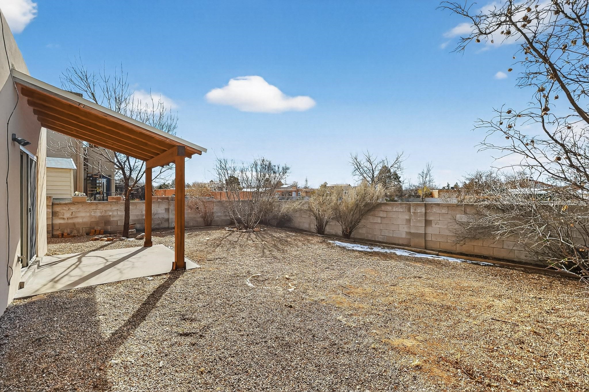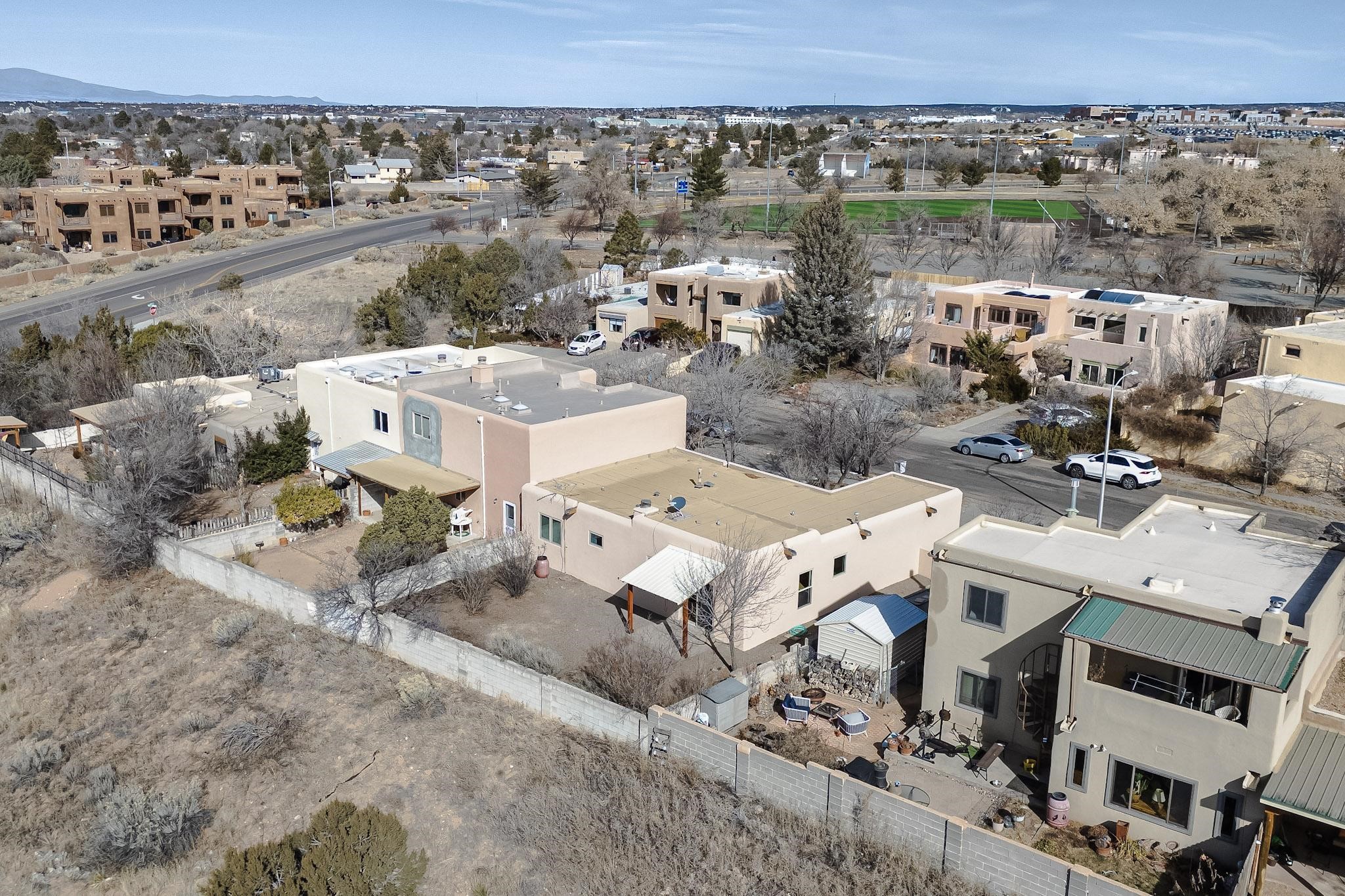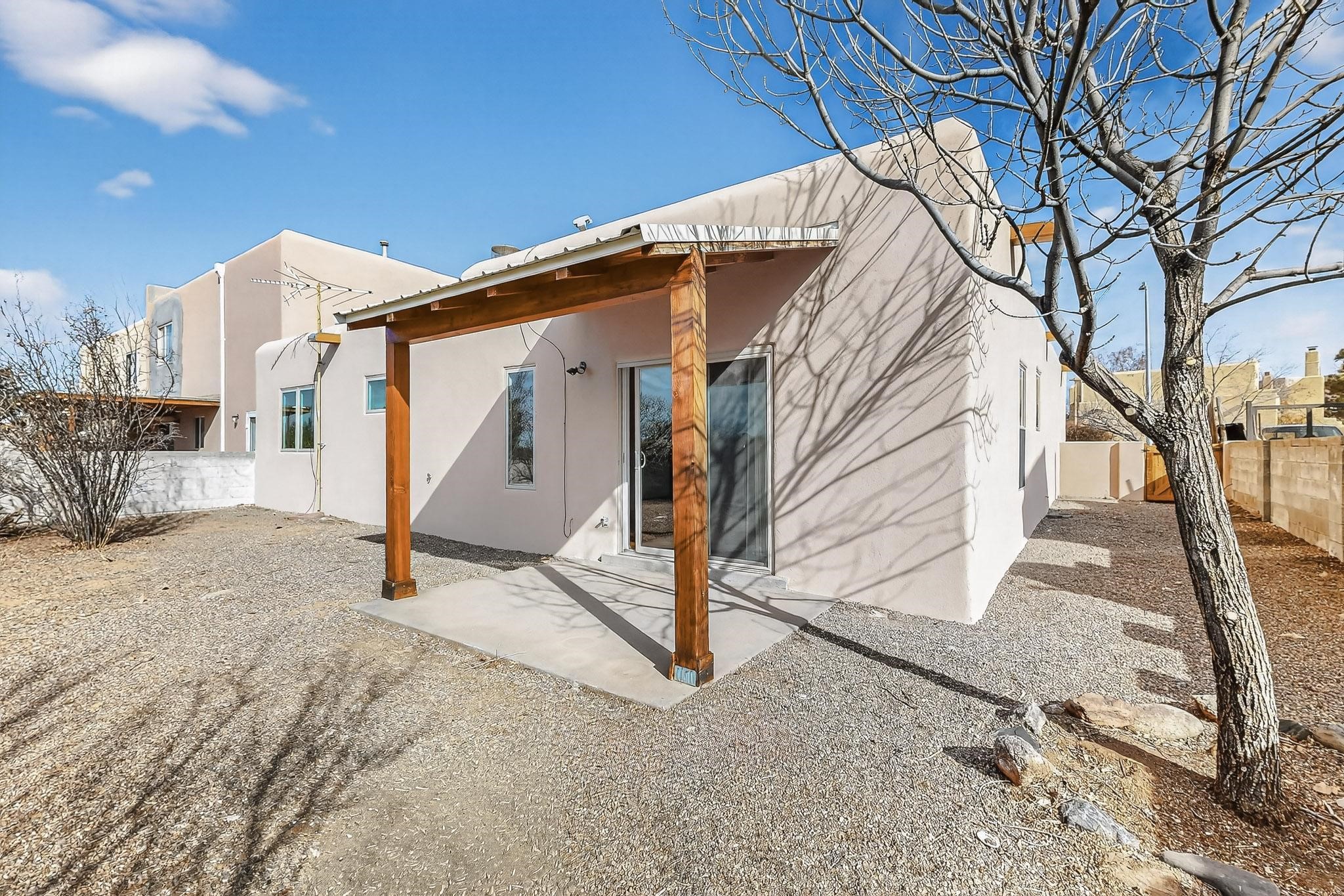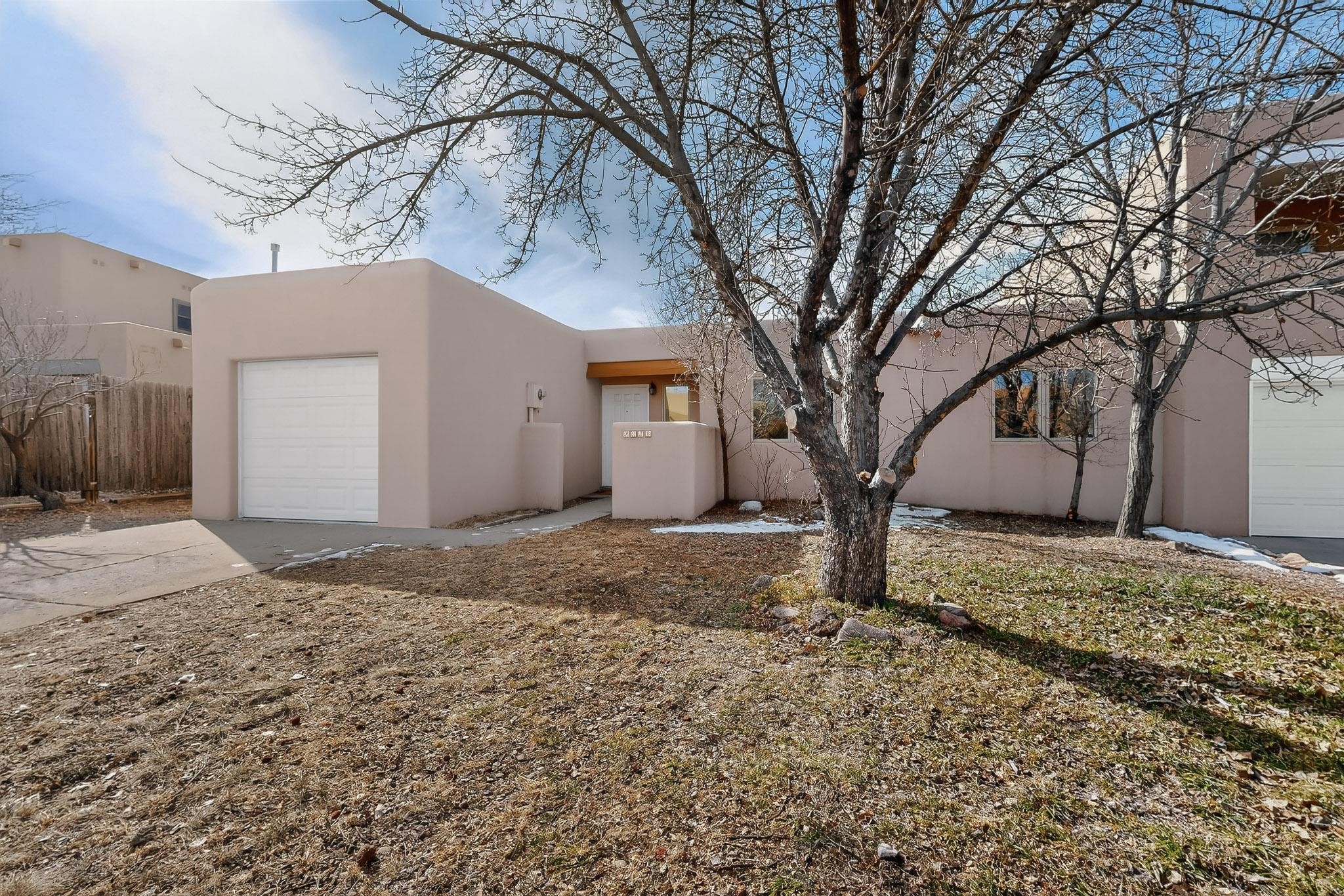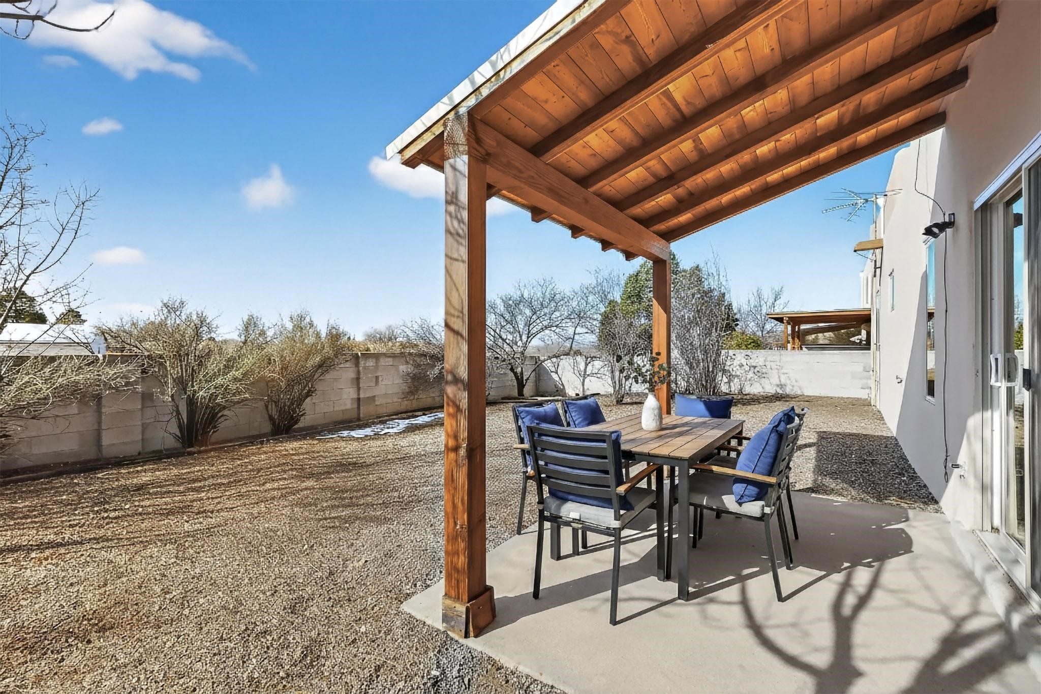Charming, updated, freshly painted and super cute single level home offers 1325 +/- sqft, 3-bedroom, 2-bath, 1-car finished garage of comfortable living. The third bedroom would make a convenient and light office. Perfectly situated on a wonderful lot backing to open space/arroyo, this property offers a spacious feel. Inside, the entryway leads to the inviting living room featuring wood beams, wood built-in bookshelves, dining area, a wood-burning fireplace, and sliding glass doors -- adding warmth, light and character. The kitchen boasts abundant cabinets, generous counter space, a pantry, gas range, stainless-steel dishwasher, and breakfast bar--ideal for casual dining or entertaining. The primary suite offers two closets and a remodeled ensuite bath with a stunning, tiled walk-in shower. Step outside to enjoy the easy-care, walled backyard with a covered portal, perfect for relaxing. Additional highlights include: New stucco on most exterior walls-Ample storage closets throughout-Large capacity washer/dryer-Forced air heat-Ceiling fans-NEWER windows-NEWER pendant and can lighting light fixtures-Dimmer switches-NEWER tile and Bamboo wood floors, and NEW laminate flooring in 2 bedrooms (No carpet)-Top/down bottom-up Hunter Douglas blinds-and so much more. Located in the La Villa Serena subdivision, approximately 10-minute drive to the Santa Fe Plaza, a few minute walk to Ragle Park, the Arroyo Chamiso and Rail Trails. This move-in-ready home close to schools, restaurants, shopping and hospitals blends warmth, character, and modern updates--a perfect combination of comfort and style.