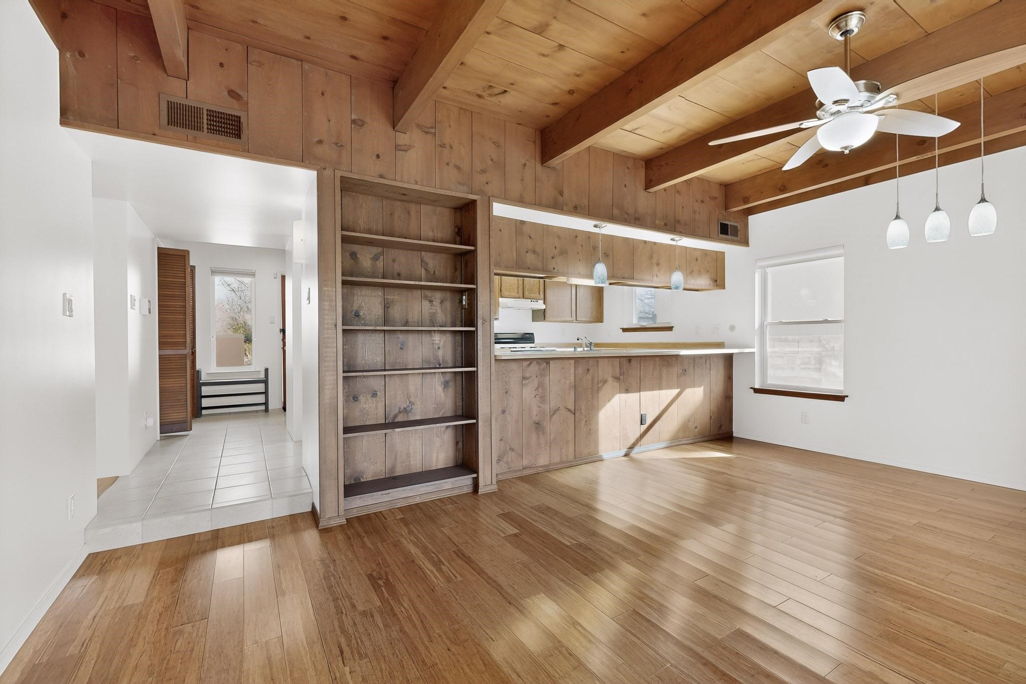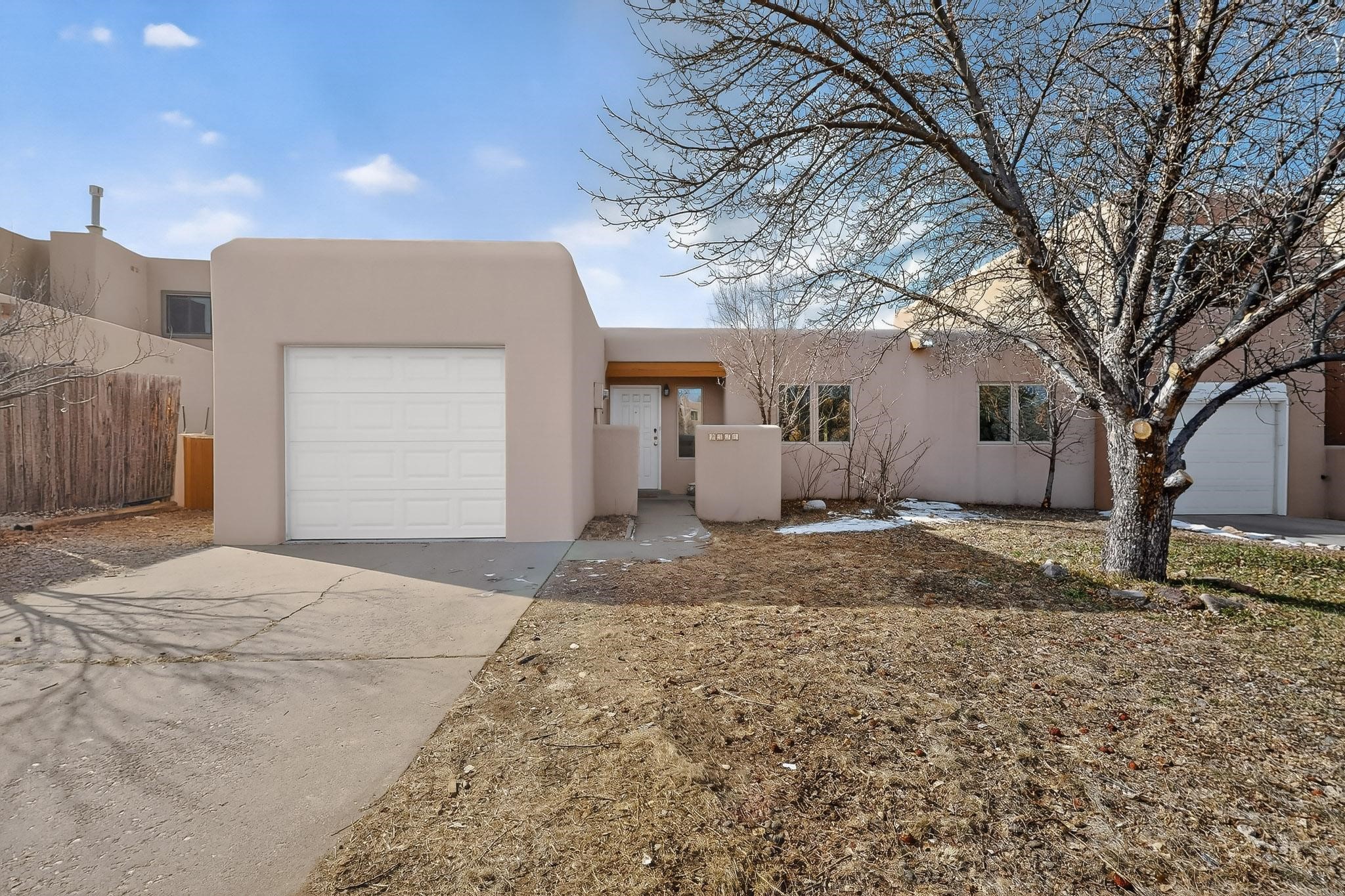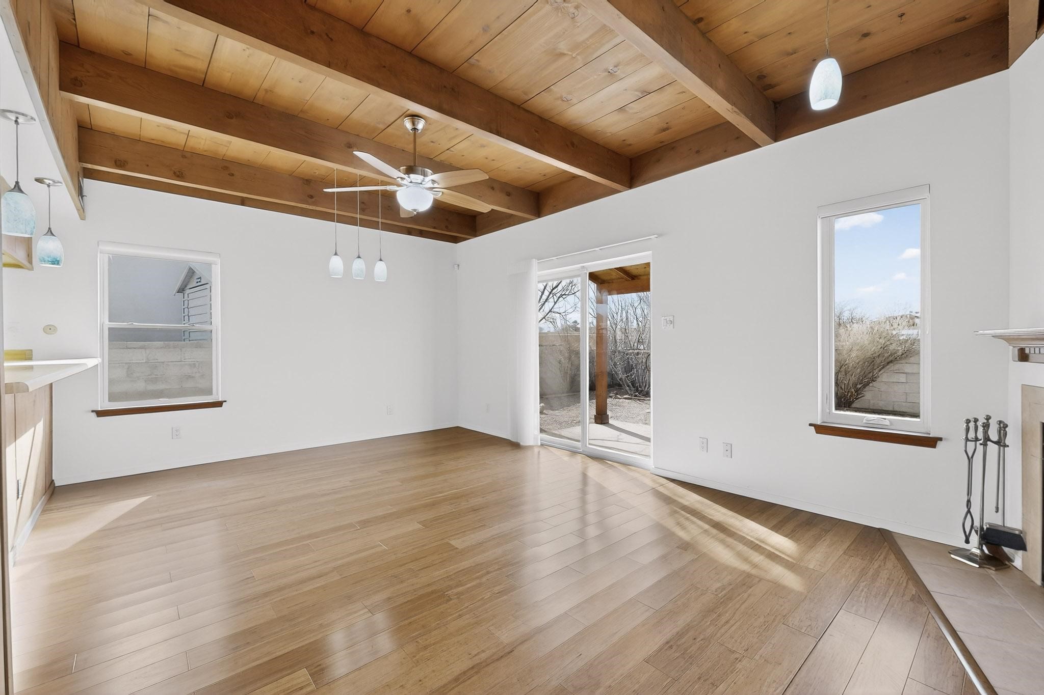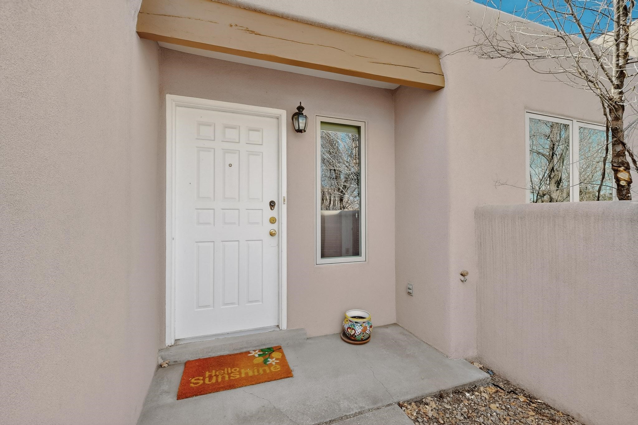 Charming, updated, freshly painted and super cute single level home offers 1325 +/- sqft, 3-bedroom, 2-bath, 1-car finished garage of comfortable living. The third bedroom would make a convenient and light office. Perfectly situated on a wonderful lot backing to open space/arroyo, this property offers a spacious feel. Inside, the entryway leads to the inviting living room featuring wood beams, wood built-in bookshelves, dining area, a wood-burning fireplace, and sliding glass doors -- adding warmth, light and character. The kitchen boasts abundant cabinets, generous counter space, a pantry, gas range, stainless-steel dishwasher, and breakfast bar--ideal for casual dining or entertaining. The primary suite offers two closets and a remodeled ensuite bath with a stunning, tiled walk-in shower. Step outside to enjoy the easy-care, walled backyard with a covered portal, perfect for relaxing. Additional highlights include: New stucco on most exterior walls-Ample storage closets throughout-Large capacity washer/dryer-Forced air heat-Ceiling fans-NEWER windows-NEWER pendant and can lighting light fixtures-Dimmer switches-NEWER tile and Bamboo wood floors, and NEW laminate flooring in 2 bedrooms (No carpet)-Top/down bottom-up Hunter Douglas blinds-and so much more. Located in the La Villa Serena subdivision, approximately 10-minute drive to the Santa Fe Plaza, a few minute walk to Ragle Park, the Arroyo Chamiso and Rail Trails. This move-in-ready home close to schools, restaurants, shopping and hospitals blends warmth, character, and modern updates--a perfect combination of comfort and style.
