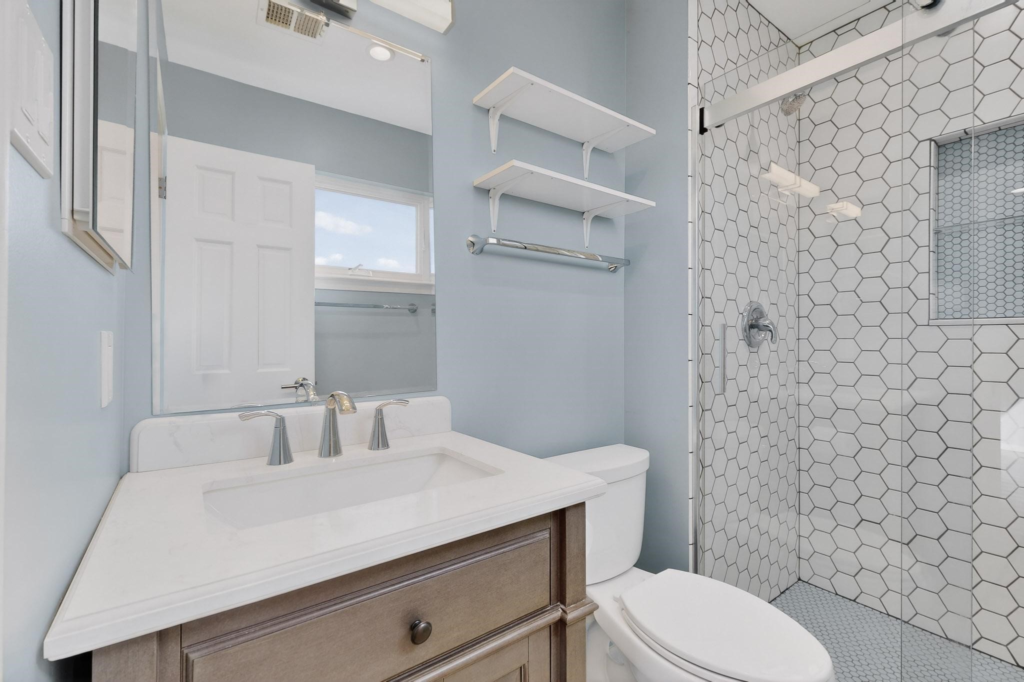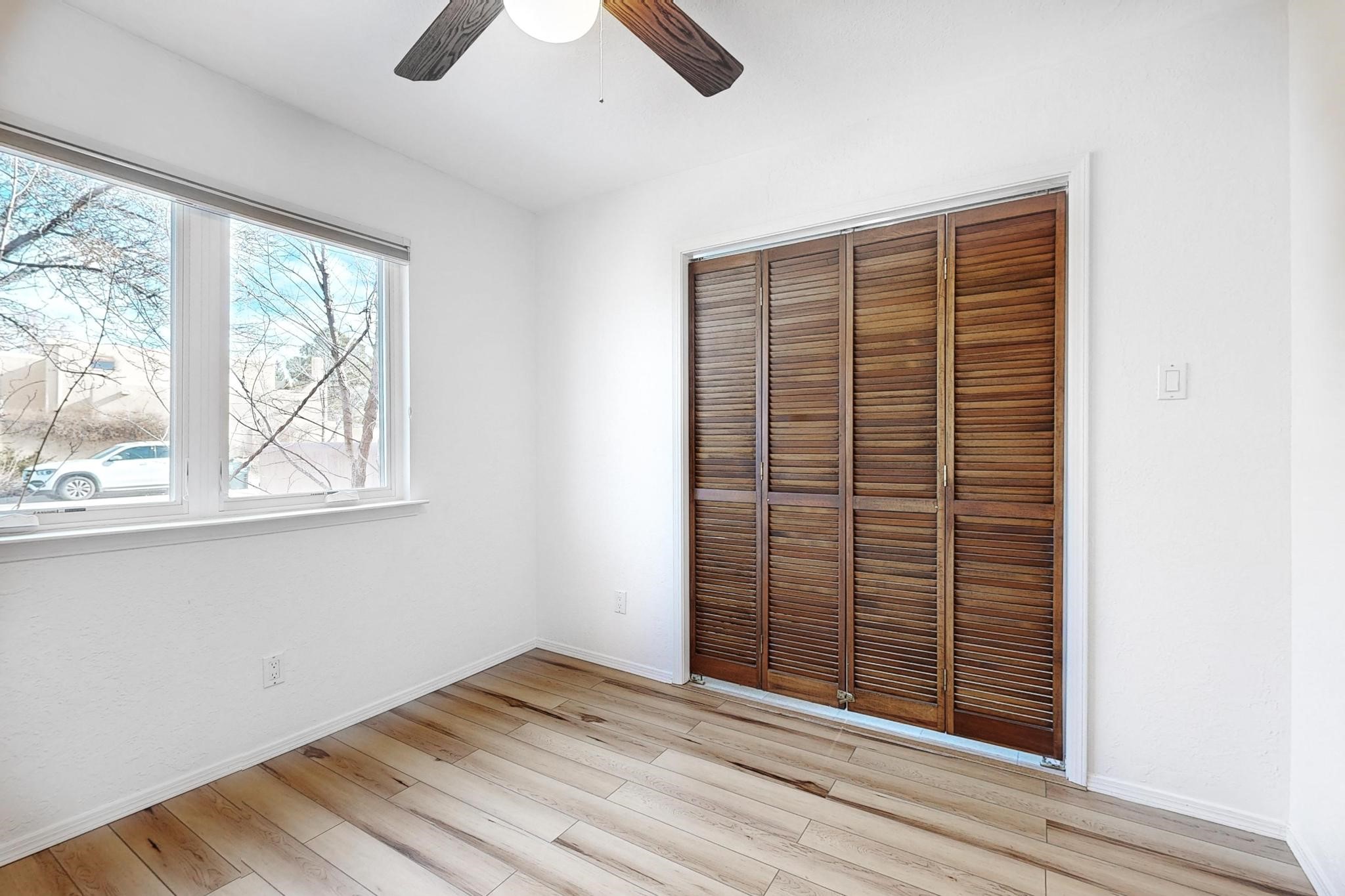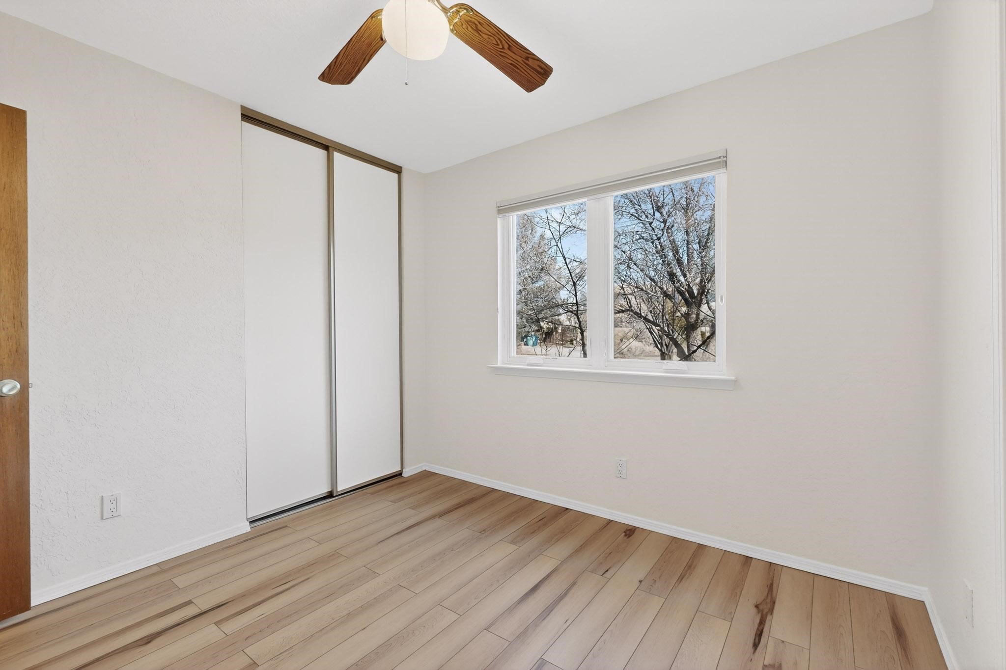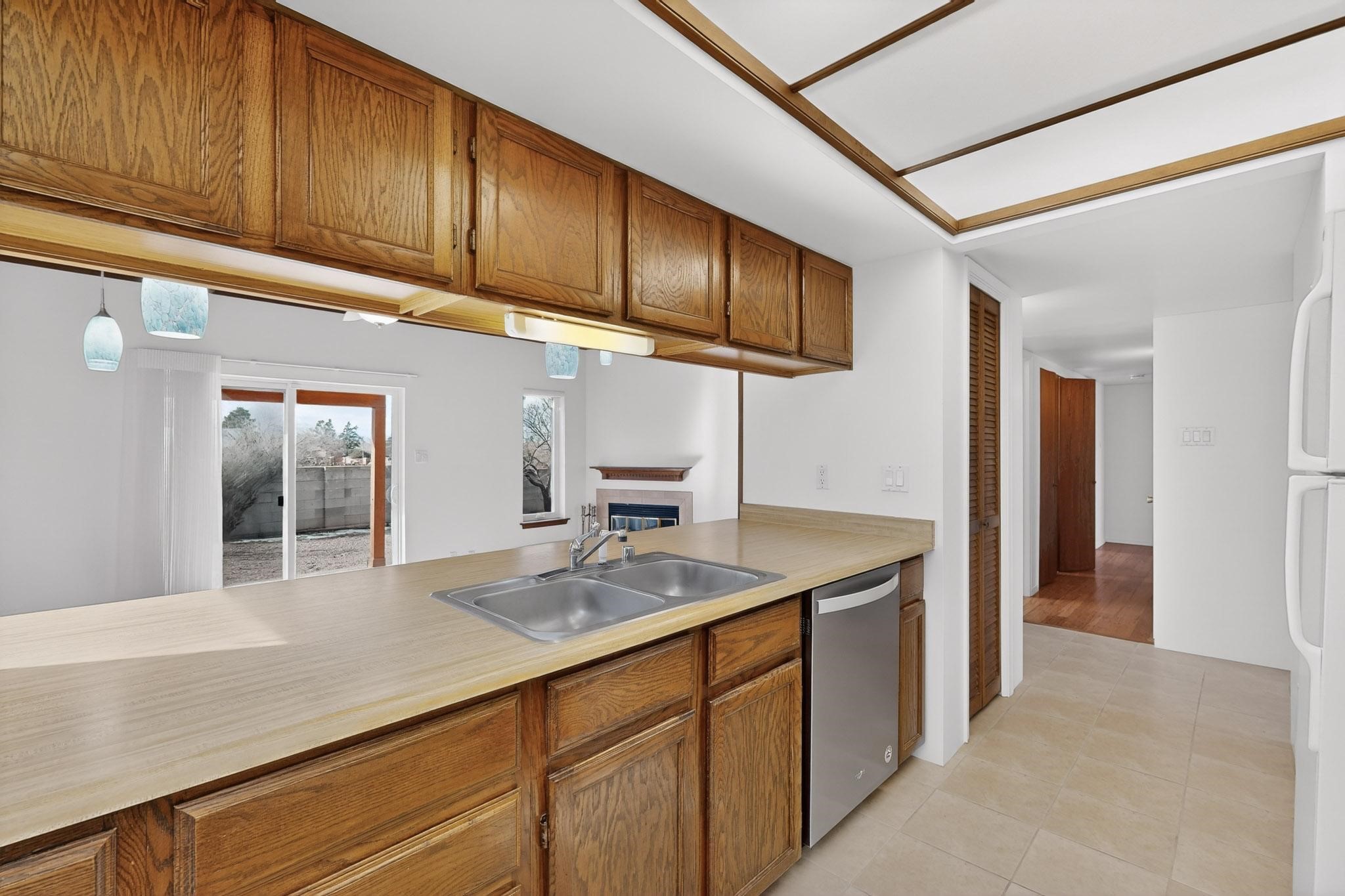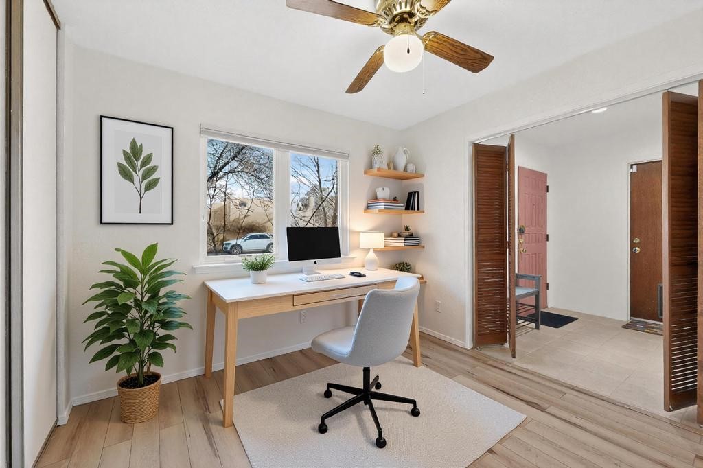 Charming, updated, freshly painted and super cute single level home offers 1325 +/- sqft, 3-bedroom, 2-bath, 1-car finished garage of comfortable living. The third bedroom would make a convenient and light office. Perfectly situated on a wonderful lot backing to open space/arroyo, this property offers a spacious feel. Inside, the entryway leads to the inviting living room featuring wood beams, wood built-in bookshelves, dining area, a wood-burning fireplace, and sliding glass doors -- adding warmth, light and character. The kitchen boasts abundant cabinets, generous counter space, a pantry, gas range, stainless-steel dishwasher, and breakfast bar--ideal for casual dining or entertaining. The primary suite offers two closets and a remodeled ensuite bath with a stunning, tiled walk-in shower. Step outside to enjoy the easy-care, walled backyard with a covered portal, perfect for relaxing. Additional highlights include: New stucco on most exterior walls-Ample storage closets throughout-Large capacity washer/dryer-Forced air heat-Ceiling fans-NEWER windows-NEWER pendant and can lighting light fixtures-Dimmer switches-NEWER tile and Bamboo wood floors, and NEW laminate flooring in 2 bedrooms (No carpet)-Top/down bottom-up Hunter Douglas blinds-and so much more. Located in the La Villa Serena subdivision, approximately 10-minute drive to the Santa Fe Plaza, a few minute walk to Ragle Park, the Arroyo Chamiso and Rail Trails. This move-in-ready home close to schools, restaurants, shopping and hospitals blends warmth, character, and modern updates--a perfect combination of comfort and style.