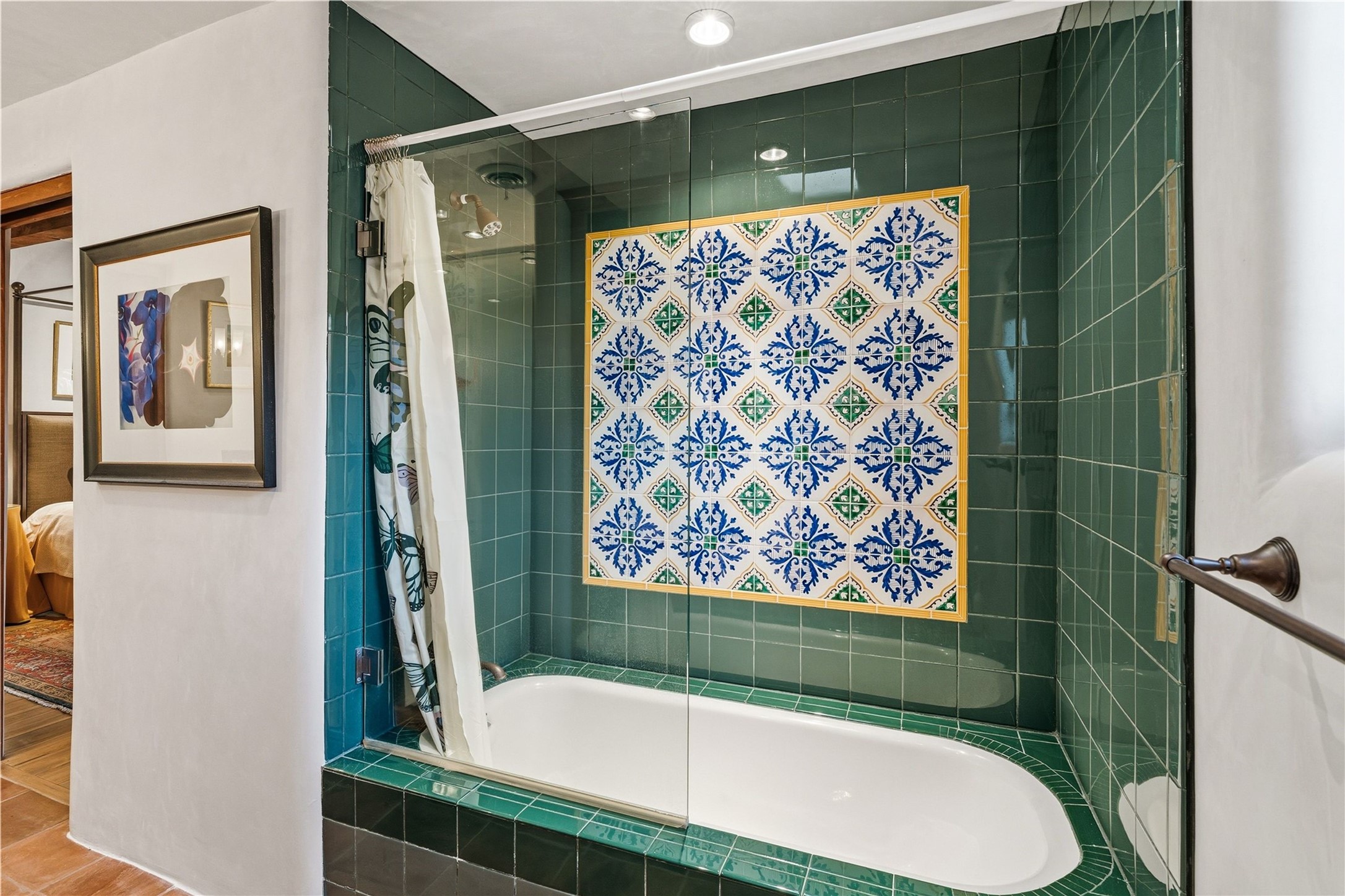 Enter the cobblestone street of the Las Puertas neighborhood within Las Campanas, and this impeccable terracotta hued stucco home welcomes you. A mixture of Puebloan Revival and Mexican Hacienda with contemporary proportions, this 2,861 square-foot, 3-bedroom, 4-bathroom home holds all that makes a Santa Fe house special. The property is in excellent condition and with a $50,000 art and furniture package available, it is the definition of move-in-ready. The step-free layout is organized with clarity and intention. Living spaces are centered within the plan, while the primary suite and guest rooms are set apart for privacy and flexibility. Each bedroom is en-suite, and a half-bath powder room is tucked off the entry hallway. There is a large open living and dining room that flows both to the exterior portal and to the large kitchen. The gourmet kitchen will delight any home chef or entertainer with top-of-the-line appliances, immense kitchen island, ample counter space, butler's pantry & breakfast bar. Off the kitchen is a cozy den, which could also serve as a semi-private office space. Rich details throughout include viga and plank ceilings, exposed wood beams and corbels, hand-painted Tunisian and Spanish tile accents, wood flooring, five fireplaces and custom cabinetry. The covered rear portal extends the living area and is bound by a walled courtyard that wraps around the house. If you're looking for a downsize or an easy second home, it's hard to find anything better than 2A Avenida Madison.