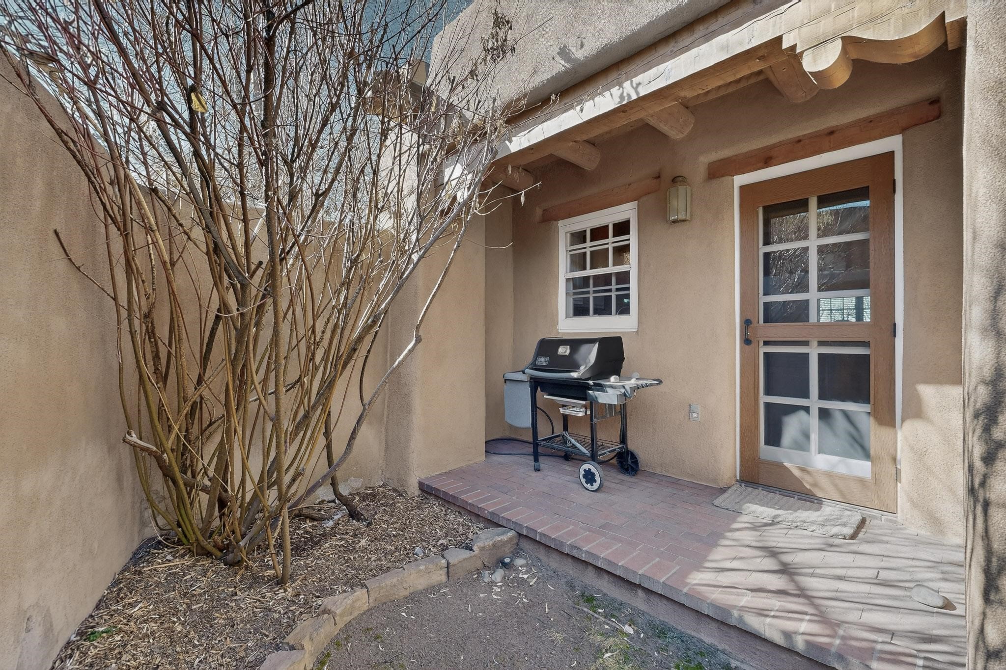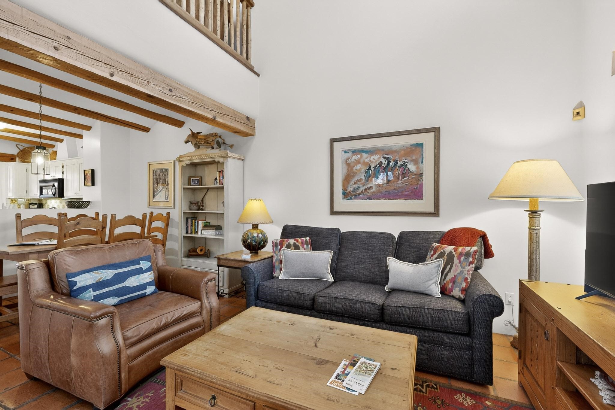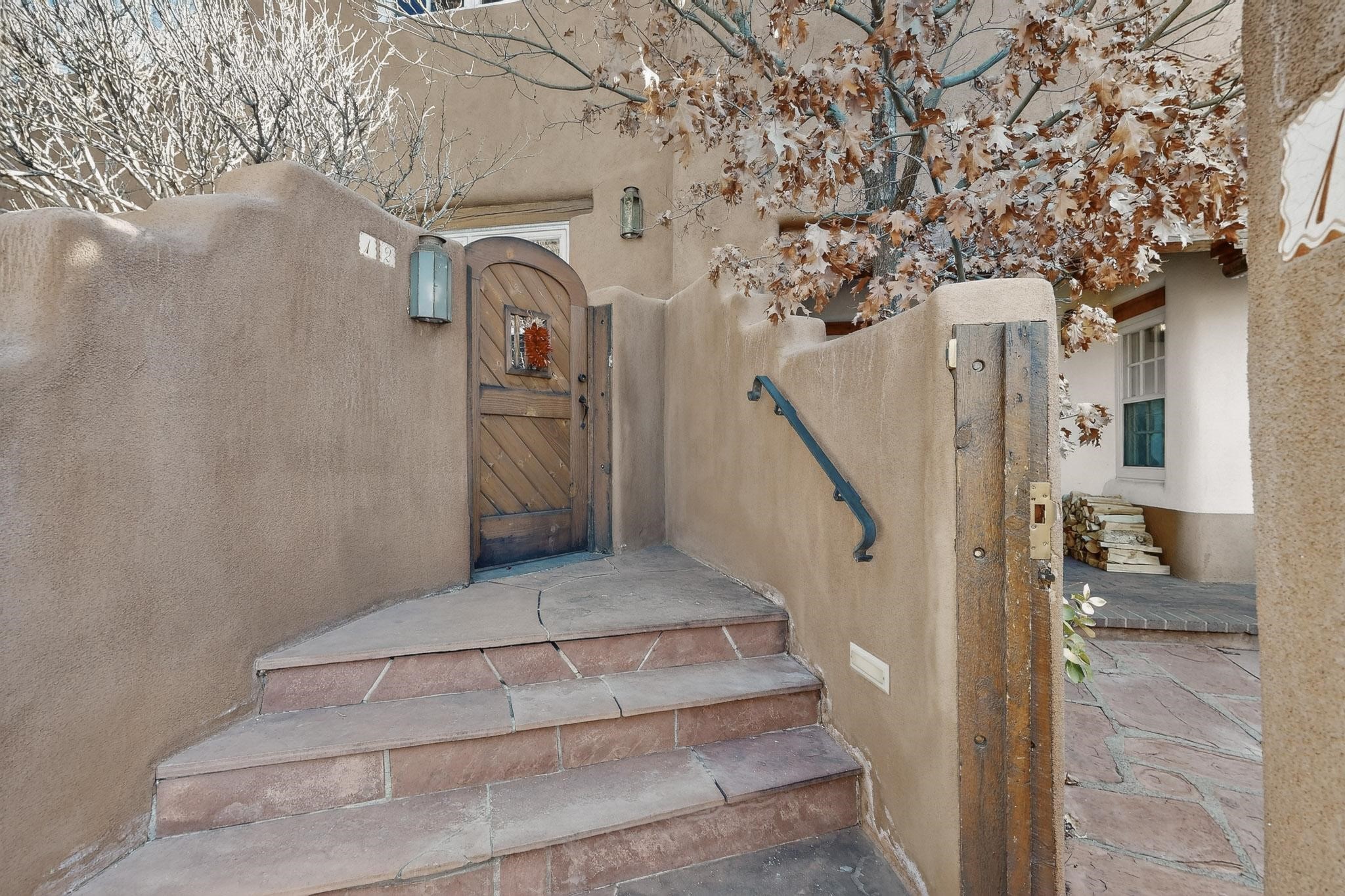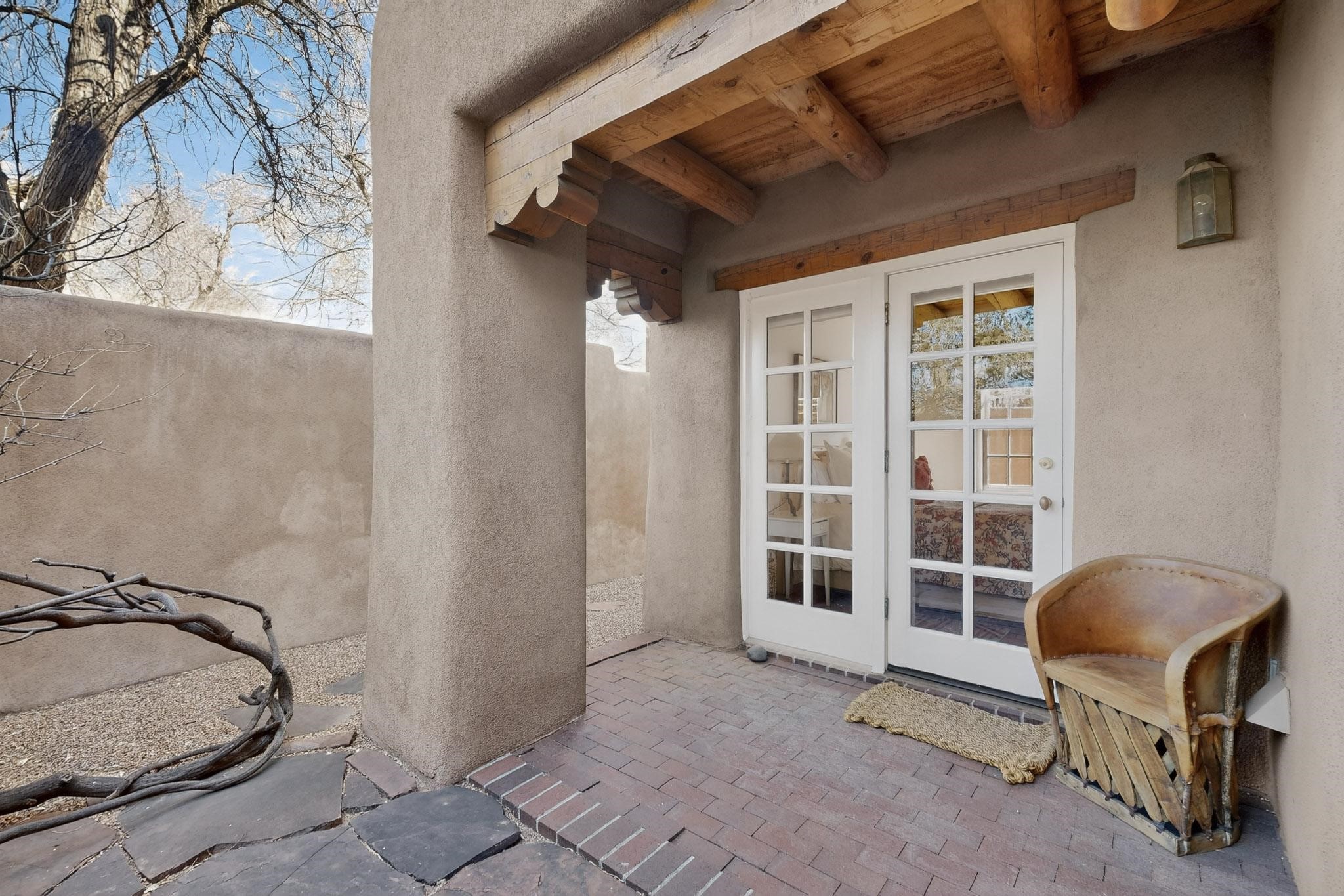 Quarter share Interest in a professionally managed and completely furnished downtown vacation condominium. Two story open ceiling in living-room, light and bright, social kitchen, dining, living -room arrangement. Gas grill right out the back door and a lovely, walled yard with outdoor dining area. Deck with nice views off second floor landing. Good separation for bedrooms - privacy. The living-room and each bedroom has a kiva style fireplace. Smooth plaster walls, vigas, Satillo floors main floor, pine wood floors second floor. Talavera tile in baths and kitchen (kitchen butcher-block counters).
