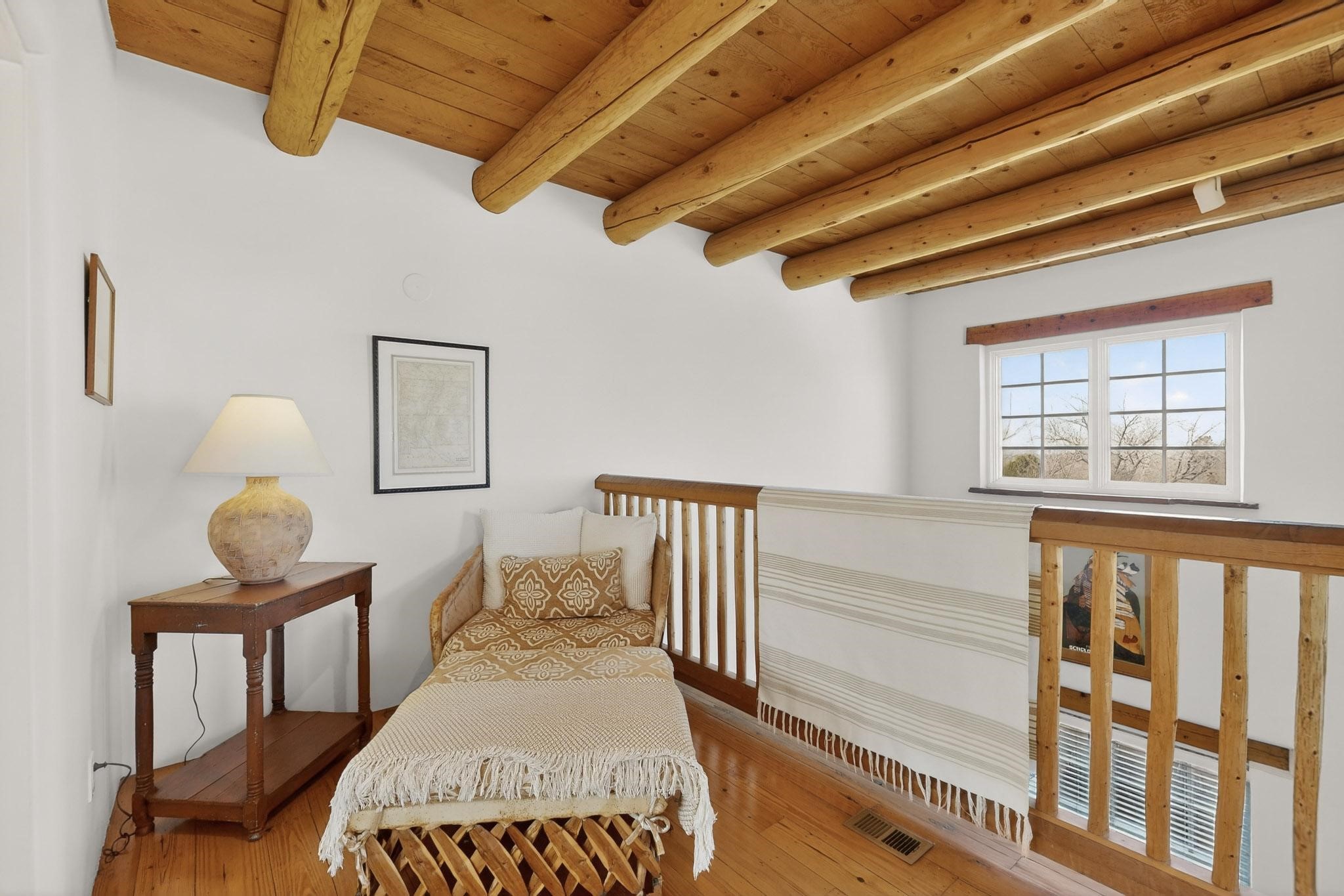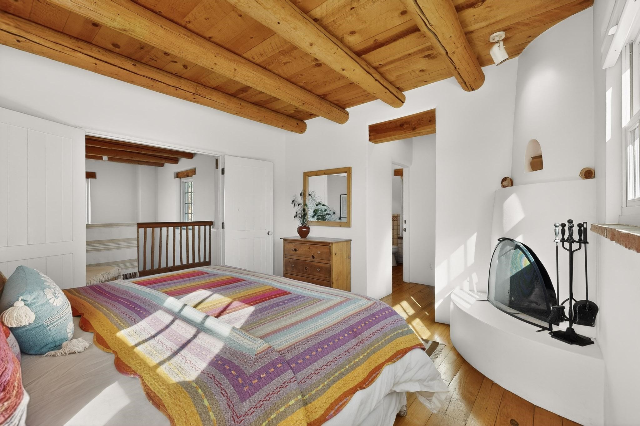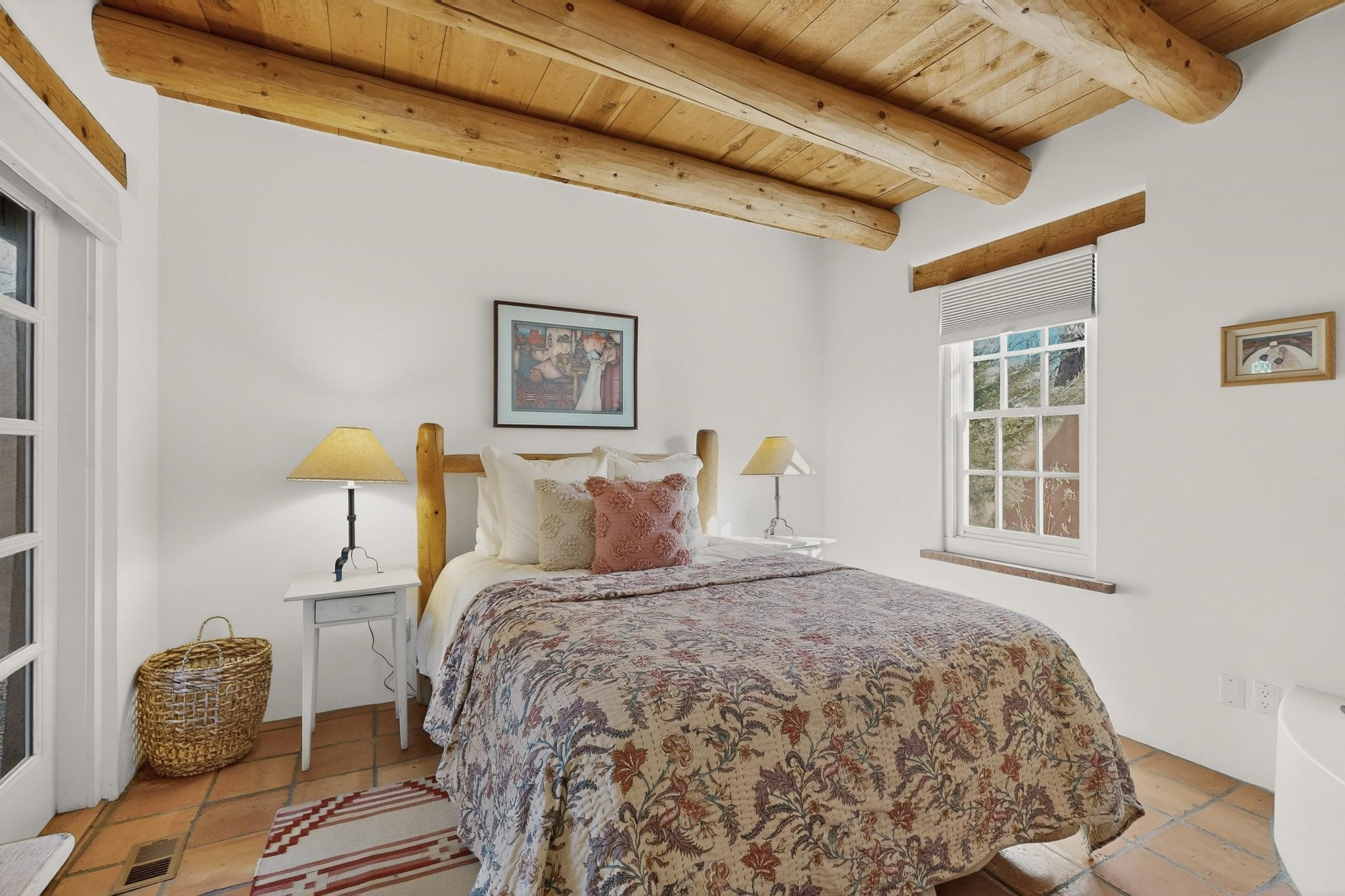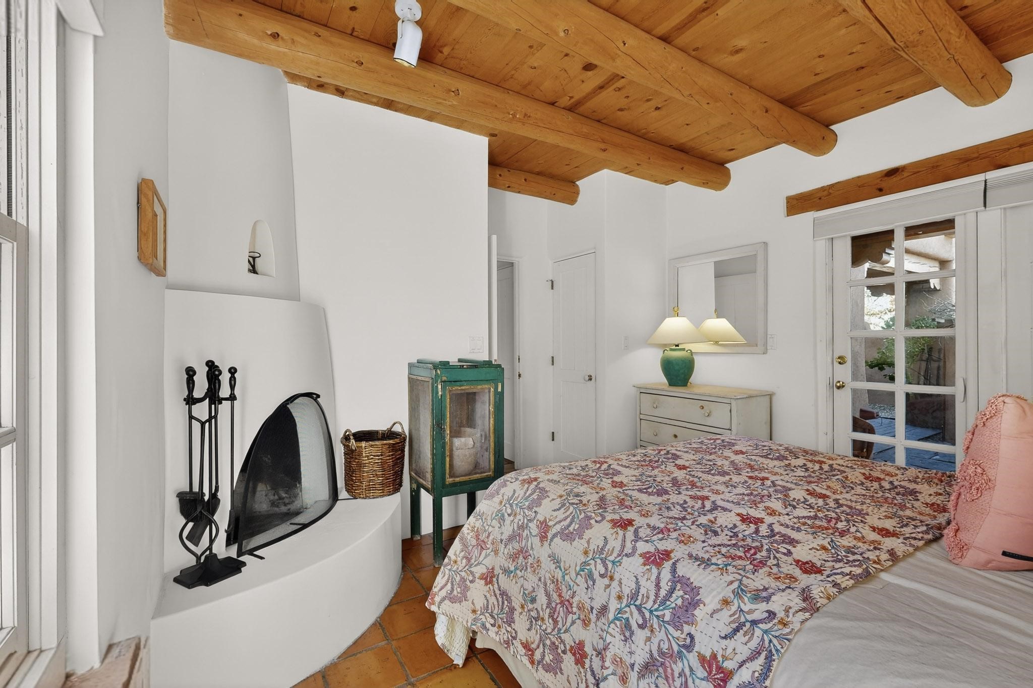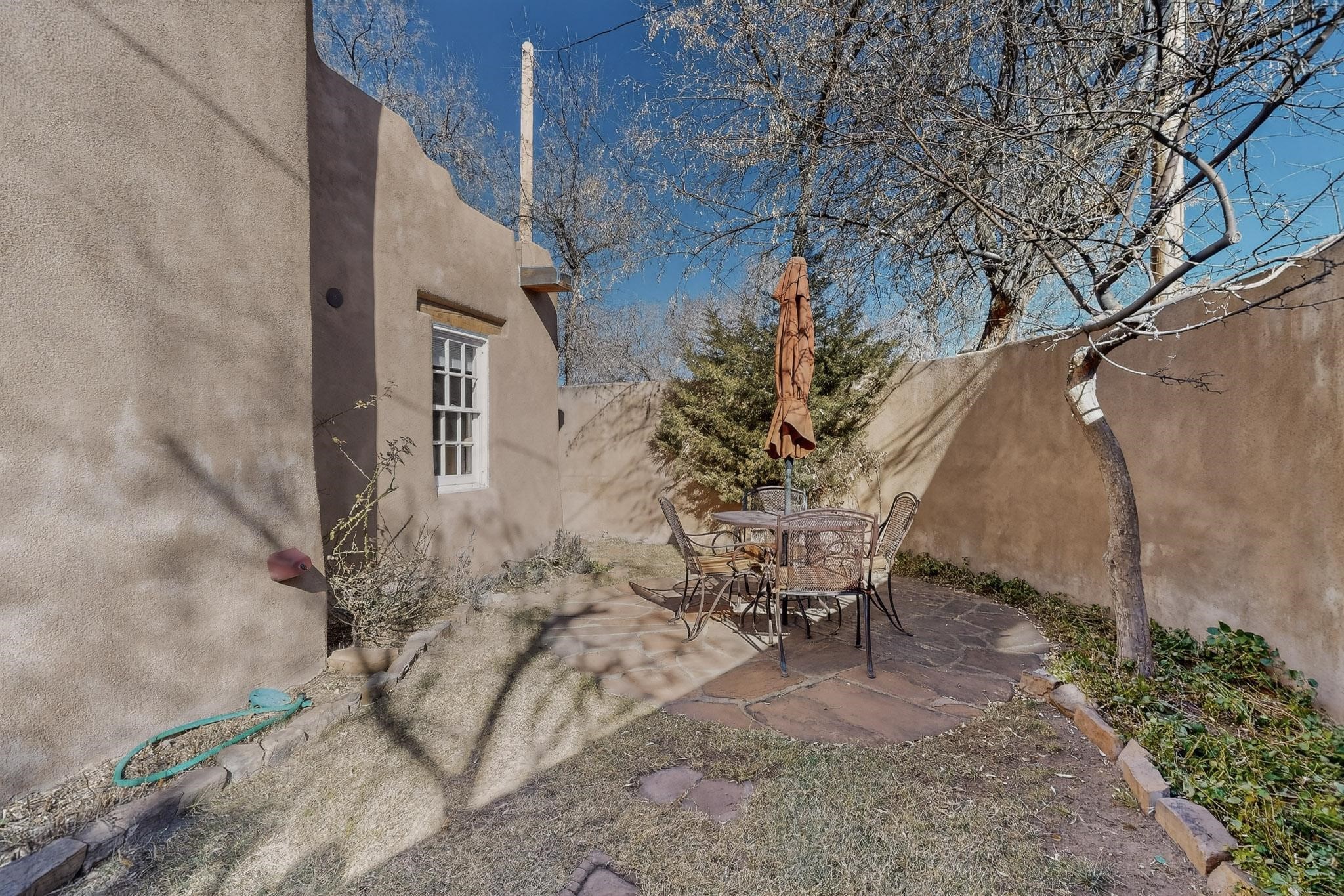 Quarter share Interest in a professionally managed and completely furnished downtown vacation condominium. Two story open ceiling in living-room, light and bright, social kitchen, dining, living -room arrangement. Gas grill right out the back door and a lovely, walled yard with outdoor dining area. Deck with nice views off second floor landing. Good separation for bedrooms - privacy. The living-room and each bedroom has a kiva style fireplace. Smooth plaster walls, vigas, Satillo floors main floor, pine wood floors second floor. Talavera tile in baths and kitchen (kitchen butcher-block counters).