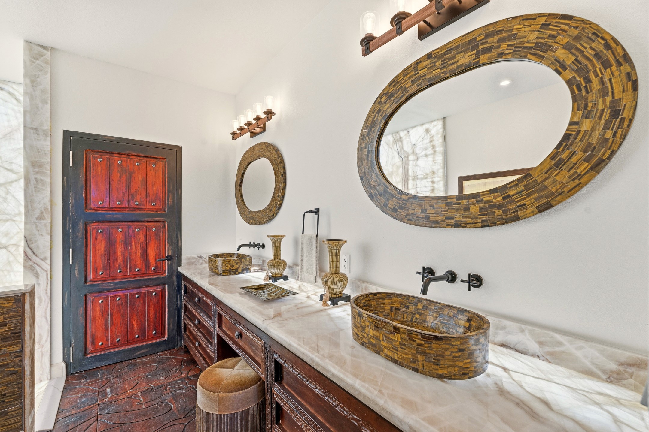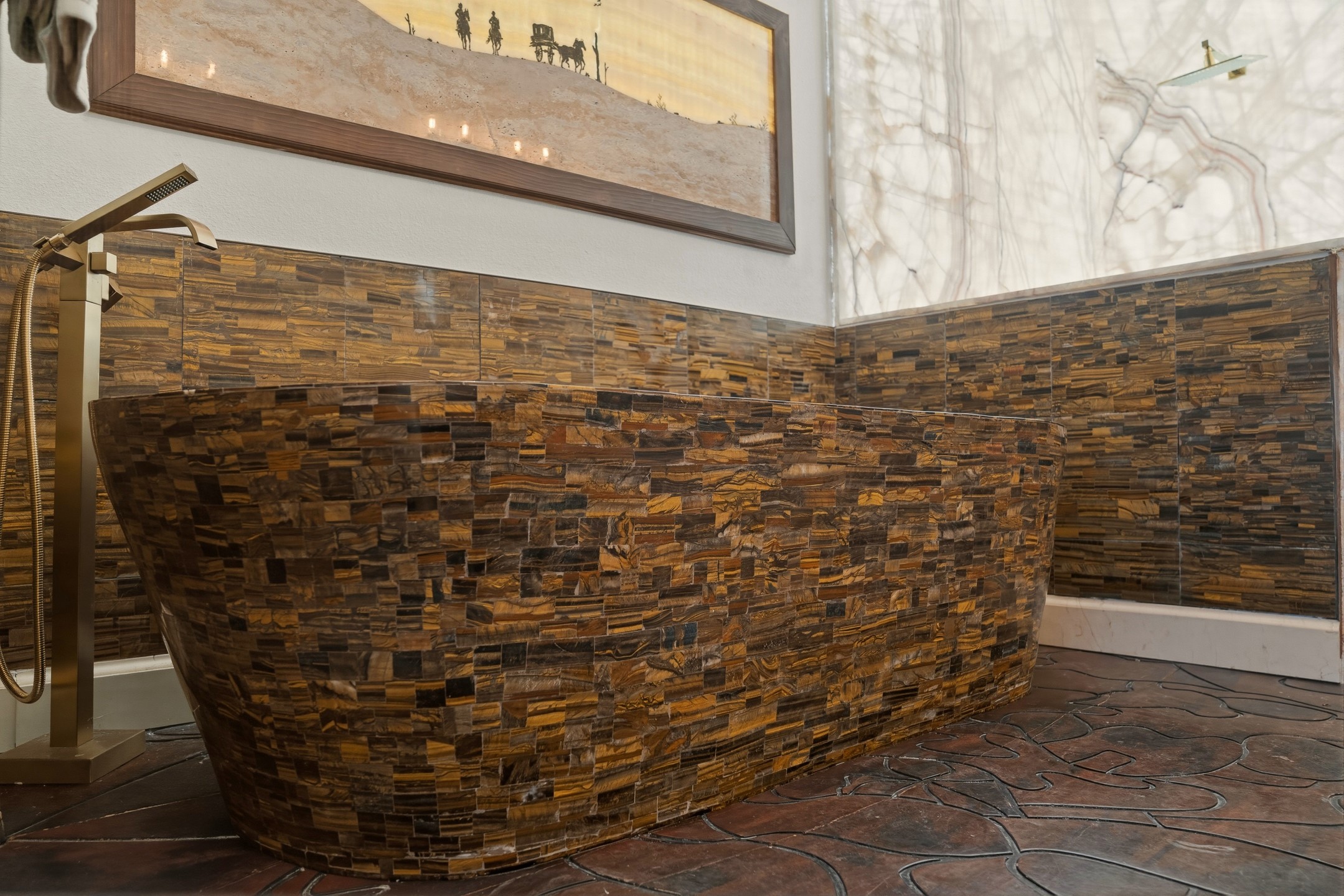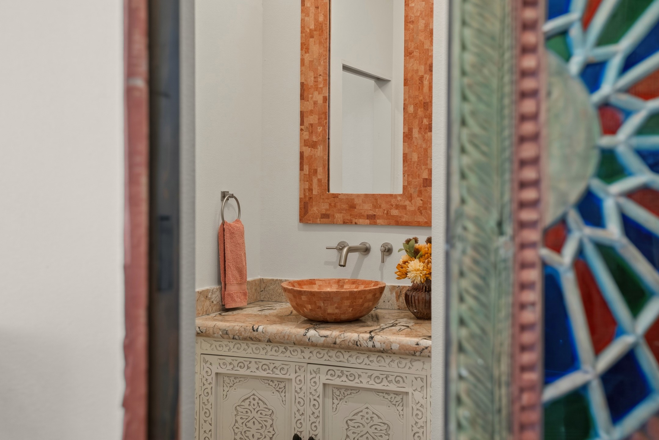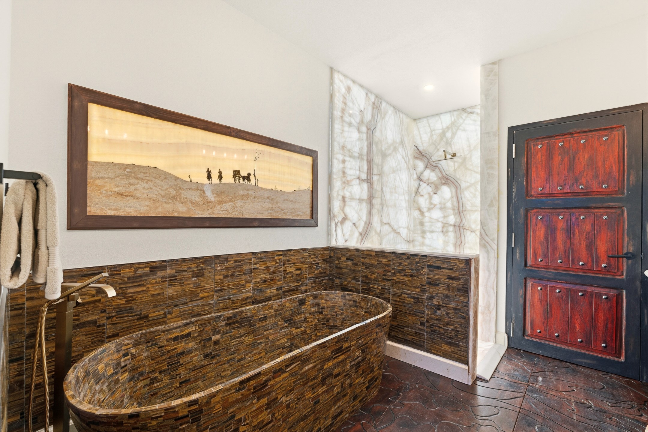 Old world craftsmanship blends seamlessly with modern luxury at the Estancia Collection, a unique compound located in the Baca Railyard District, minutes away from Santa Fe's top galleries and restaurants. This latest vision of renowned developer Mitch Menaker, is where every room becomes a work of living art. Curated by artisans from around the world, using hand cut semi-precious stone, tiles, iron, and rare wood finishes creates a truly immersive and peaceful experience, as if being hugged by nature. As you walk through the sanctuary, a warm greeting by a hand painted dancing Kachina panel inspiring abundance, health and balance meets you. Inside are hand carved teak doors, kitchen cabinets and ceiling treatments, along with petrified wood countertops. The stunning fireplace is crafted with hand cut sandstone in a bamboo pattern. The main level office/bedroom features antique stained glass doors opening to the ensuite bathroom's pink jasper stone sink and mirror sitting atop a beautiful hand carved teak vanity. A magical backlit white onyx staircase creates a dreamlike effect as you ascend to the bedroom suites above. The primary bedroom greets you through a charming speak easy door and a whimsical teak puzzle floor creates a sophisticated, yet playful tone. This light-filled sanctuary features a fireplace, wet bar and a one of a kind spa-like bathroom. The sinks, mirrors and bathtub are made of semi-precious tigers' eyes and the shower is made of back-lit onyx panels, creating a luxurious and luminous retreat. The second light-filled bedroom features a private balcony and bath with hand carved vanity and a mother of pearl stone sink and backsplash. The laundry room, located on the 2nd floor includes a dog shower covered with "happy dog" faces on each hand cut tile. Blending ancient techniques with the expert hands that brought them to life, the developer's vision has created the most unique visual and artistic sanctuary Santa Fe has seen in years.