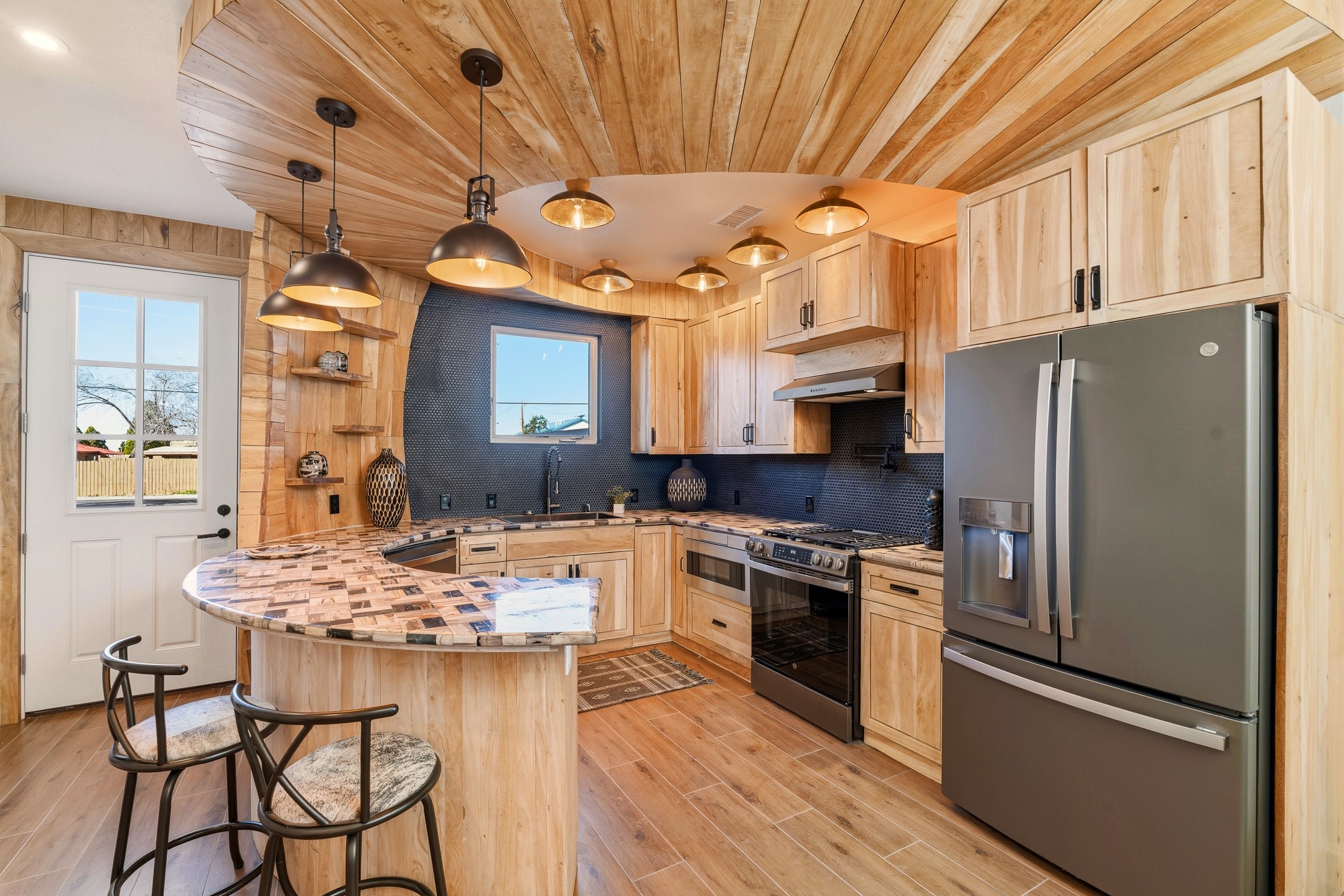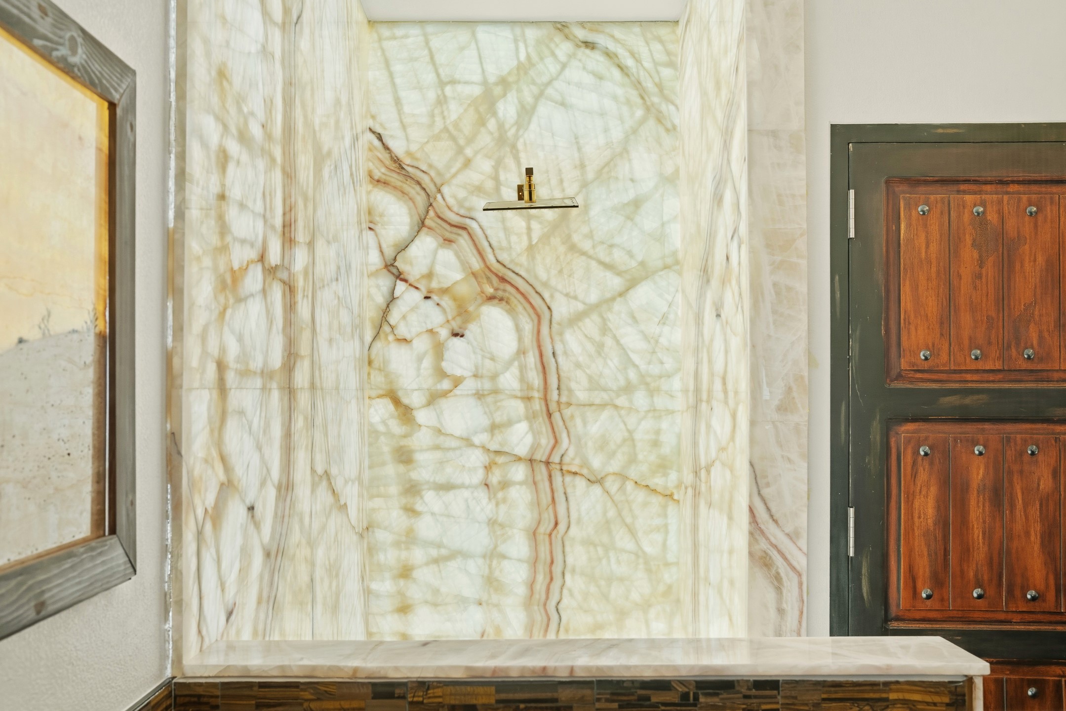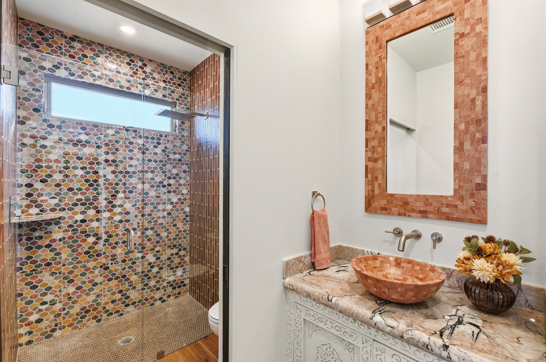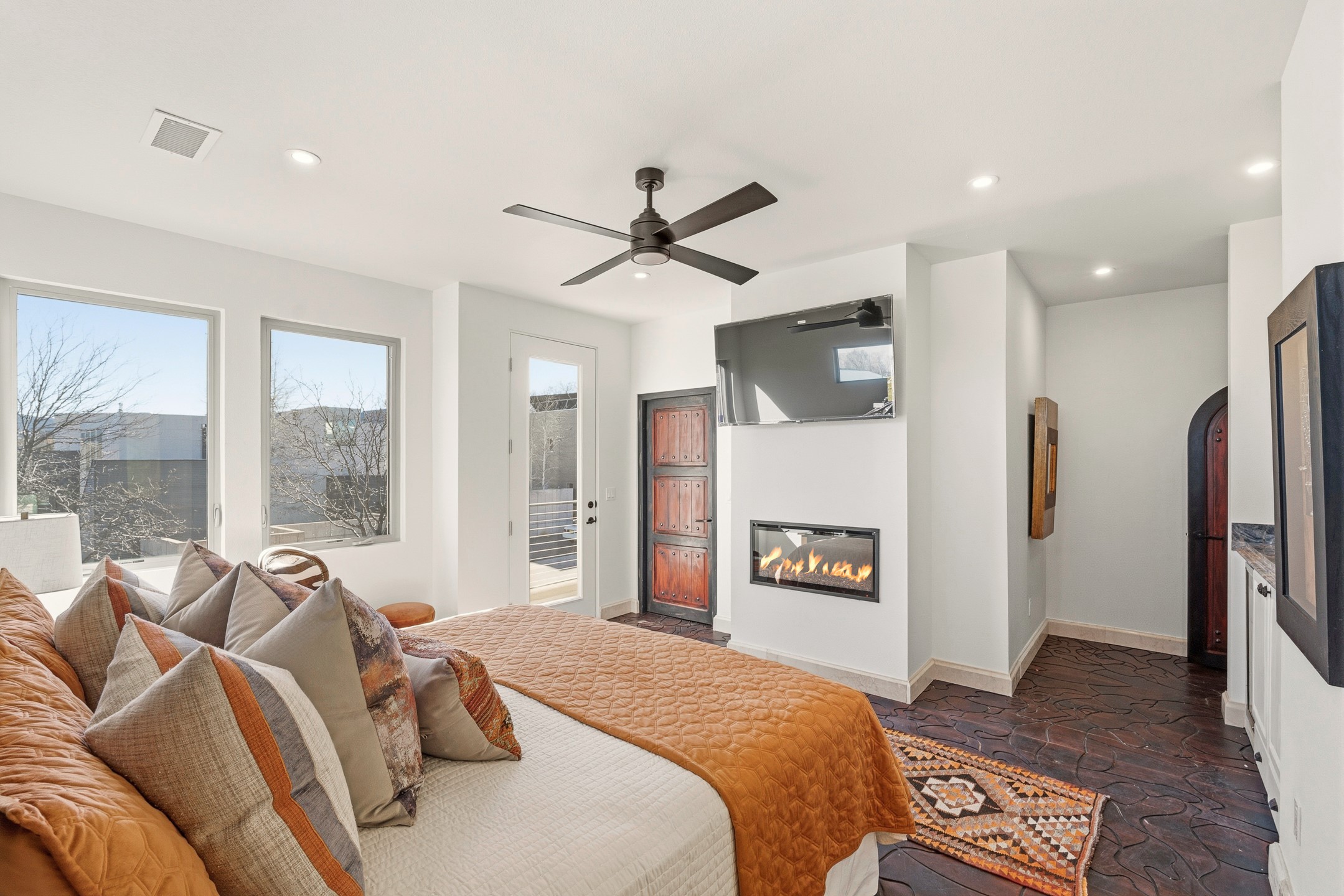 Old world craftsmanship blends seamlessly with modern luxury at the Estancia Collection, a unique compound located in the Baca Railyard District, minutes away from Santa Fe's top galleries and restaurants. This latest vision of renowned developer Mitch Menaker, is where every room becomes a work of living art. Curated by artisans from around the world, using hand cut semi-precious stone, tiles, iron, and rare wood finishes creates a truly immersive and peaceful experience, as if being hugged by nature. As you walk through the sanctuary, a warm greeting by a hand painted dancing Kachina panel inspiring abundance, health and balance meets you. Inside are hand carved teak doors, kitchen cabinets and ceiling treatments, along with petrified wood countertops. The stunning fireplace is crafted with hand cut sandstone in a bamboo pattern. The main level office/bedroom features antique stained glass doors opening to the ensuite bathroom's pink jasper stone sink and mirror sitting atop a beautiful hand carved teak vanity. A magical backlit white onyx staircase creates a dreamlike effect as you ascend to the bedroom suites above. The primary bedroom greets you through a charming speak easy door and a whimsical teak puzzle floor creates a sophisticated, yet playful tone. This light-filled sanctuary features a fireplace, wet bar and a one of a kind spa-like bathroom. The sinks, mirrors and bathtub are made of semi-precious tigers' eyes and the shower is made of back-lit onyx panels, creating a luxurious and luminous retreat. The second light-filled bedroom features a private balcony and bath with hand carved vanity and a mother of pearl stone sink and backsplash. The laundry room, located on the 2nd floor includes a dog shower covered with "happy dog" faces on each hand cut tile. Blending ancient techniques with the expert hands that brought them to life, the developer's vision has created the most unique visual and artistic sanctuary Santa Fe has seen in years.
