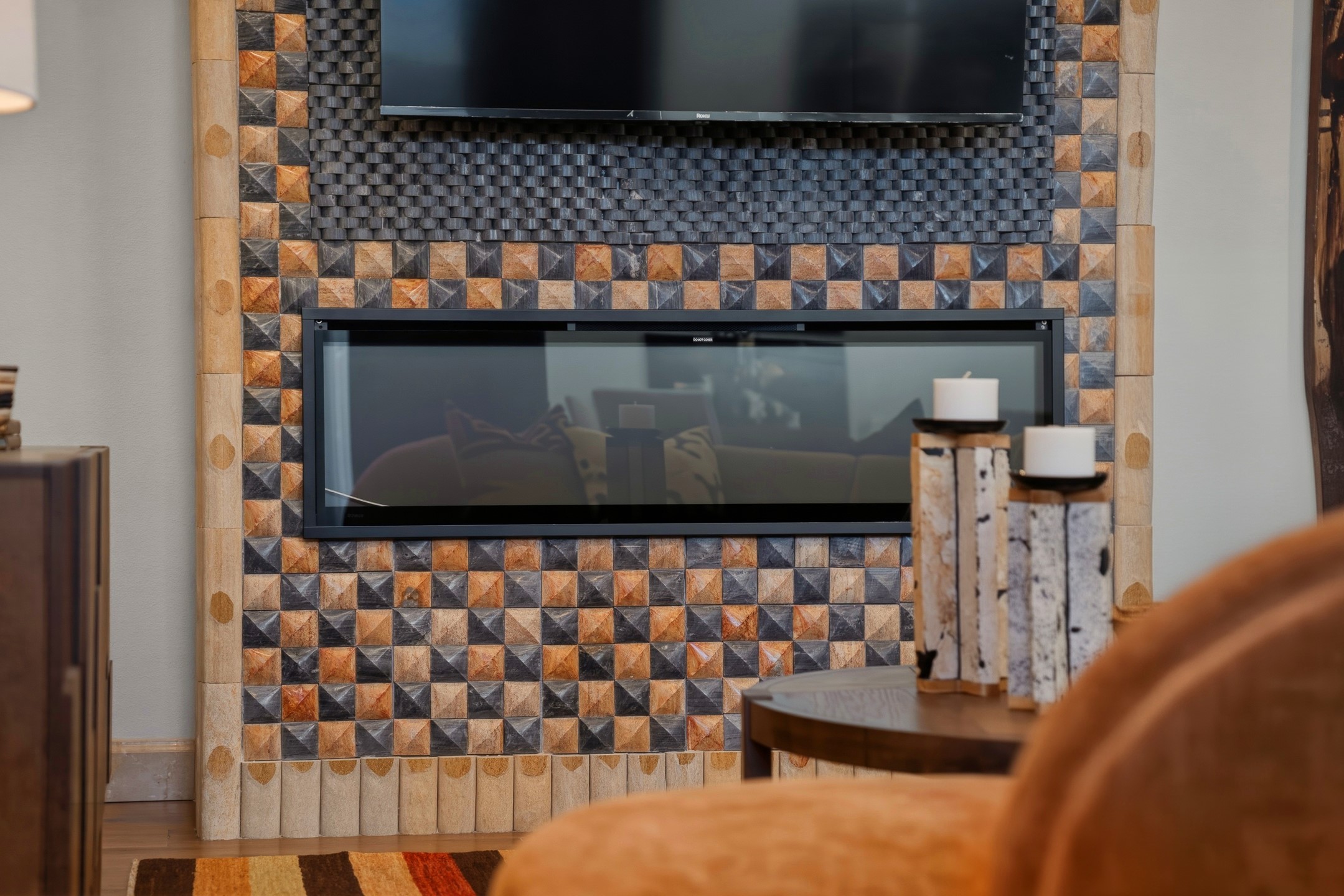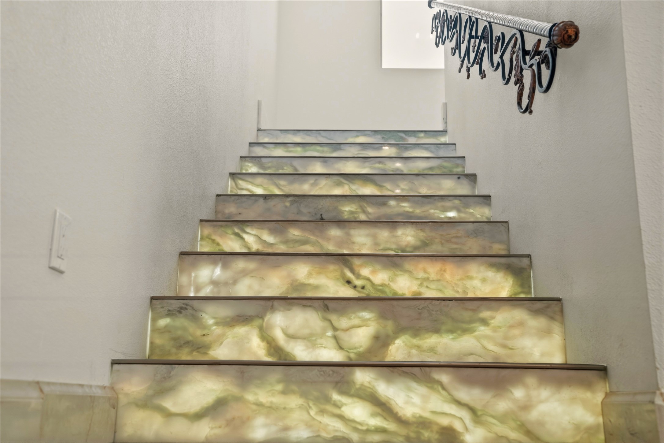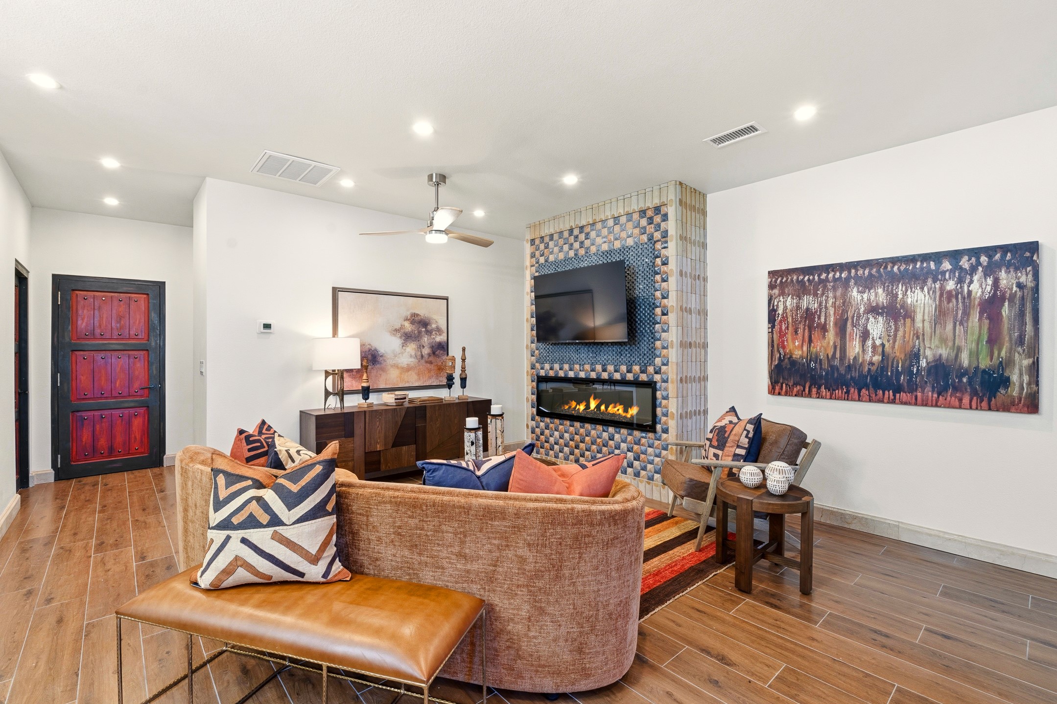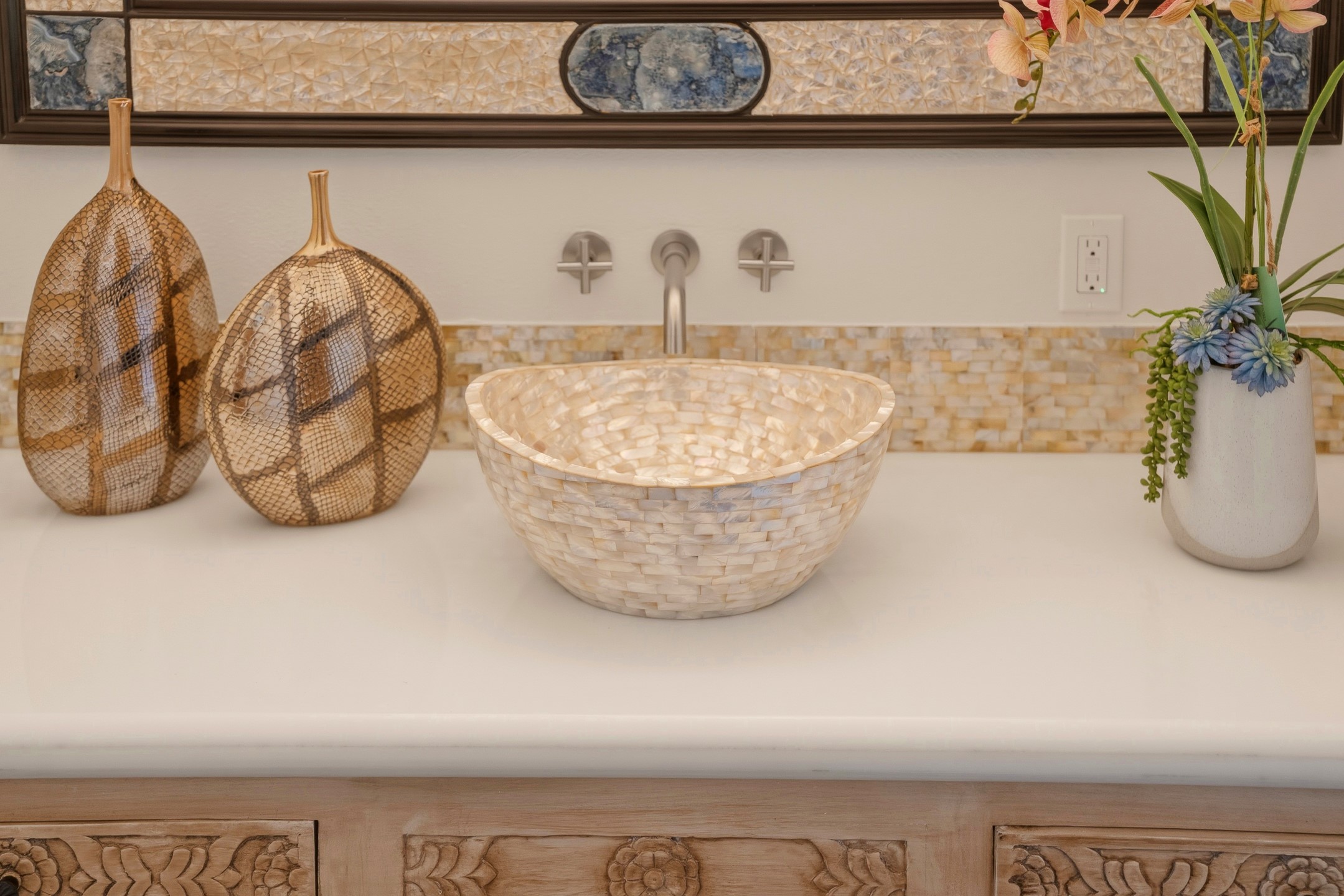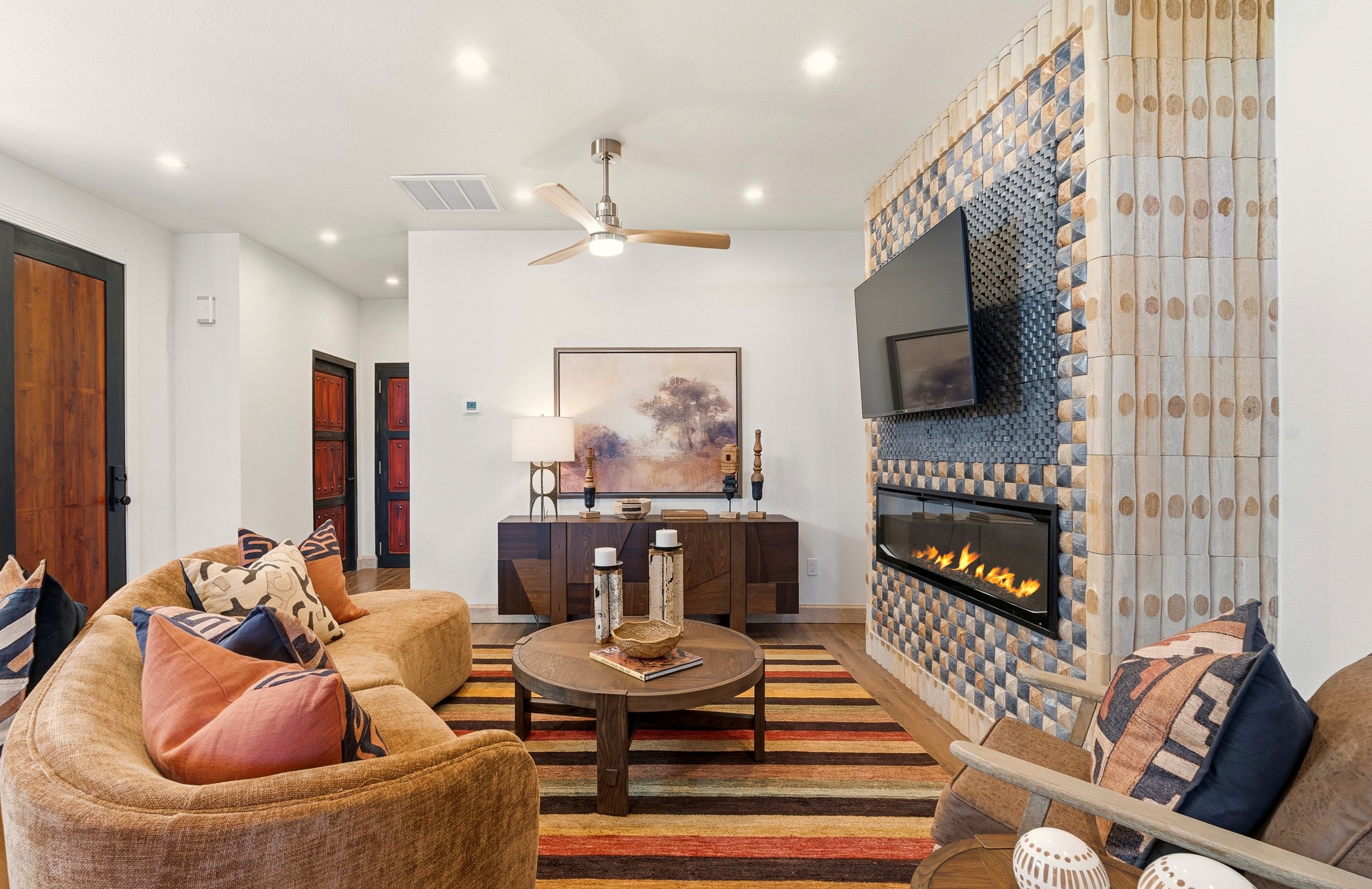Old world craftsmanship blends seamlessly with modern luxury at the Estancia Collection, a unique compound located in the Baca Railyard District, minutes away from Santa Fe's top galleries and restaurants. This latest vision of renowned developer Mitch Menaker, is where every room becomes a work of living art. Curated by artisans from around the world, using hand cut semi-precious stone, tiles, iron, and rare wood finishes creates a truly immersive and peaceful experience, as if being hugged by nature. As you walk through the sanctuary, a warm greeting by a hand painted dancing Kachina panel inspiring abundance, health and balance meets you. Inside are hand carved teak doors, kitchen cabinets and ceiling treatments, along with petrified wood countertops. The stunning fireplace is crafted with hand cut sandstone in a bamboo pattern. The main level office/bedroom features antique stained glass doors opening to the ensuite bathroom's pink jasper stone sink and mirror sitting atop a beautiful hand carved teak vanity. A magical backlit white onyx staircase creates a dreamlike effect as you ascend to the bedroom suites above. The primary bedroom greets you through a charming speak easy door and a whimsical teak puzzle floor creates a sophisticated, yet playful tone. This light-filled sanctuary features a fireplace, wet bar and a one of a kind spa-like bathroom. The sinks, mirrors and bathtub are made of semi-precious tigers' eyes and the shower is made of back-lit onyx panels, creating a luxurious and luminous retreat. The second light-filled bedroom features a private balcony and bath with hand carved vanity and a mother of pearl stone sink and backsplash. The laundry room, located on the 2nd floor includes a dog shower covered with "happy dog" faces on each hand cut tile. Blending ancient techniques with the expert hands that brought them to life, the developer's vision has created the most unique visual and artistic sanctuary Santa Fe has seen in years.