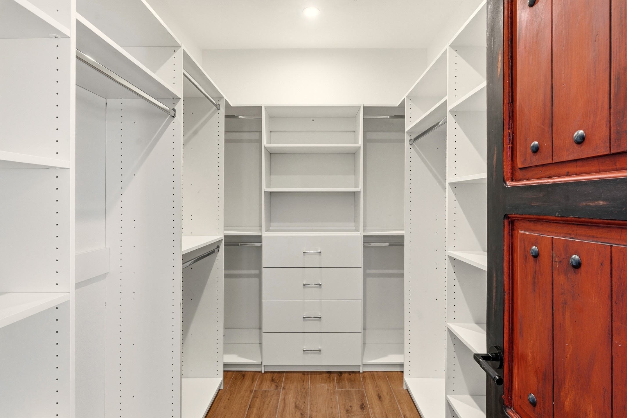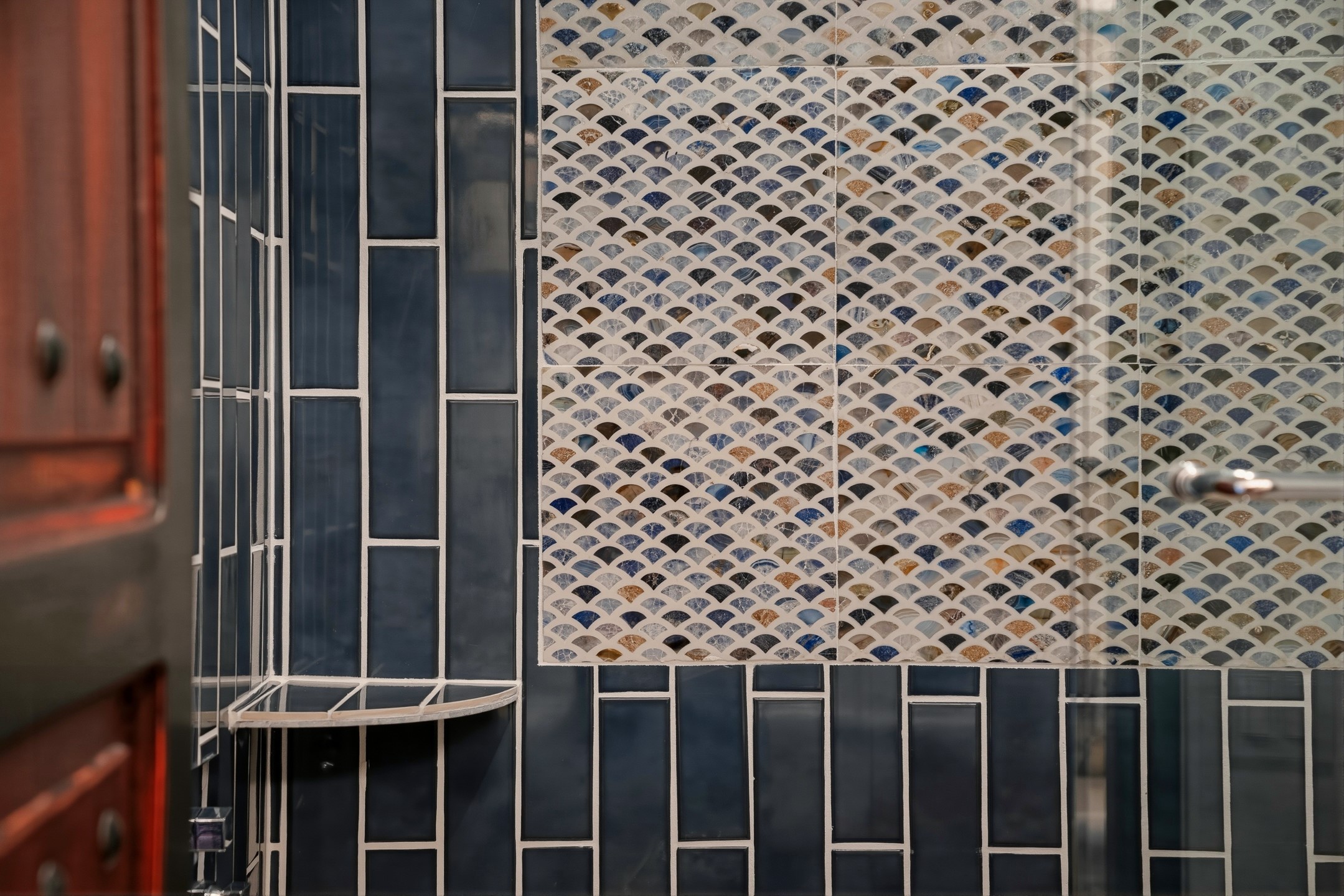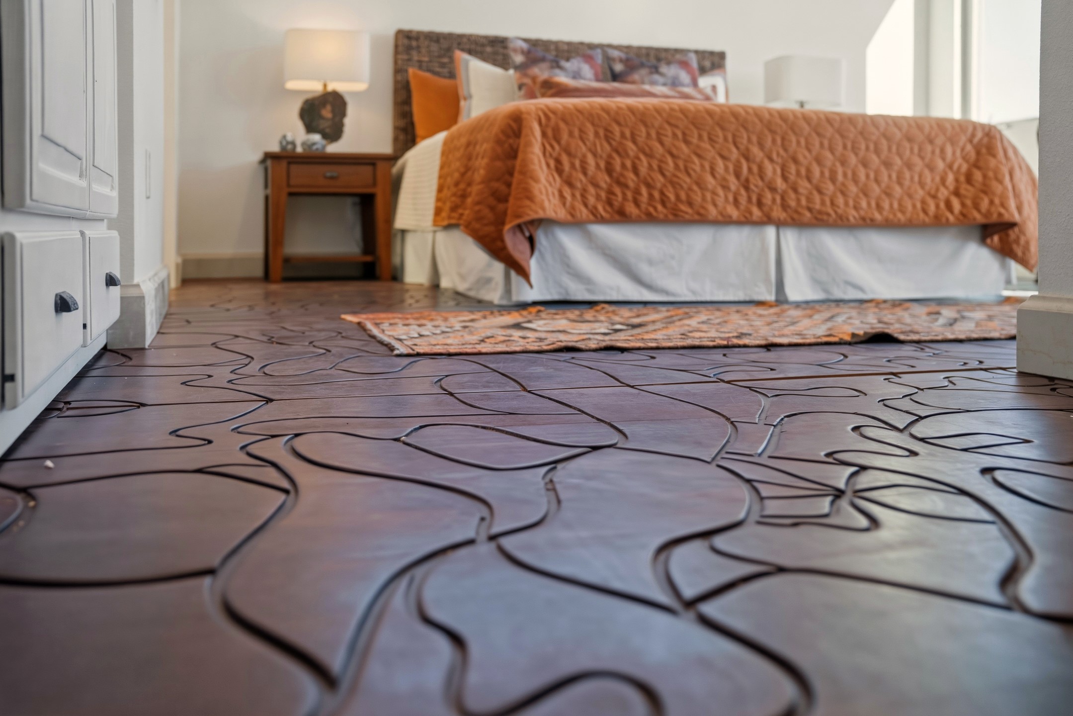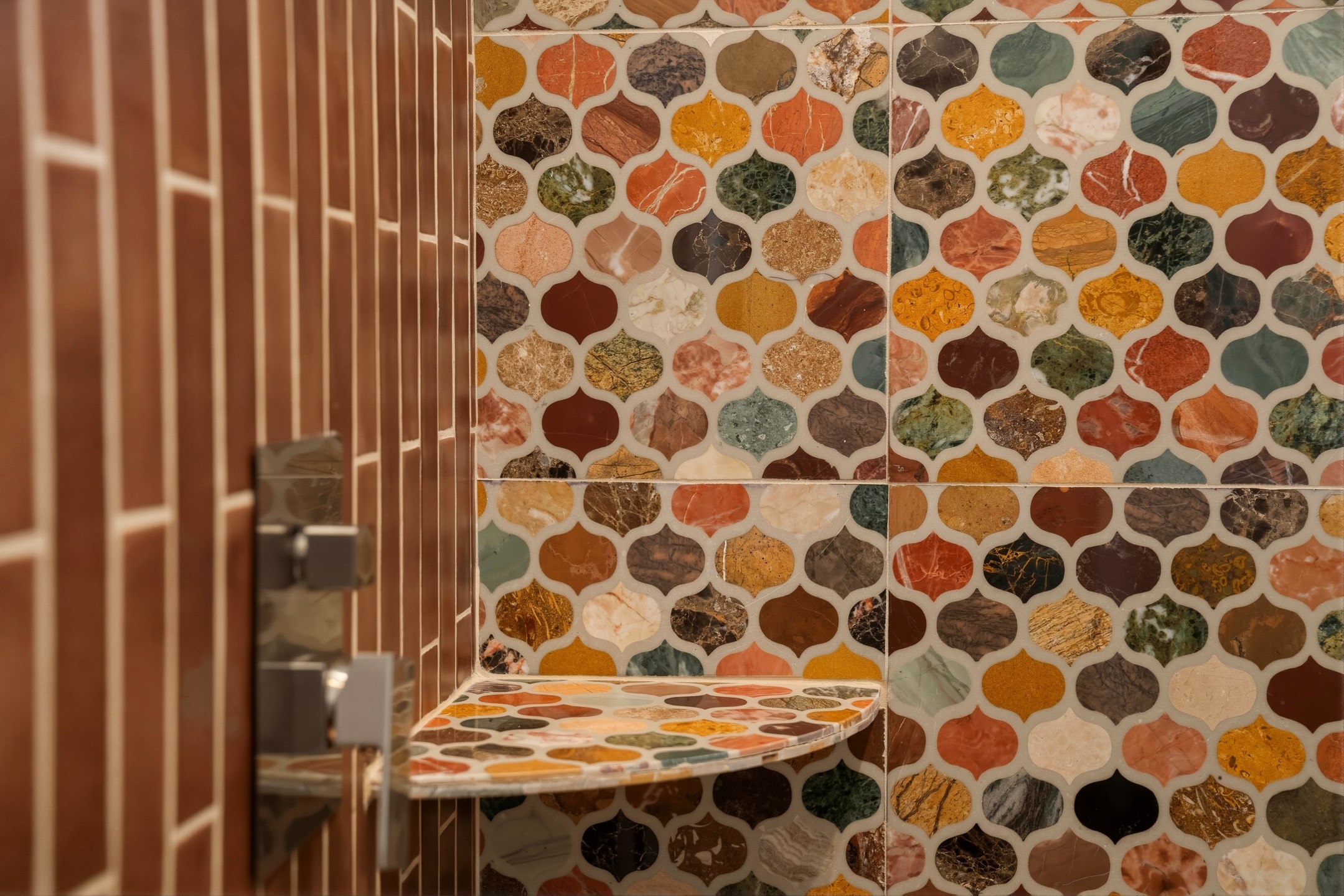 Old world craftsmanship blends seamlessly with modern luxury at the Estancia Collection, a unique compound located in the Baca Railyard District, minutes away from Santa Fe's top galleries and restaurants. This latest vision of renowned developer Mitch Menaker, is where every room becomes a work of living art. Curated by artisans from around the world, using hand cut semi-precious stone, tiles, iron, and rare wood finishes creates a truly immersive and peaceful experience, as if being hugged by nature. As you walk through the sanctuary, a warm greeting by a hand painted dancing Kachina panel inspiring abundance, health and balance meets you. Inside are hand carved teak doors, kitchen cabinets and ceiling treatments, along with petrified wood countertops. The stunning fireplace is crafted with hand cut sandstone in a bamboo pattern. The main level office/bedroom features antique stained glass doors opening to the ensuite bathroom's pink jasper stone sink and mirror sitting atop a beautiful hand carved teak vanity. A magical backlit white onyx staircase creates a dreamlike effect as you ascend to the bedroom suites above. The primary bedroom greets you through a charming speak easy door and a whimsical teak puzzle floor creates a sophisticated, yet playful tone. This light-filled sanctuary features a fireplace, wet bar and a one of a kind spa-like bathroom. The sinks, mirrors and bathtub are made of semi-precious tigers' eyes and the shower is made of back-lit onyx panels, creating a luxurious and luminous retreat. The second light-filled bedroom features a private balcony and bath with hand carved vanity and a mother of pearl stone sink and backsplash. The laundry room, located on the 2nd floor includes a dog shower covered with "happy dog" faces on each hand cut tile. Blending ancient techniques with the expert hands that brought them to life, the developer's vision has created the most unique visual and artistic sanctuary Santa Fe has seen in years.