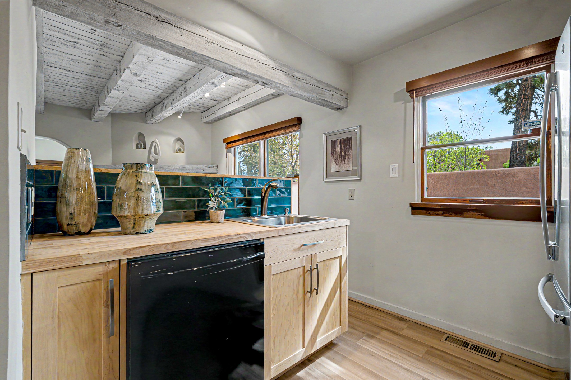 Rare opportunity to own an updated luxury condo just moments from the Santa Fe Plaza.This beautifully updated 3BD/2.5BA home offers 2,102 sq ft of refined Southwestern living. Warm and inviting, it features classic brick floors in the living and dining areas, two wood-burning fireplaces, wood flooring in the kitchen, and new carpet (March 2026) in the bedrooms. The updated kitchen includes butcher block countertops, a new refrigerator, and a new oven/stove(March 2026)--perfect for everyday living and entertaining. Recent upgrades provide exceptional comfort and peace of mind, including new HVAC with forced air heating and A/C (April 2026), TPO roof (Oct 2025), stucco (Nov 2025), and updated electrical panel and sub-panel (April 2026), along with extensive infrastructure improvements for long-term durability. Enjoy charming outdoor patios, a finished attached 2-car garage, and a highly desirable location just minutes from dining, galleries, and the heart of Santa Fe.