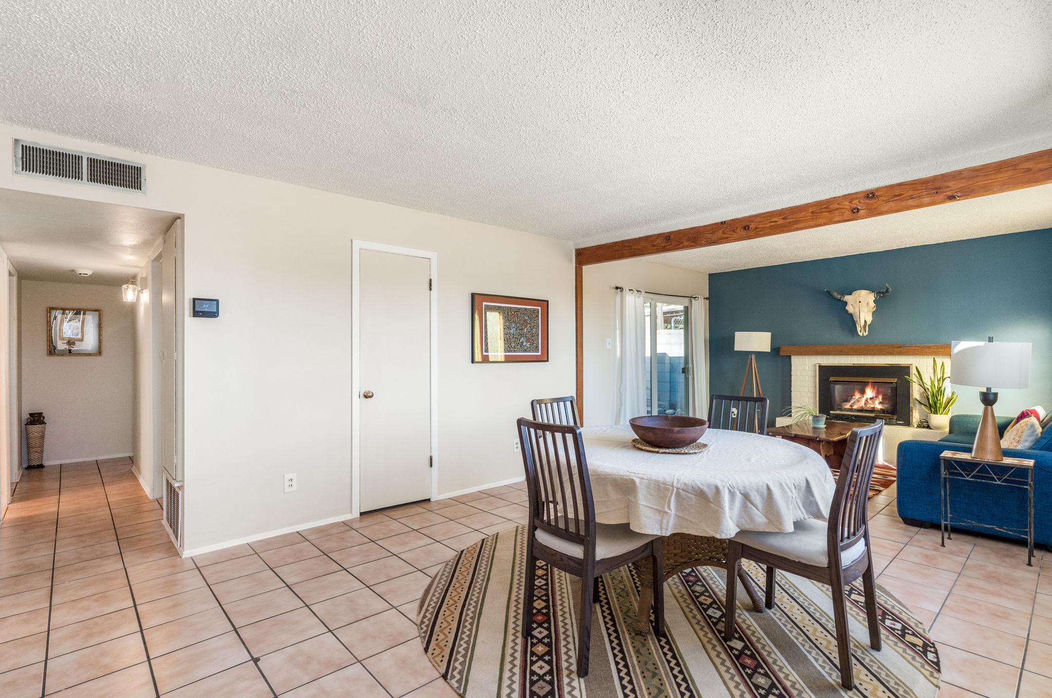 Lovingly maintained and full of charm, this inviting home is nestled in a well-established Santa Fe neighborhood just minutes from shopping, restaurants, healthcare, and everyday conveniences.Step inside to a bright and welcoming open living and dining area featuring beautiful tile floors, a cozy gas fireplace, and sliding glass doors that lead to an expansive covered portal--perfect for outdoor dining, relaxing, or entertaining while overlooking the generous backyard.The thoughtfully updated kitchen blends style and functionality with a classic farm sink, elegant quartz countertops, and a delightful blue-and-white backsplash that frames the newer electric stove with personality and flair.Practical upgrades add to the home's appeal. The insulated, dry-walled garage includes the laundry area and offers a convenient exterior hookup for an electric car charger.All three bedrooms feature attractive wood-look vinyl flooring and sliding glass-paneled closet doors. The spacious primary suite is a true retreat, offering an oversized layout, a wall of closets with charming barn doors, and a cute ensuite bath. The full guest bath is equally appealing with a glass tub-and-shower enclosure and tasteful tile accents behind the sink and toilet.Natural light fills the home throughout, creating a warm and airy feel. Outside, the large backyard provides plenty of room to garden, play, or simply enjoy the outdoors, and includes a spacious garden shed for storage or hobbies.Energy-efficient features complete the package, including solar electric, a newer electric heat pump, and refrigerated A/C for year-round comfort.This delightful Santa Fe home offers character, thoughtful updates, and comfortable living in a fantastic location.