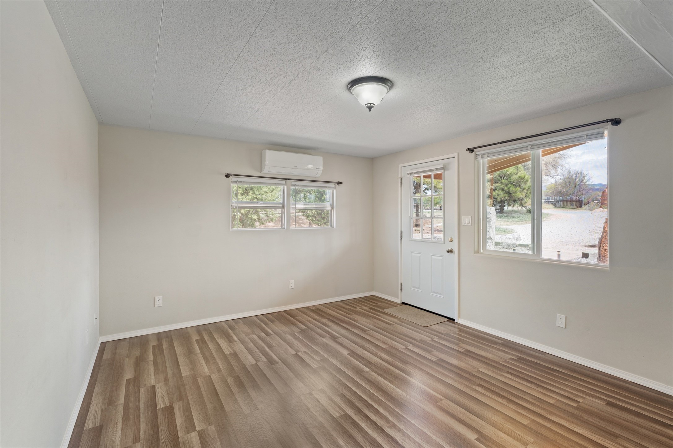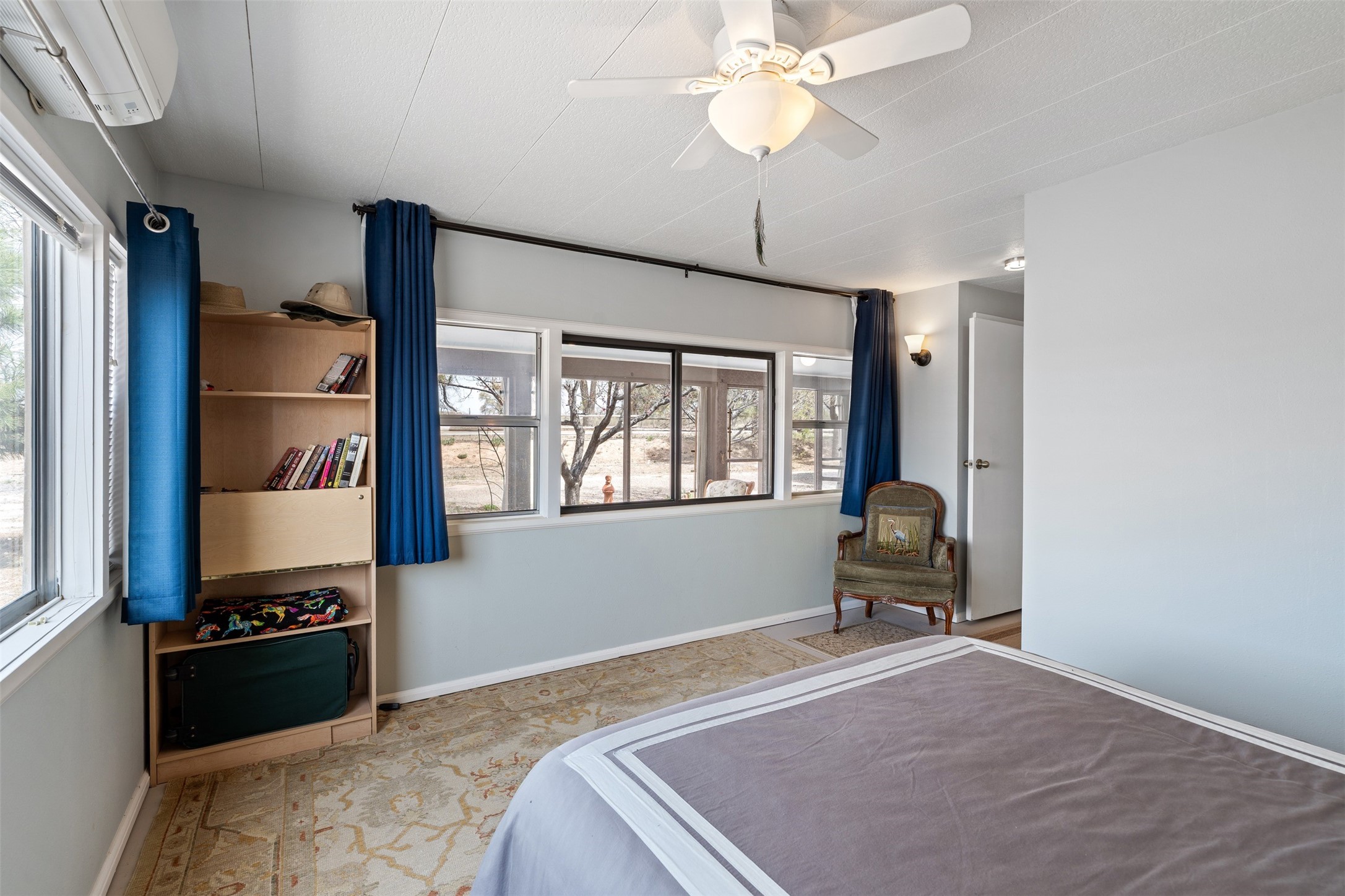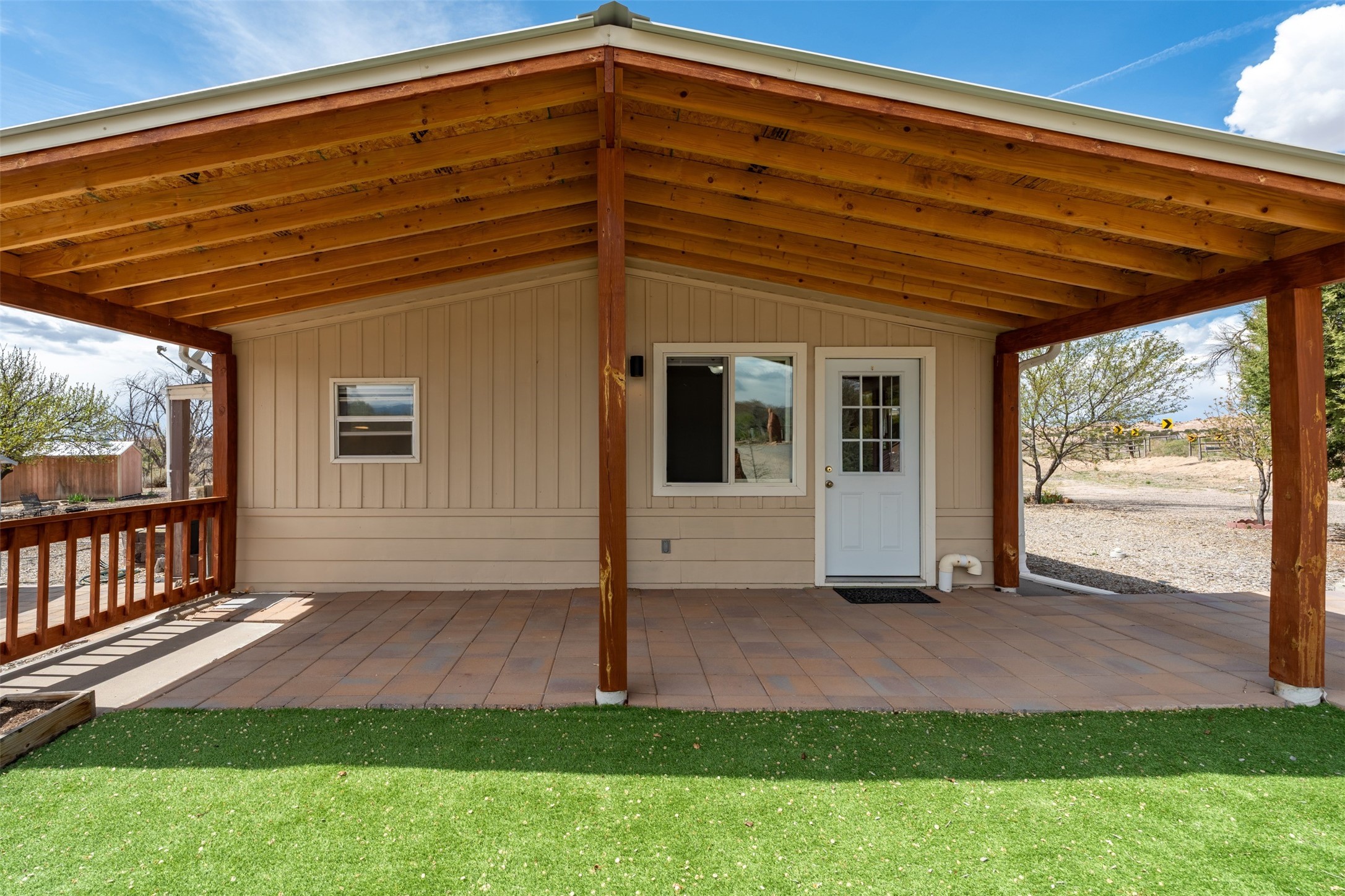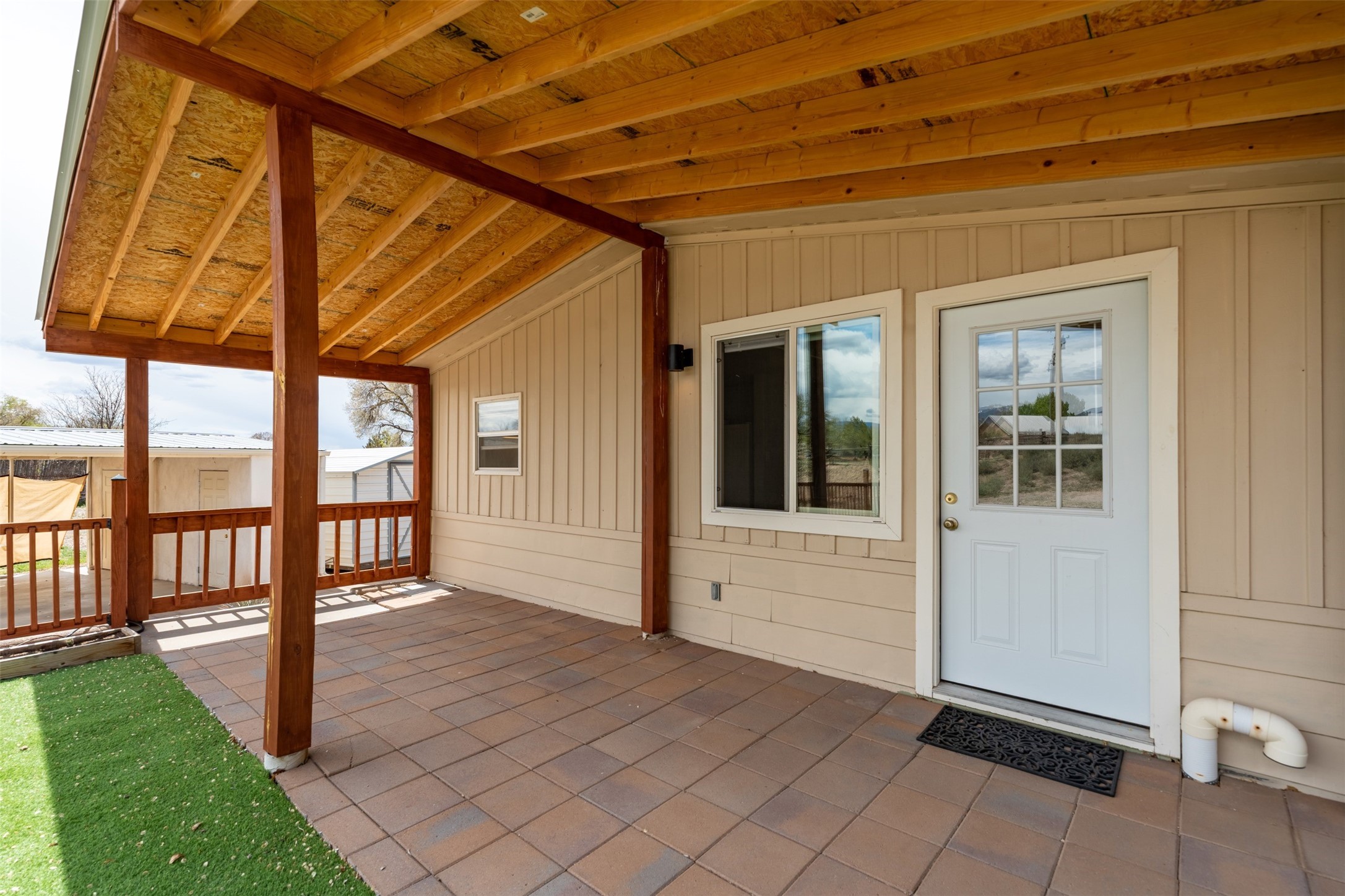 Set on 1+ acres in Namb, 1 Calle Andreita opens to a wide horizon--Pueblo lands stretching out to the West, the Jemez Mountains rising in the distance, and the Sangre de Cristo Mountains to the East, catching the evening light as the sun sets. It's a tranquil setting that feels quiet and grounded, with a daily rhythm shaped by sky, high desert vistas, and the occasional visit from horses at the fence line, drawn in by water, snacks, or human companionship.The property is configured as a duplex, totaling approximately 1,750 square feet, offering flexibility for a range of uses. The main residence, approximately 960sq/ft, includes three bedrooms and two bathrooms. A fully screened, private portal faces north--an easy place to settle in with a book, share a meal, or take in the surrounding landscape while protected from the heat of the afternoon sun. The attached guest house, approximately 790sq/ft, provides two additional bedrooms and a full bathroom, with its own portal oriented toward the Sangre de Cristos, with morning light and open views.Both living spaces have been updated with refreshed kitchens and bathrooms, and each includes its own washer and dryer. The land itself offers room to expand into outdoor living--gardens, gathering spaces, or simply open ground to enjoy as-is. A quiet corner of the property, bordering Pojoaque Pueblo land with outstanding views, is the perfect spot for a morning coffee, an evening cocktail, or a blissful meditation. Mature trees, including apple, apricot, and peach, add texture and seasonal color, while surface irrigation rights and a private well support long-term stewardship of the land.Additional improvements include three storage sheds and a double carport with extra storage. Despite the quiet, unhurried rhythm of life in Namb, the location remains practical--roughly 25 minutes to the Santa Fe Plaza and under 30 minutes to Los Alamos and the National Laboratory.
