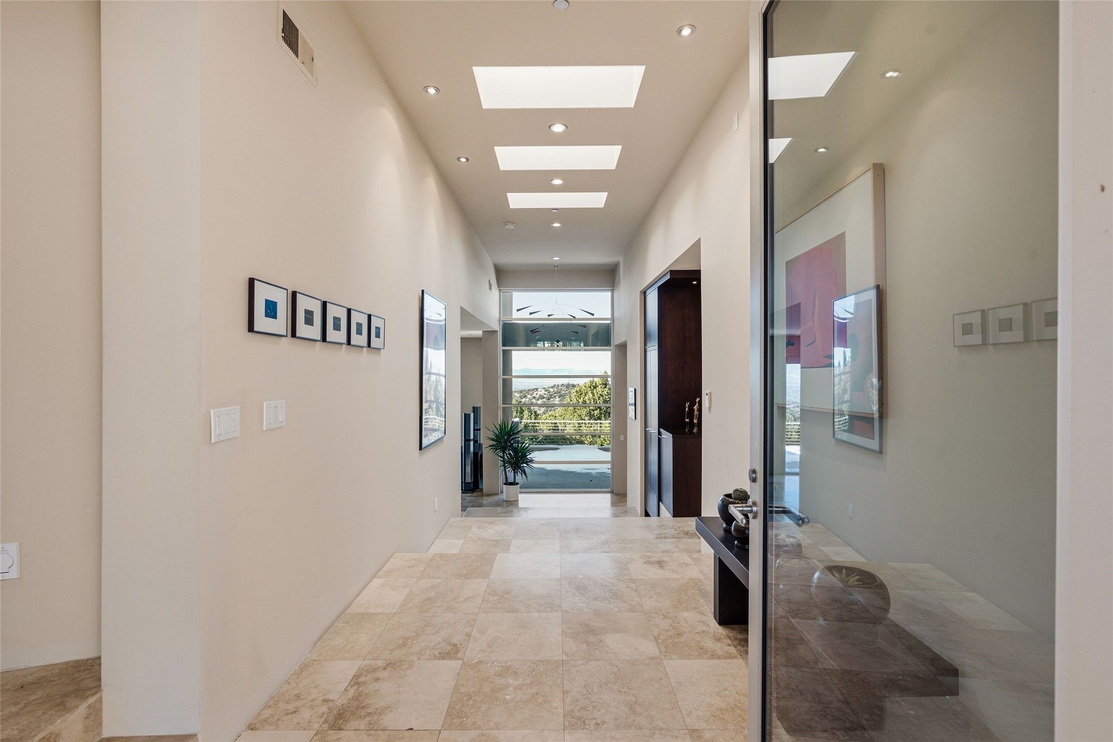 Nestled into the crest of the highest ridge within the gated High Summit community, this exceptional residence blends contemporary design, remarkable privacy, and unforgettable panoramic views. Built in 2008, and offered with three additional vacant lots, the property presents a rare opportunity for enhanced seclusion as well as future expansion and development. Generous spacing between neighboring homes creates a true sense of tranquility and independent retreat. Inside, soaring ceilings and expansive walls of glass define the open concept living spaces, filling the home with natural light while perfectly framing the dramatic mountain and city light views. An expansive view deck seamlessly extends the living space outdoors, ideal for enjoying Santa Fe's legendary sunsets and four season climate. Outdoor gatherings are elevated with a stainless steel Wolf built in grill and kitchen station, creating the perfect setting for al fresco dining and entertaining. The chef's kitchen is both striking and highly functional, featuring a large center island with a secondary sink, walk in butler's pantry, abundant counter space, rich hardwood cabinetry, and premium Wolf and Sub Zero appliances. Additional highlights include a wine refrigerator and refrigeration drawers. The luxurious primary suite feels like a private sanctuary, complete with a gas fireplace, generous walk in closet, and a spa like bath featuring double vanities with granite countertops, light embedded mirrors, a walk in shower, and a separate soaking tub. The thoughtfully designed floor plan offers three-bedroom suites and four bathrooms, allowing comfortable spaces for everyday living and elegant entertaining. Guest suites, well separated from the primary suite, provide comfort and privacy for visitors. Throughout the home, travertine and maple wood flooring add warmth, texture, and timeless elegance. Additional features include an oversized two car garage, a high efficiency Viessmann boiler, water softening system, whole house fire suppression system, and a roof mounted solar array with Tesla battery storage--offering both peace of mind and modern sustainability.