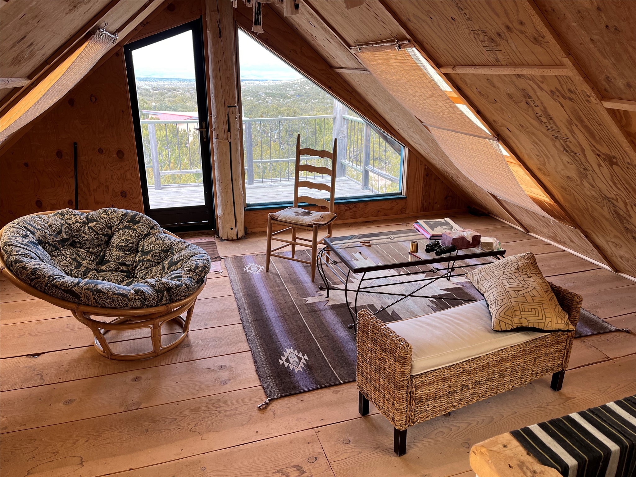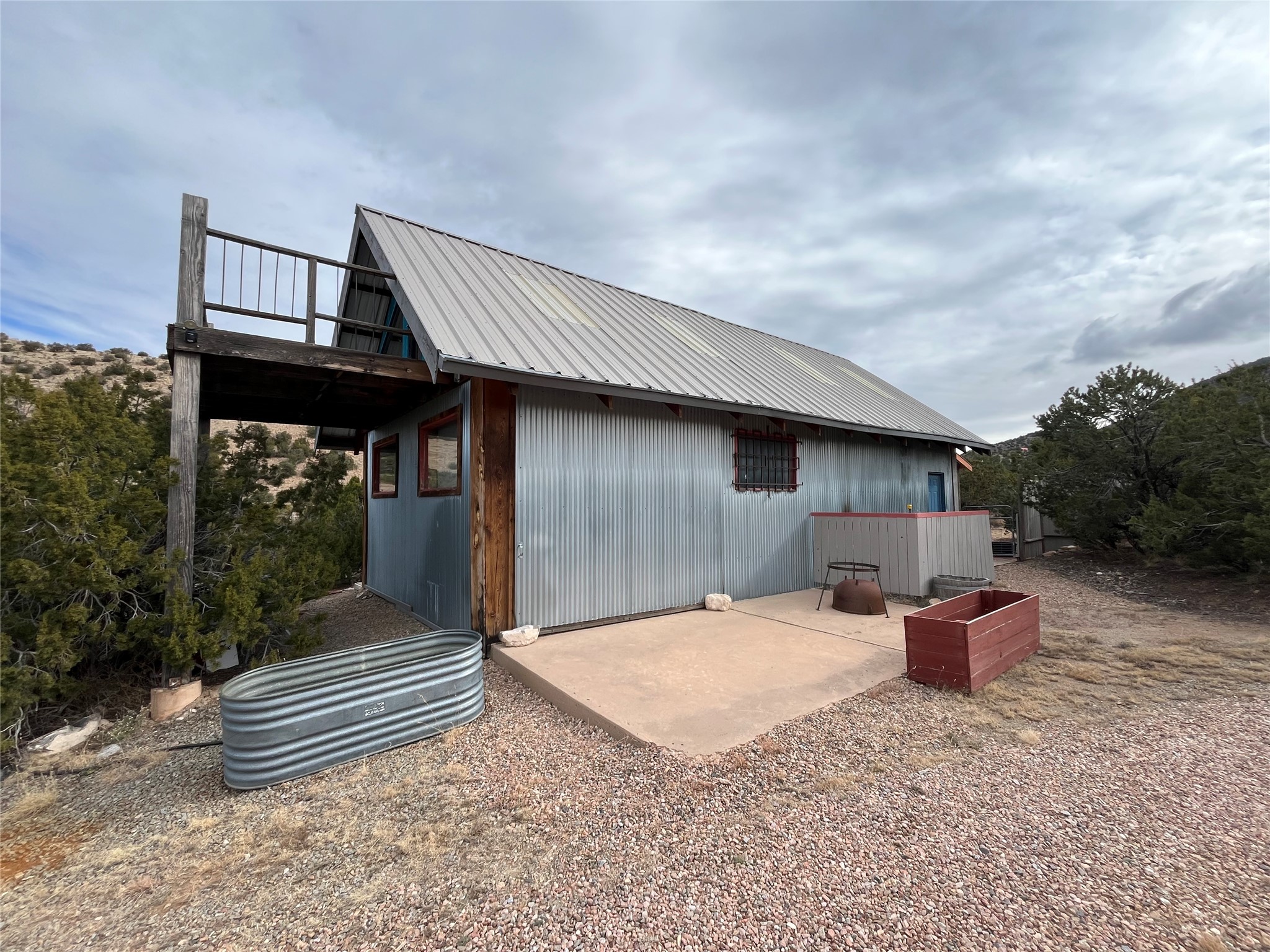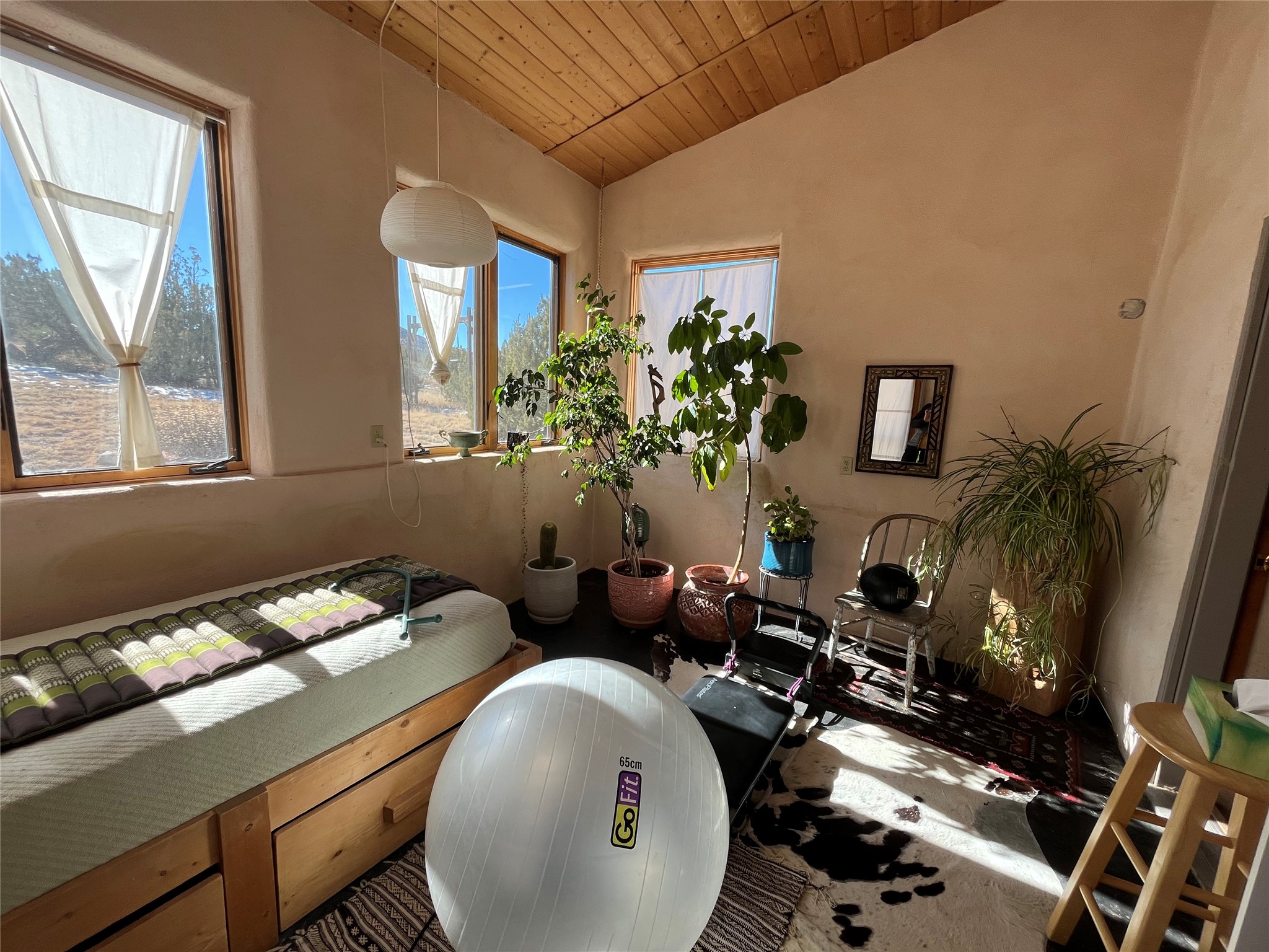 Thoughtfully designed and consciously placed, this off-grid straw bale home sits on approximately 10 acres in the Cerrillos/Madrid area, positioned to take full advantage of sweeping mountain views, privacy, and easy access. Located less than a quarter mile from Highway 14, the property offers a rare combination of seclusion and convenience. The main residence offers two bedrooms and a sunroom, high ceilings, abundant natural light, and an open, inviting layout. Interior details include teak and concrete flooring, an open kitchen, generous storage, and a large, well-lit bathroom. The home is served by a private well and septic system and is powered by its own PV solar system, designed for efficient off-grid living. A separate 800+/- sq ft artist's studio/barn adds exceptional versatility. The structure includes a full loft, a large sauna, brick flooring, oversized double doors opening to a secluded brick patio, and a viewing deck. This building offers flexible studio, workshop, or storage space and significant potential for future enhancement. The land is partially fenced and extends across Camino Cerro Chato, providing added privacy and multiple view corridors. Additional features include a horse pen and run-in shed, multiple outdoor seating areas that take in the surrounding landscape, and select furnishings, carpets, and tools that may convey with the sale. This is a distinctive property well-suited for buyers seeking privacy, creative space, and a sustainable lifestyle in one of Santa Fe County's most compelling high-desert settings.