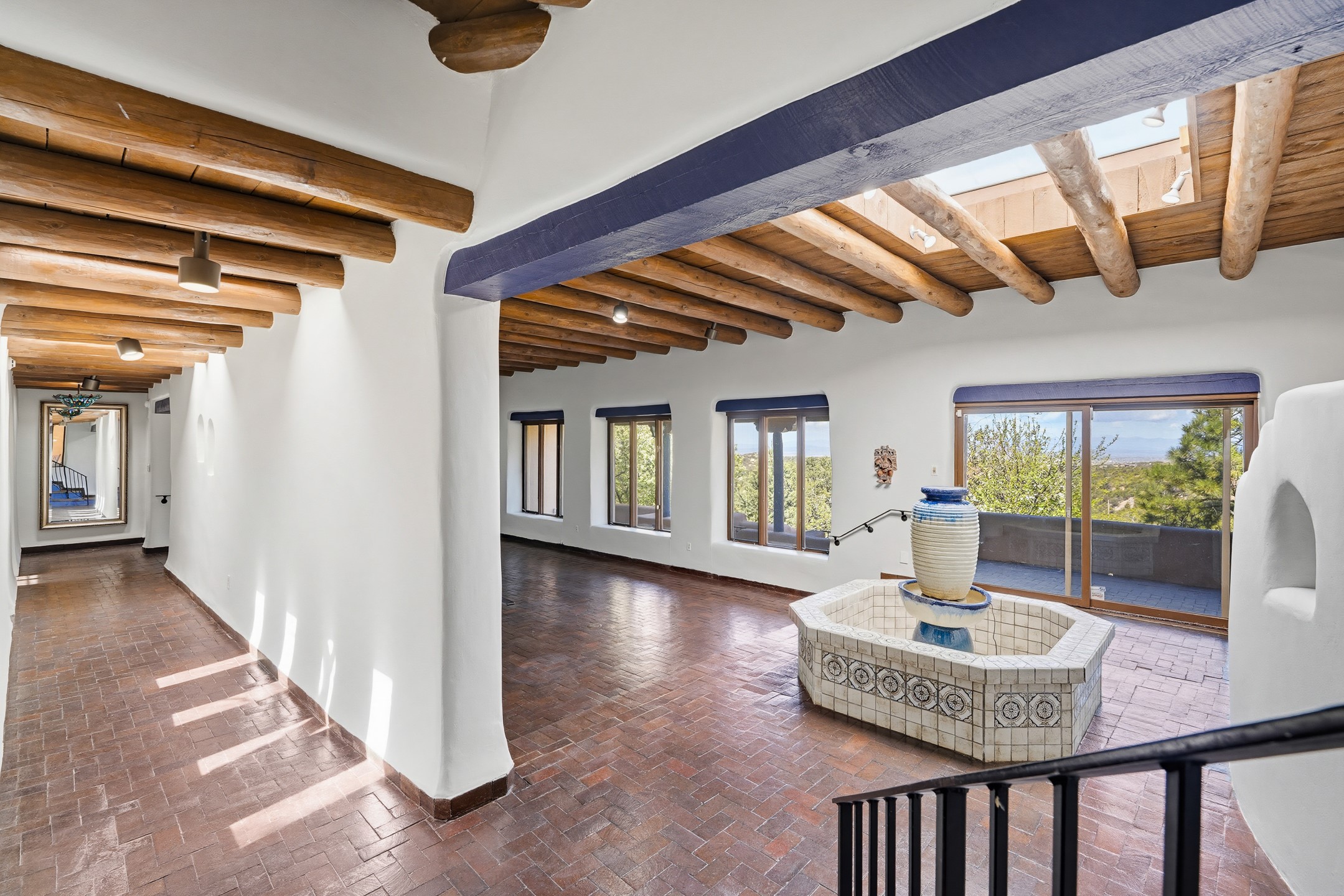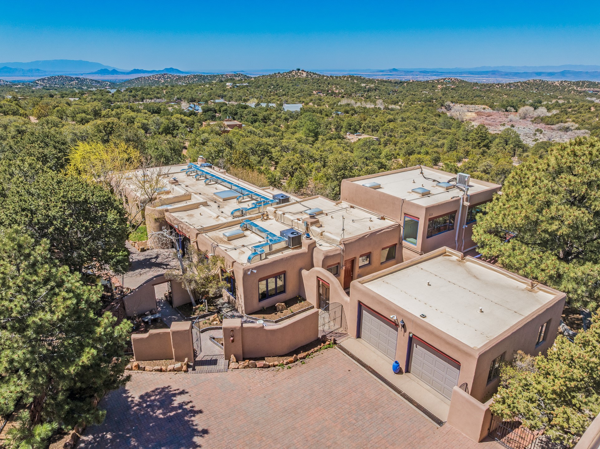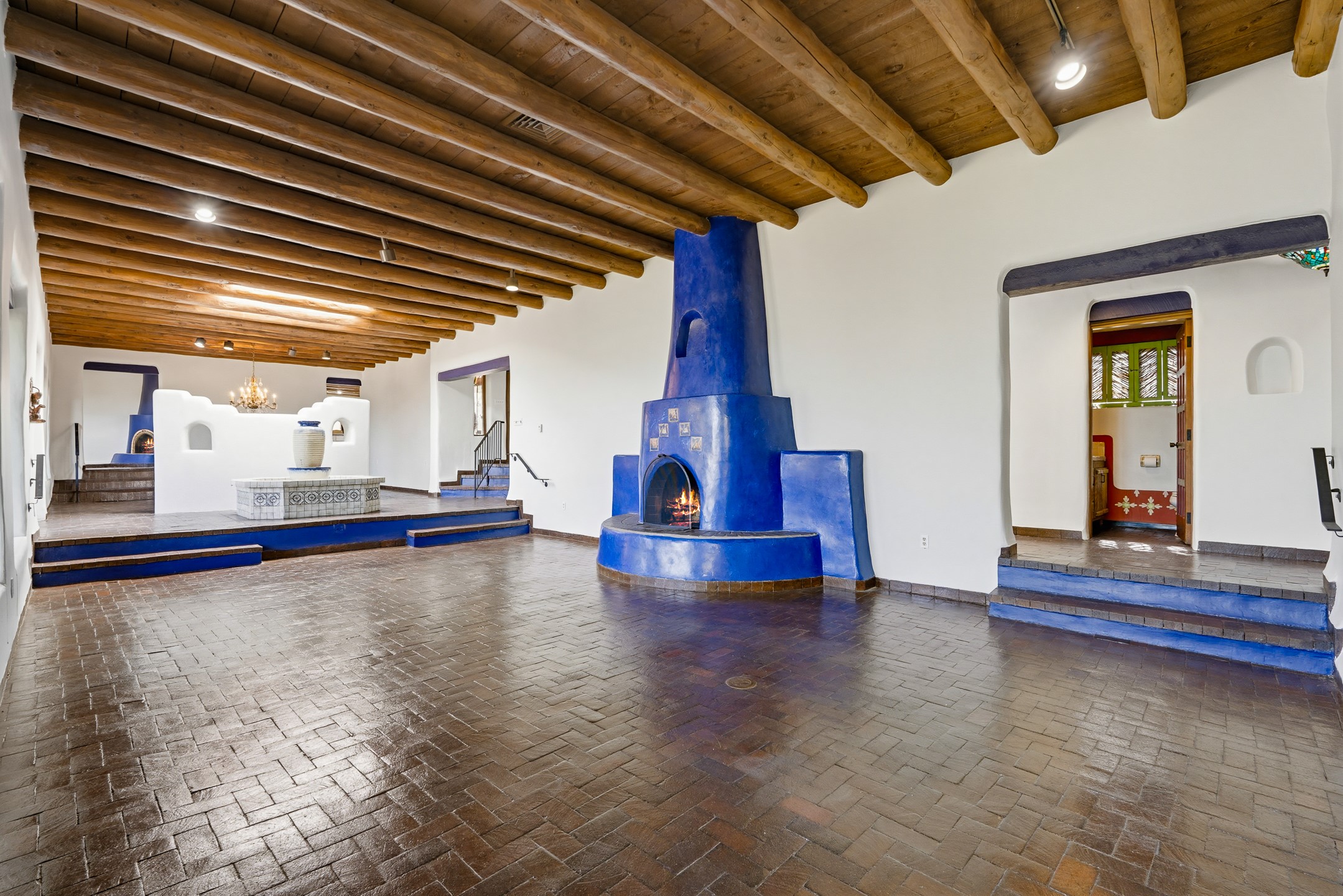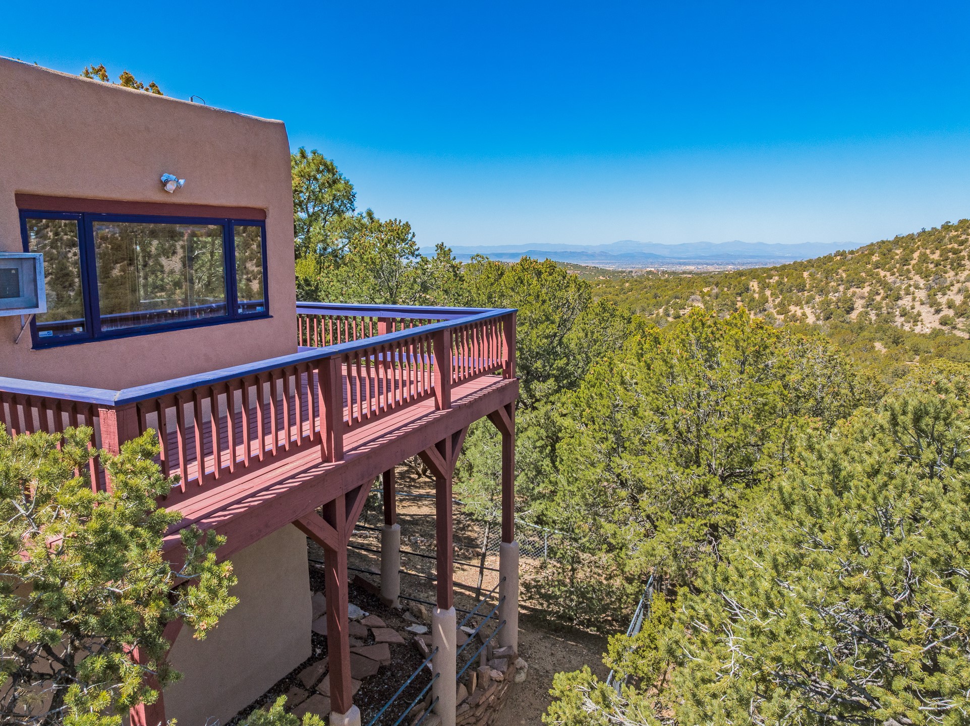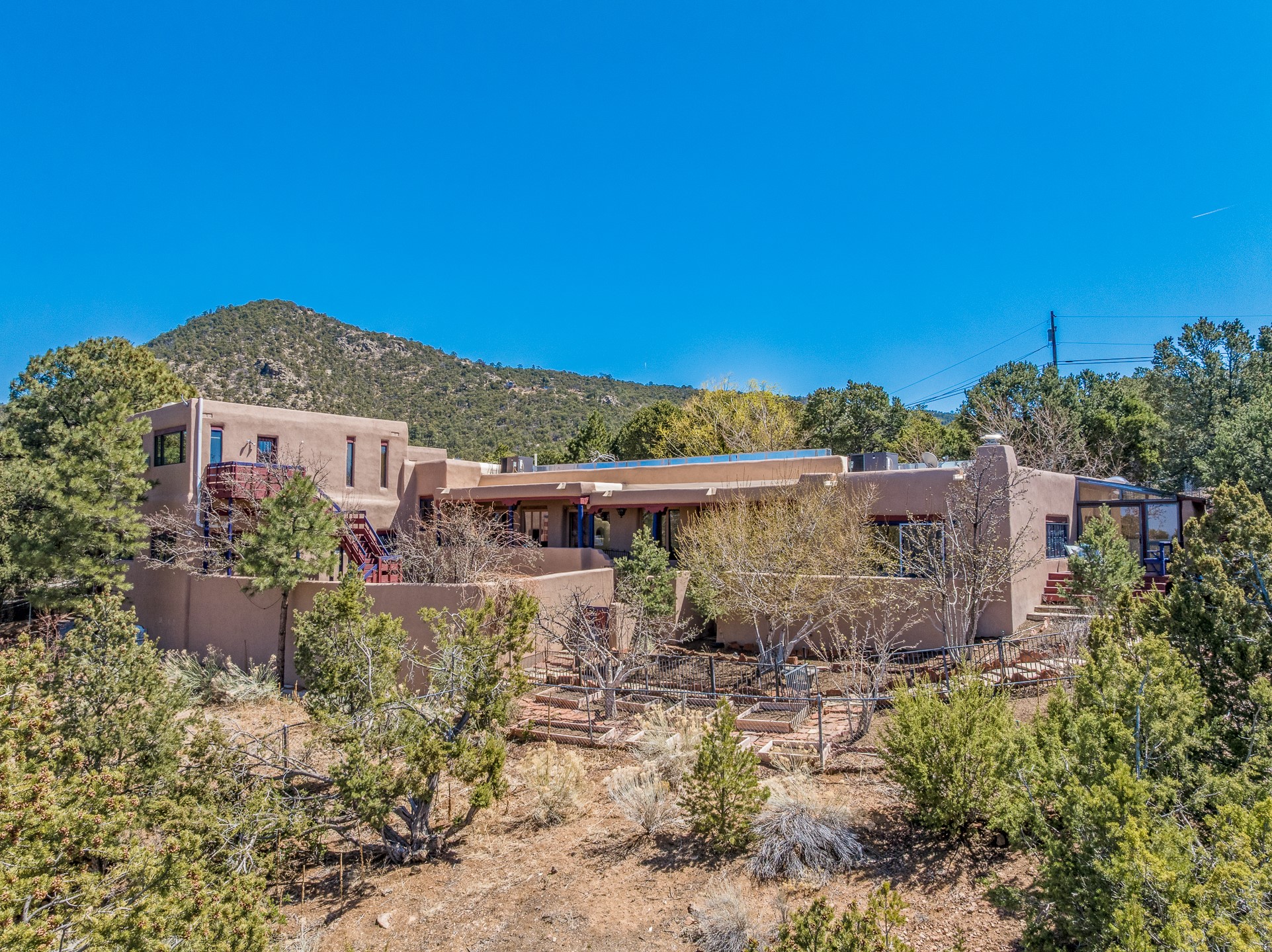 Your traditional Santa Fe Casa awaits! Nestled just minutes off of the historic Old Santa Fe Trail and only 15 minutes from the heart of downtown Santa Fe, this adobe estate captures the essence of classic Southwestern elegance and modern comfort. Set on 5-acres, the property offers total privacy and breathtaking panoramic vistas of the Jemez Mountains and Santa Fe city lights. The main residence features a grand living and entertaining space adorned with multiple cozy kiva fireplaces, high viga accented ceilings, brick floors, iron work, colorful floral wall motifs, and traditional craftsmanship. Many recent practical improvements to the roof, exterior, and systems have also been made. Four spacious bedrooms make this a comfortable retreat for full-time living or hosting of guests. Not to be missed is the spacious, upstairs artist's retreat with panoramic views - the perfect place to paint, work, write, and create! The primary suite is private and appointed with a large ensuite bathroom, access to the enclosed in-ground spa, patio access, and sweeping sightlines across the high desert landscape. The grounds are equally serene with water features and fountains, multiple garden beds, and private patio enclaves. A long western-facing, covered portal, spanning the length of the main living room is the perfect outdoor extension to the main home's grand indoor living. A detached 1BD-1BA guest house, with its own garage, offers privacy and comfort for visitors, family or invites the potential for rental generating income. Whether you're soaking in the golden hour light from one of the many outdoor living spaces or relaxing by one of the property's four fireplaces, this one-of-a-kind property offers an unparalleled canvas equipped with undeniable tranquility, vistas and convenience to Santa Fe's exquisite destinations.