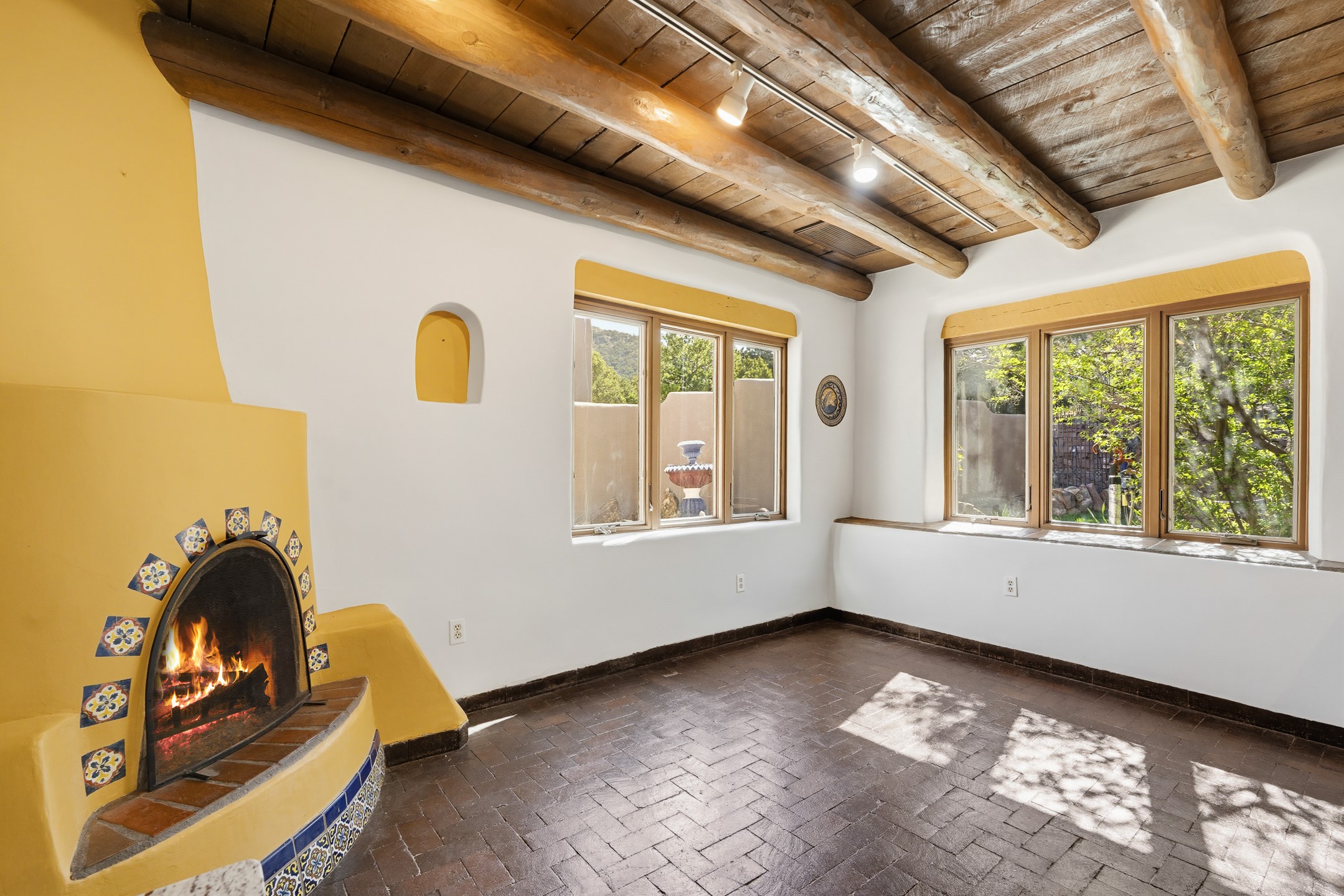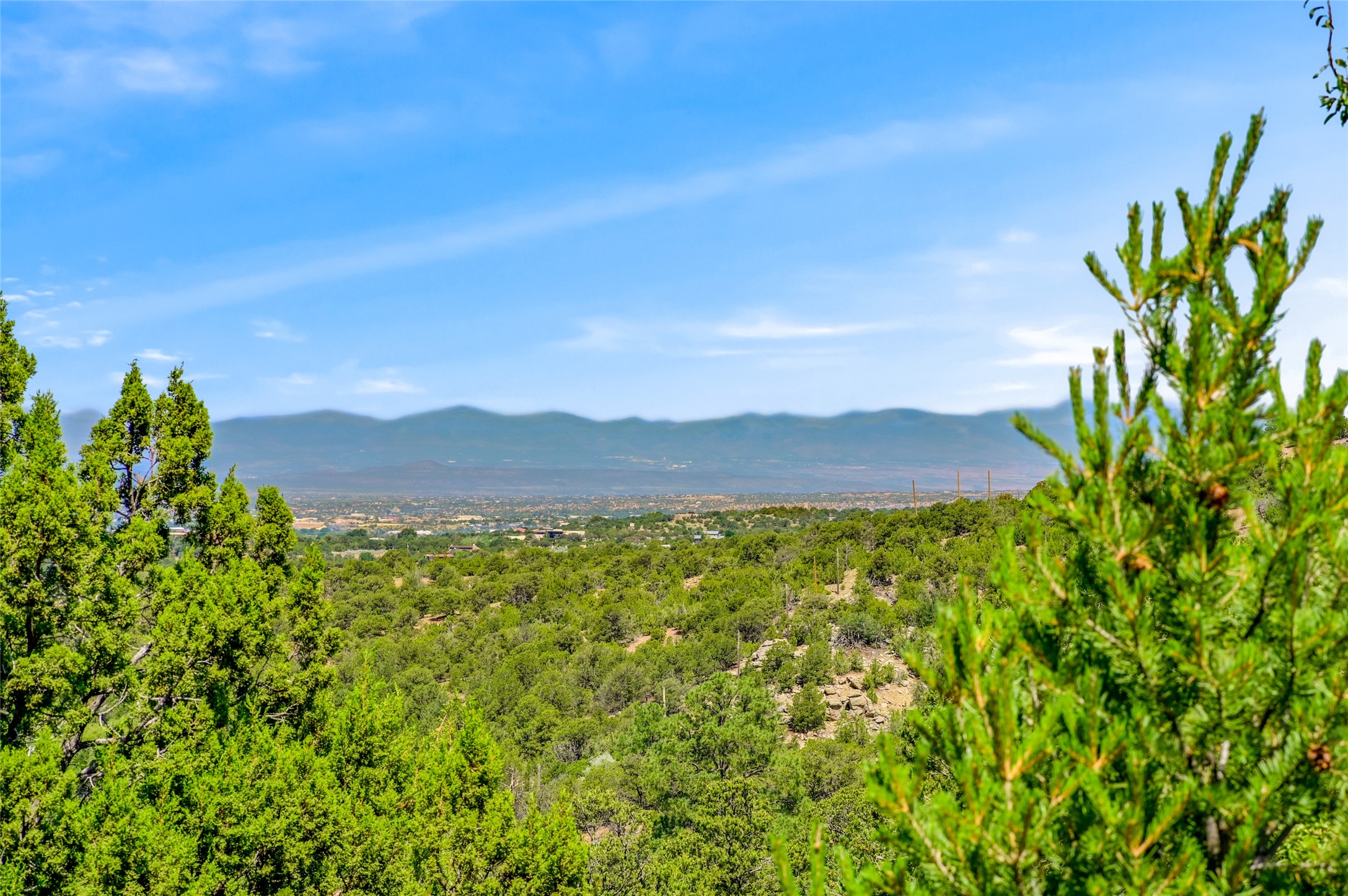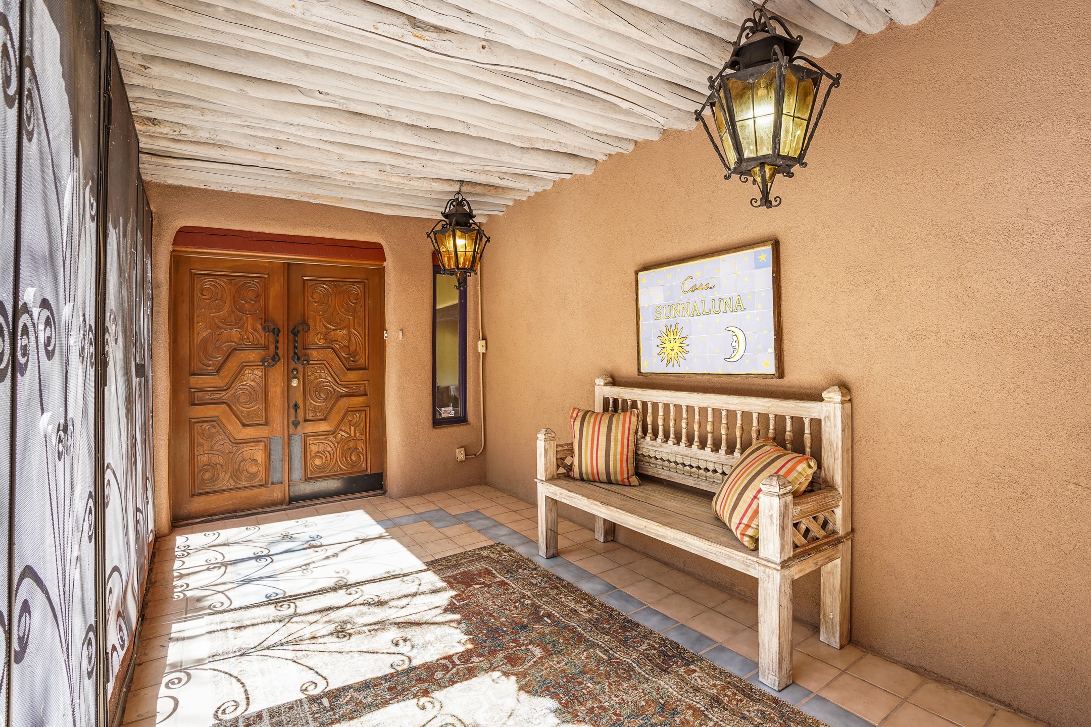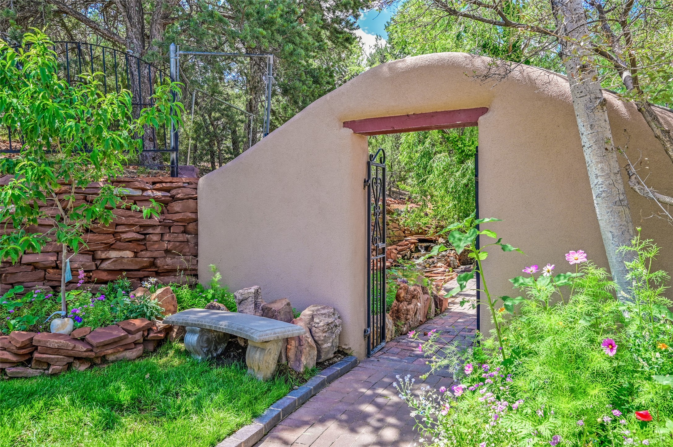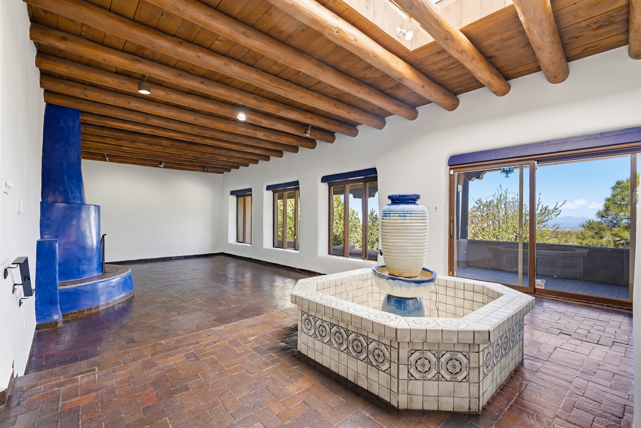 Your traditional Santa Fe Casa awaits! Nestled just minutes off of the historic Old Santa Fe Trail and only 15 minutes from the heart of downtown Santa Fe, this adobe estate captures the essence of classic Southwestern elegance and modern comfort. Set on 5-acres, the property offers total privacy and breathtaking panoramic vistas of the Jemez Mountains and Santa Fe city lights. The main residence features a grand living and entertaining space adorned with multiple cozy kiva fireplaces, high viga accented ceilings, brick floors, iron work, colorful floral wall motifs, and traditional craftsmanship. Many recent practical improvements to the roof, exterior, and systems have also been made. Four spacious bedrooms make this a comfortable retreat for full-time living or hosting of guests. Not to be missed is the spacious, upstairs artist's retreat with panoramic views - the perfect place to paint, work, write, and create! The primary suite is private and appointed with a large ensuite bathroom, access to the enclosed in-ground spa, patio access, and sweeping sightlines across the high desert landscape. The grounds are equally serene with water features and fountains, multiple garden beds, and private patio enclaves. A long western-facing, covered portal, spanning the length of the main living room is the perfect outdoor extension to the main home's grand indoor living. A detached 1BD-1BA guest house, with its own garage, offers privacy and comfort for visitors, family or invites the potential for rental generating income. Whether you're soaking in the golden hour light from one of the many outdoor living spaces or relaxing by one of the property's four fireplaces, this one-of-a-kind property offers an unparalleled canvas equipped with undeniable tranquility, vistas and convenience to Santa Fe's exquisite destinations.
