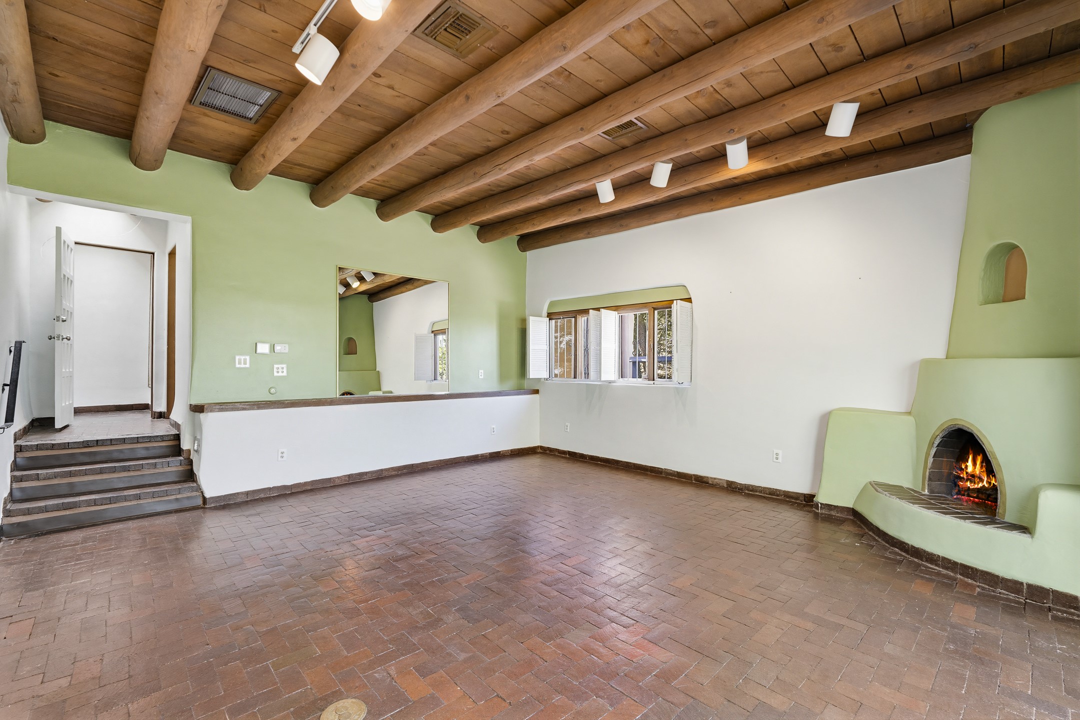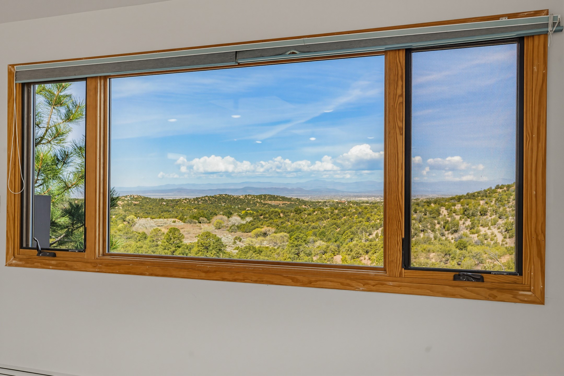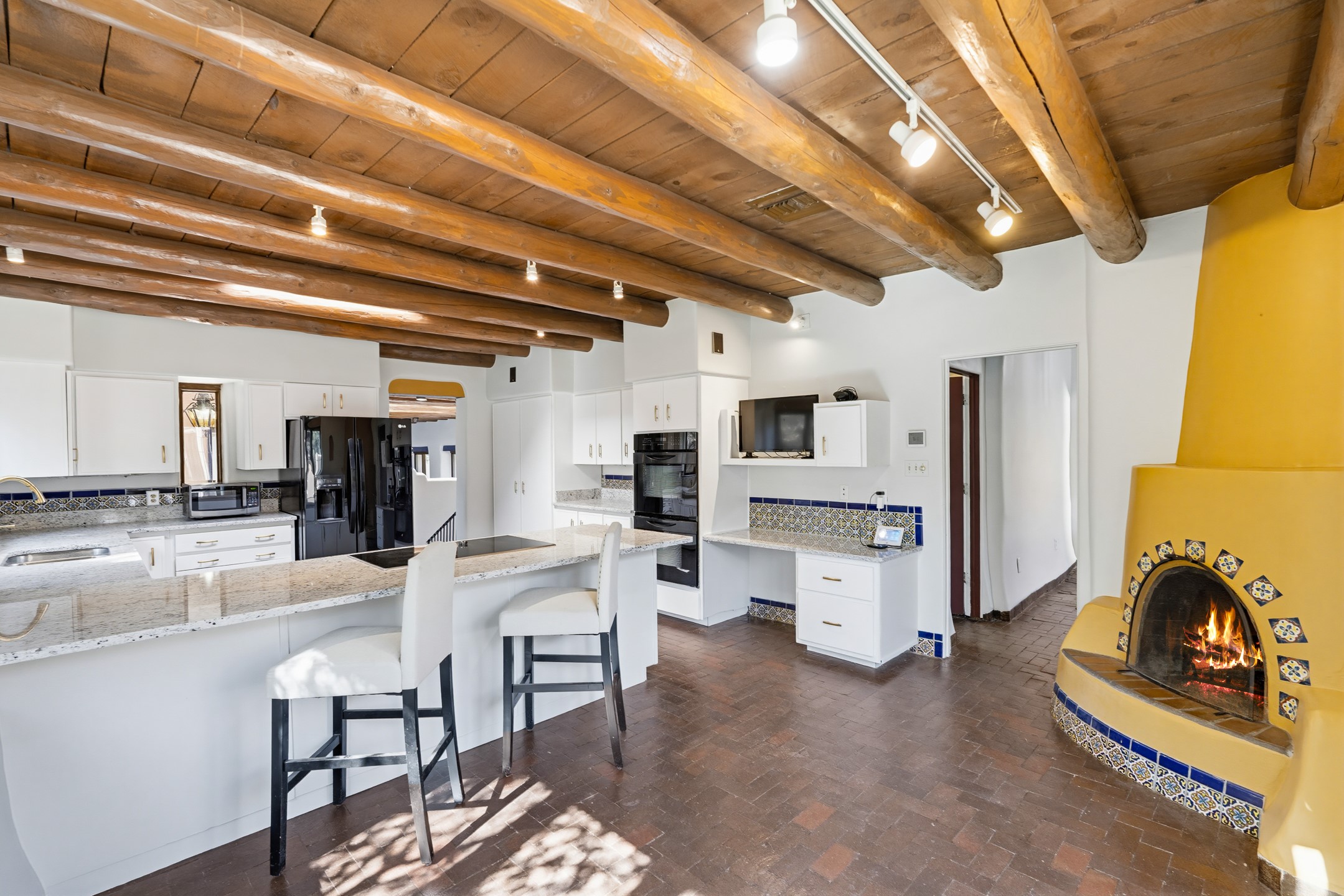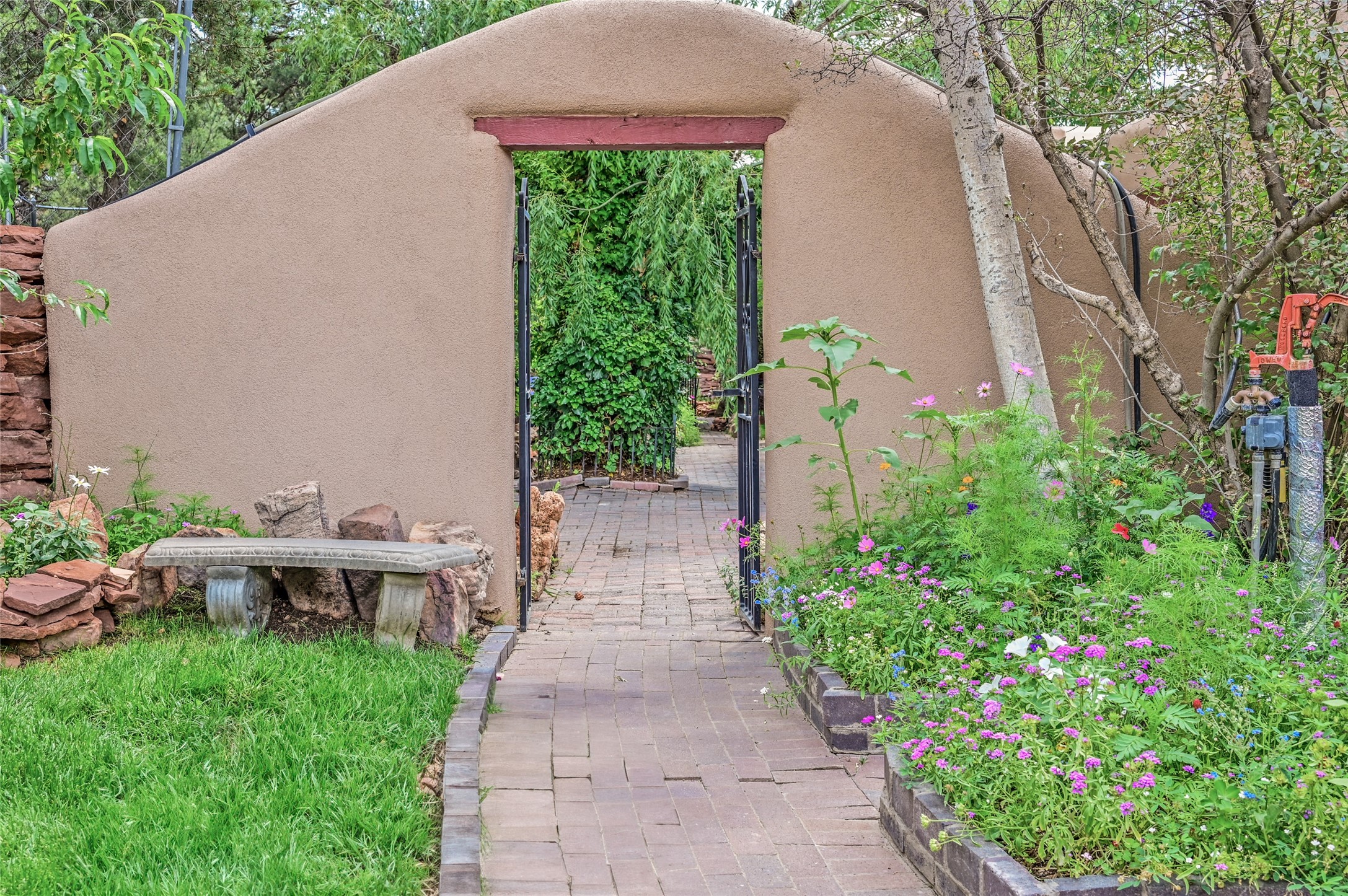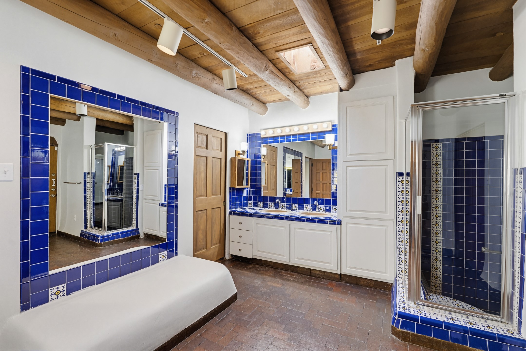 Your traditional Santa Fe Casa awaits! Nestled just minutes off of the historic Old Santa Fe Trail and only 15 minutes from the heart of downtown Santa Fe, this adobe estate captures the essence of classic Southwestern elegance and modern comfort. Set on 5-acres, the property offers total privacy and breathtaking panoramic vistas of the Jemez Mountains and Santa Fe city lights. The main residence features a grand living and entertaining space adorned with multiple cozy kiva fireplaces, high viga accented ceilings, brick floors, iron work, colorful floral wall motifs, and traditional craftsmanship. Many recent practical improvements to the roof, exterior, and systems have also been made. Four spacious bedrooms make this a comfortable retreat for full-time living or hosting of guests. Not to be missed is the spacious, upstairs artist's retreat with panoramic views - the perfect place to paint, work, write, and create! The primary suite is private and appointed with a large ensuite bathroom, access to the enclosed in-ground spa, patio access, and sweeping sightlines across the high desert landscape. The grounds are equally serene with water features and fountains, multiple garden beds, and private patio enclaves. A long western-facing, covered portal, spanning the length of the main living room is the perfect outdoor extension to the main home's grand indoor living. A detached 1BD-1BA guest house, with its own garage, offers privacy and comfort for visitors, family or invites the potential for rental generating income. Whether you're soaking in the golden hour light from one of the many outdoor living spaces or relaxing by one of the property's four fireplaces, this one-of-a-kind property offers an unparalleled canvas equipped with undeniable tranquility, vistas and convenience to Santa Fe's exquisite destinations.