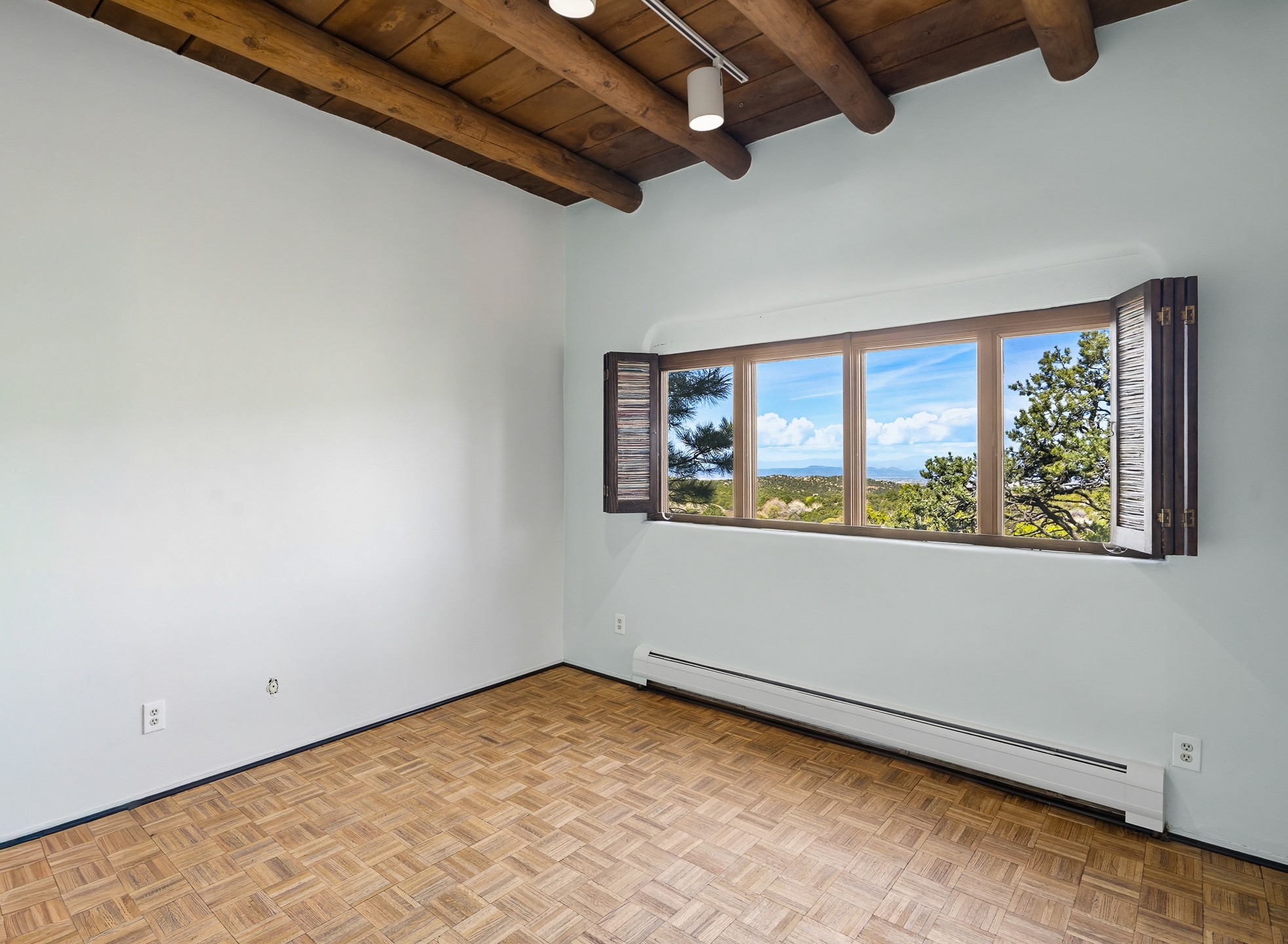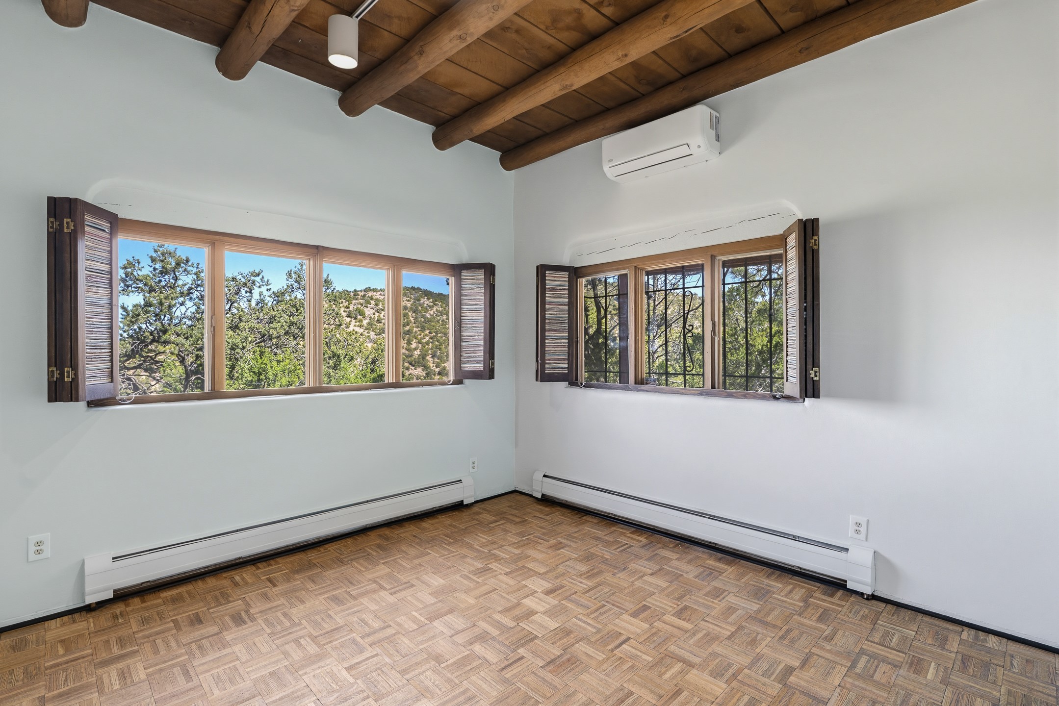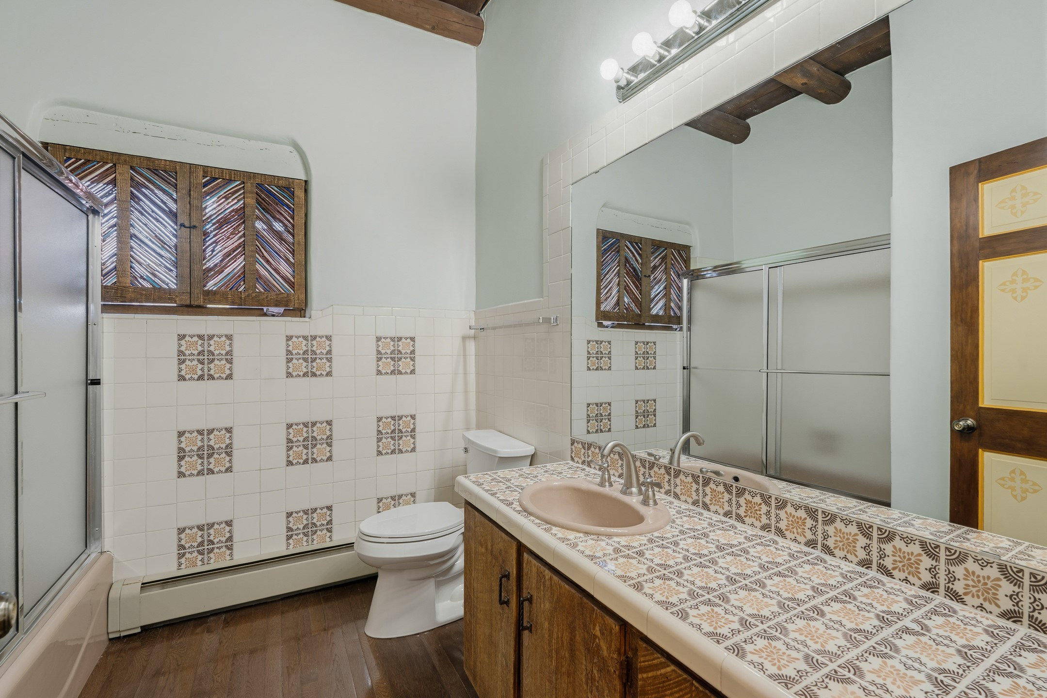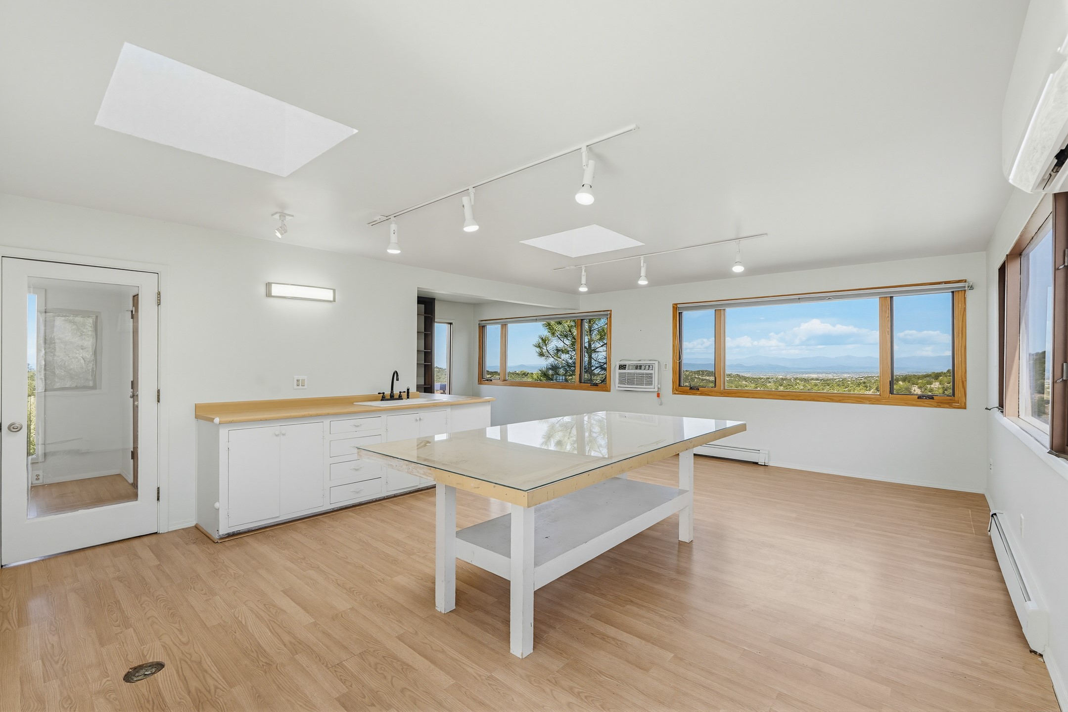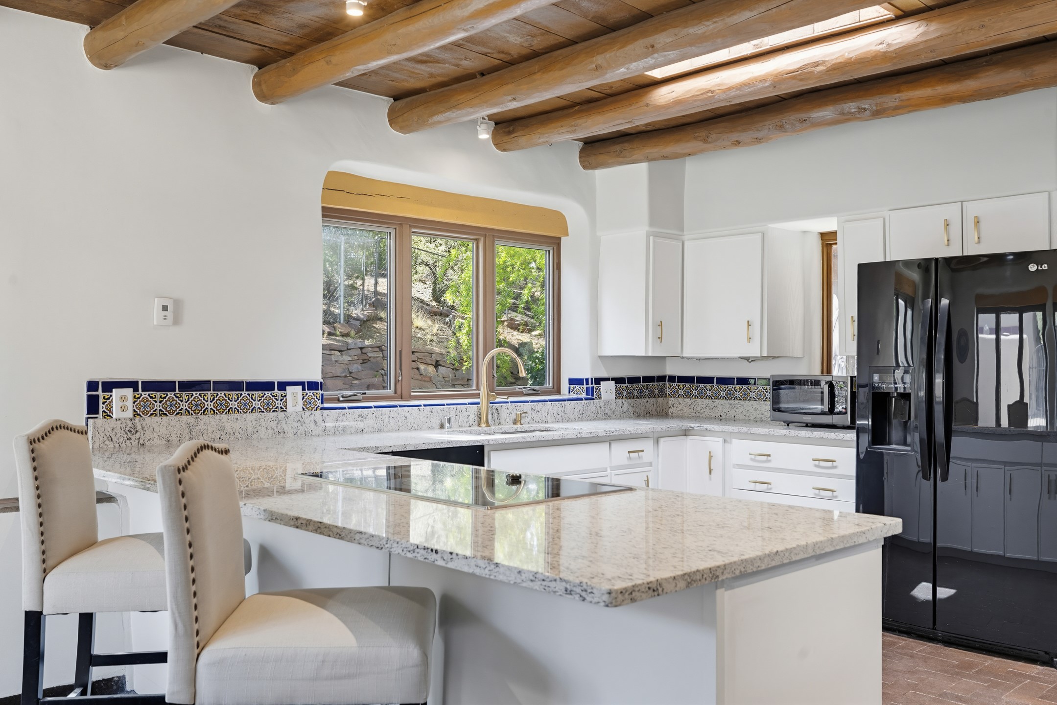 Your traditional Santa Fe Casa awaits! Nestled just minutes off of the historic Old Santa Fe Trail and only 15 minutes from the heart of downtown Santa Fe, this adobe estate captures the essence of classic Southwestern elegance and modern comfort. Set on 5-acres, the property offers total privacy and breathtaking panoramic vistas of the Jemez Mountains and Santa Fe city lights. The main residence features a grand living and entertaining space adorned with multiple cozy kiva fireplaces, high viga accented ceilings, brick floors, iron work, colorful floral wall motifs, and traditional craftsmanship. Many recent practical improvements to the roof, exterior, and systems have also been made. Four spacious bedrooms make this a comfortable retreat for full-time living or hosting of guests. Not to be missed is the spacious, upstairs artist's retreat with panoramic views - the perfect place to paint, work, write, and create! The primary suite is private and appointed with a large ensuite bathroom, access to the enclosed in-ground spa, patio access, and sweeping sightlines across the high desert landscape. The grounds are equally serene with water features and fountains, multiple garden beds, and private patio enclaves. A long western-facing, covered portal, spanning the length of the main living room is the perfect outdoor extension to the main home's grand indoor living. A detached 1BD-1BA guest house, with its own garage, offers privacy and comfort for visitors, family or invites the potential for rental generating income. Whether you're soaking in the golden hour light from one of the many outdoor living spaces or relaxing by one of the property's four fireplaces, this one-of-a-kind property offers an unparalleled canvas equipped with undeniable tranquility, vistas and convenience to Santa Fe's exquisite destinations.