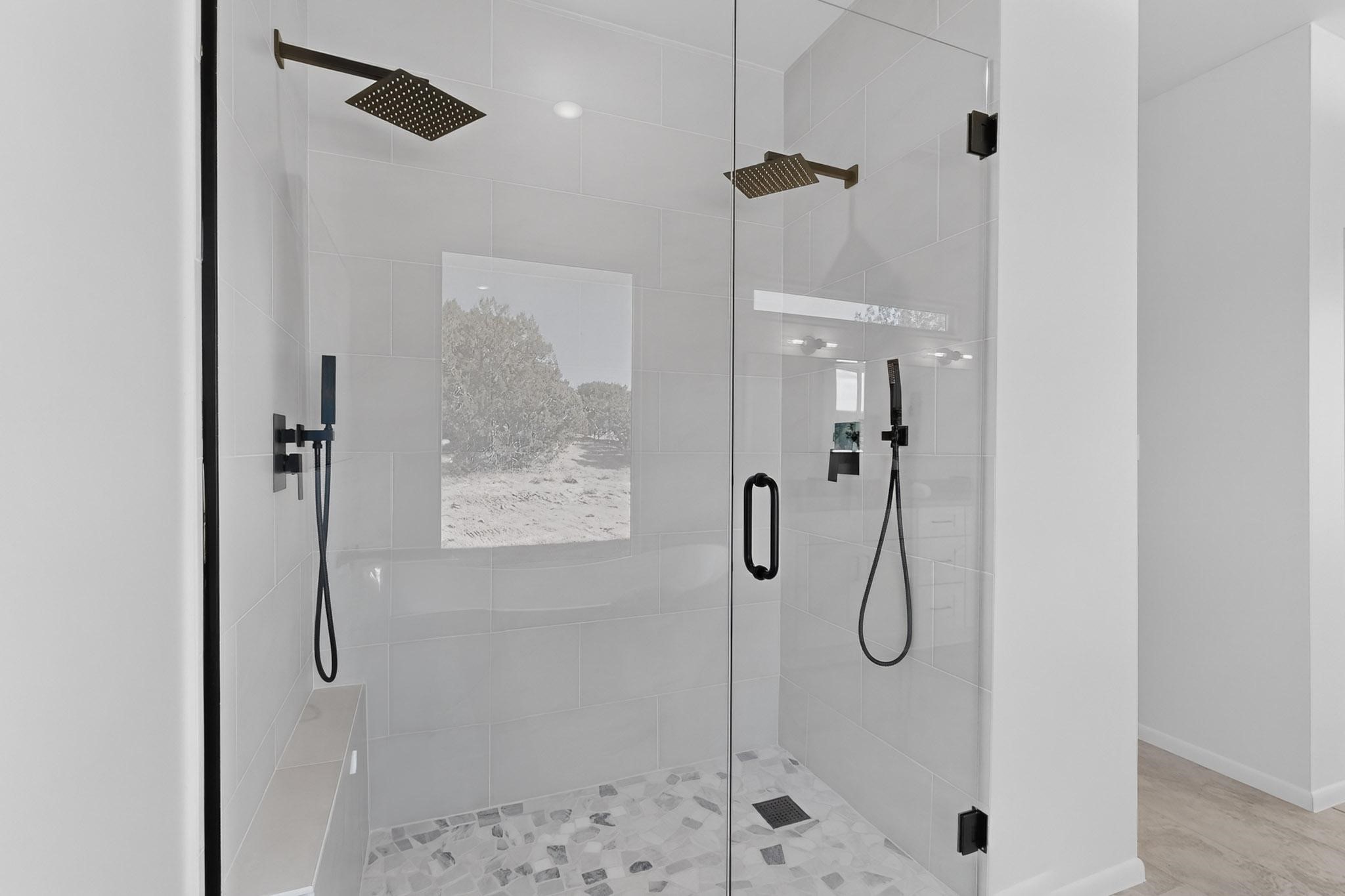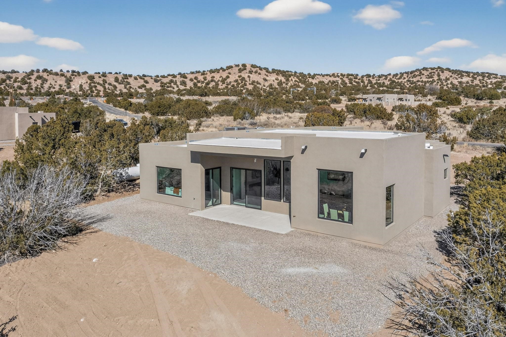Welcome home! This stunning newly constructed contemporary-modern style home is perfectly positioned on 3.10 acres with stunning views of the Sandia Mountains and the Galisteo Basin. This 2,000 sq ft home has been designed to maximize the natural light and space, featuring high ceilings with contemporary style vigas, an open floor plan great for entertaining or keeping an eye on kids; with walls of windows taking full advantage of the expansive views!The modern kitchen includes a beautiful large granite island, large walk-in pantry, that flows beautifully into the living and dining areas, very functional and ideal for entertaining. Oversized windows and sliding glass doors invite abundant natural light and creates a seamless connection between indoor comfort and outdoor enjoyment; meanwhile framing the surrounding landscape like living artwork. The primary suite offers a peaceful escape with a luxurious spa inspired stand-alone bathtub, dual vanities, walk-in-shower with dual rain heads, and a spacious walk-in closet. Two additional bedrooms and a second full bath provide comfortable accommodations for family or guests.Enjoy the freedom of no HOA, space for horses, and the tranquility of rural living - while remaining just 20 minutes from downtown Santa Fe, close to nearby restaurants, shopping and outdoor activities. Brand new, beautifully designed, and ready to be lived in!