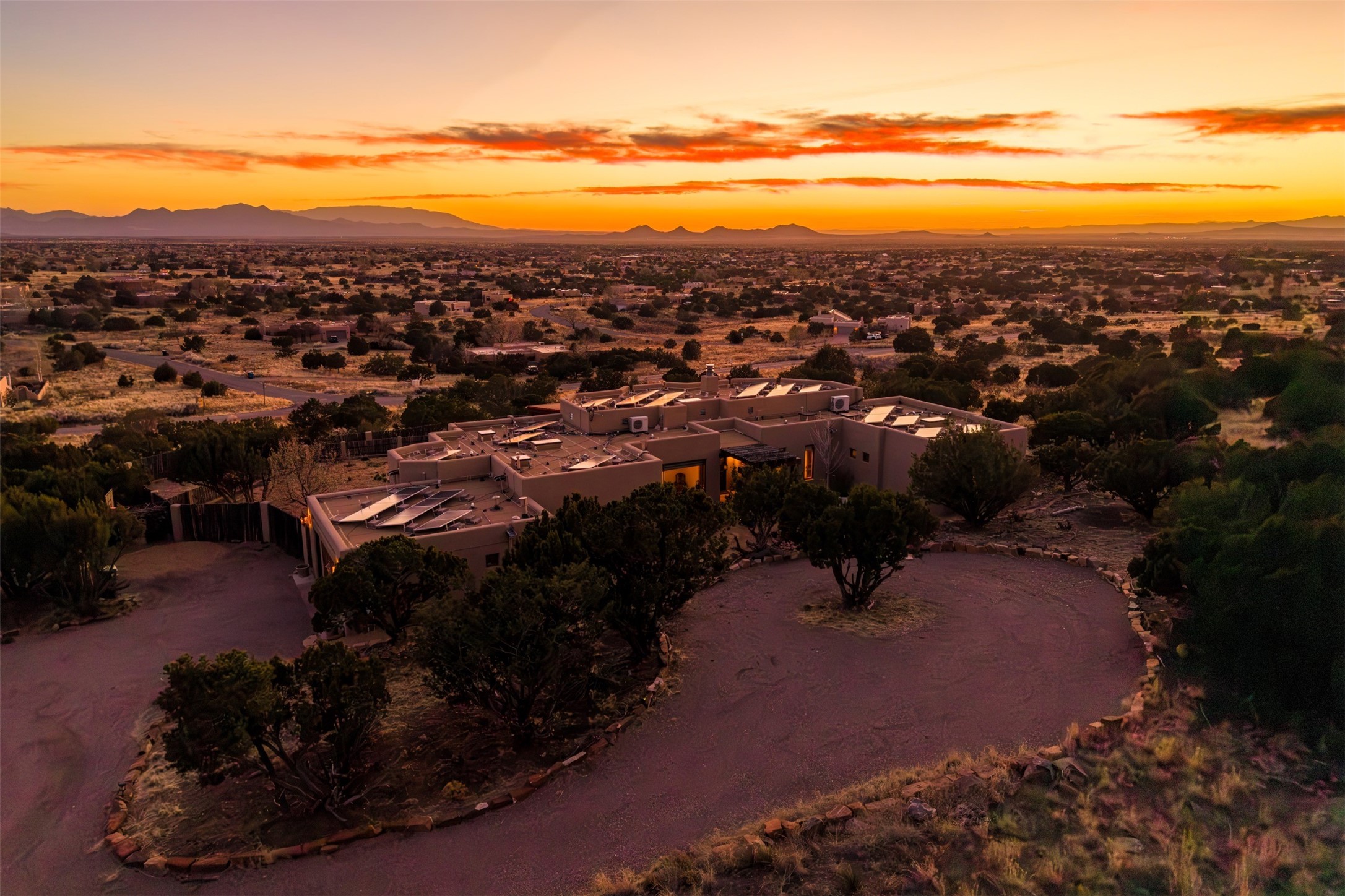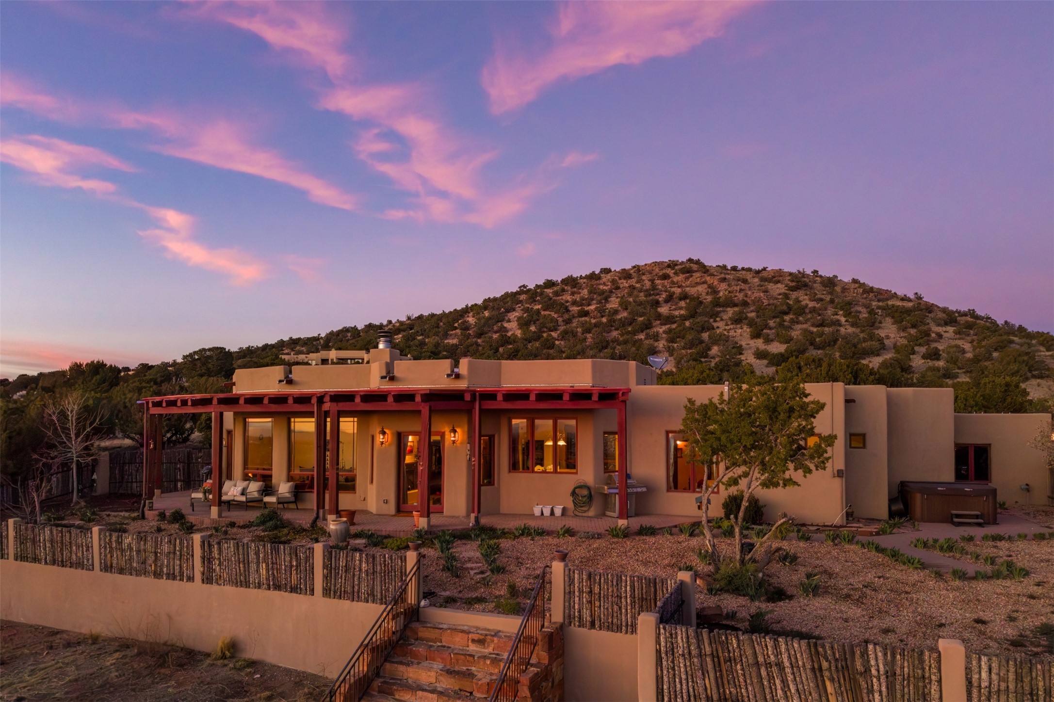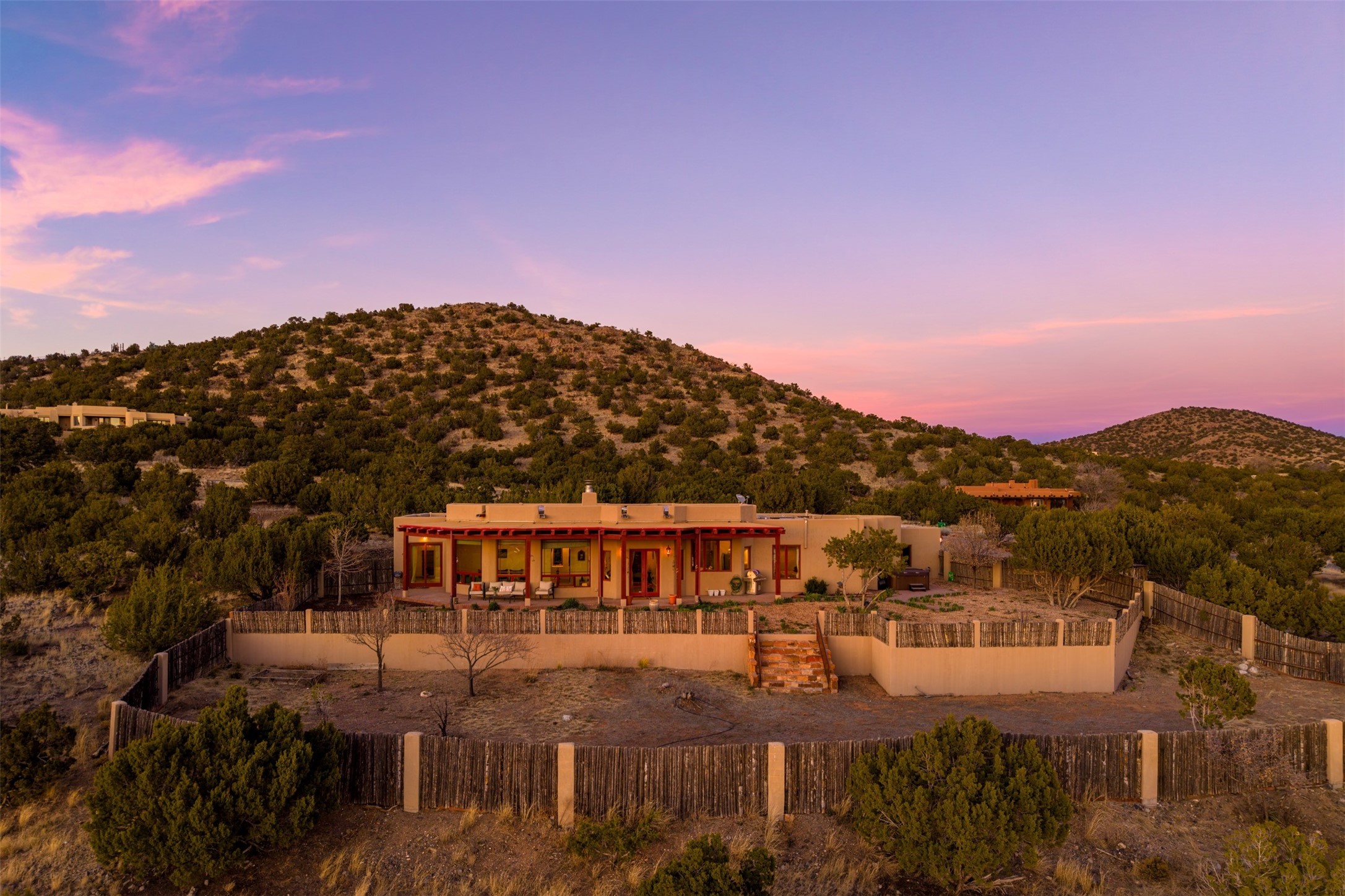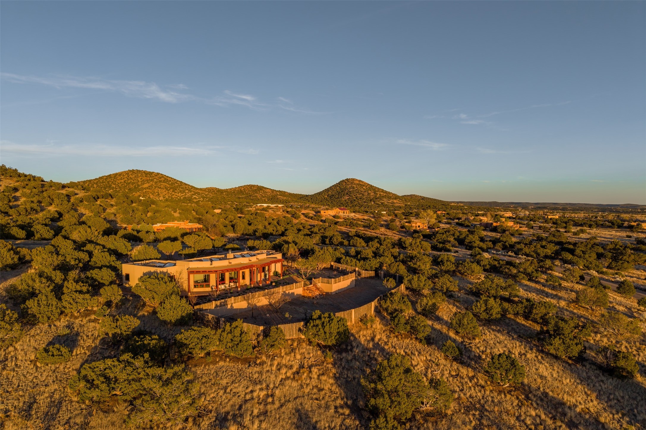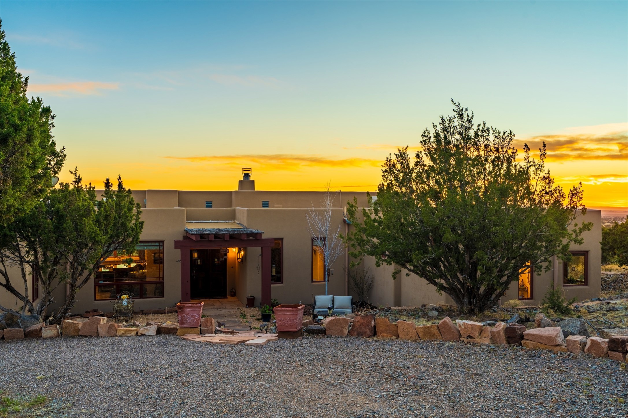 Immaculate and soulful, this single-level residence is beautifully finished with a timeless old-world aesthetic, offering a refined interpretation of Santa Fe living. Featuring 3 bedrooms and 3 baths (one full, one three-quarter, and one half), along with two versatile flex spaces--one is +/- 150 sq. ft, and the other +/- 85 sq. ft. The home is set on a private, expansive 3.93-acre lot and is thoughtfully designed for both comfort and privacy, with a well-conceived floor plan that separates the guest suites and the primary suite into distinct wings. Tucked away on a quiet street in the coveted Los Griegos subdivision--just 20 minutes from downtown Santa Fe--this 2007 Archetypes Homescapes residence is perfectly sited to capture sweeping, unobstructed views. Inside, authentic craftsmanship and rich character define the interiors, with hand-troweled plaster walls, warm tile flooring, and wood-beamed ceilings throughout. Mesquite Mexican doors and custom cabinetry add depth and artistry. The open-concept living space is anchored by a dramatic fireplace, creating an inviting yet sophisticated focal point. The kitchen is both functional and elegant, featuring granite countertops, stainless steel appliances, and a wine refrigerator. The primary suite offers a serene, private retreat with a spacious walk-in closet and a spa-like bath complete with a deep soaking tub. Modern comforts are seamlessly integrated, including radiant floor heating and mini-split cooling systems for year-round climate control. Sustainability is enhanced by a 24-panel photovoltaic solar array and energy-efficient Rastra construction. Outdoors, an expansive wraparound rear portal invites relaxed living and unforgettable sunset views across the surrounding landscape. The fully coyote-fenced backyard provides both privacy and security, completing this exceptional offering that blends timeless elegance with the natural beauty of Northern New Mexico.