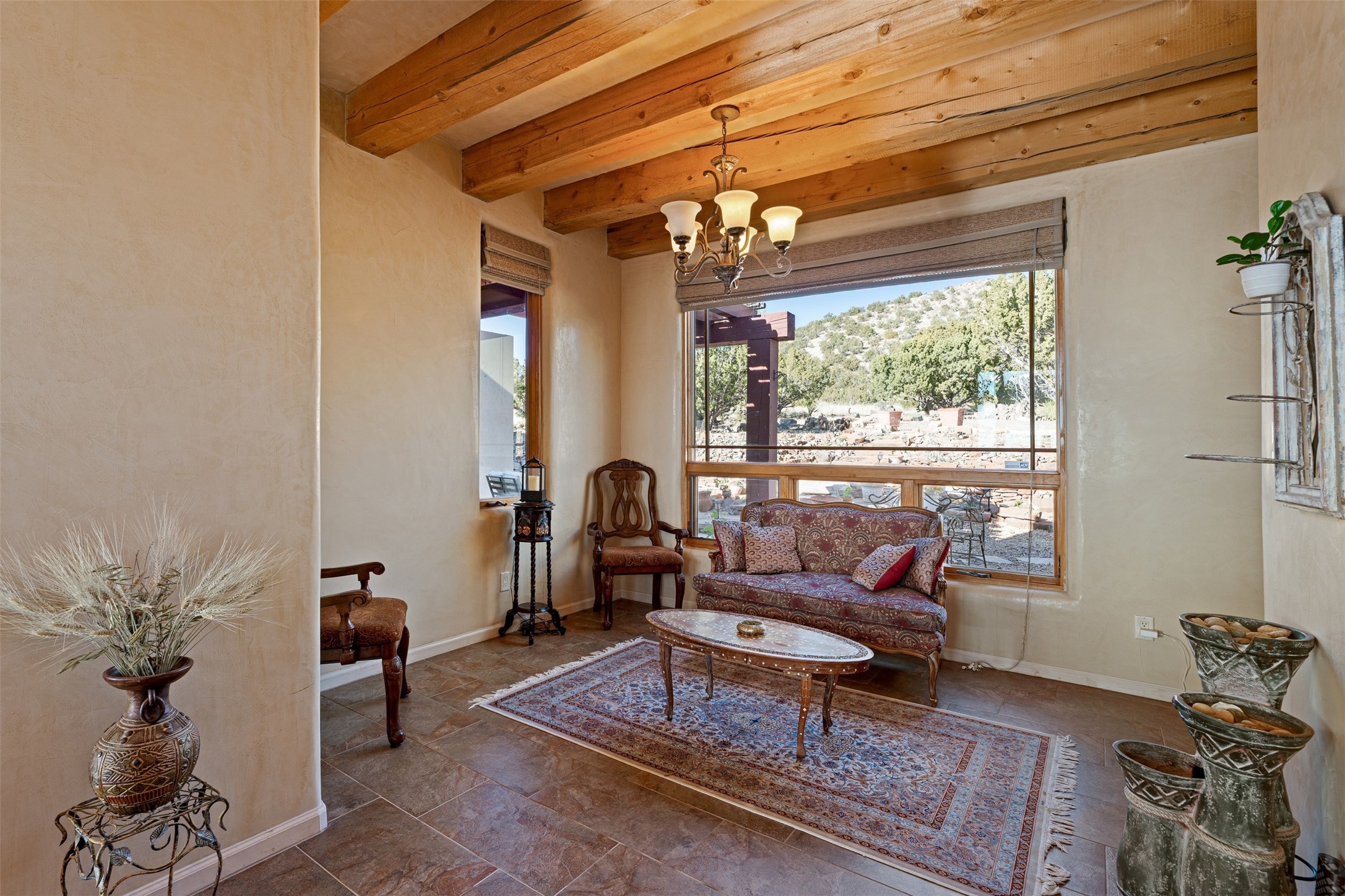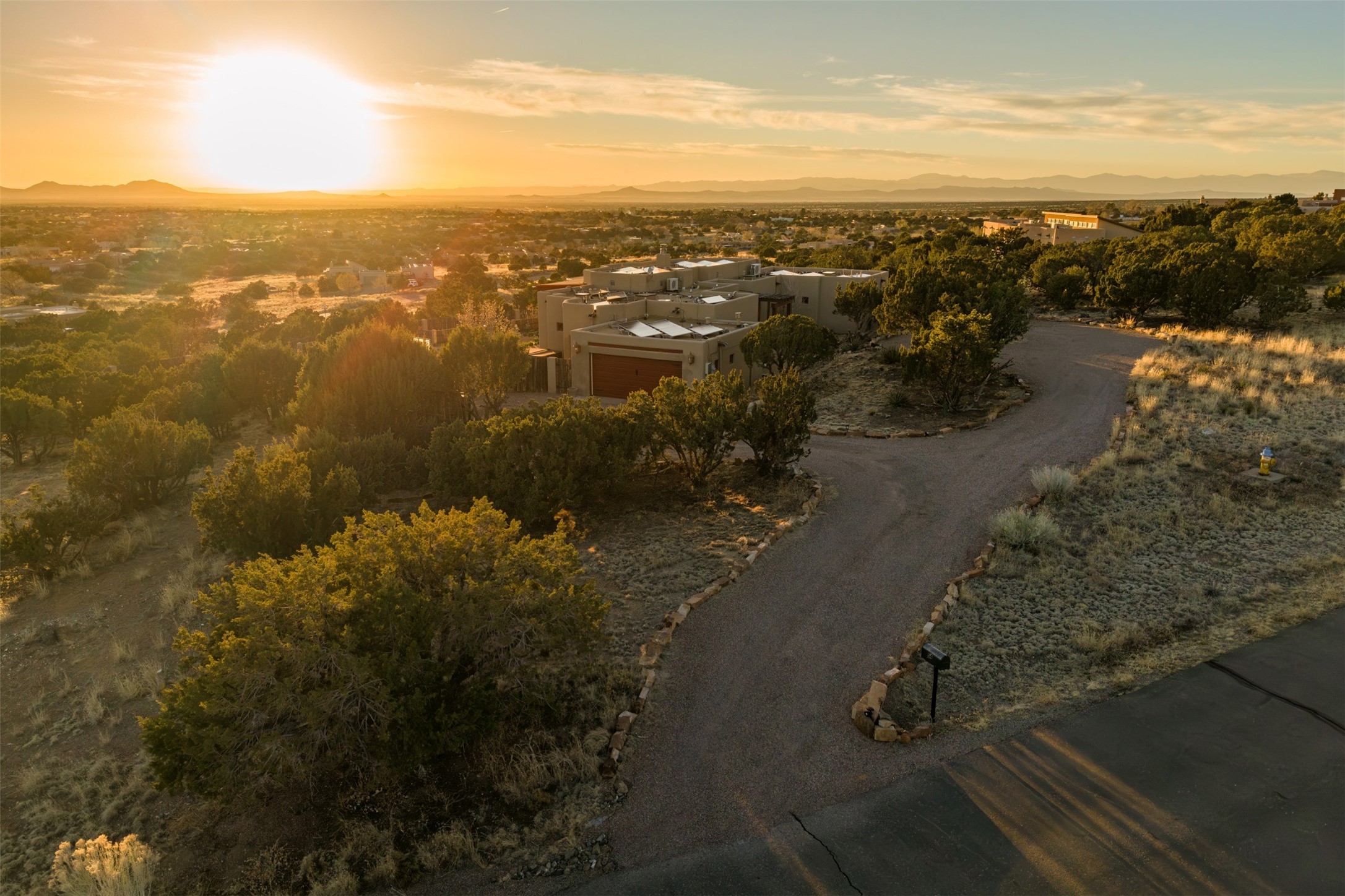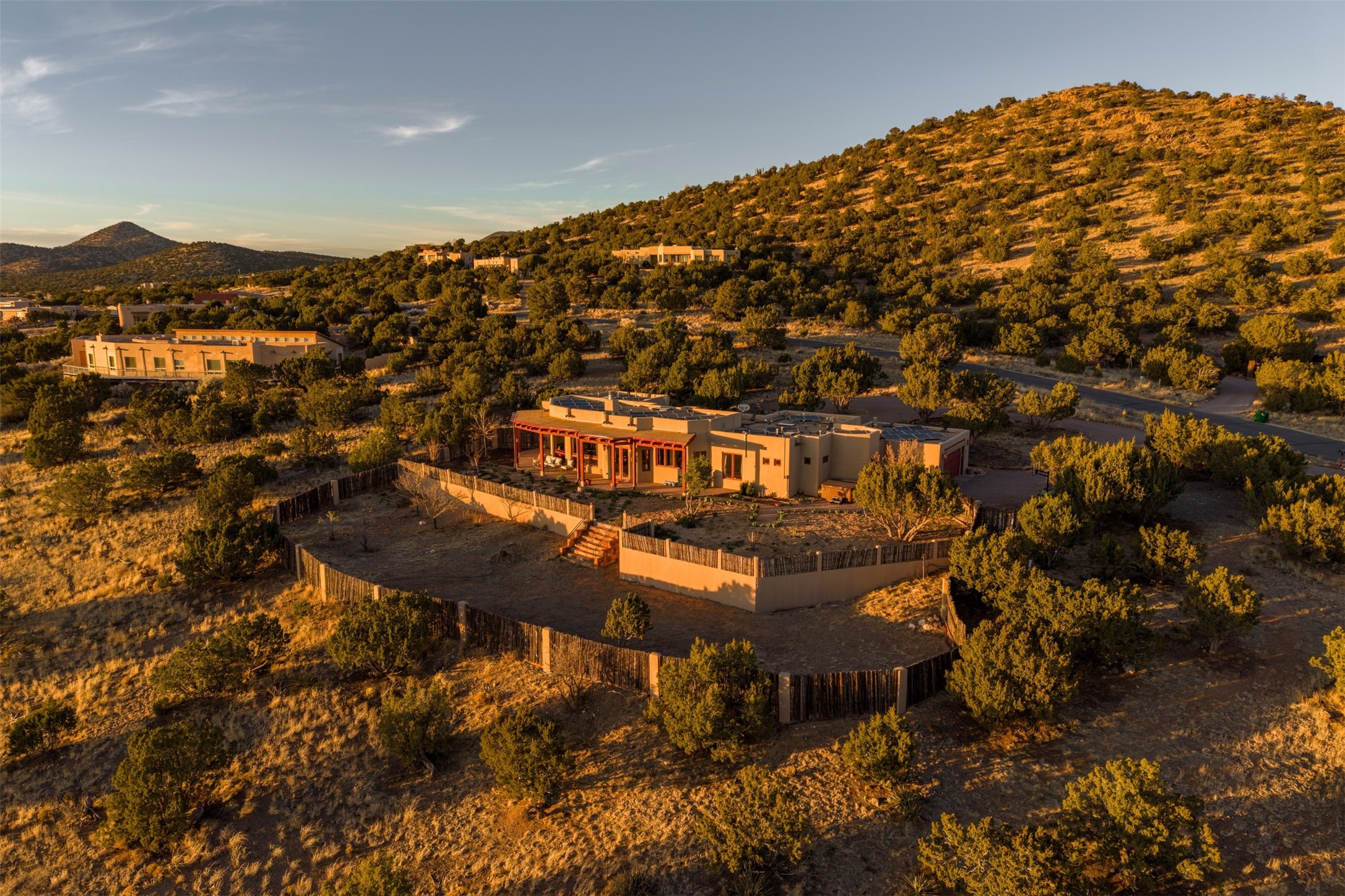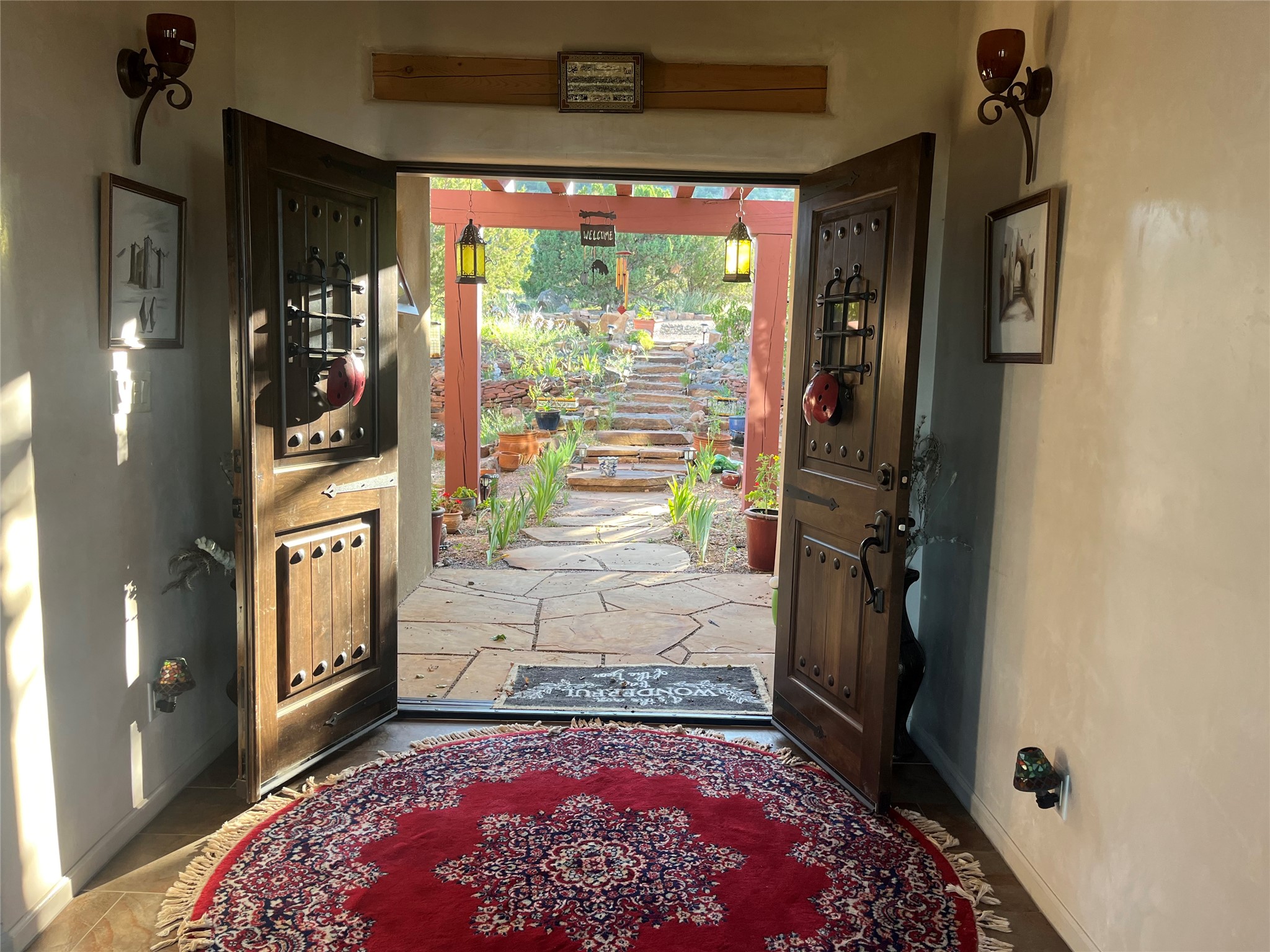 Immaculate and soulful, this single-level residence is beautifully finished with a timeless old-world aesthetic, offering a refined interpretation of Santa Fe living. Featuring 3 bedrooms and 3 baths (one full, one three-quarter, and one half), along with two versatile flex spaces--one is +/- 150 sq. ft, and the other +/- 85 sq. ft. The home is set on a private, expansive 3.93-acre lot and is thoughtfully designed for both comfort and privacy, with a well-conceived floor plan that separates the guest suites and the primary suite into distinct wings. Tucked away on a quiet street in the coveted Los Griegos subdivision--just 20 minutes from downtown Santa Fe--this 2007 Archetypes Homescapes residence is perfectly sited to capture sweeping, unobstructed views. Inside, authentic craftsmanship and rich character define the interiors, with hand-troweled plaster walls, warm tile flooring, and wood-beamed ceilings throughout. Mesquite Mexican doors and custom cabinetry add depth and artistry. The open-concept living space is anchored by a dramatic fireplace, creating an inviting yet sophisticated focal point. The kitchen is both functional and elegant, featuring granite countertops, stainless steel appliances, and a wine refrigerator. The primary suite offers a serene, private retreat with a spacious walk-in closet and a spa-like bath complete with a deep soaking tub. Modern comforts are seamlessly integrated, including radiant floor heating and mini-split cooling systems for year-round climate control. Sustainability is enhanced by a 24-panel photovoltaic solar array and energy-efficient Rastra construction. Outdoors, an expansive wraparound rear portal invites relaxed living and unforgettable sunset views across the surrounding landscape. The fully coyote-fenced backyard provides both privacy and security, completing this exceptional offering that blends timeless elegance with the natural beauty of Northern New Mexico.
