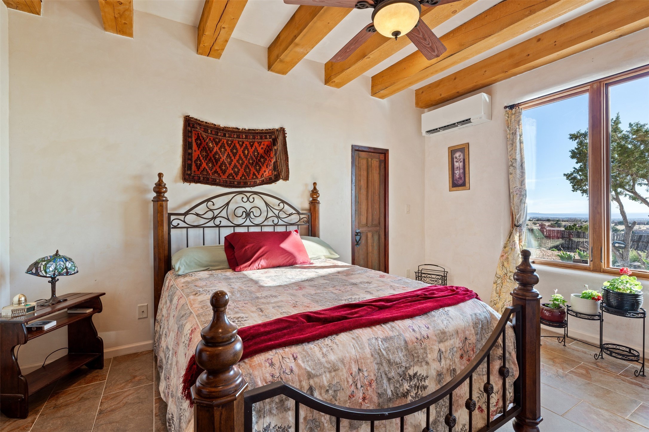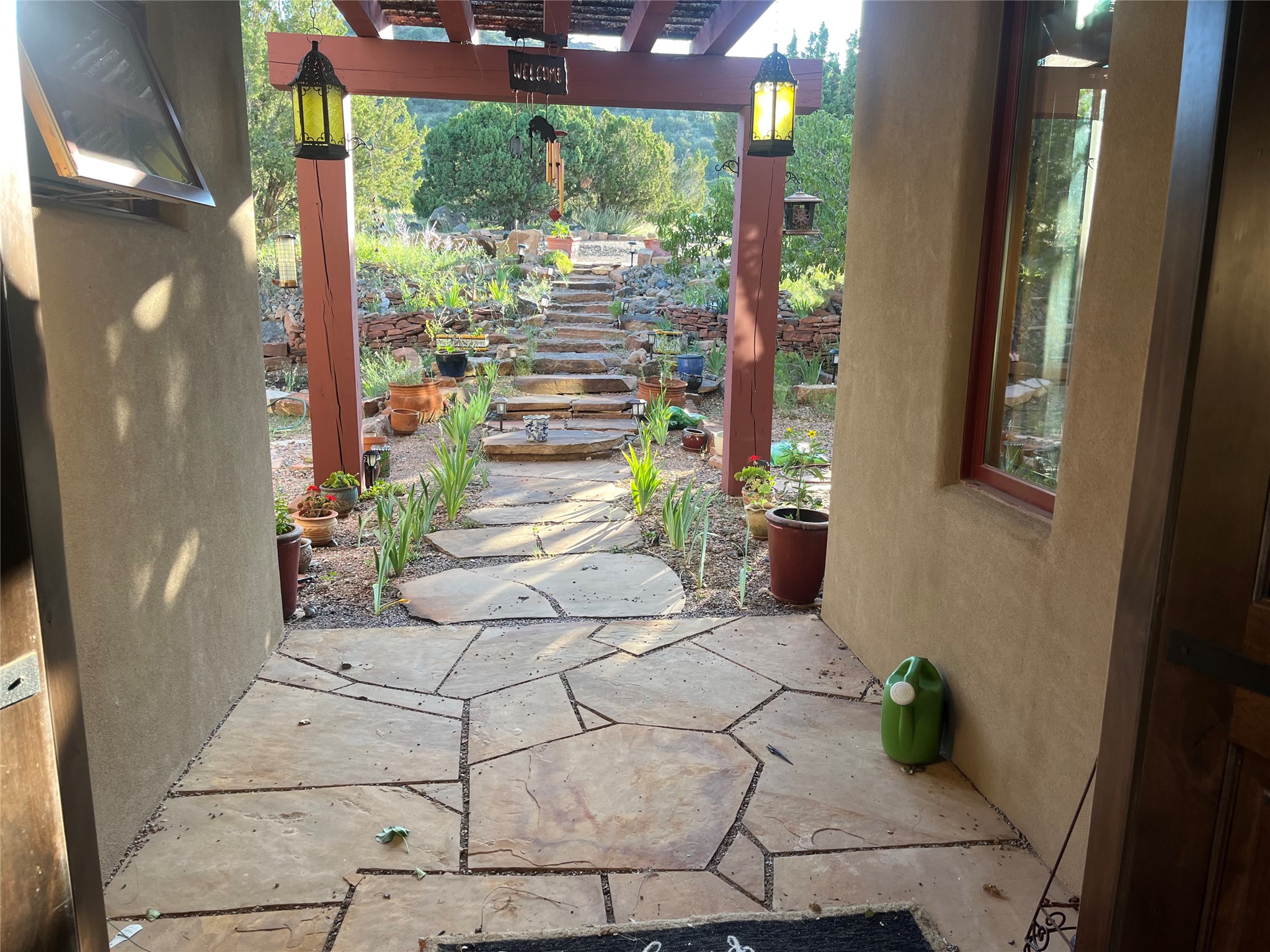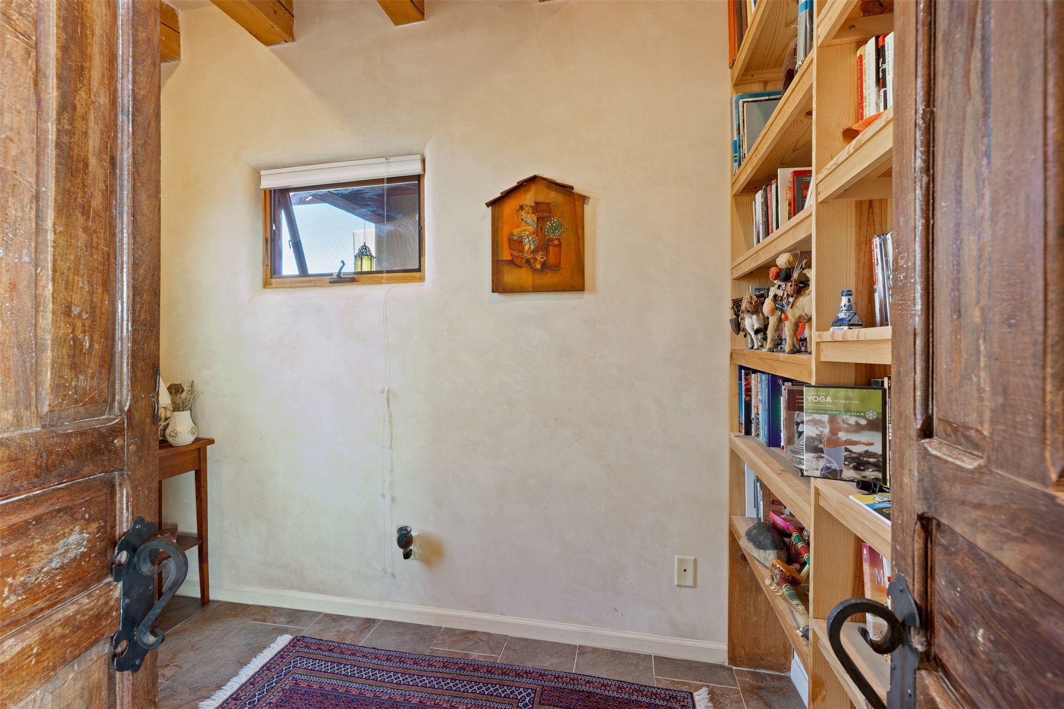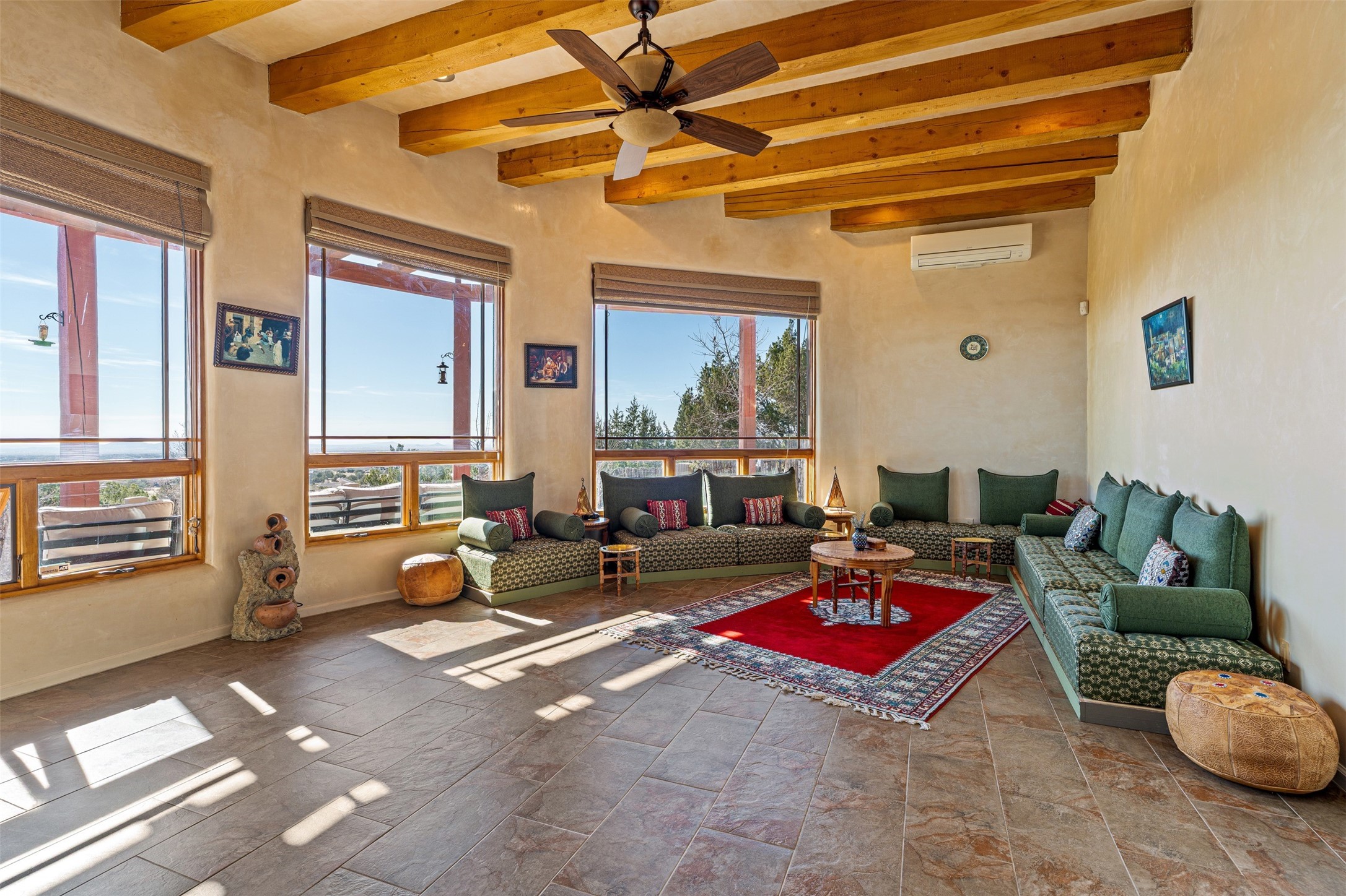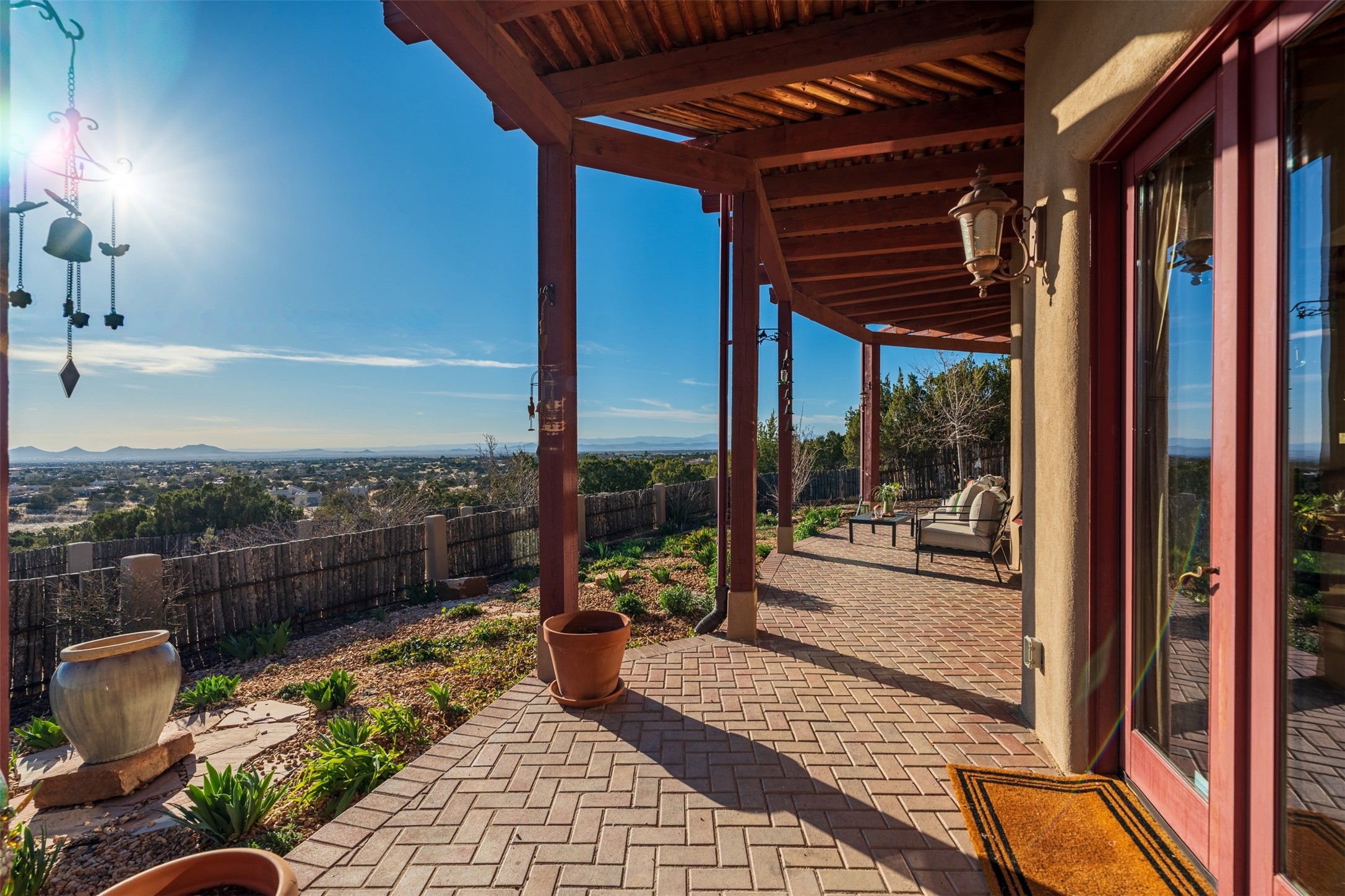 Immaculate and soulful, this single-level residence is beautifully finished with a timeless old-world aesthetic, offering a refined interpretation of Santa Fe living. Featuring 3 bedrooms and 3 baths (one full, one three-quarter, and one half), along with two versatile flex spaces--one is +/- 150 sq. ft, and the other +/- 85 sq. ft. The home is set on a private, expansive 3.93-acre lot and is thoughtfully designed for both comfort and privacy, with a well-conceived floor plan that separates the guest suites and the primary suite into distinct wings. Tucked away on a quiet street in the coveted Los Griegos subdivision--just 20 minutes from downtown Santa Fe--this 2007 Archetypes Homescapes residence is perfectly sited to capture sweeping, unobstructed views. Inside, authentic craftsmanship and rich character define the interiors, with hand-troweled plaster walls, warm tile flooring, and wood-beamed ceilings throughout. Mesquite Mexican doors and custom cabinetry add depth and artistry. The open-concept living space is anchored by a dramatic fireplace, creating an inviting yet sophisticated focal point. The kitchen is both functional and elegant, featuring granite countertops, stainless steel appliances, and a wine refrigerator. The primary suite offers a serene, private retreat with a spacious walk-in closet and a spa-like bath complete with a deep soaking tub. Modern comforts are seamlessly integrated, including radiant floor heating and mini-split cooling systems for year-round climate control. Sustainability is enhanced by a 24-panel photovoltaic solar array and energy-efficient Rastra construction. Outdoors, an expansive wraparound rear portal invites relaxed living and unforgettable sunset views across the surrounding landscape. The fully coyote-fenced backyard provides both privacy and security, completing this exceptional offering that blends timeless elegance with the natural beauty of Northern New Mexico.