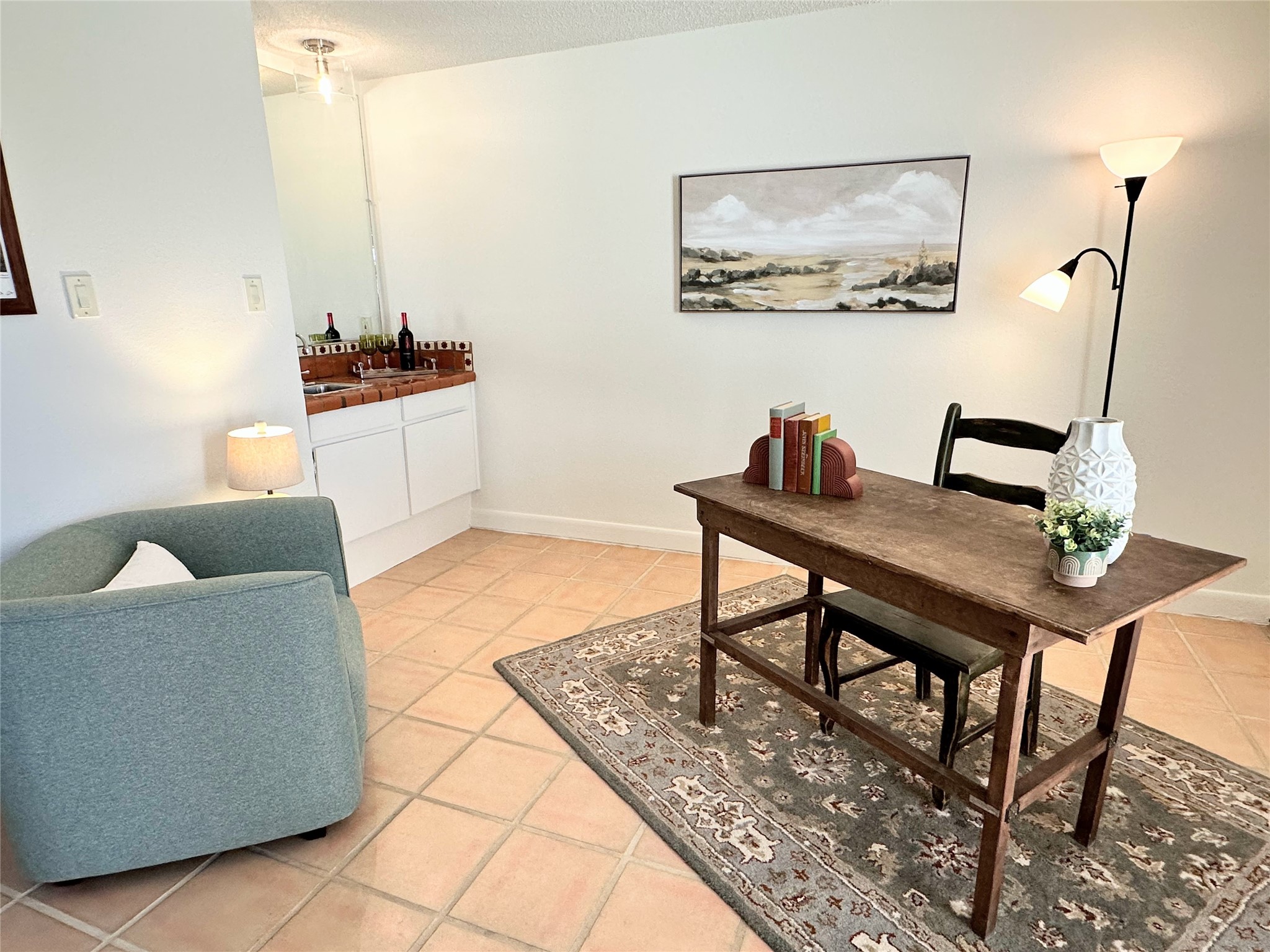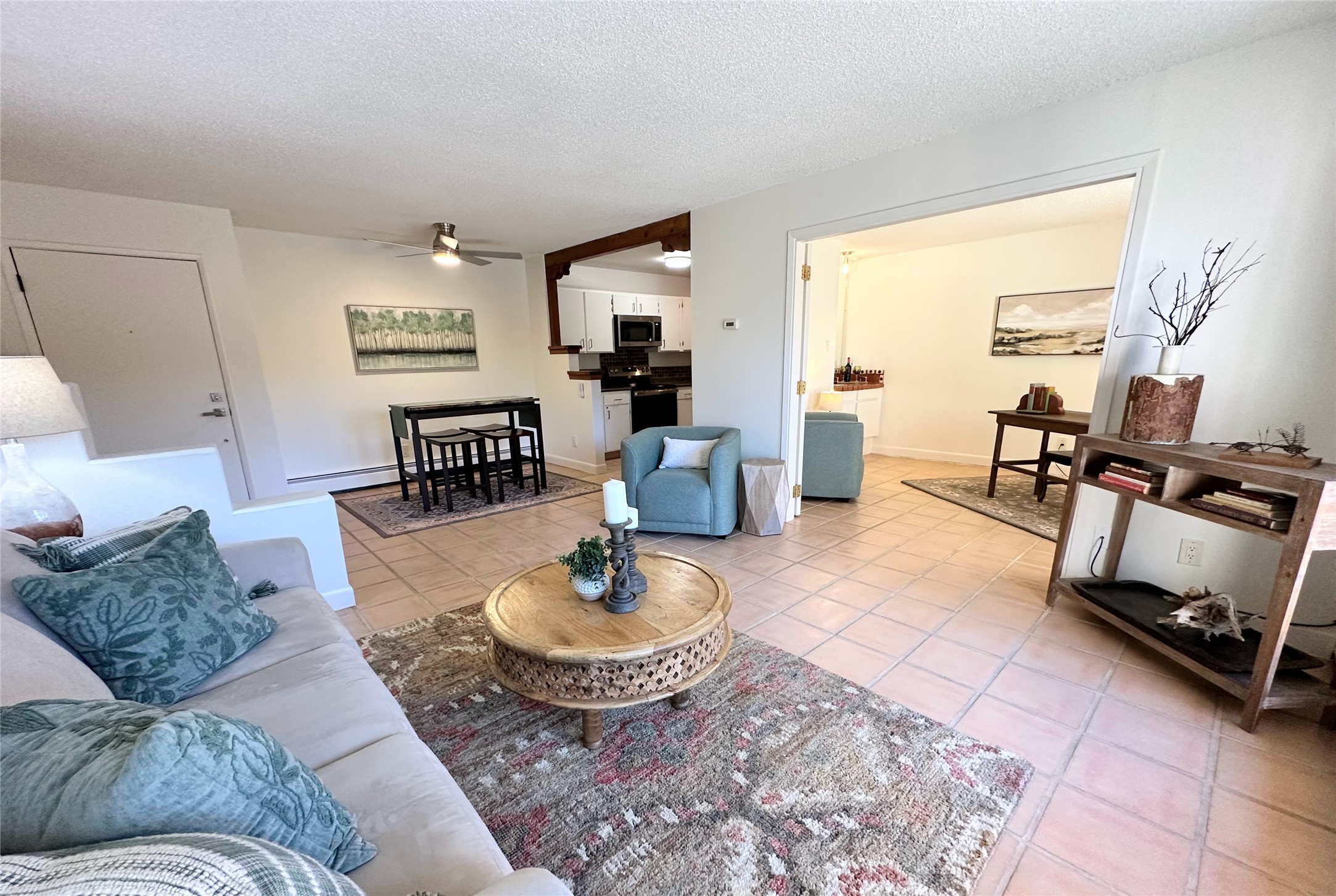 Welcome to desirable Los Arroyos Compound, 147 Calle Ojo Feliz, Unit E. Comfort and style come together in this thoughtfully updated downstairs condo with direct access to open space and walking trails.Recent updates include painting throughout, new lighting, new hardware on kitchen cabinetry, new kitchen faucet, disposal, new stainless appliances, and new stack washer dryer. Previous upgrades include tiles floors, kitchen countertops and tile backsplash, French doors, and bathroom vanity with granite top.Unique to this unit, the French doors in the second bedroom make the space highly versatile. They create an open, connected feel when desired while still providing privacy when closed. This allows the room to function comfortably as a bedroom or as a bright, inviting home office, study, or creative workspace. This style adds character no matter how the space is used.Enjoy the benefits of a centrally located community set on approximately 18 acres, featuring native landscaping, all designed to create a serene atmosphere with walking trails. Ideally situated near schools, shopping destinations, medical facilities, and Downtown Santa Fe. This move-in ready 2-bedroom, 1-bath home blends style with everyday convenience, ideal for a busy lifestyle, weekend getaway, or investment property.Community amenities include: an indoor heated year-round pool, sauna, weight room, hospitality room, tennis and basketball courts, and walking trails. One reserved off-street parking space, with additional guest parking available.Condo fee: $385/monthly, includes baseboard hot water heat, water, sewer, refuse, building and grounds maintenance, and insurance.