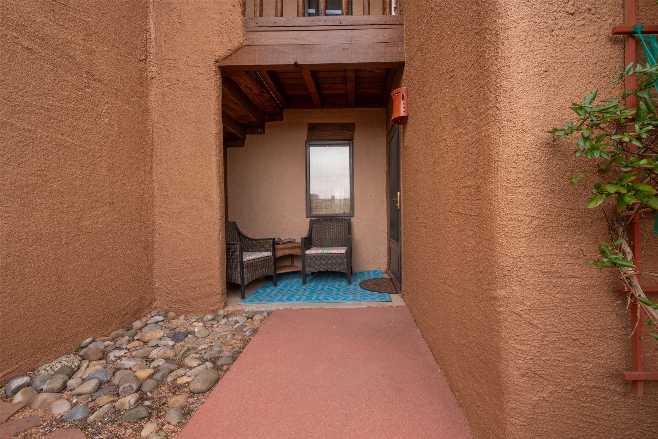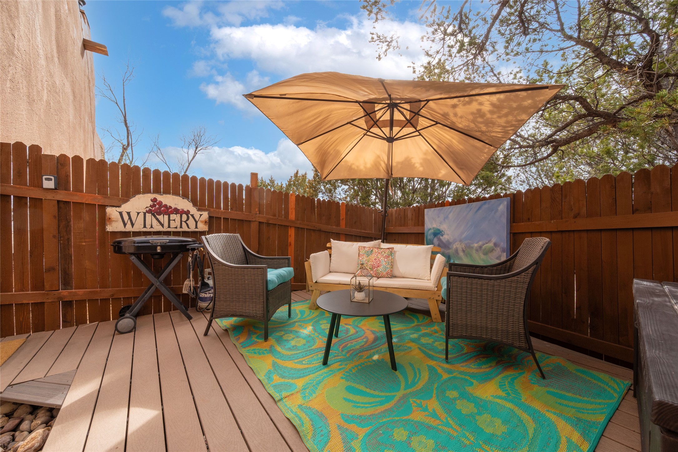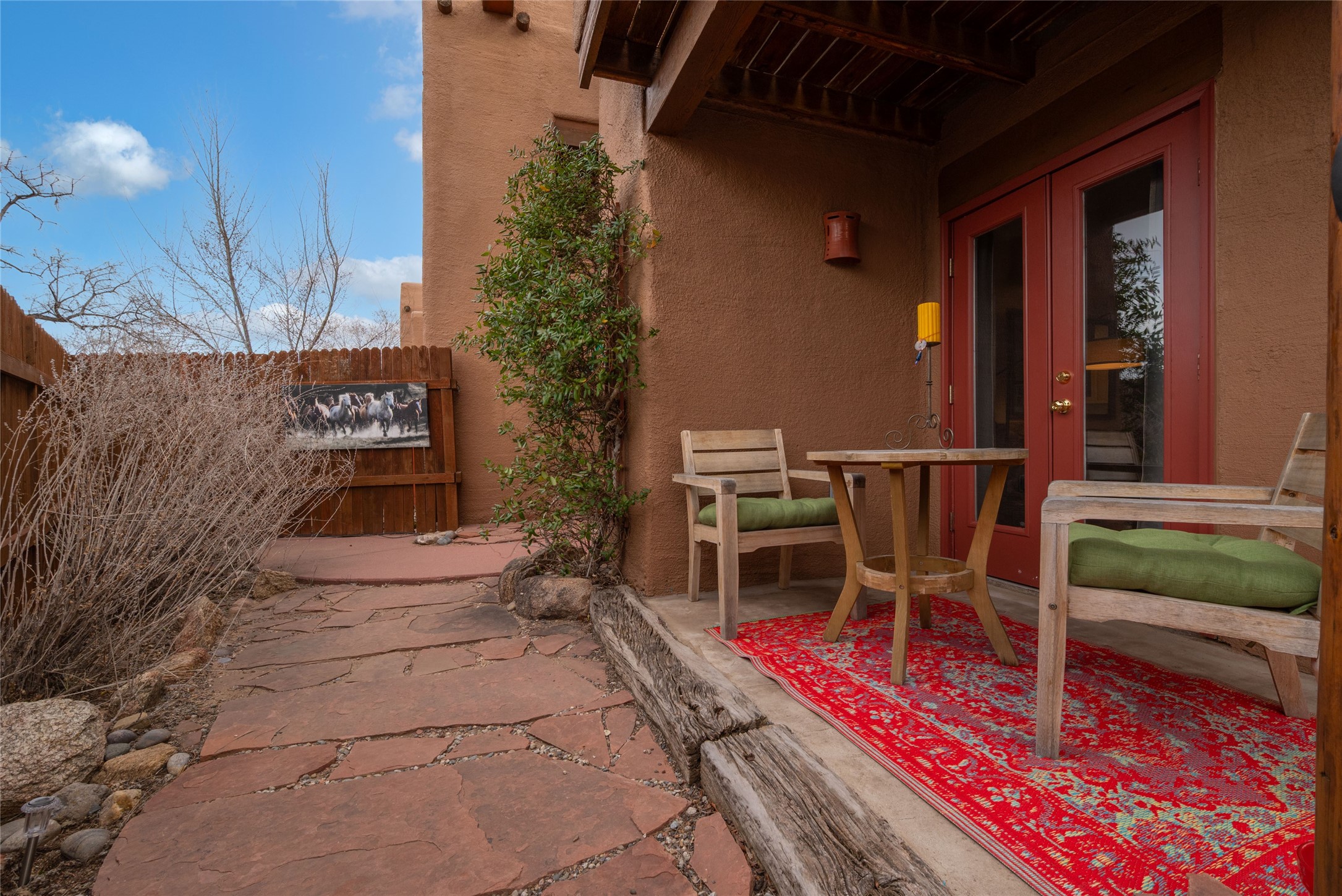 TURNKEY! Are you looking for the perfect condo to live full time, as a pied-a-terre, or an investment property? Here it is, completely furnished, at the sought after Tierra de Zia condo gated community in mid-town Santa Fe! A corner, ground level unit with a beautiful private deck, patio and gardens. Living room with french doors, lots of light, and a kiva fireplace. Kitchen complete with washer and dryer and double door refrigerator with ice and water dispenser. Maple cabinetry. Ensuite bedroom with walk-in closet off the bathroom. Wood/vinyl wide plank flooring throughout. Designated parking directly in front of the unit. Sunset views! Beautiful grounds with ponds, fountains and walking trails through a natural setting. On-site management.
