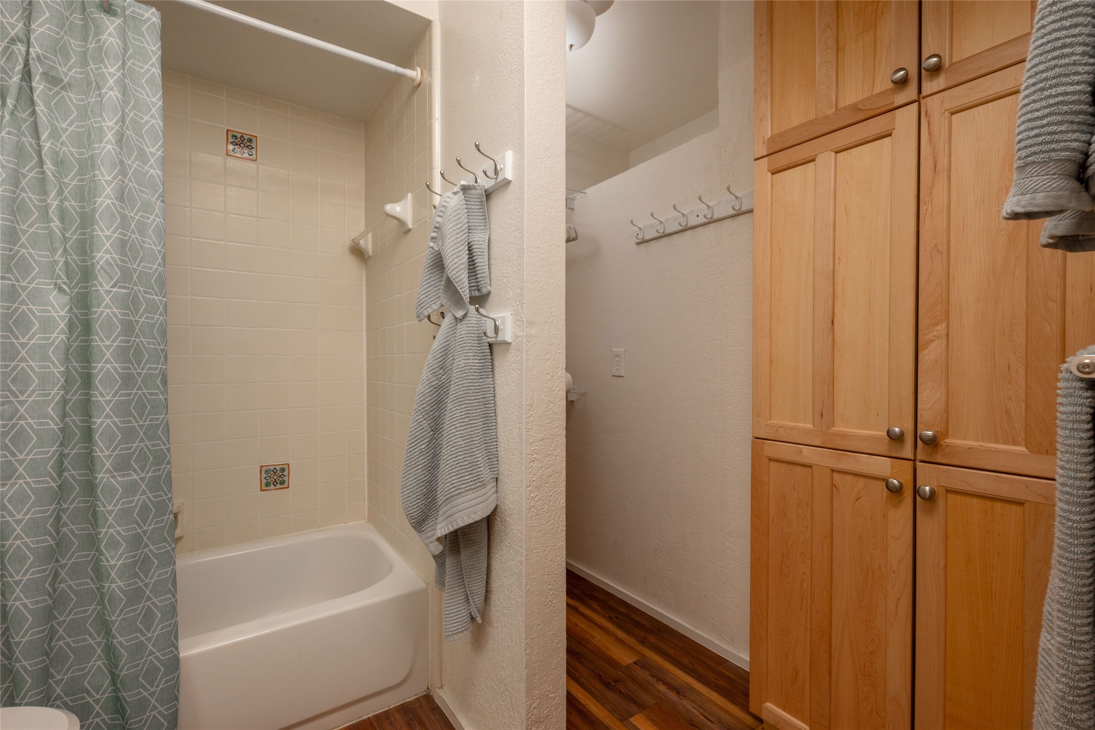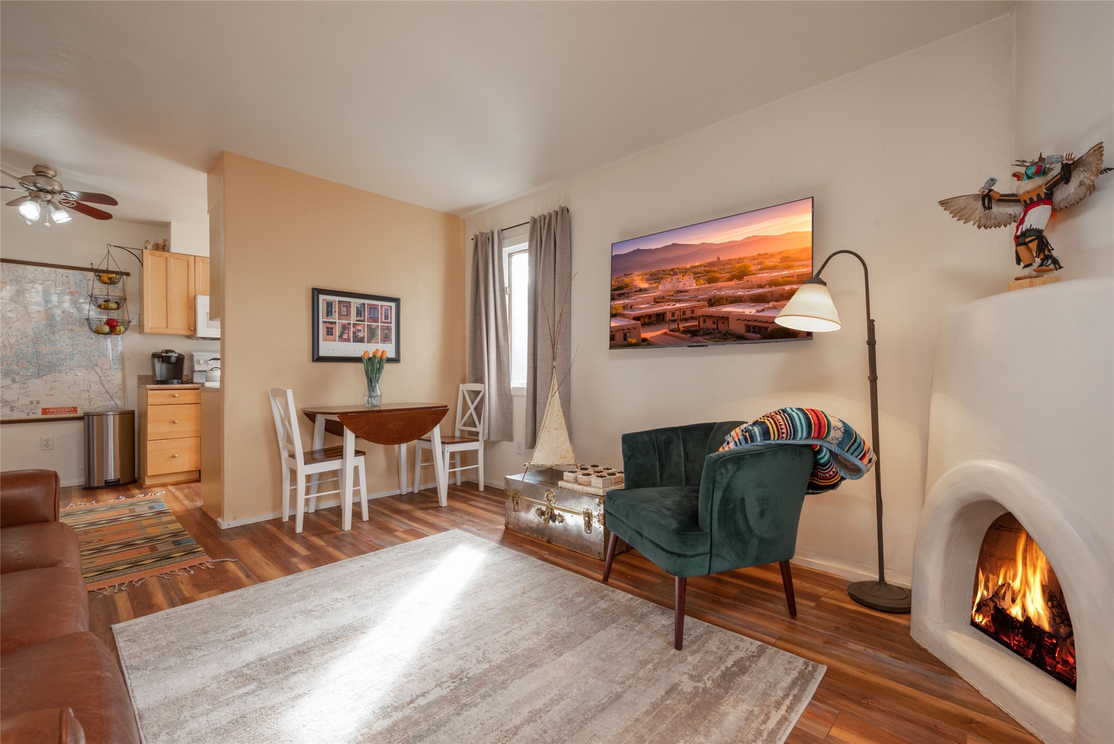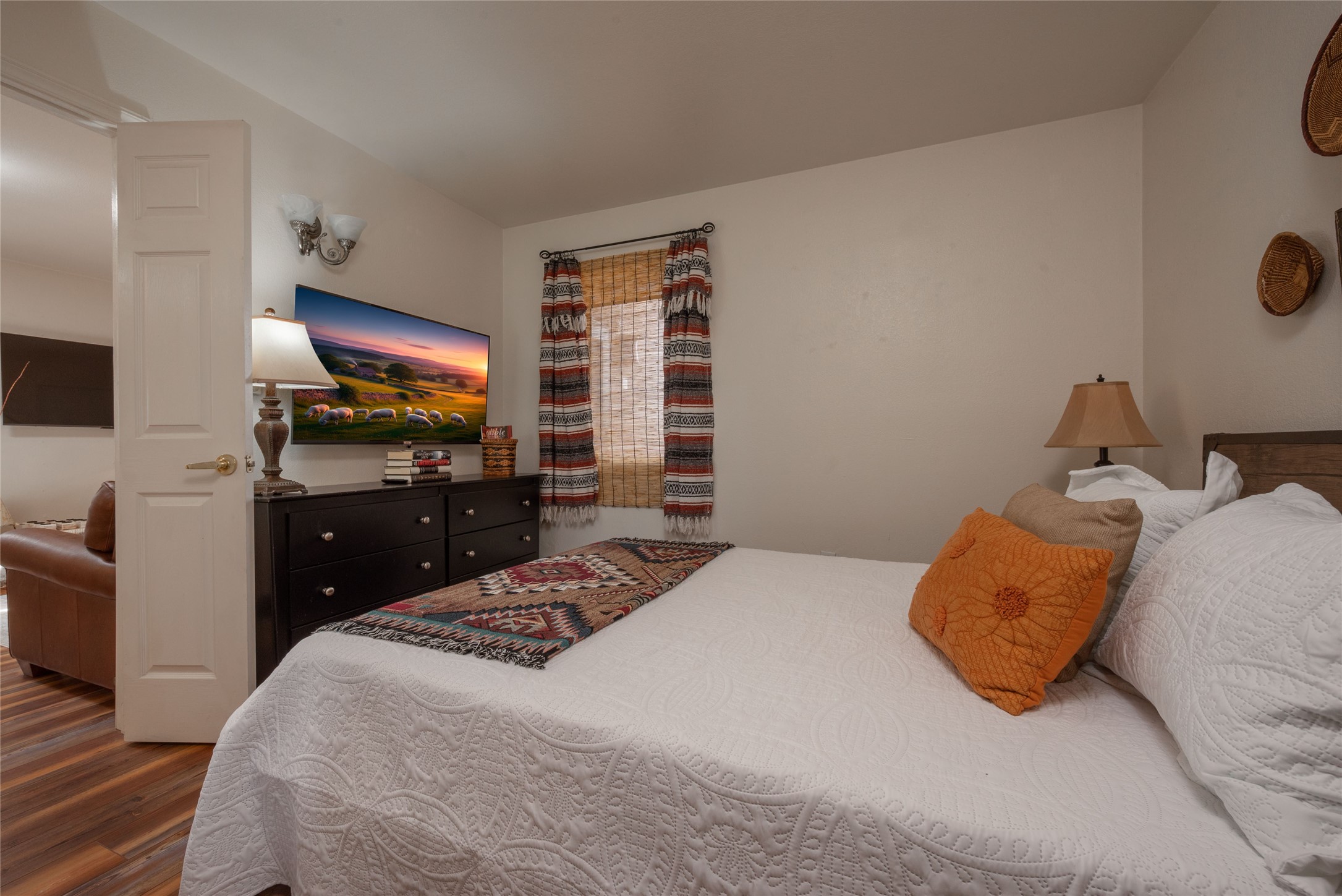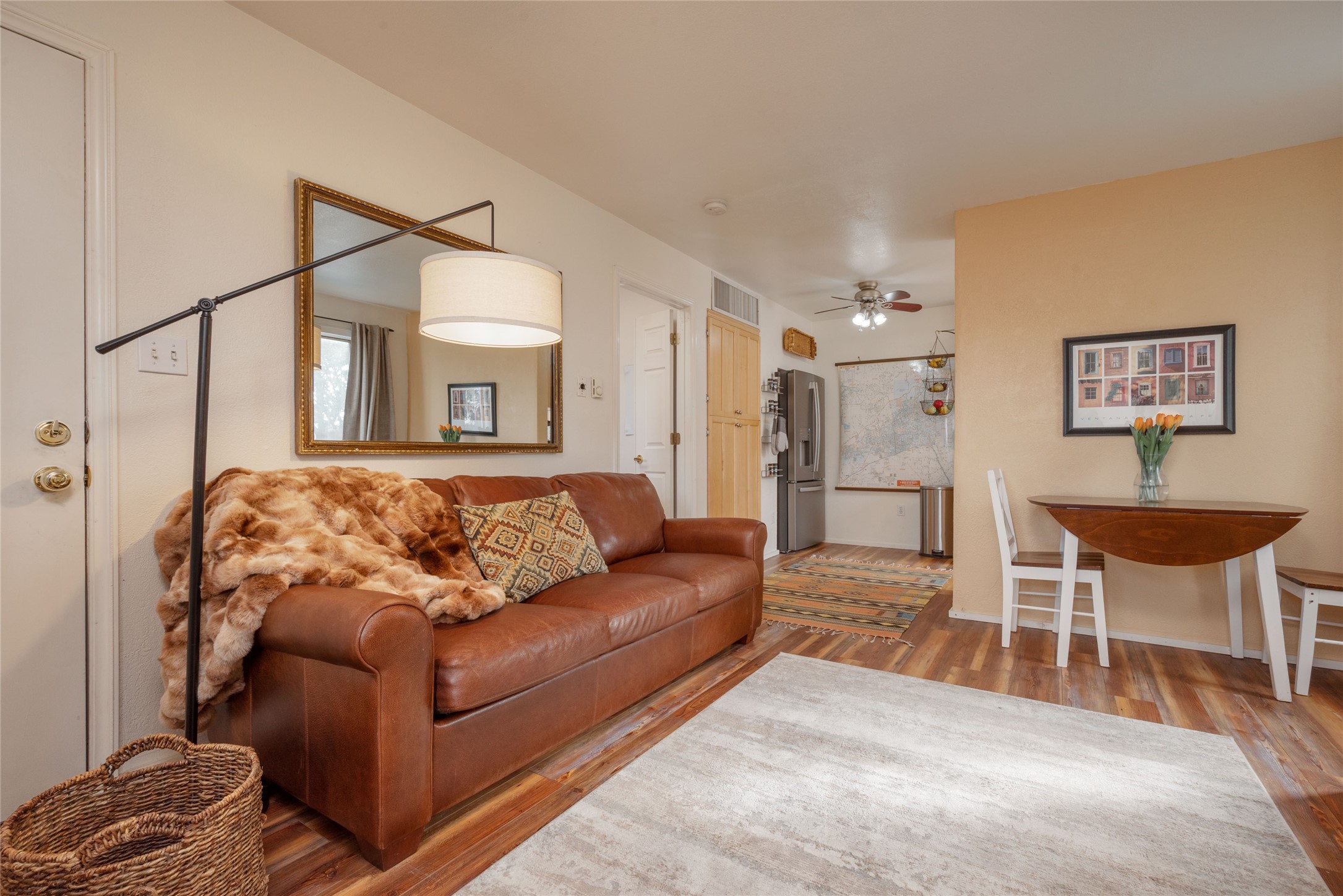 TURNKEY! Are you looking for the perfect condo to live full time, as a pied-a-terre, or an investment property? Here it is, completely furnished, at the sought after Tierra de Zia condo gated community in mid-town Santa Fe! A corner, ground level unit with a beautiful private deck, patio and gardens. Living room with french doors, lots of light, and a kiva fireplace. Kitchen complete with washer and dryer and double door refrigerator with ice and water dispenser. Maple cabinetry. Ensuite bedroom with walk-in closet off the bathroom. Wood/vinyl wide plank flooring throughout. Designated parking directly in front of the unit. Sunset views! Beautiful grounds with ponds, fountains and walking trails through a natural setting. On-site management.