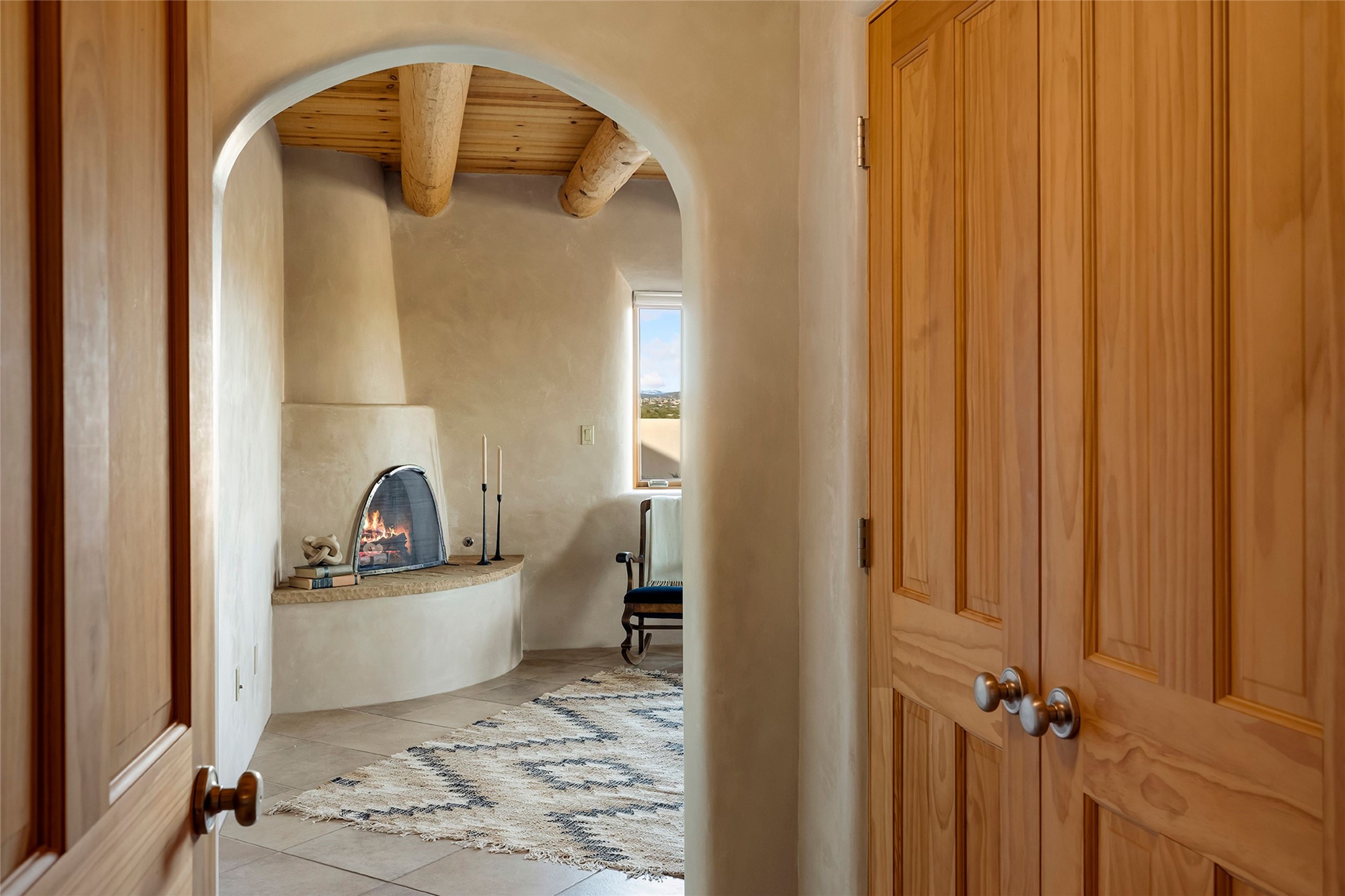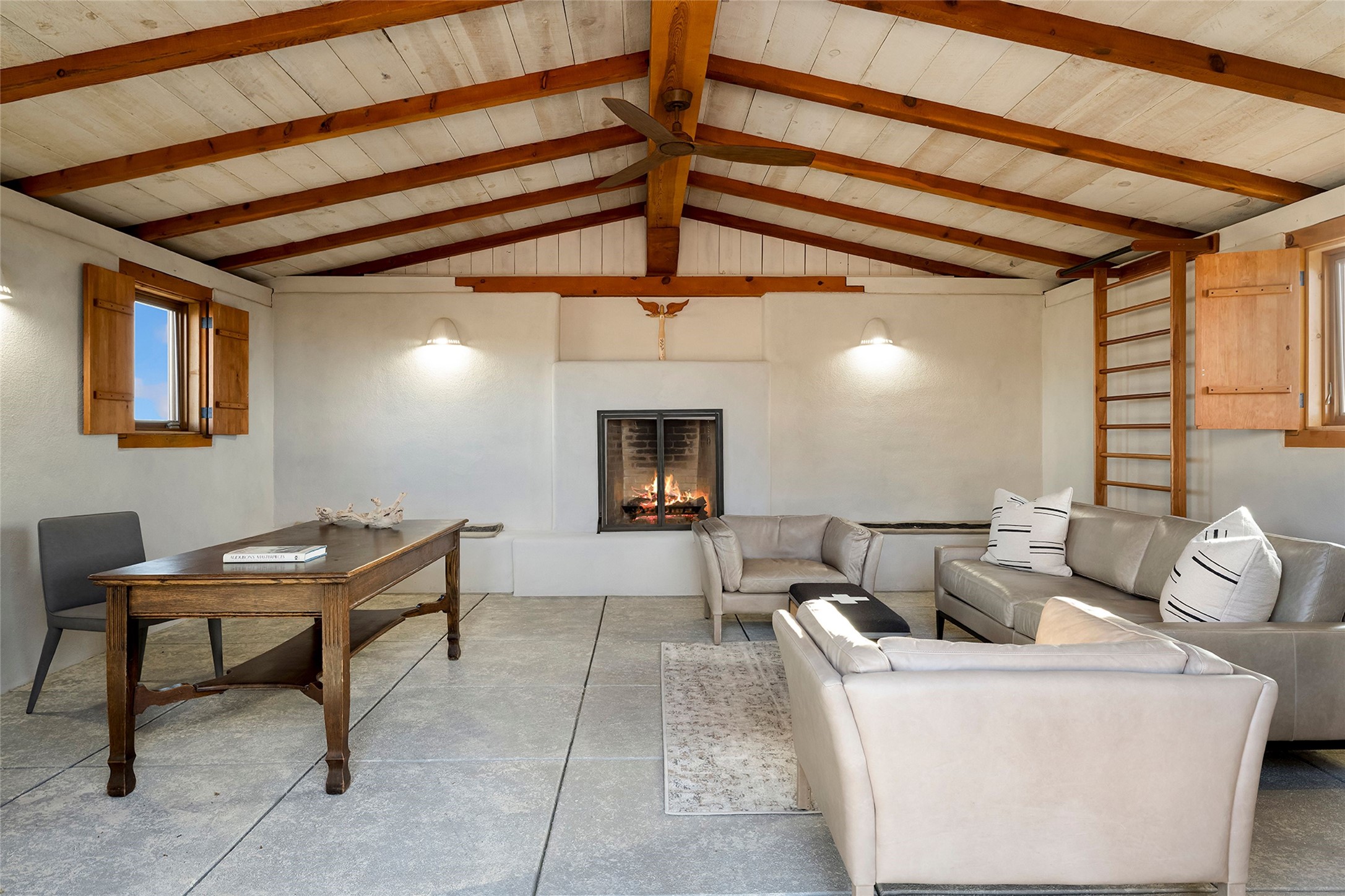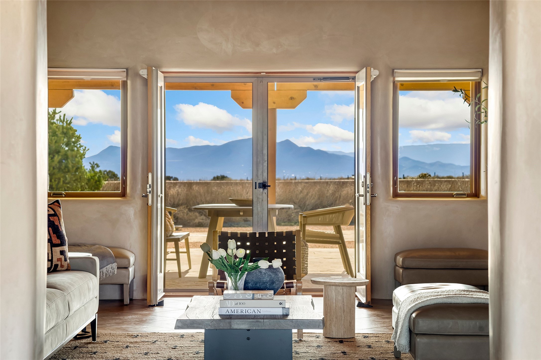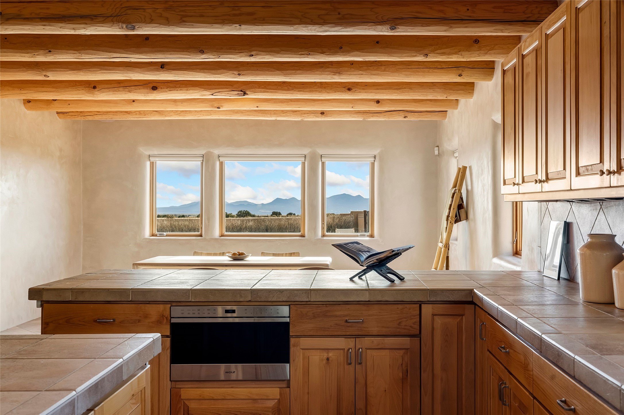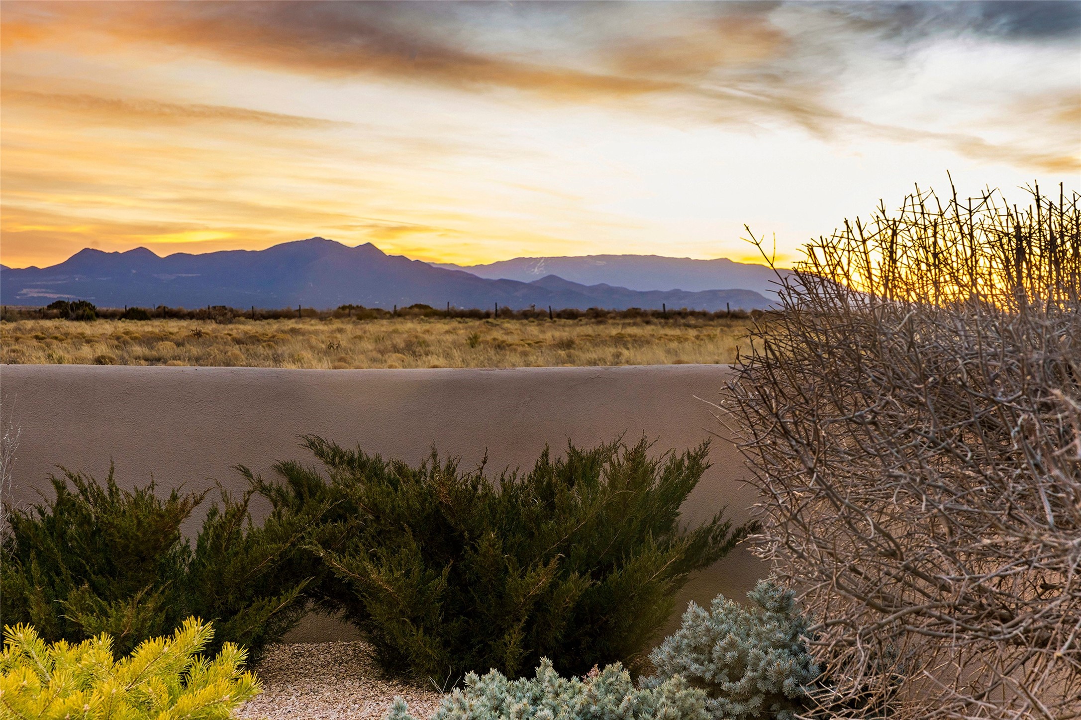 Inspired by the minimalist excellence of the famed Georgia O'Keefe, this 12.5-acre northern New Mexico estate, with horse privileges, is a living canvas where over 3,800 square feet of authentic Santa Fe architecture with an impressive main house and detached studio, captivates with one of most vibrant backdrops of vast mountain ranges and magnificent sunsets. Recently upgraded with quality improvements, this exceptional adobe-built Santa Fe sanctuary with 3 bedrooms and 2 baths within the main house and a private detached studio, sets itself apart with its quality craftsmanship, views, vast acreage, a superior outdoor living experience and flexible use of space. Design features include a stunning living room, anchored by a substantial fireplace, framed mountain views, endless walls for art and dual outdoor access to both courtyards. At its heart lies a professional epicurean kitchen which is well-appointed with Wolf and Sub-Zero appliances, excellent storage and a breakfast bar, all of which opens to the intimate dining room which overlooks the courtyard with expansive views. The luxurious, private owner's suite delights with a Kiva fireplace, French doors leading to the back portal, views and a spa-like bath. Two additional spacious guest bedrooms offer privacy, comfort and views and share an elegant full bath. The property's creative pulse is found in the custom detached studio which offers a light-drenched space with scored concrete floors, a wood-burning fireplace and offers endless possibilities for use. Additional highlights include quality windows which frame long-range mountain views, no interiors steps, warm plaster walls, authentic vigas and wood planked ceilings, neutral finishes throughout, fully enclosed front and back courtyards, a large 3-car garage, vibrant landscape and updated hardscape. ThisSanta Fe home is a rare find and offers a seamless blend of high desert luxury and the rugged, artistic spirit of the land.