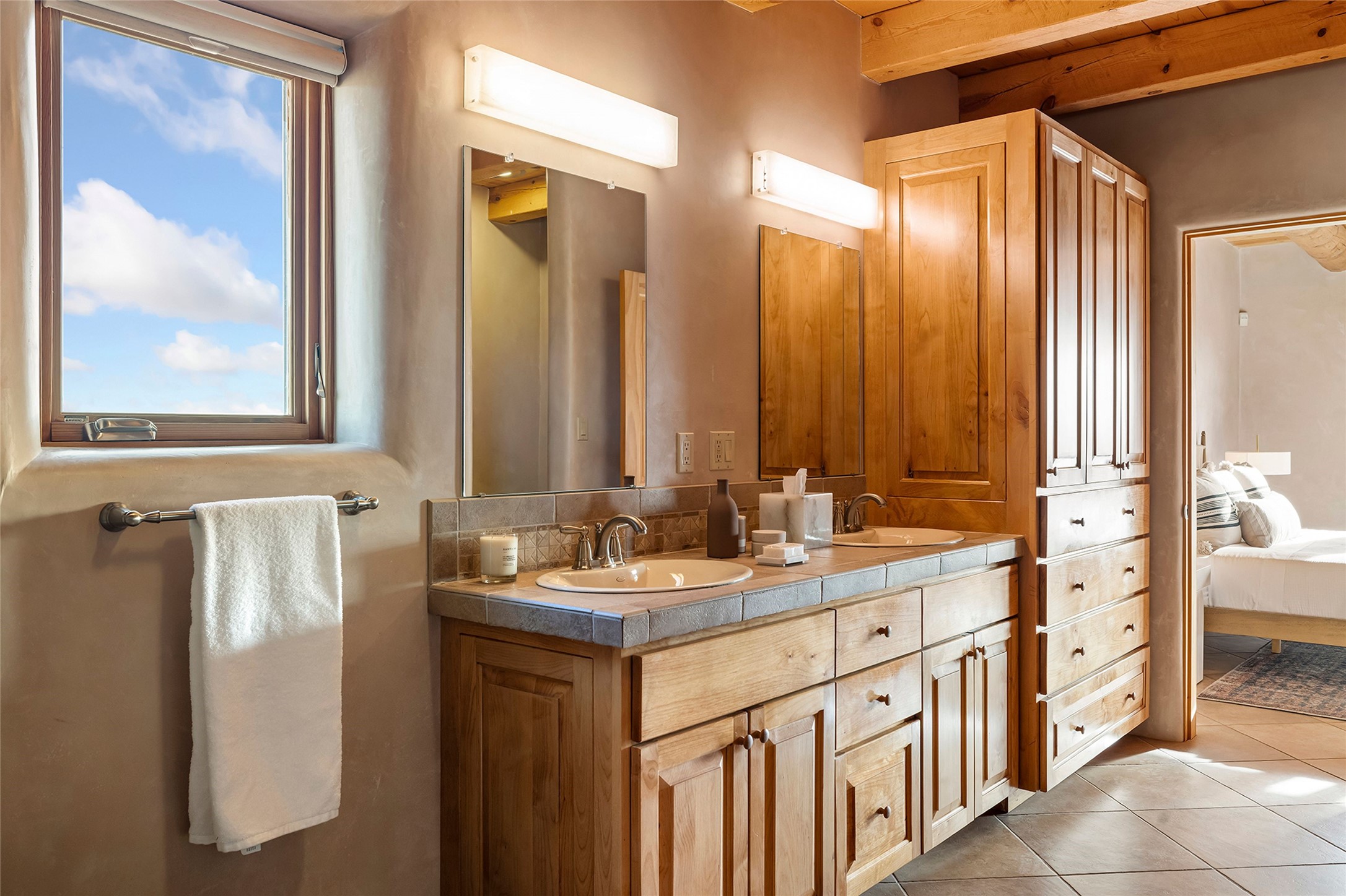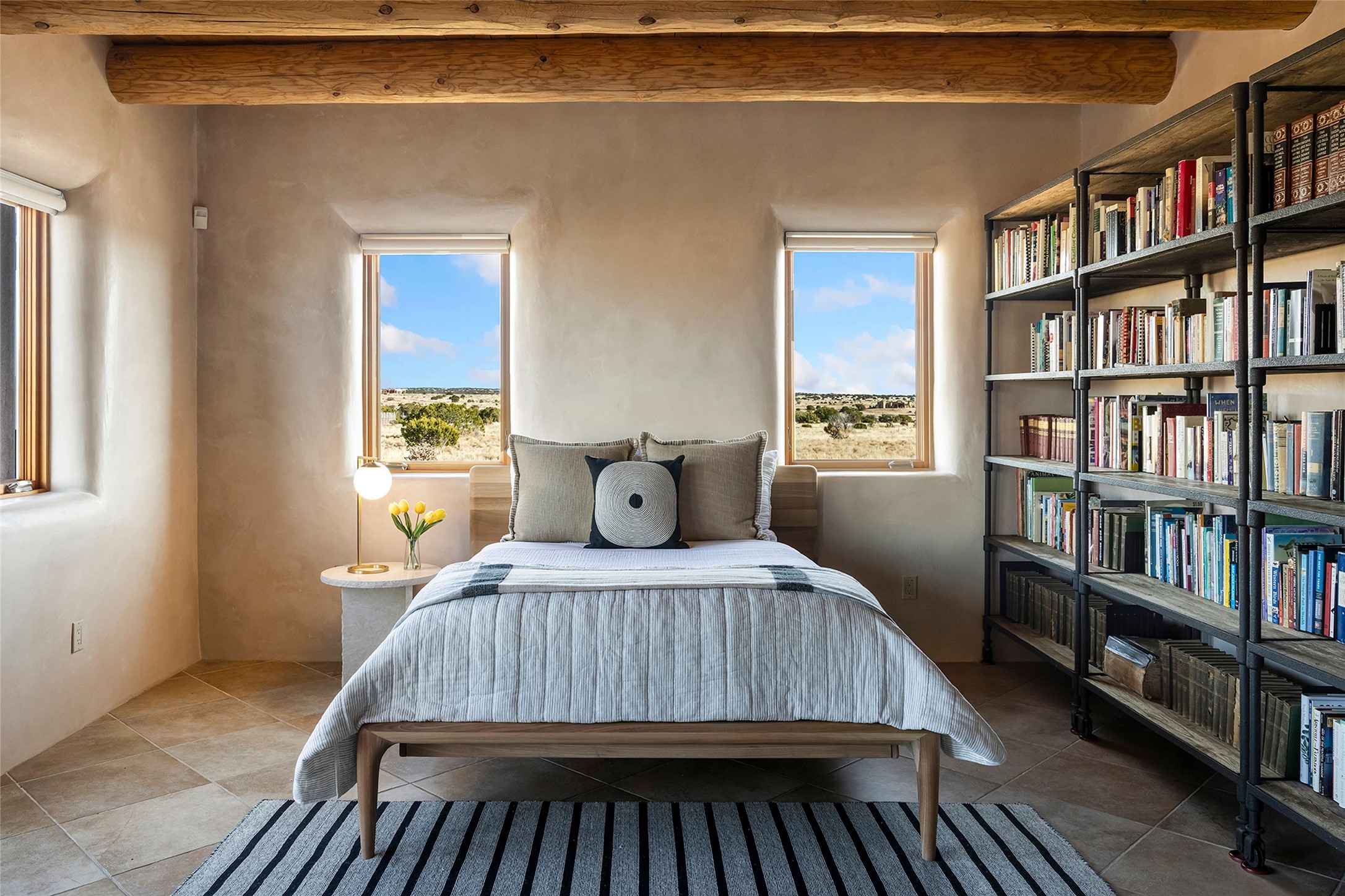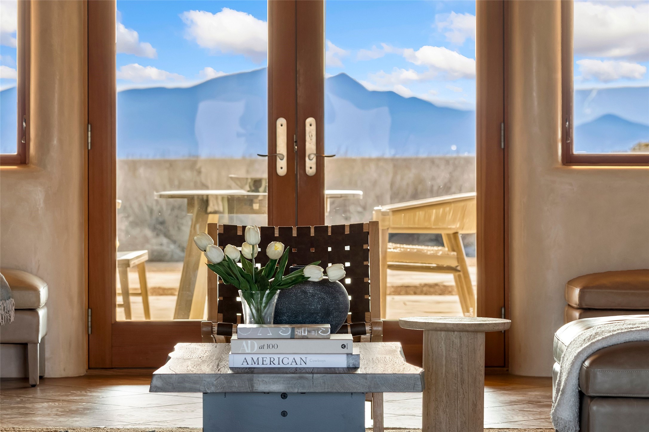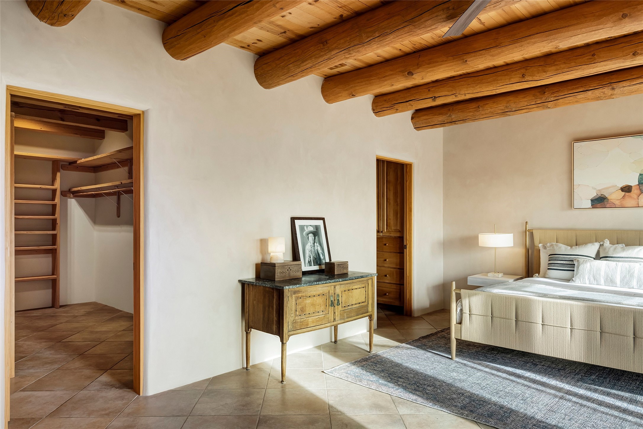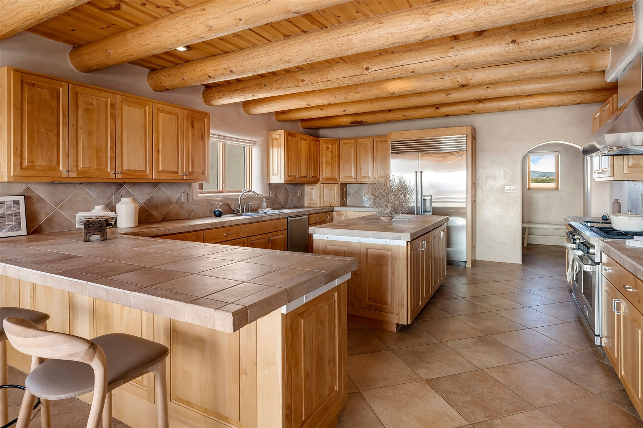 Inspired by the minimalist excellence of the famed Georgia O'Keefe, this 12.5-acre northern New Mexico estate, with horse privileges, is a living canvas where over 3,800 square feet of authentic Santa Fe architecture with an impressive main house and detached studio, captivates with one of most vibrant backdrops of vast mountain ranges and magnificent sunsets. Recently upgraded with quality improvements, this exceptional adobe-built Santa Fe sanctuary with 3 bedrooms and 2 baths within the main house and a private detached studio, sets itself apart with its quality craftsmanship, views, vast acreage, a superior outdoor living experience and flexible use of space. Design features include a stunning living room, anchored by a substantial fireplace, framed mountain views, endless walls for art and dual outdoor access to both courtyards. At its heart lies a professional epicurean kitchen which is well-appointed with Wolf and Sub-Zero appliances, excellent storage and a breakfast bar, all of which opens to the intimate dining room which overlooks the courtyard with expansive views. The luxurious, private owner's suite delights with a Kiva fireplace, French doors leading to the back portal, views and a spa-like bath. Two additional spacious guest bedrooms offer privacy, comfort and views and share an elegant full bath. The property's creative pulse is found in the custom detached studio which offers a light-drenched space with scored concrete floors, a wood-burning fireplace and offers endless possibilities for use. Additional highlights include quality windows which frame long-range mountain views, no interiors steps, warm plaster walls, authentic vigas and wood planked ceilings, neutral finishes throughout, fully enclosed front and back courtyards, a large 3-car garage, vibrant landscape and updated hardscape. ThisSanta Fe home is a rare find and offers a seamless blend of high desert luxury and the rugged, artistic spirit of the land.