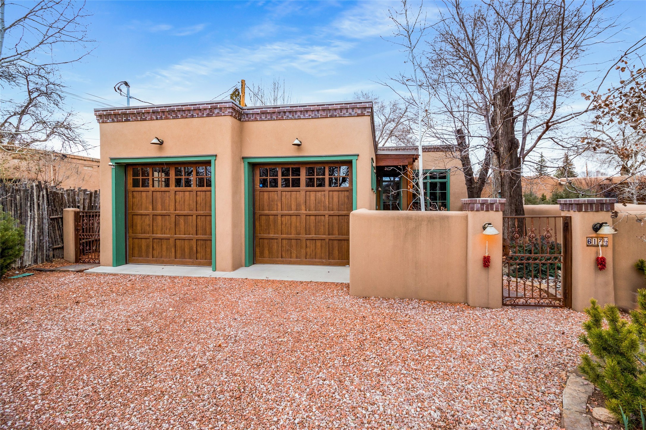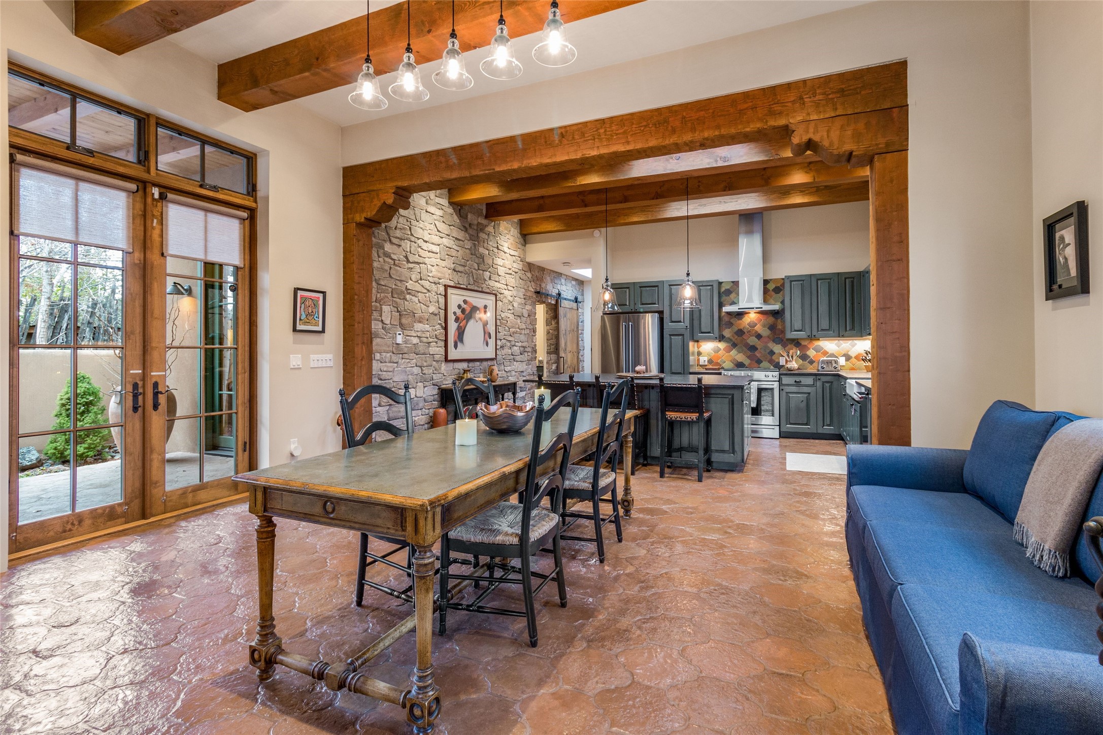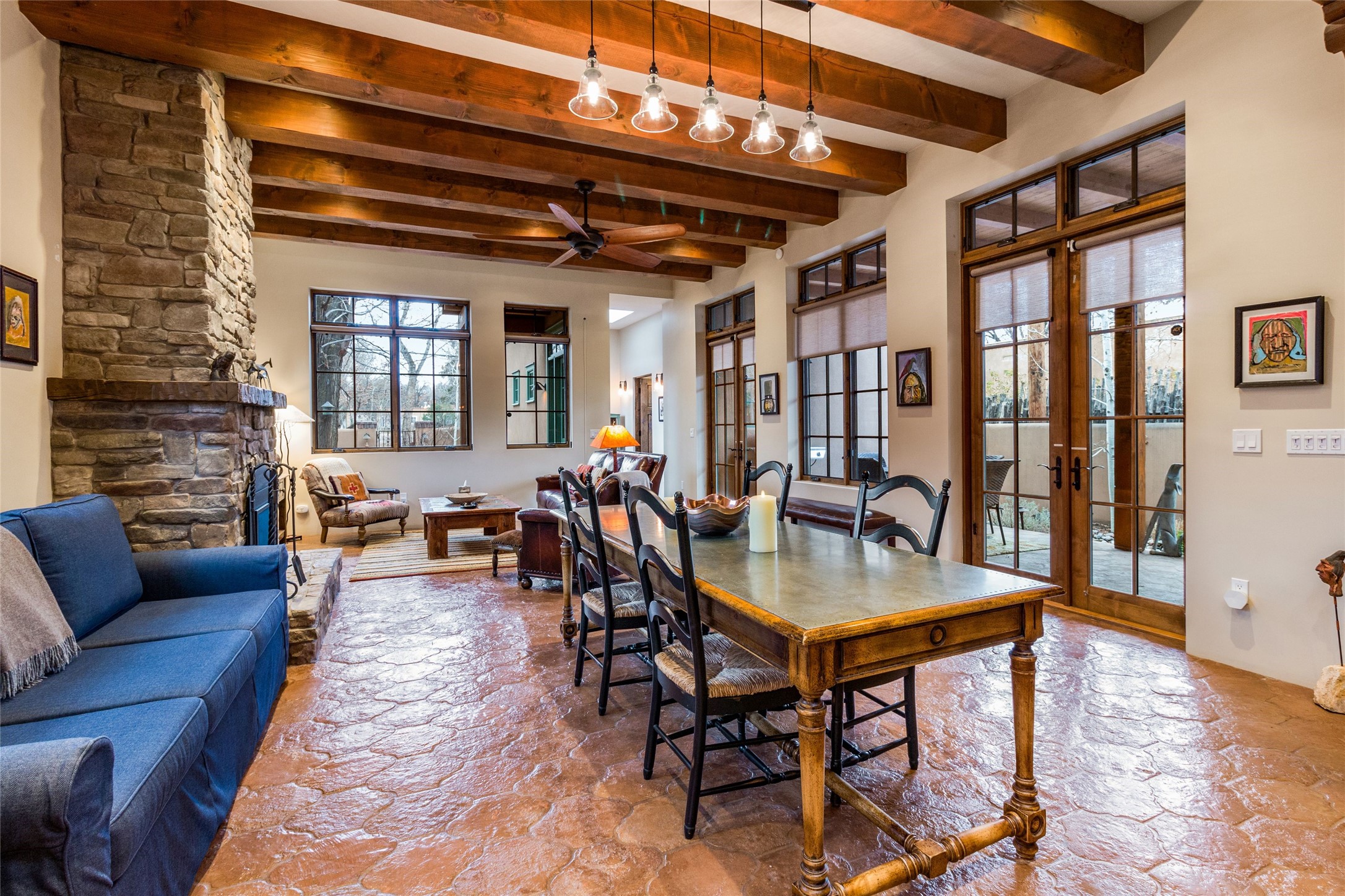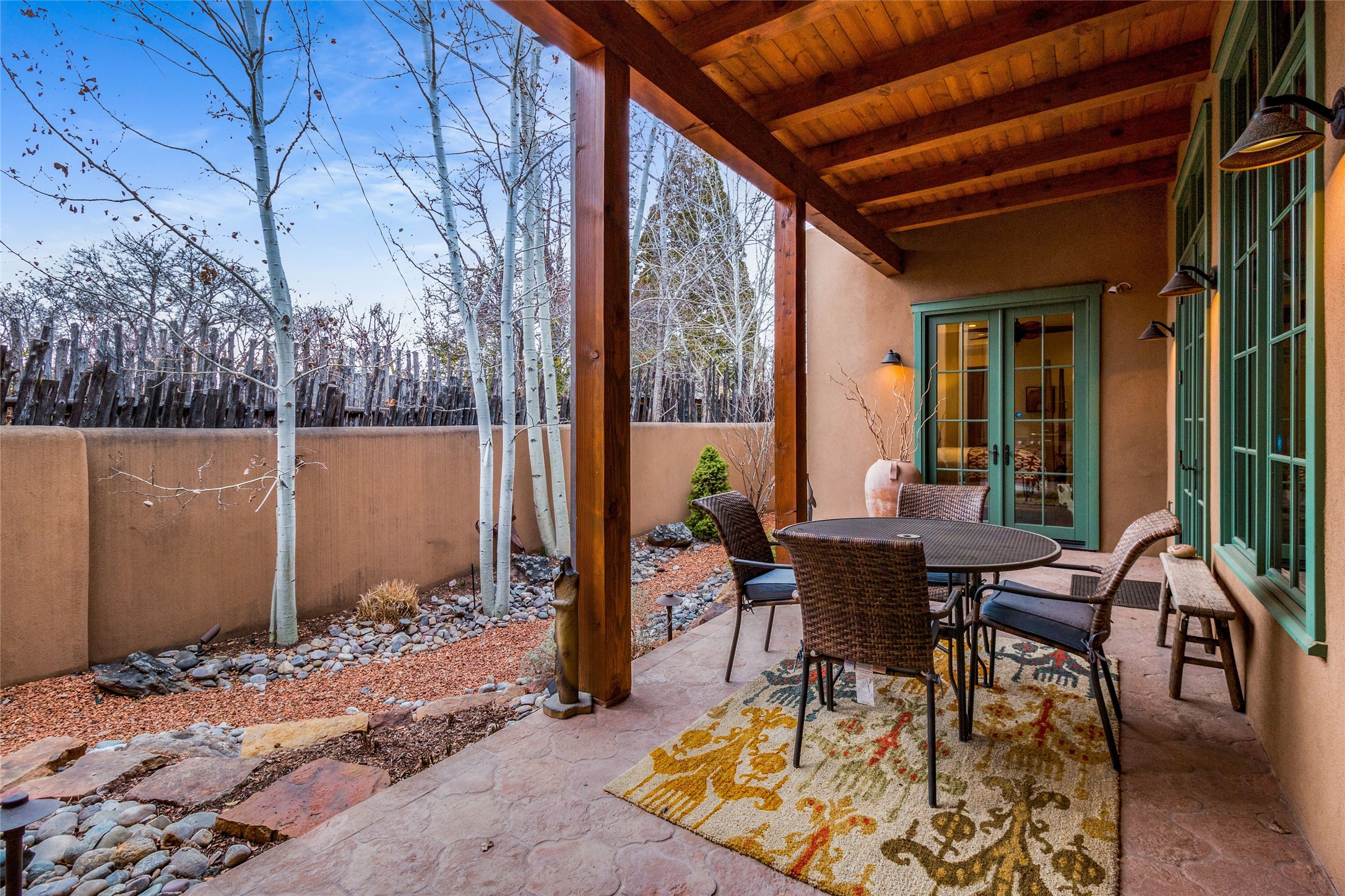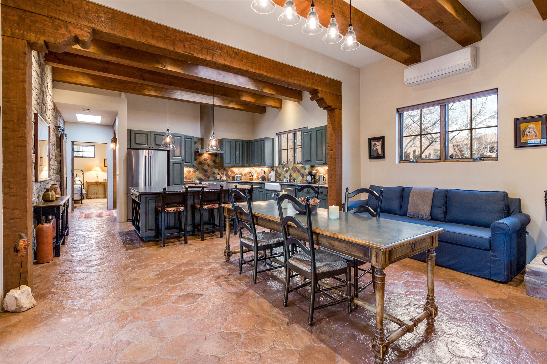 This rare Eastside property is situated in downtown Santa Fe's most beloved and walkable locations close to Canyon Road. Comprising 1,750 +/- sq.ft., this single-level custom 2 bedroom and 2 bath home was built in 2016 and exudes classic Santa Fe style. High ceilings featuring large beams in the open concept living/dining/kitchen area fill the space with light and warmth accented by a gas fired stone fireplace and nearby stone accent wall. Glass French doors lead from this living area to a covered portal with a bubbling water feature, perfect for al fresco dining and entertaining. Each en-suite bathroom is spa-like in nature each with large walk in showers and quiet privacy. Features include antiqued terracotta tiles with in-floor radiant heat, mini-split air conditioning/heating, large windows with privacy blinds, skylights, a gourmet kitchen with large island, custom cabinets with granite countertops, a full size laundry and mud room, built in office alcove, custom lighting, plenty of storage, and a 2-car garage with additional off street parking. Solar panels were recently added with a transferable warranty in place. This property has a great rental history and could be offered turn-key to those looking for an excellent income producing property.