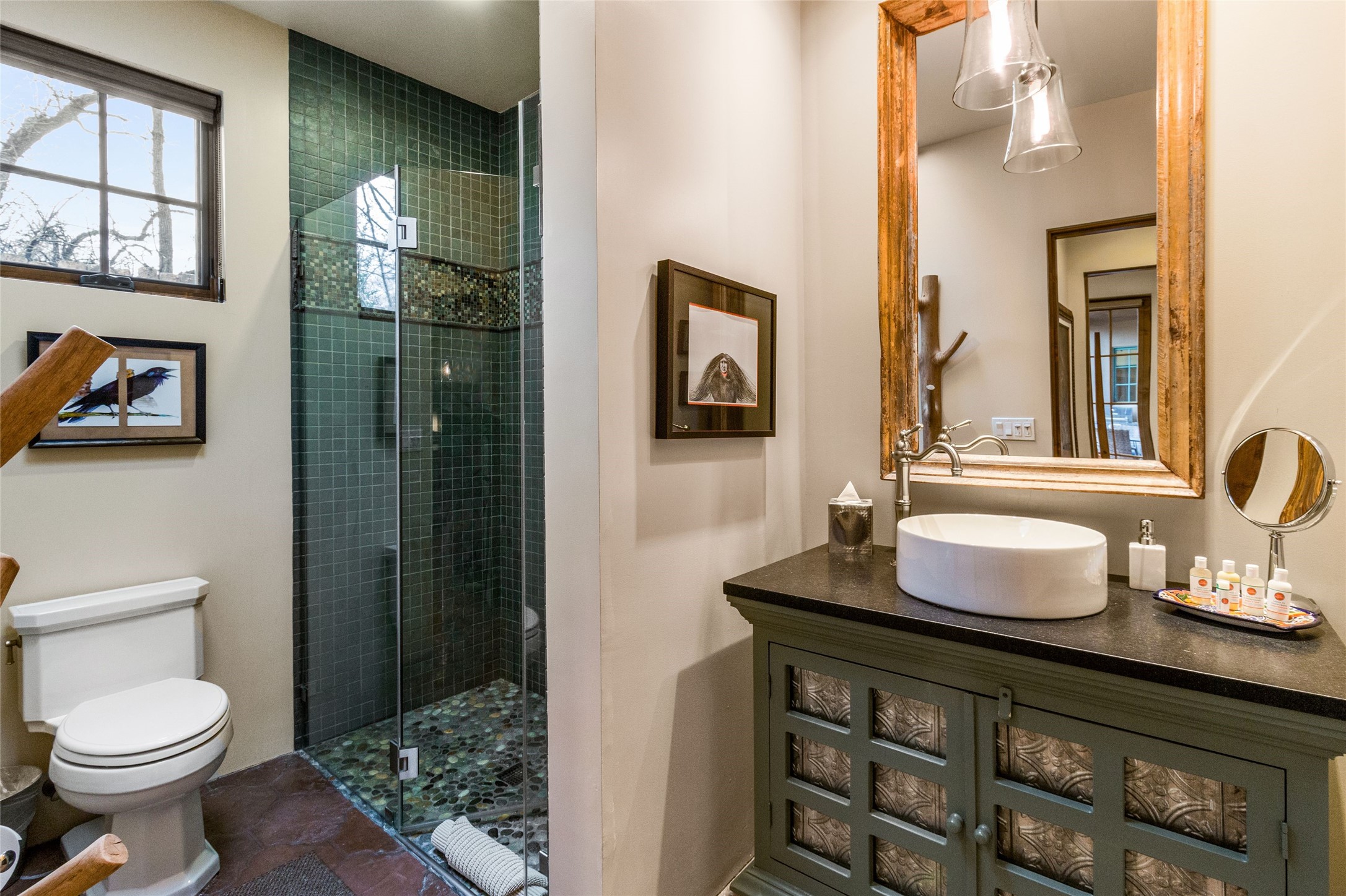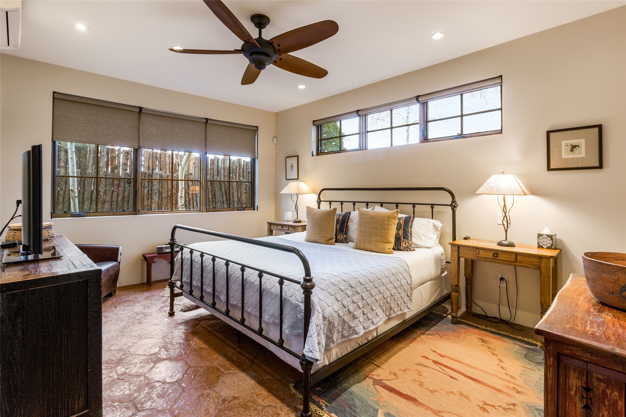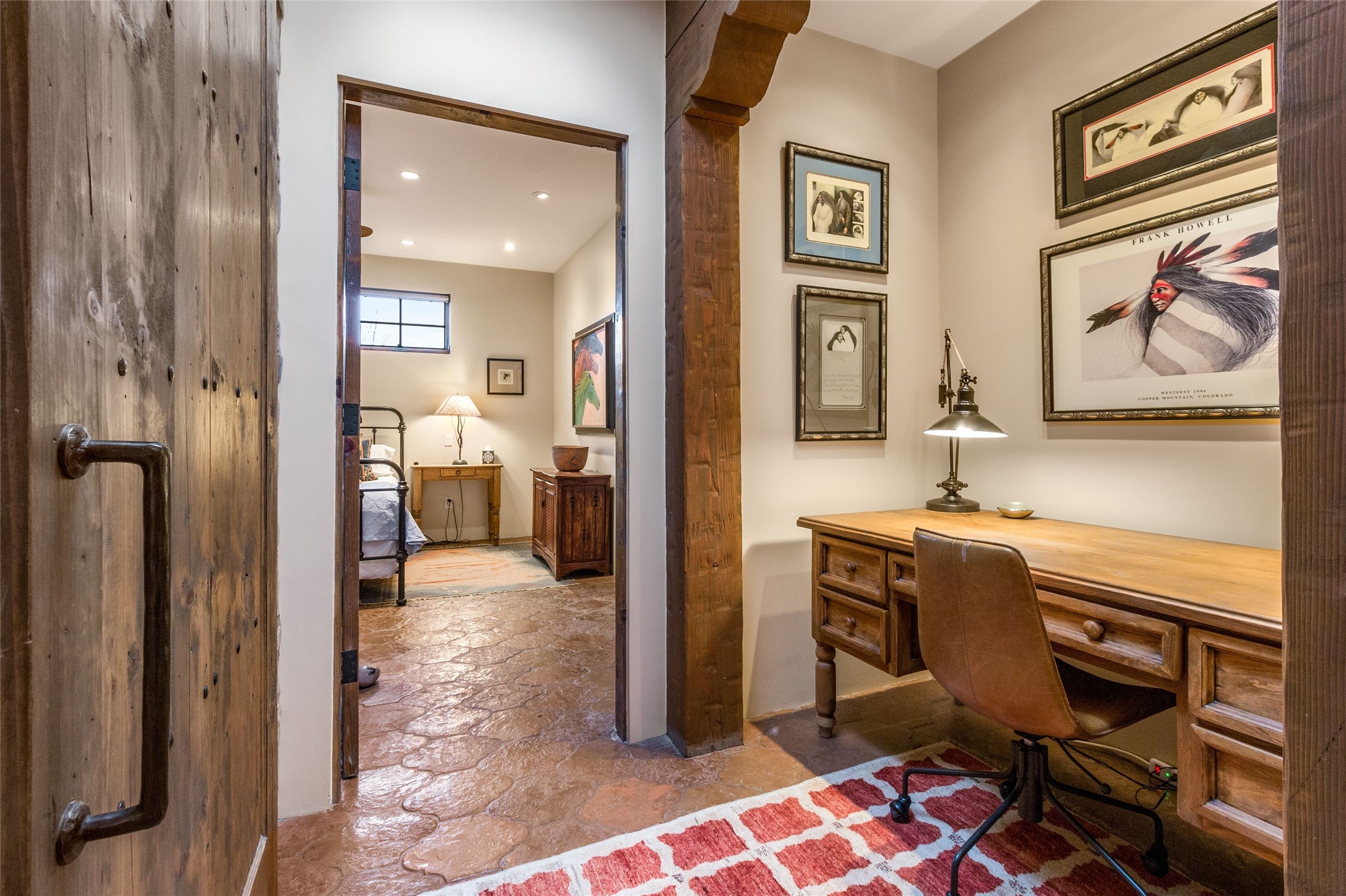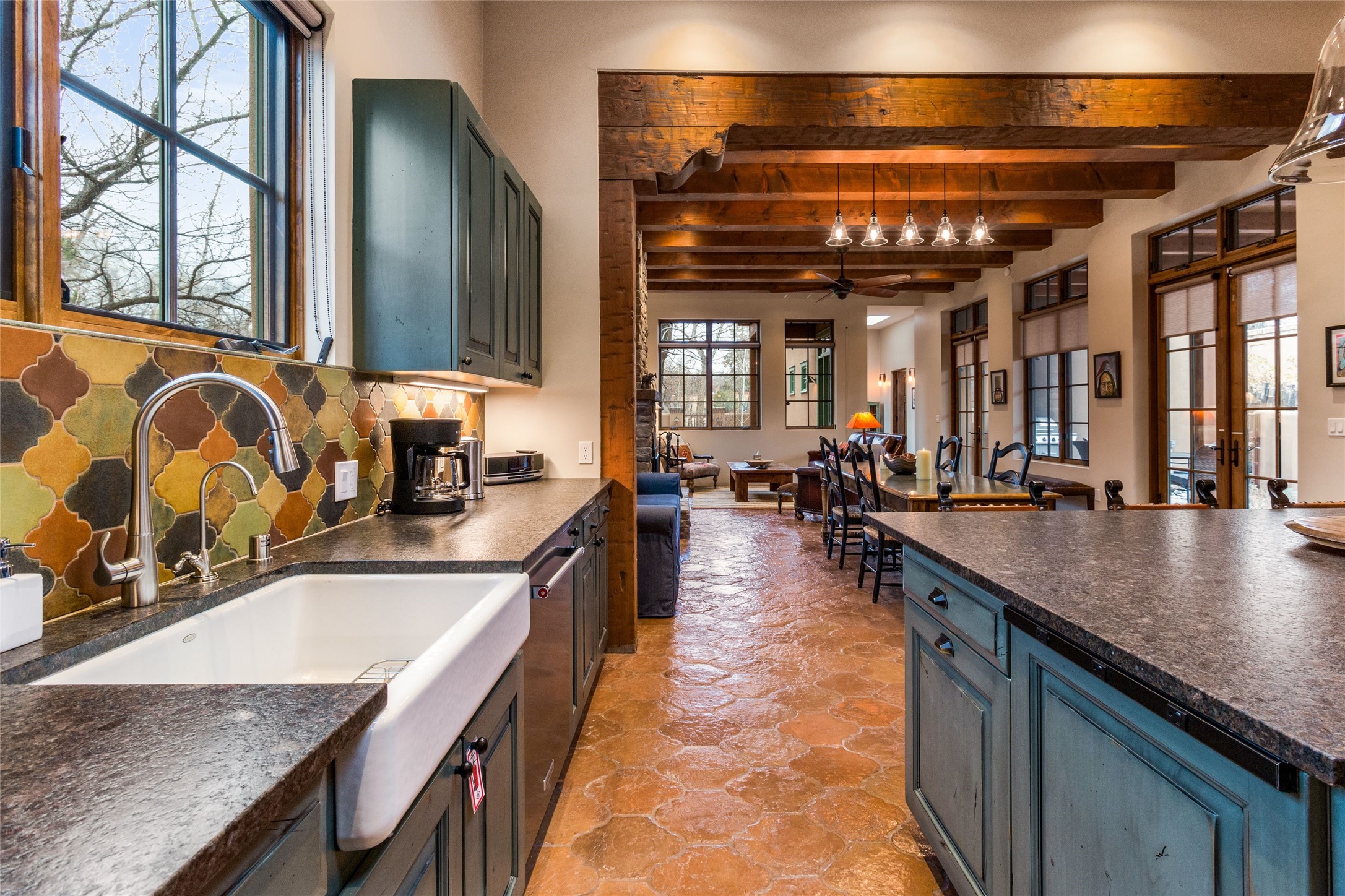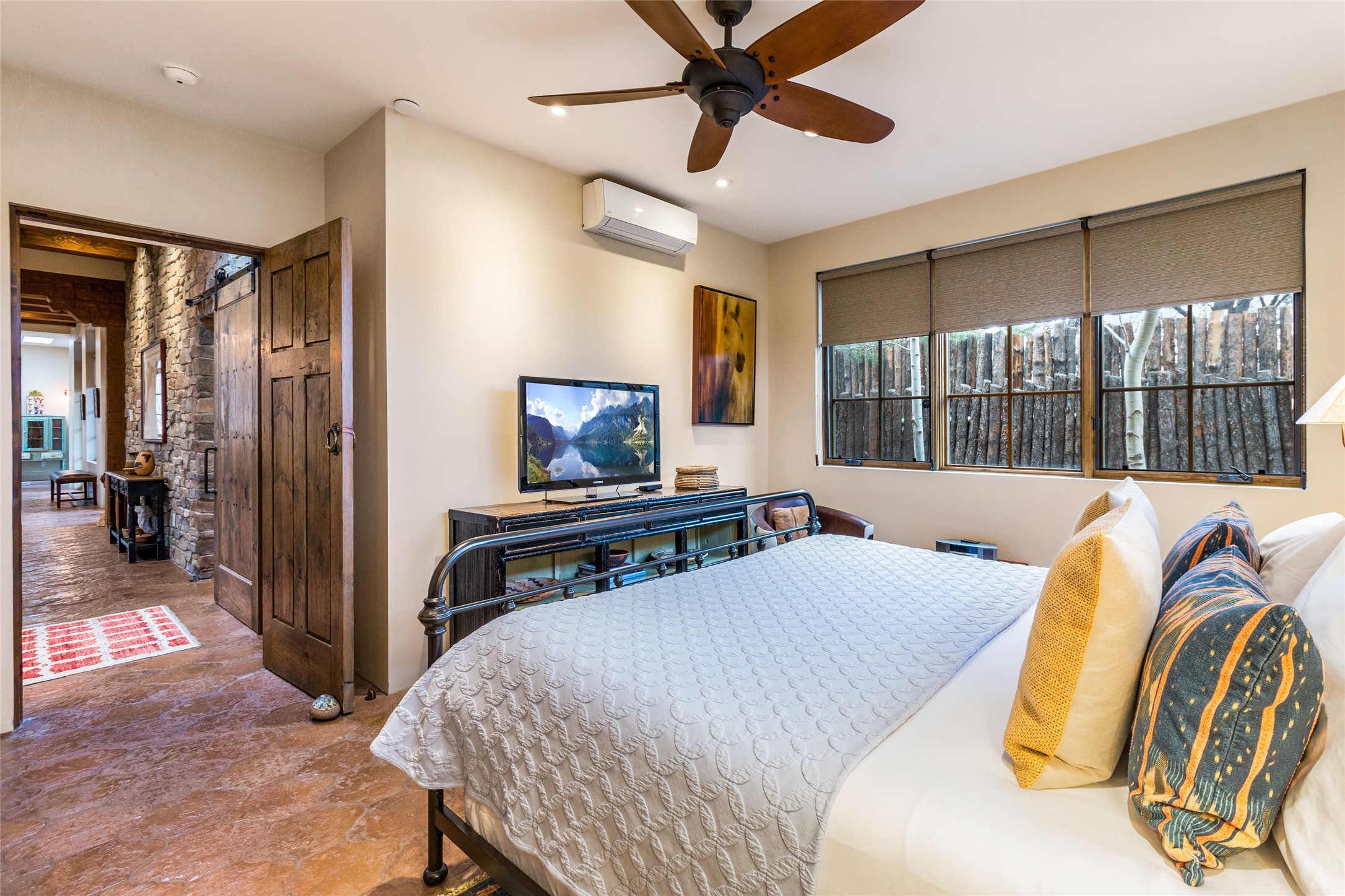 This rare Eastside property is situated in downtown Santa Fe's most beloved and walkable locations close to Canyon Road. Comprising 1,750 +/- sq.ft., this single-level custom 2 bedroom and 2 bath home was built in 2016 and exudes classic Santa Fe style. High ceilings featuring large beams in the open concept living/dining/kitchen area fill the space with light and warmth accented by a gas fired stone fireplace and nearby stone accent wall. Glass French doors lead from this living area to a covered portal with a bubbling water feature, perfect for al fresco dining and entertaining. Each en-suite bathroom is spa-like in nature each with large walk in showers and quiet privacy. Features include antiqued terracotta tiles with in-floor radiant heat, mini-split air conditioning/heating, large windows with privacy blinds, skylights, a gourmet kitchen with large island, custom cabinets with granite countertops, a full size laundry and mud room, built in office alcove, custom lighting, plenty of storage, and a 2-car garage with additional off street parking. Solar panels were recently added with a transferable warranty in place. This property has a great rental history and could be offered turn-key to those looking for an excellent income producing property.