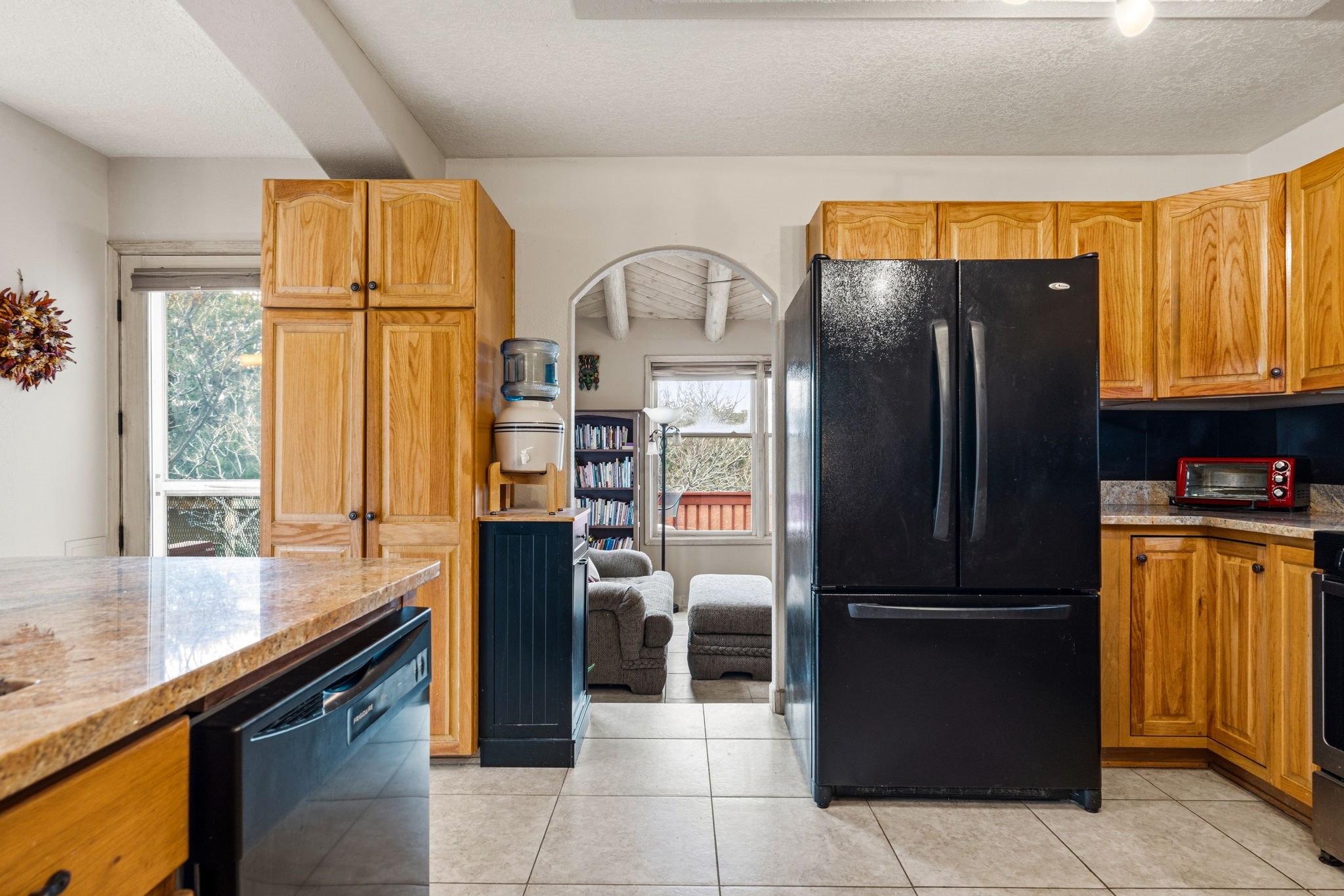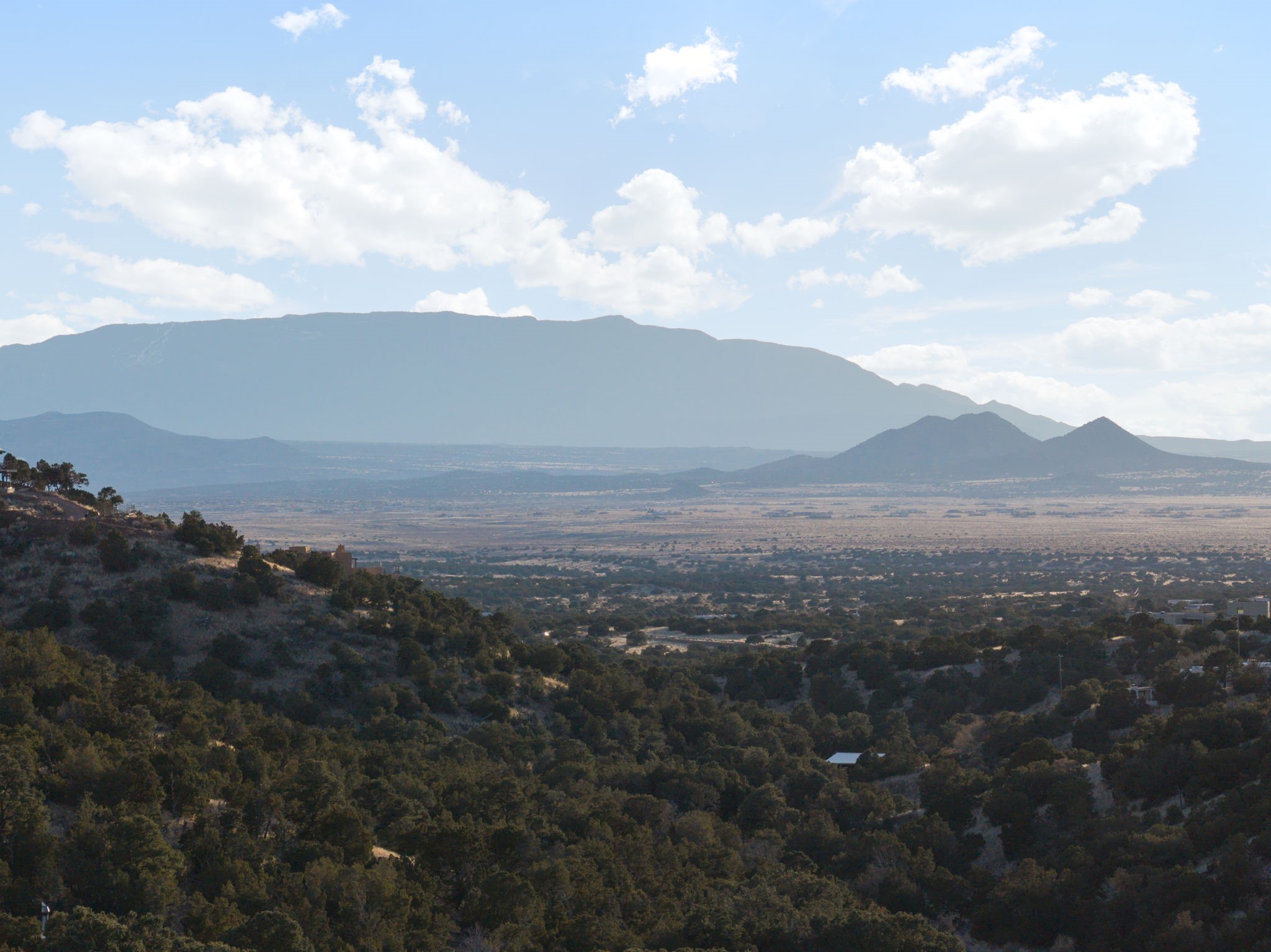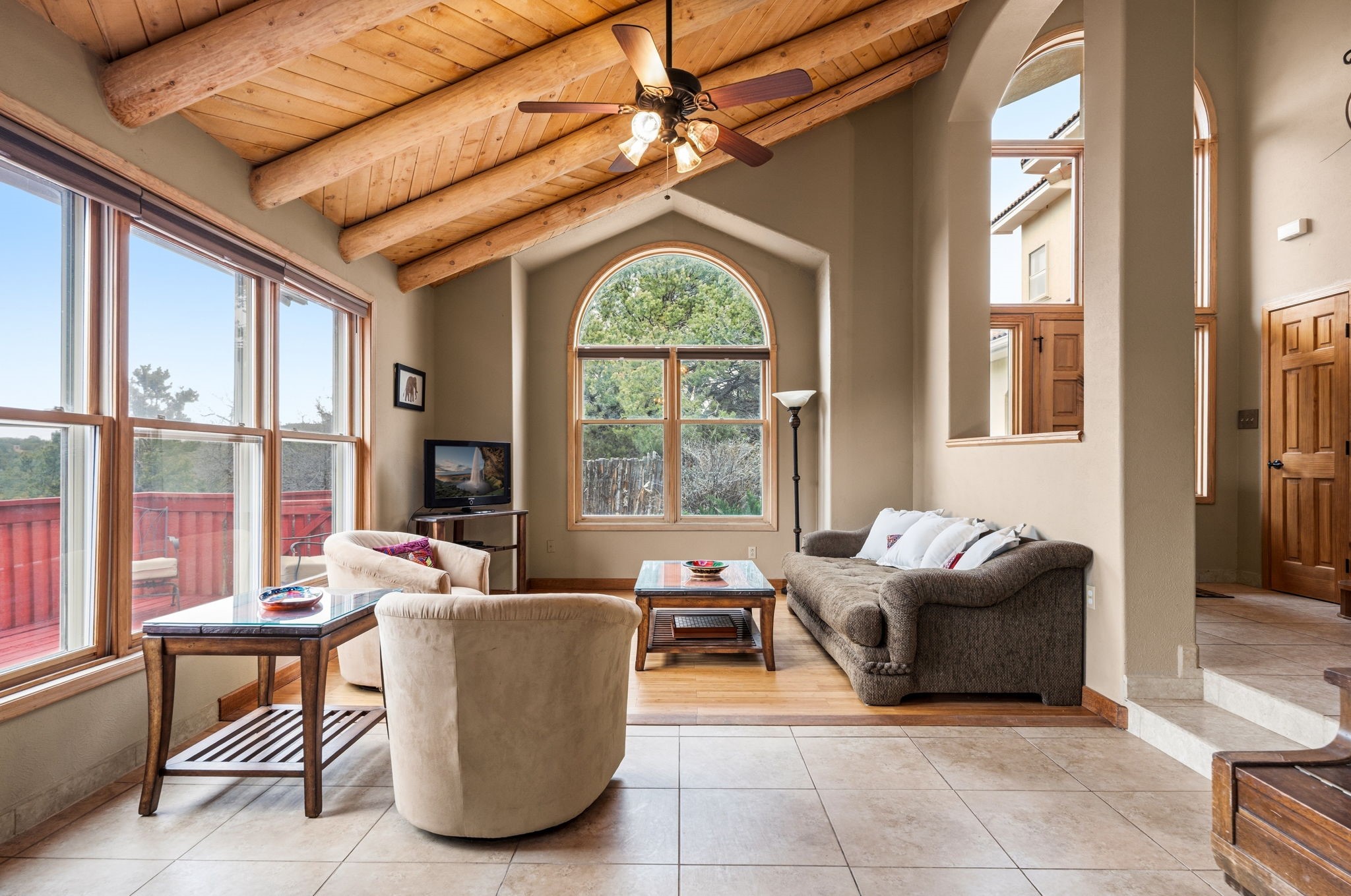 Set on more than five wooded acres just 20 minutes from the historic Santa Fe Plaza, this Spanish-style retreat offers rare privacy, expansive views, and the feeling of owning your own secluded oasis while remaining close to town. Elevated above the road and surrounded by native pion, pine, and cedar, the property enjoys rolling terrain, endless skies, and sunsets that glow in gold and crimson before giving way to brilliant, star-filled nights. The setting is peaceful, immersive, and grounding. Inside, natural light pours through generous windows, illuminating soaring ceilings and open living spaces that feel both grand and inviting. Warm wood and tile flooring, iron accents, and timeless architectural details reflect authentic Spanish character. The beautifully refreshed kitchen anchors the home, offering generous space to gather, cook, and entertain with ease. Upstairs, spacious bedrooms provide comfort and privacy, including one with a balcony set among the trees. The primary suite serves as a private sanctuary with a deep soaking tub and oversized shower for a spa-inspired experience. A detached studio offers flexibility for guests, creative pursuits, or a home office. Outdoors, enjoy curated landscaping, a tranquil pond, covered patio with traditional horno, and fenced space for pets.Offering land, light, views, and proximity, this is Santa Fe living at its most serene, a rare opportunity to experience space, beauty, and quiet connection to nature just minutes from the Plaza.