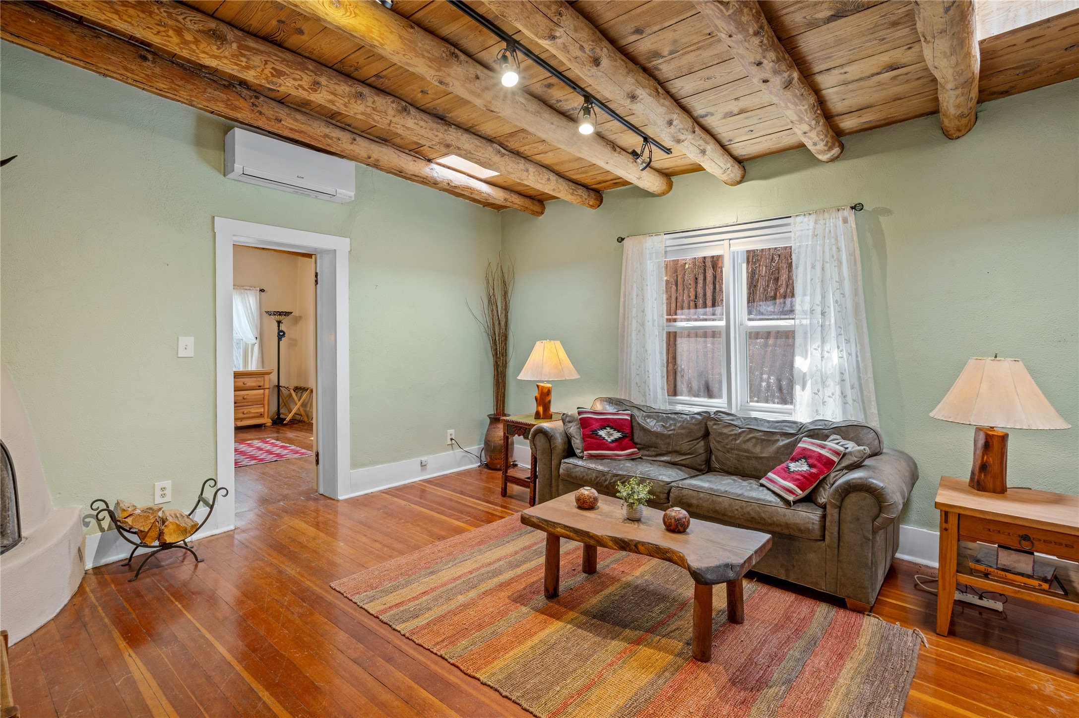 Thoughtfully updated with many recent improvements, this charming home beautifully blends Southwest character with modern comfort. Gated parking provides security and convenience, while the home itself is tucked away on a private lane, offering tranquil surroundings in a prime location. Just a few-minute walk to Canyon Road and only 12 minutes on foot to the Plaza, with its coffee shops, restaurants, and galleries. Enter through a shaded front courtyard, perfect for entertaining or enjoying peaceful evenings, setting the tone for the Santa Fe style carried throughout the home. Inside, vaulted viga ceilings enhance the living room, which features a cozy wood-burning fireplace and skylights for natural light. Saltillo tile flooring adds to the traditional ambiance. The updated kitchen boasts stainless steel appliances, ample storage, and generous workspace. This 1654 square foot home, built in 1967 offers two bedrooms and two bathrooms. The spacious primary suite features decorative tilework and radiant heat in both the bedroom and ensuite bathroom for year-round comfort. Mini-split systems provide additional efficient heating and cooling. The second bedroom is light-filled and opens to the front patio--perfect for guests or a home office. This unique home is a rare find, combining timeless adobe charm with thoughtful updates in a peaceful, private setting. Schedule your private tour today.
